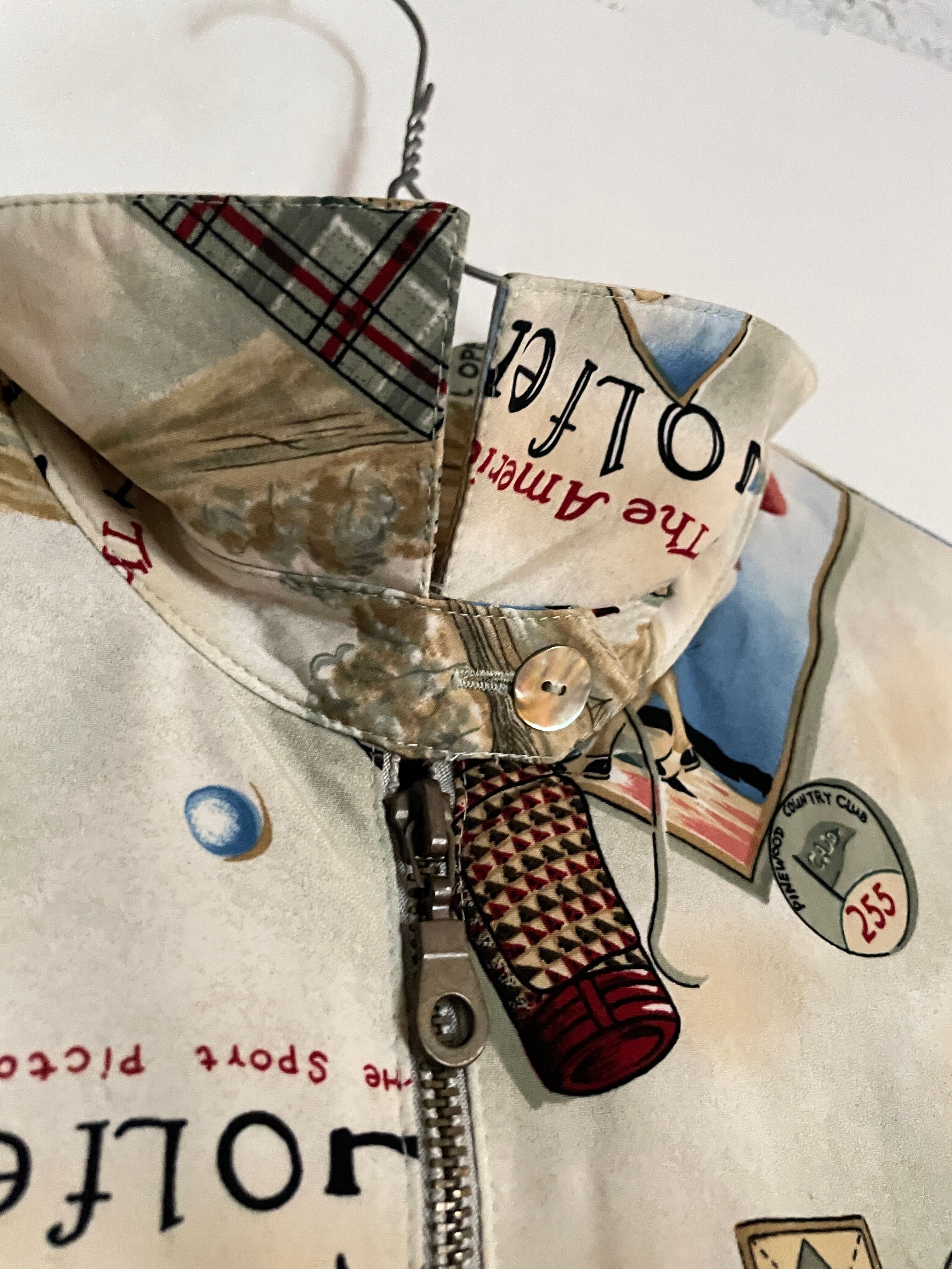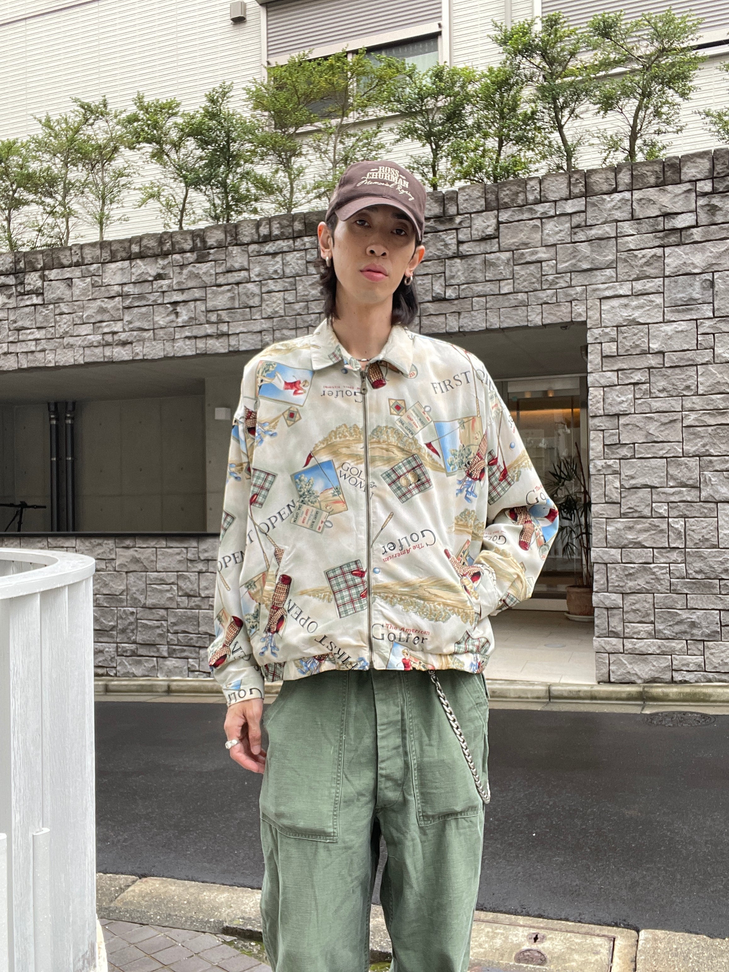 ゴルフをテーマにした総柄デザインが、全体に施された、スウィングトップ。ゴルファーやゴルフクラブ、ゴルフボールなどのイラストプリント。リアルさもありつつ、コミカルチックな雰囲気も感じられるデザインになっています。短丈めでありながら、身幅はたっぷり広め。今っぽいシルエットなのも嬉しいです。サラッとしたポリ素材なので、今の時期にはもってこいの一着です。