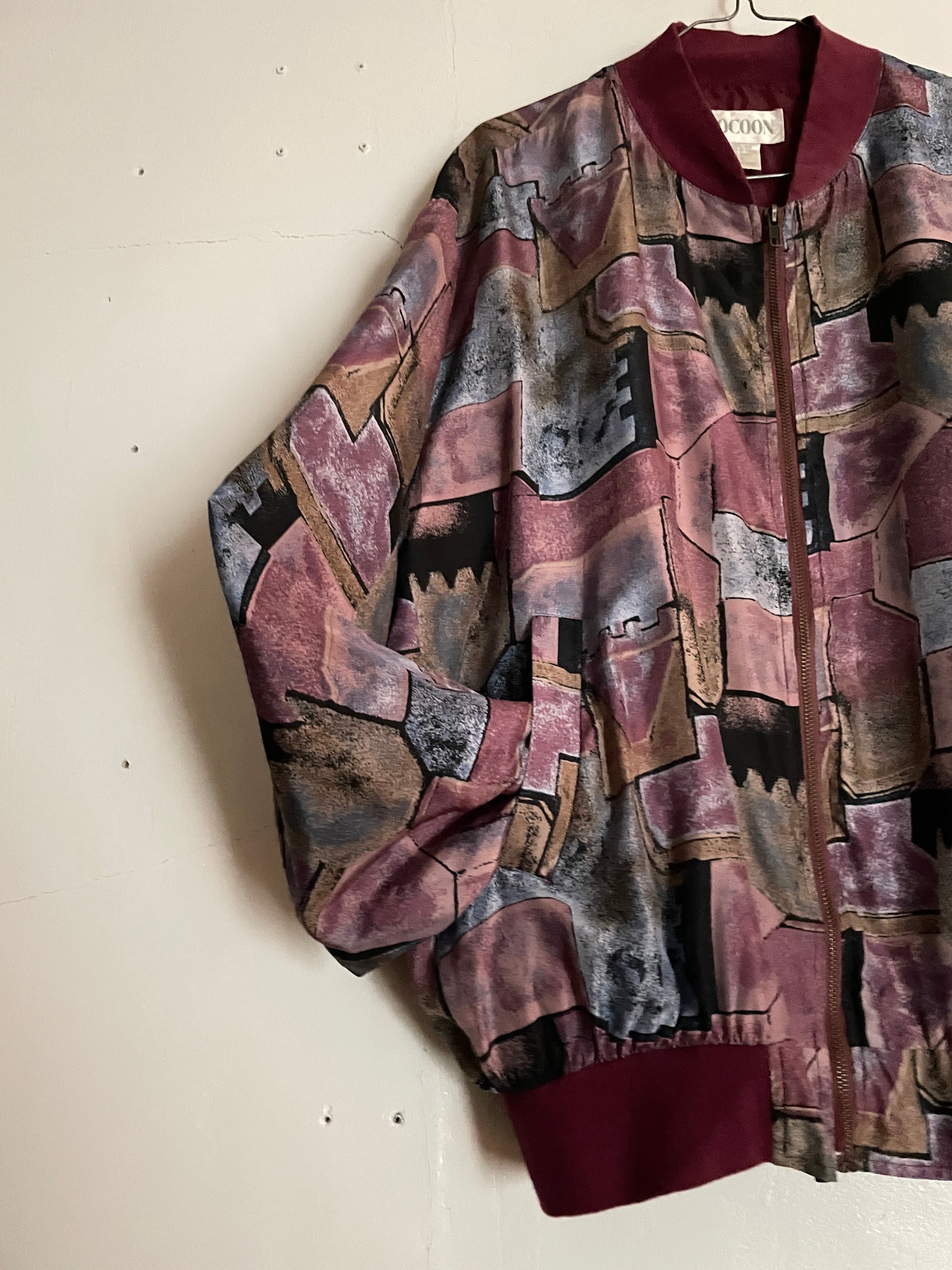 アート感のある、独特な総柄デザインが魅力的な、シルクブルゾン。淡い色味で上手く構成されたお洒落な柄デザインになっています。軽いシルク素材なので、今の時期にはラフにサラッと着られそうです。程良い丈感に、たっぷりな身幅。リブがしっかりしている為、良い丈感で着られそうです。