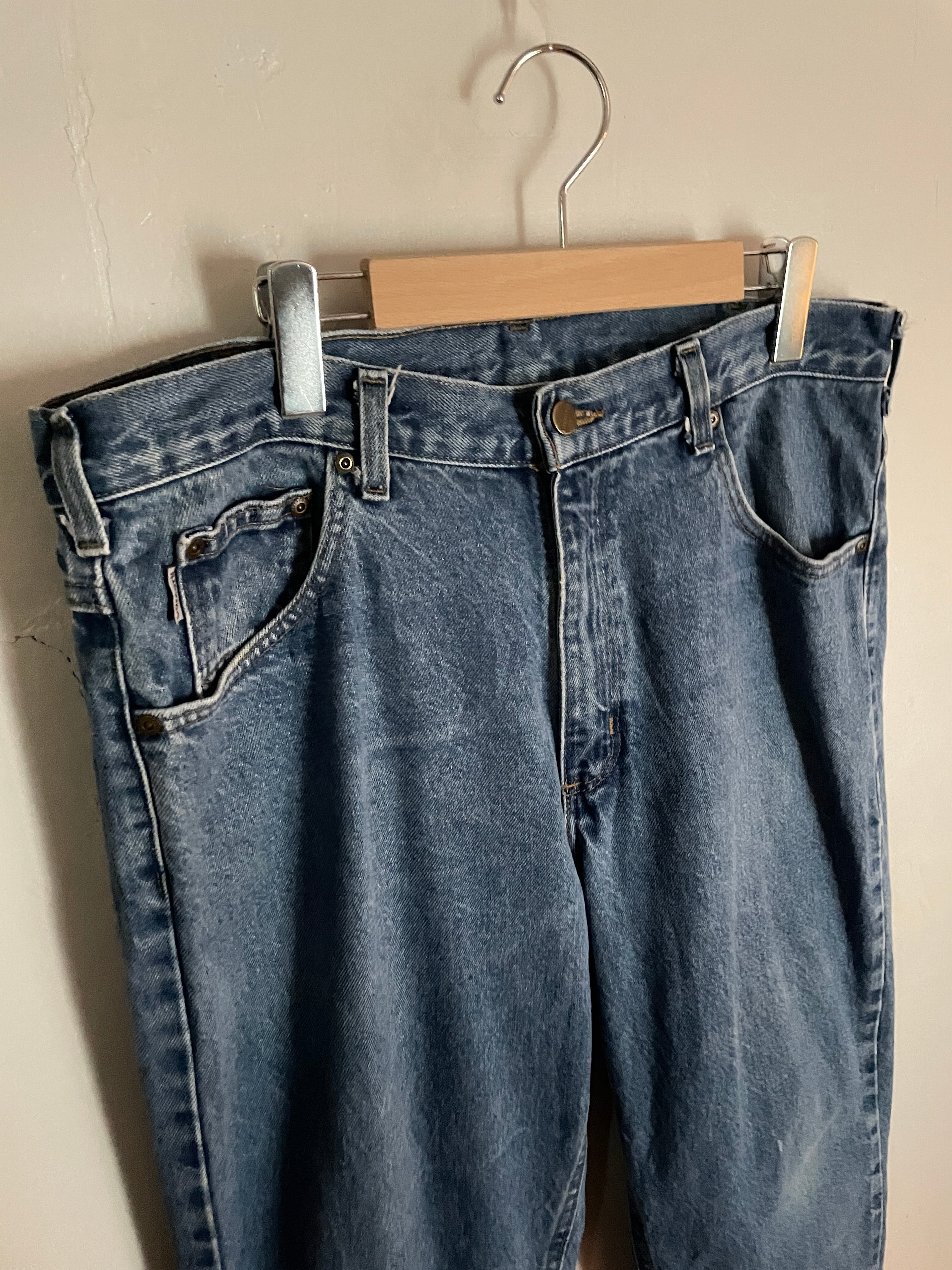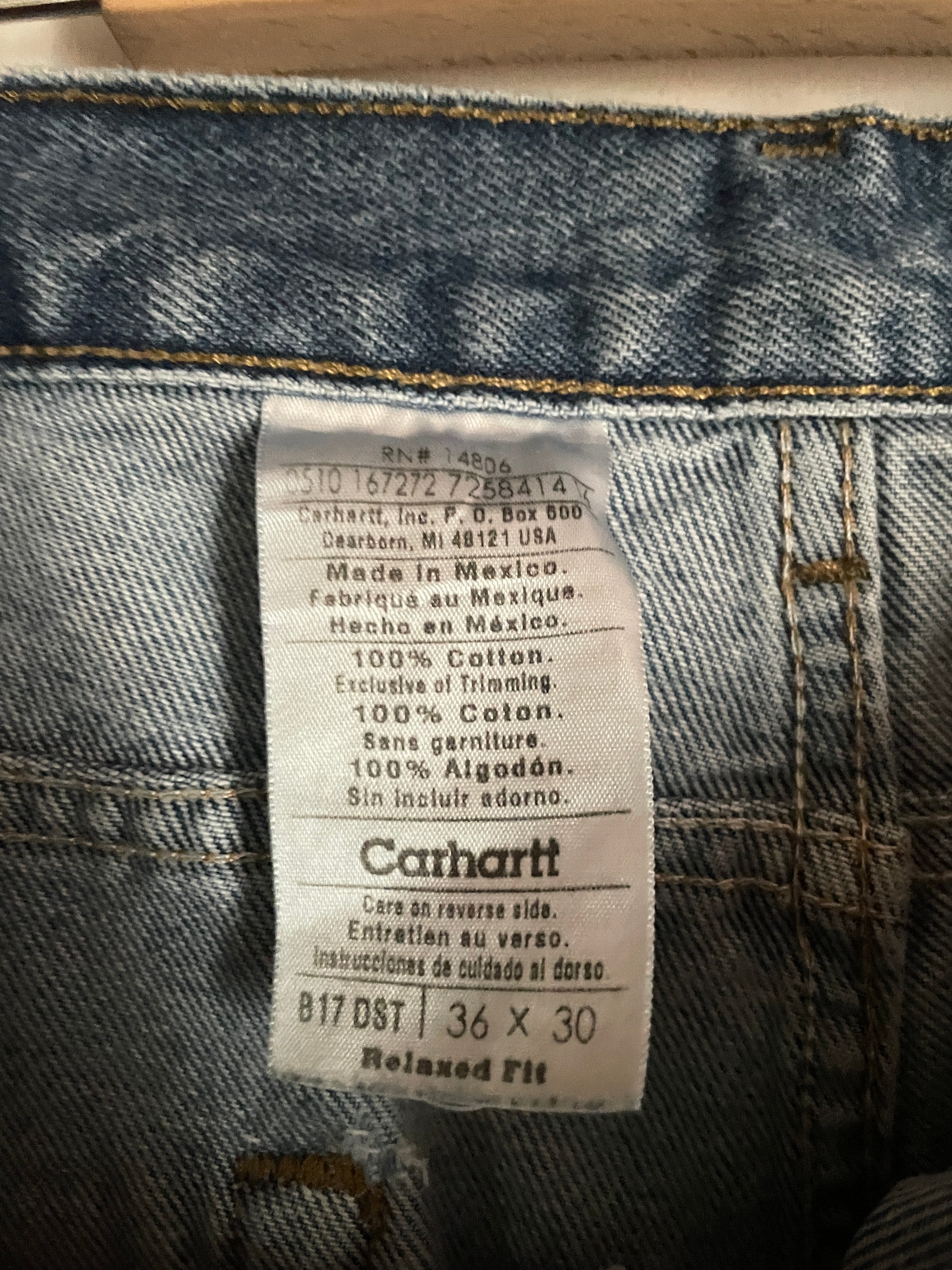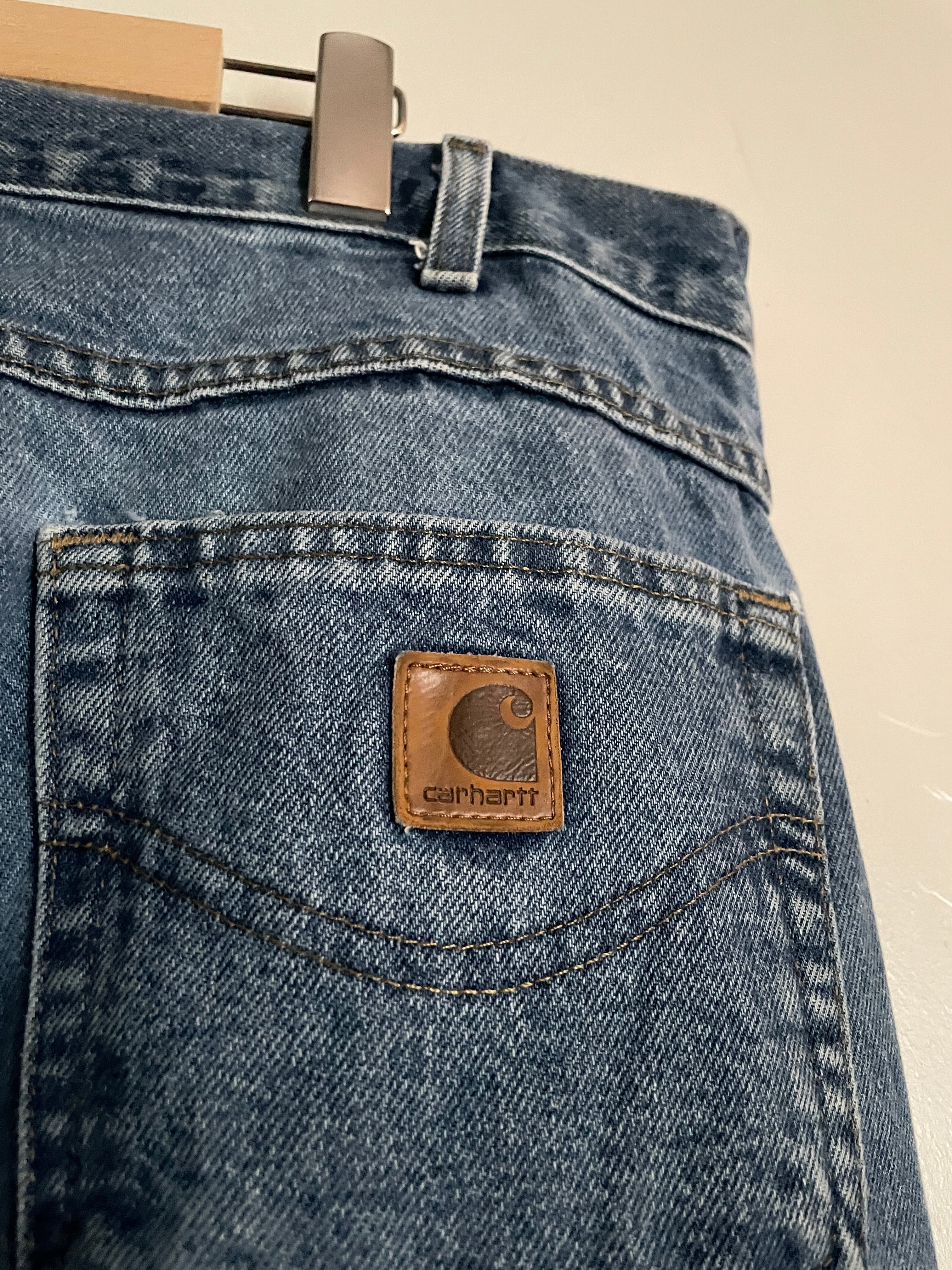 やや褪せた色味で、裾にかけてテーパードがかったワイドシルエットが魅力的な、カーハートのデニムパンツ。靴にしっかりと溜まってくれるシルエット。癖が無い分、様々なトップスとの相性の良いボトムスかと思います。季節問わずガシガシ履ける一本です。