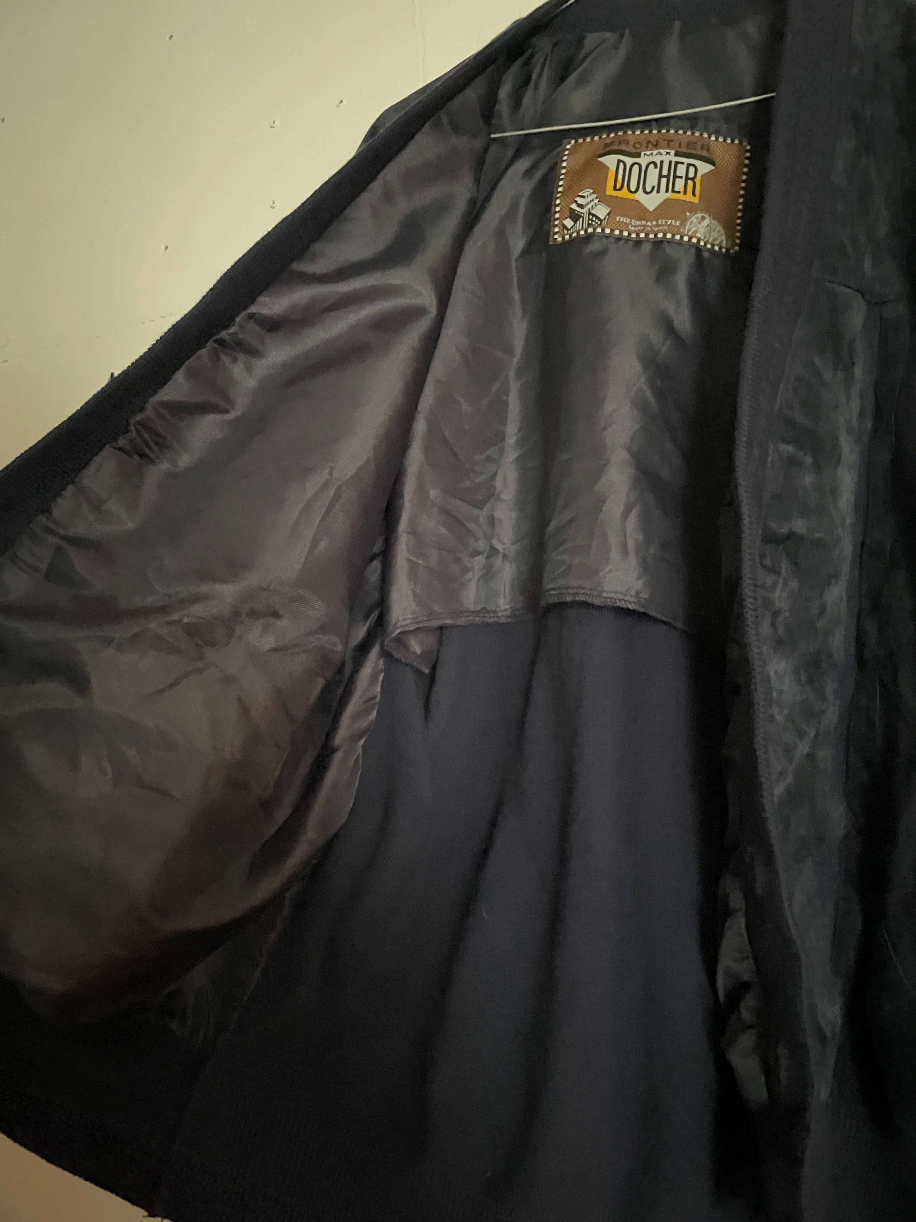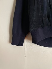ネイビーボディで、ニットとスエードレザーで切り替えられたカーディガン。さすがスペイン製といった、上品で高級感漂うディテールになっています。切り替えの仕方や模様など、細かな部分にこだわりが感じられる一着。さりげないボタンの刻印などもお洒落です。ゆったりと肩の落ちるようなシルエット。秋冬には間違い無くファッションの主役になってくれるアイテムです。