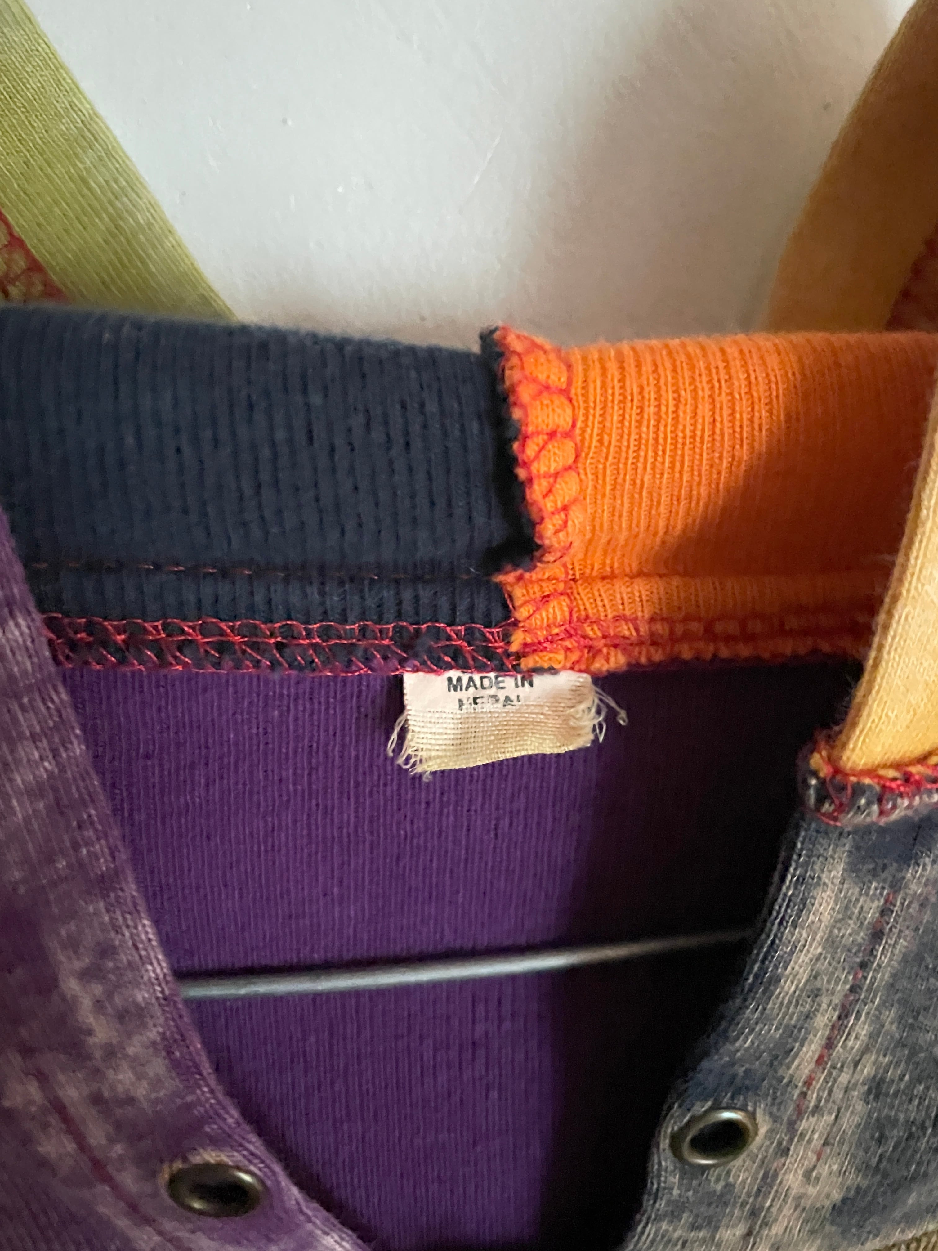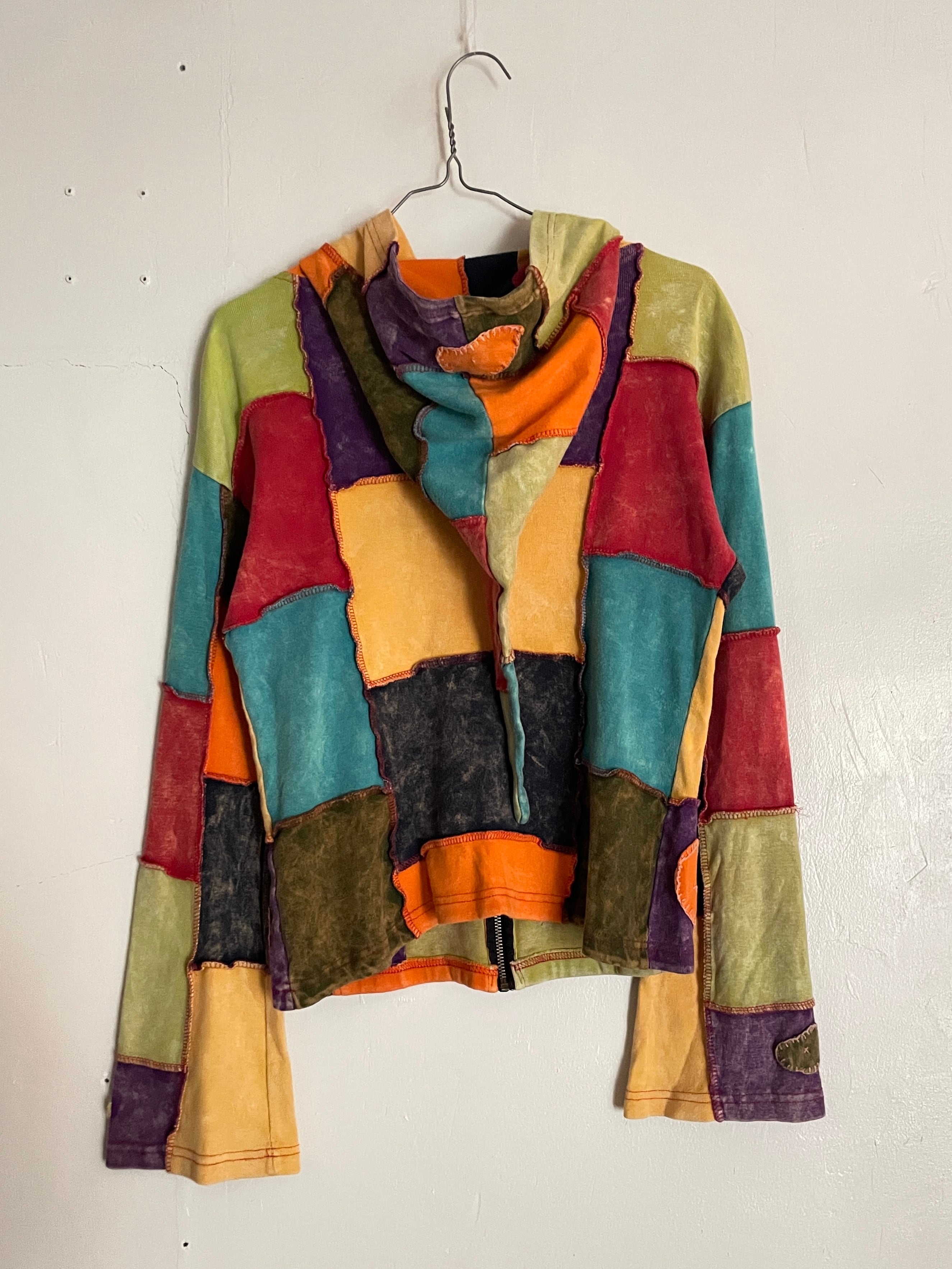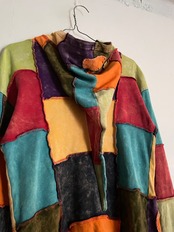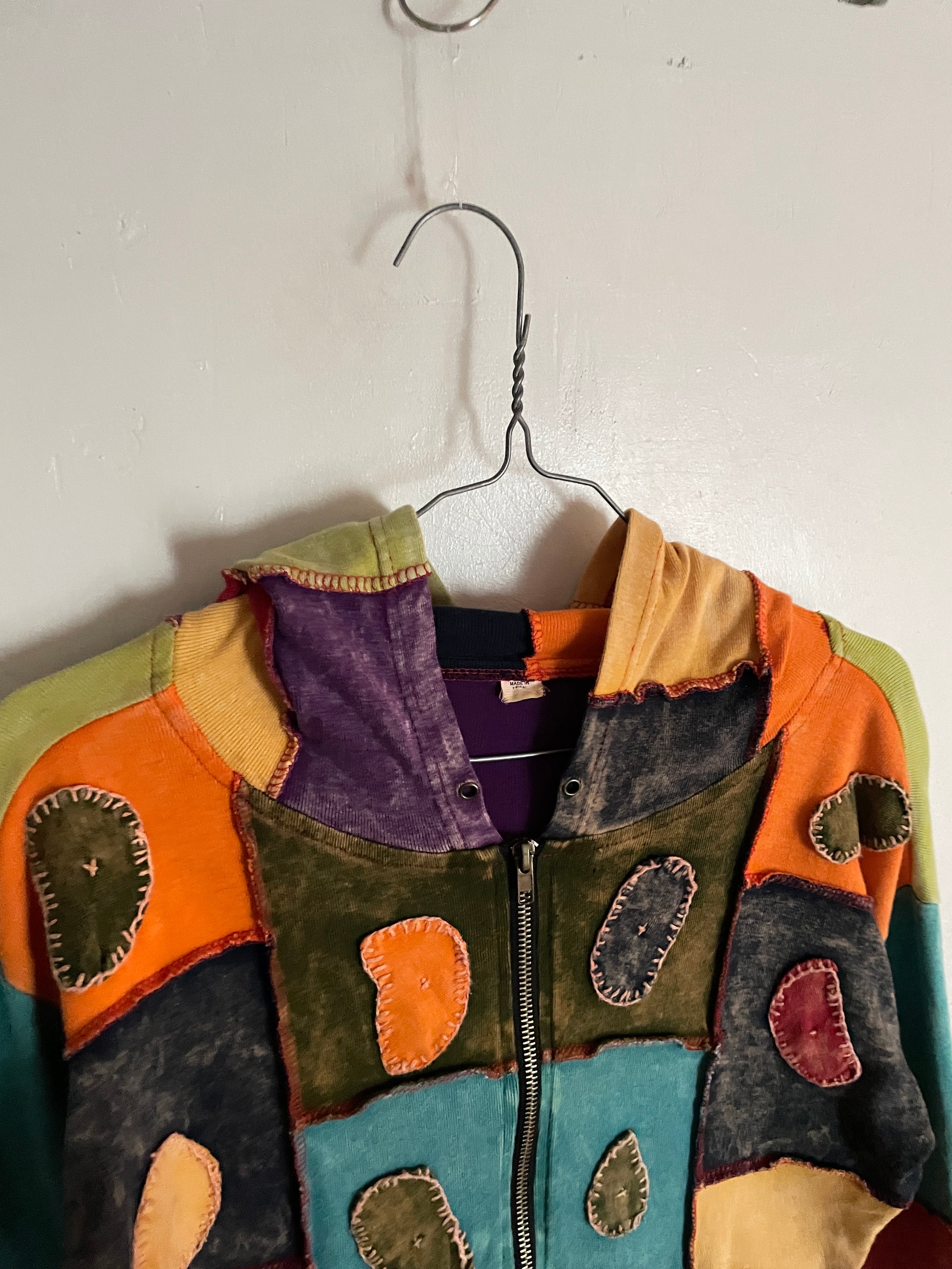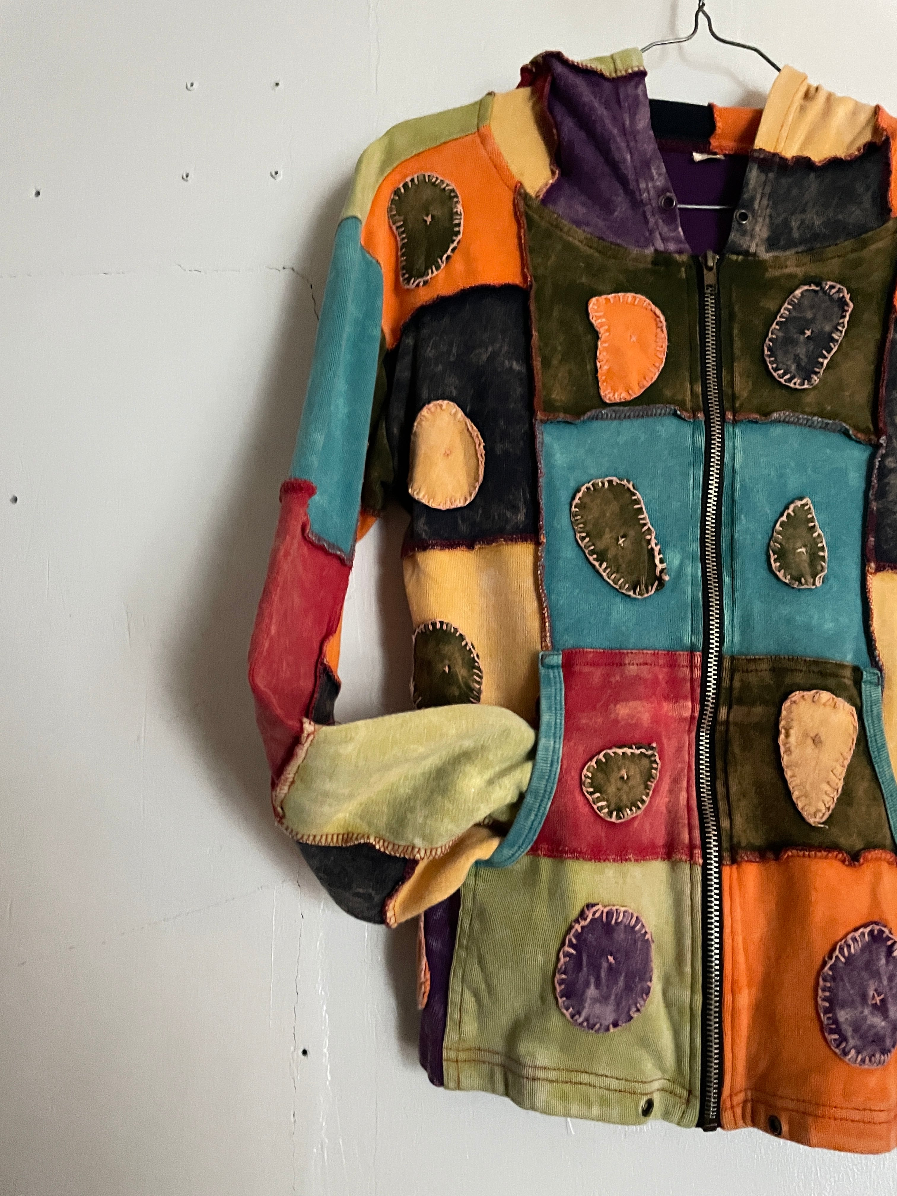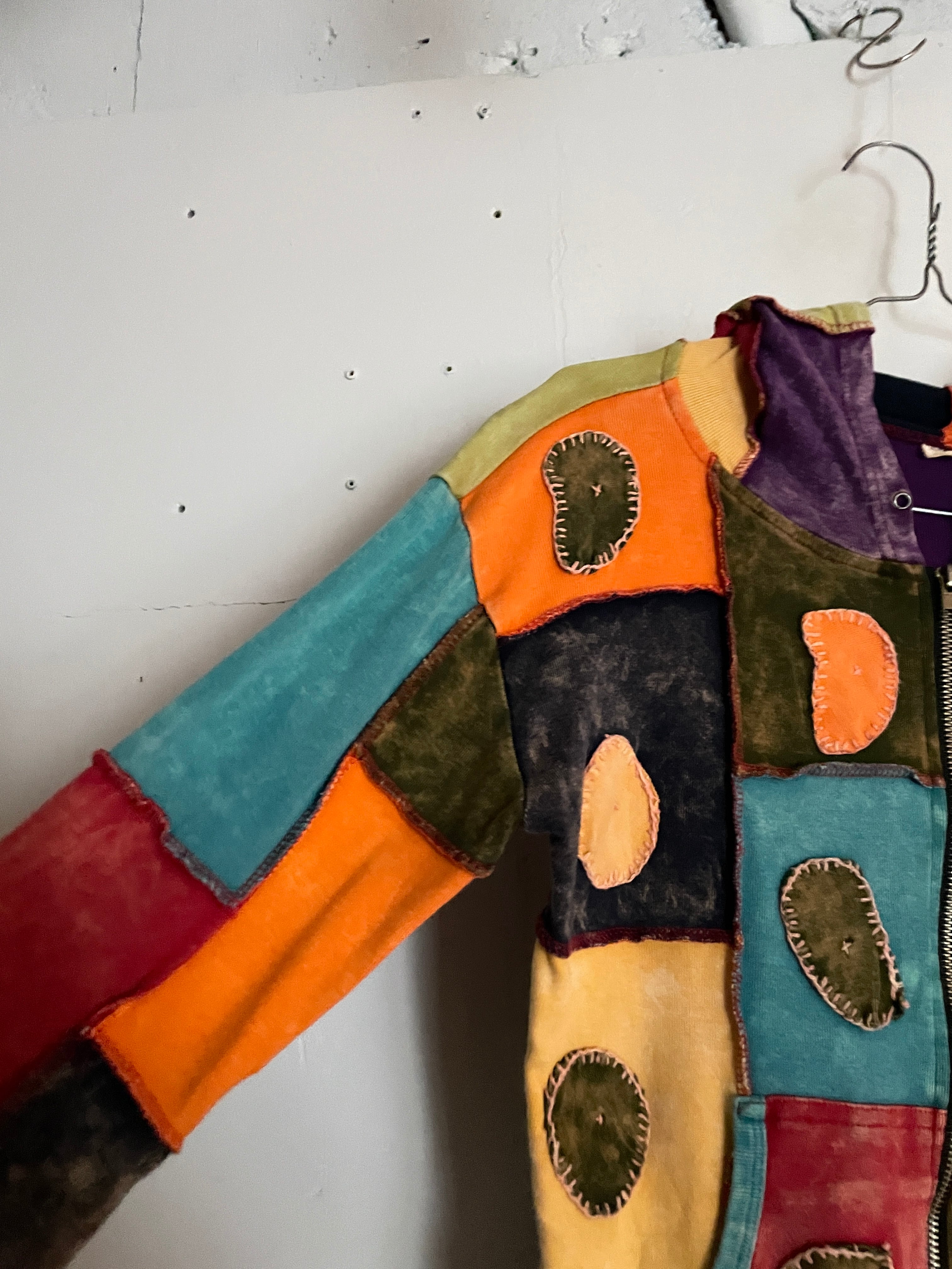 ブリーチ染されたカラフルなボディに、パッチワークデザインが施された、エスニックジップパーカー。それぞれの色に歪な丸状の布がパッチワークされています。細かなデザインからハンドメイド感が感じられます。フードがかなり長いのも面白いポイントです。一枚でも雰囲気はありますが、インナーの差し色で使っても、独特な雰囲気が出てお洒落かと思います。ややタイトめなシルエットですが、ストレッチが効いているので、着用感◎です。