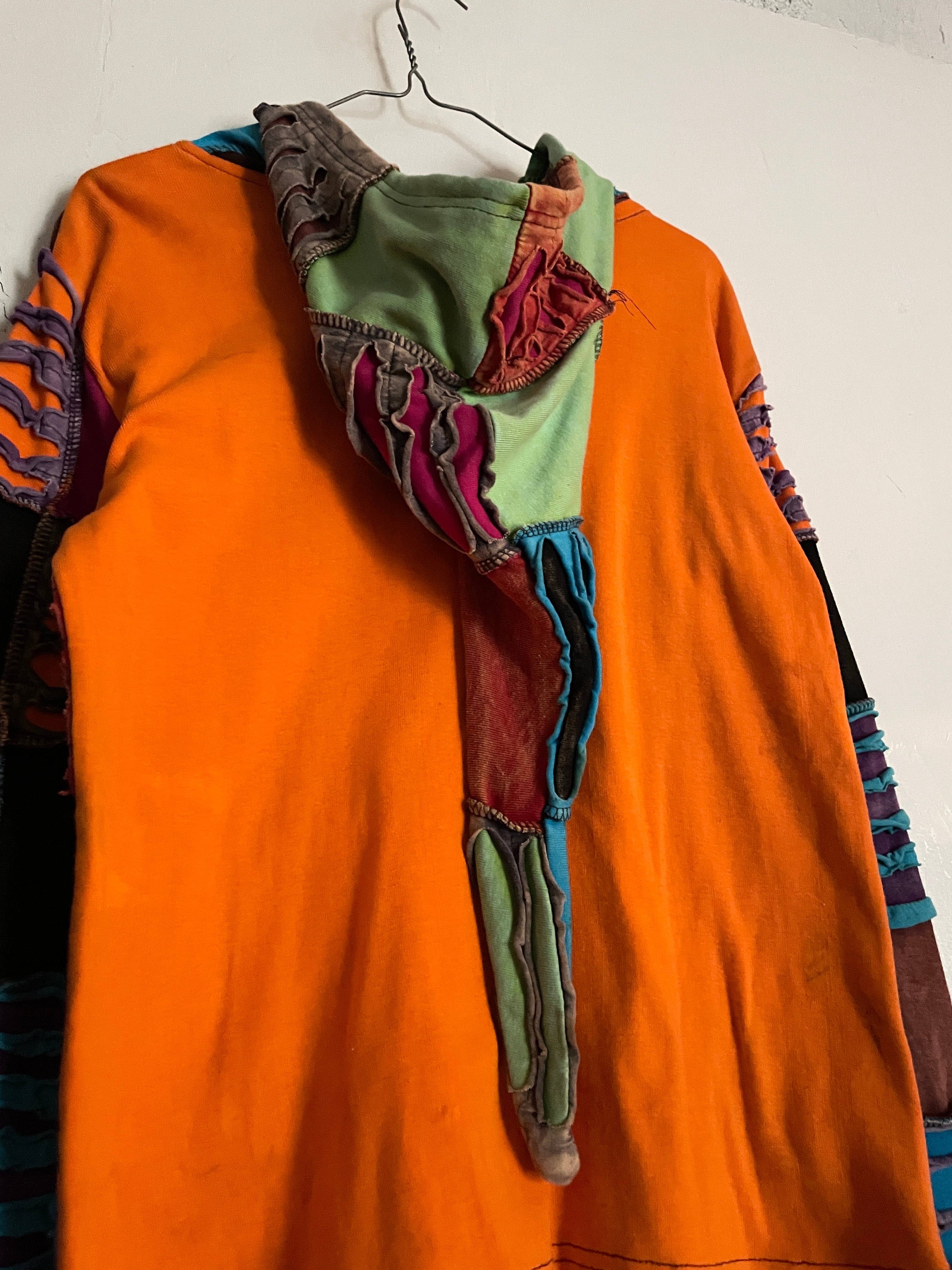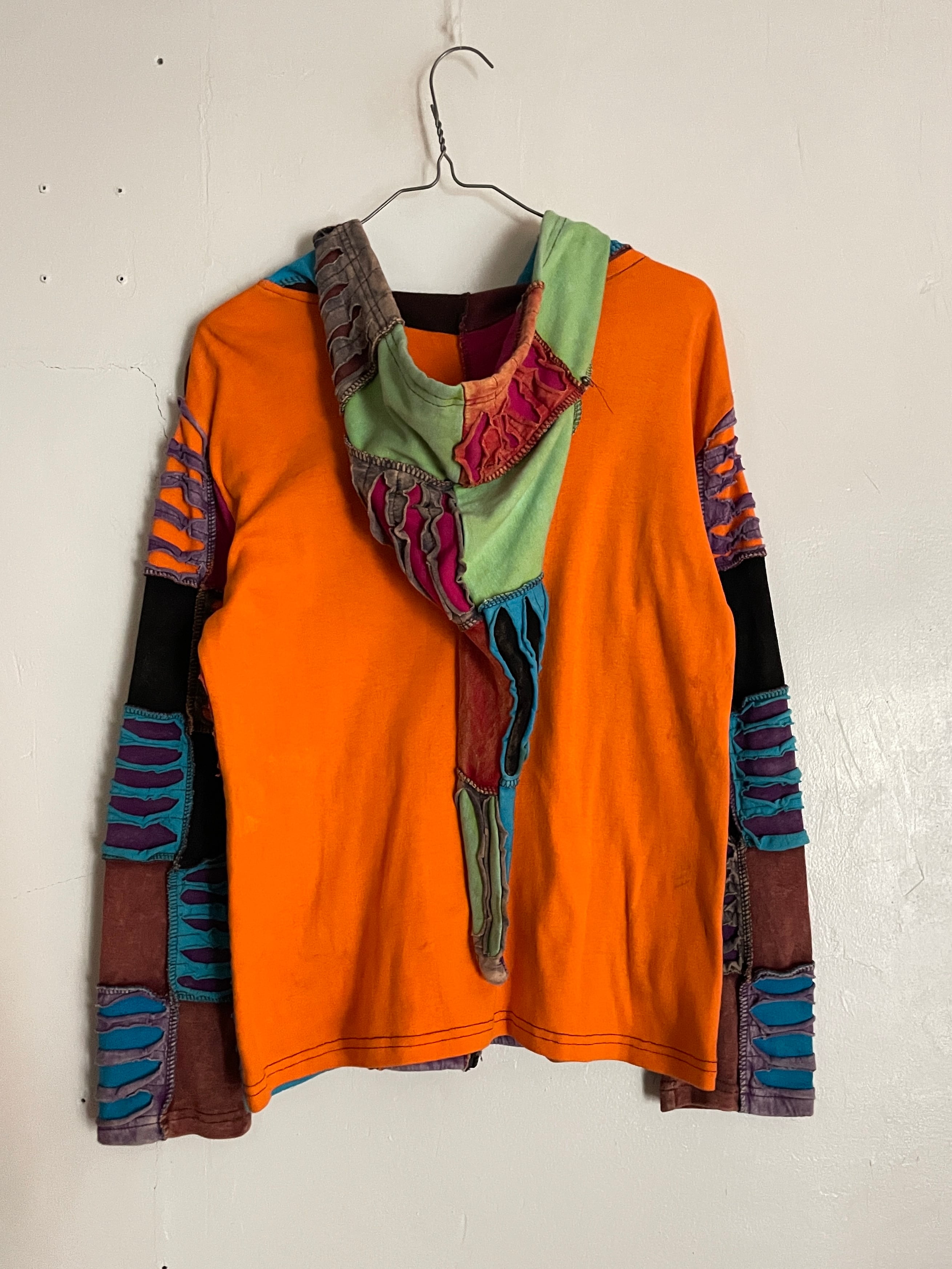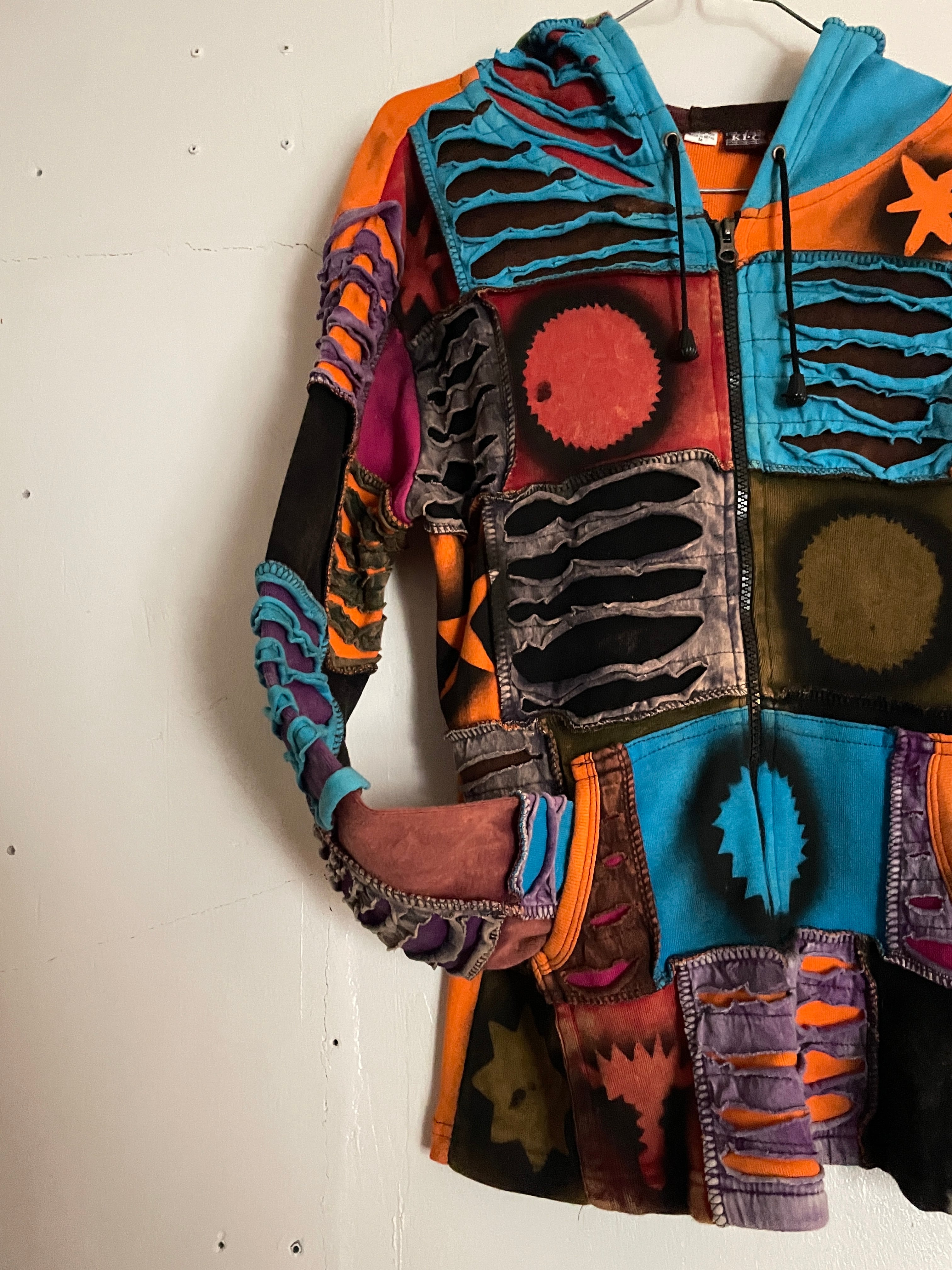 カラフルなウォッシュ加工されたボディに、パッチワークや切りっぱなしデザインが施された、エスニックジップパーカー。雰囲気抜群の一着です。スプレーで描かれたような、星や丸などのデザインもお洒落です。バックは単色のオレンジなのも面白いです。フードがかなり長いのが特徴的です。一枚ではもちろんですが、インナーで使っても良い差し色になってくれて、よりファッションを楽しめそうです。