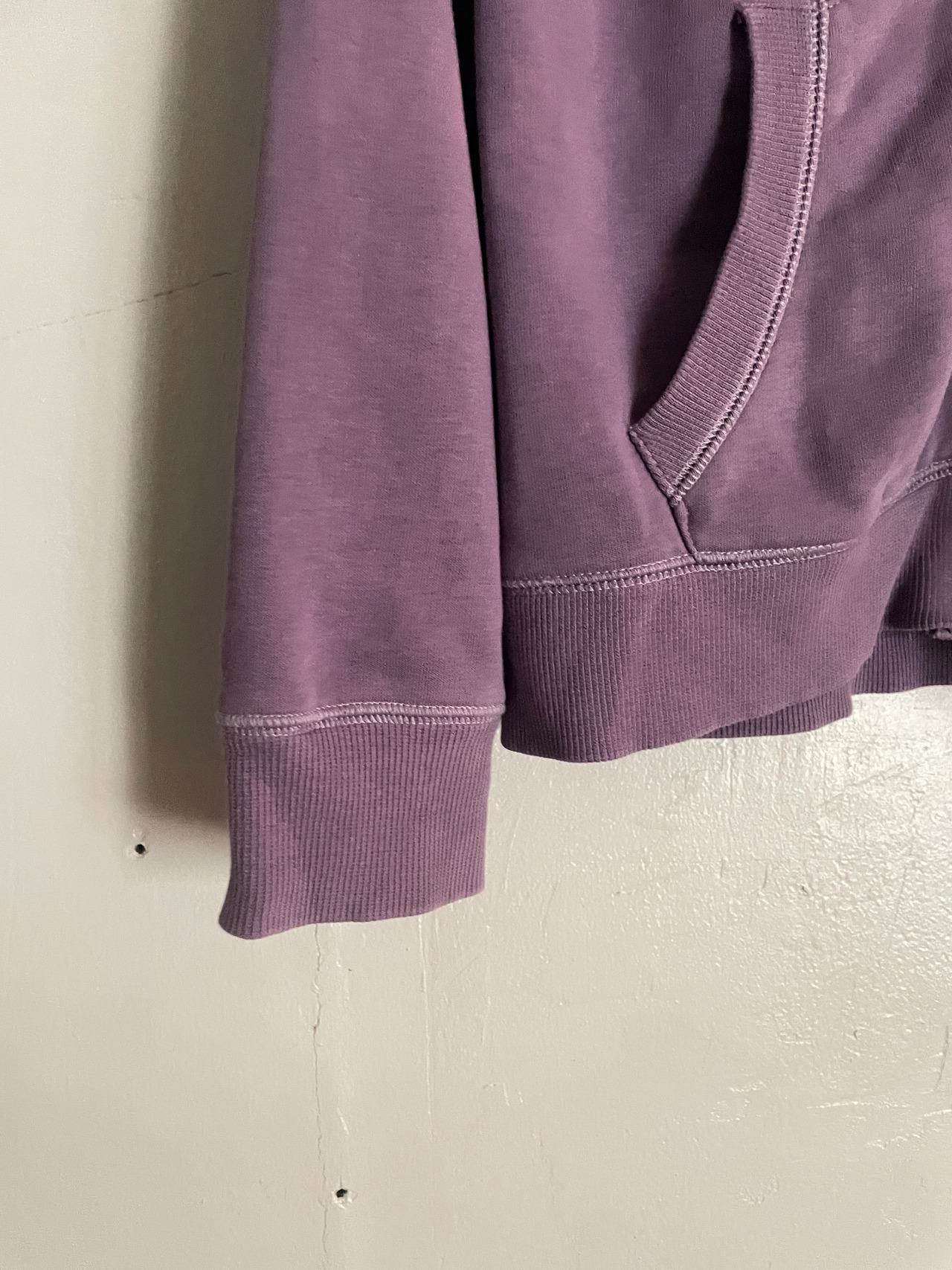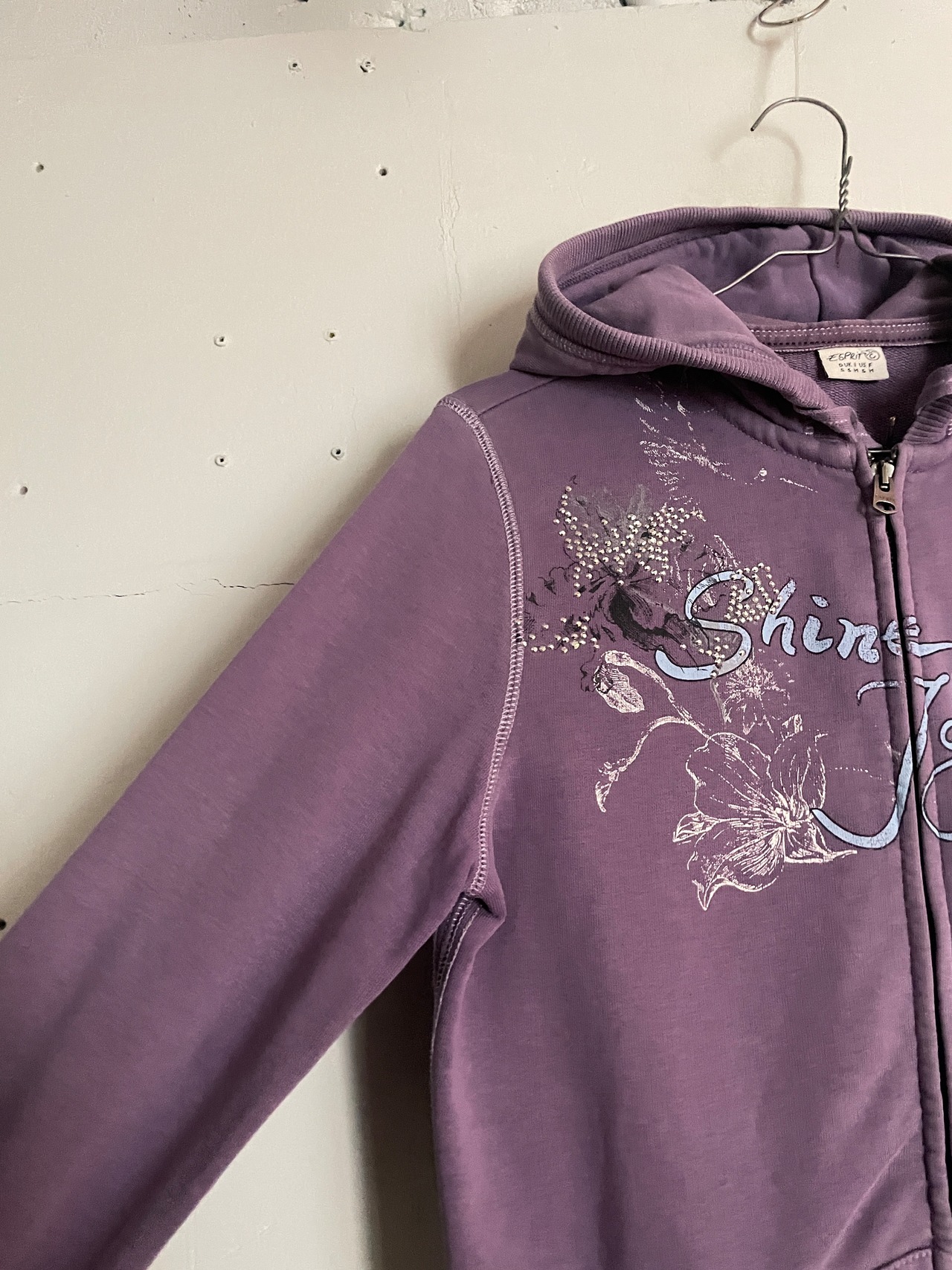 パープルボディに、ビーズデザインや、Y2Kな雰囲気が感じられるプリントが施された、エスプリのジップパーカー。1968年にアメリカのサンフランシスコで創設されたファッションブランドです。アート感のある、やや掠れたフラワープリント。キラッと光るビーズデザイン。細かなデザインにセンスが感じられる一着。ややタイトめなシルエットで、一枚ではもちろんですが、インナーとしても活躍してくれる一着です。