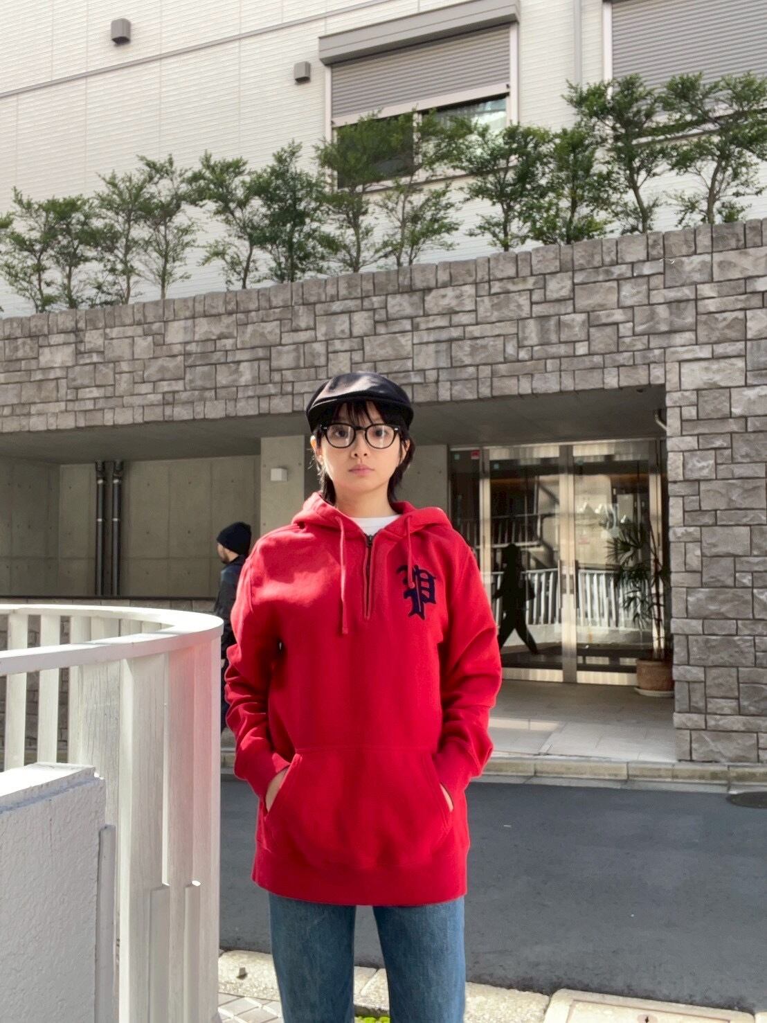明るいレッドボディに、ゴシック体"P"のパッチデザインが施された、ラルフローレンのハーフジップパーカー。ディテール自体はシンプルですが、パッチのデカさや、ボディの明るさなどが相俟って雰囲気抜群の一着に仕上がっています。フード裏はサーマル地になっています。ゆったりとしたサイズ感で、一枚ではもちろんですが、これからの季節にはインナーで着て、差し色で使ってもお洒落かと思います。
