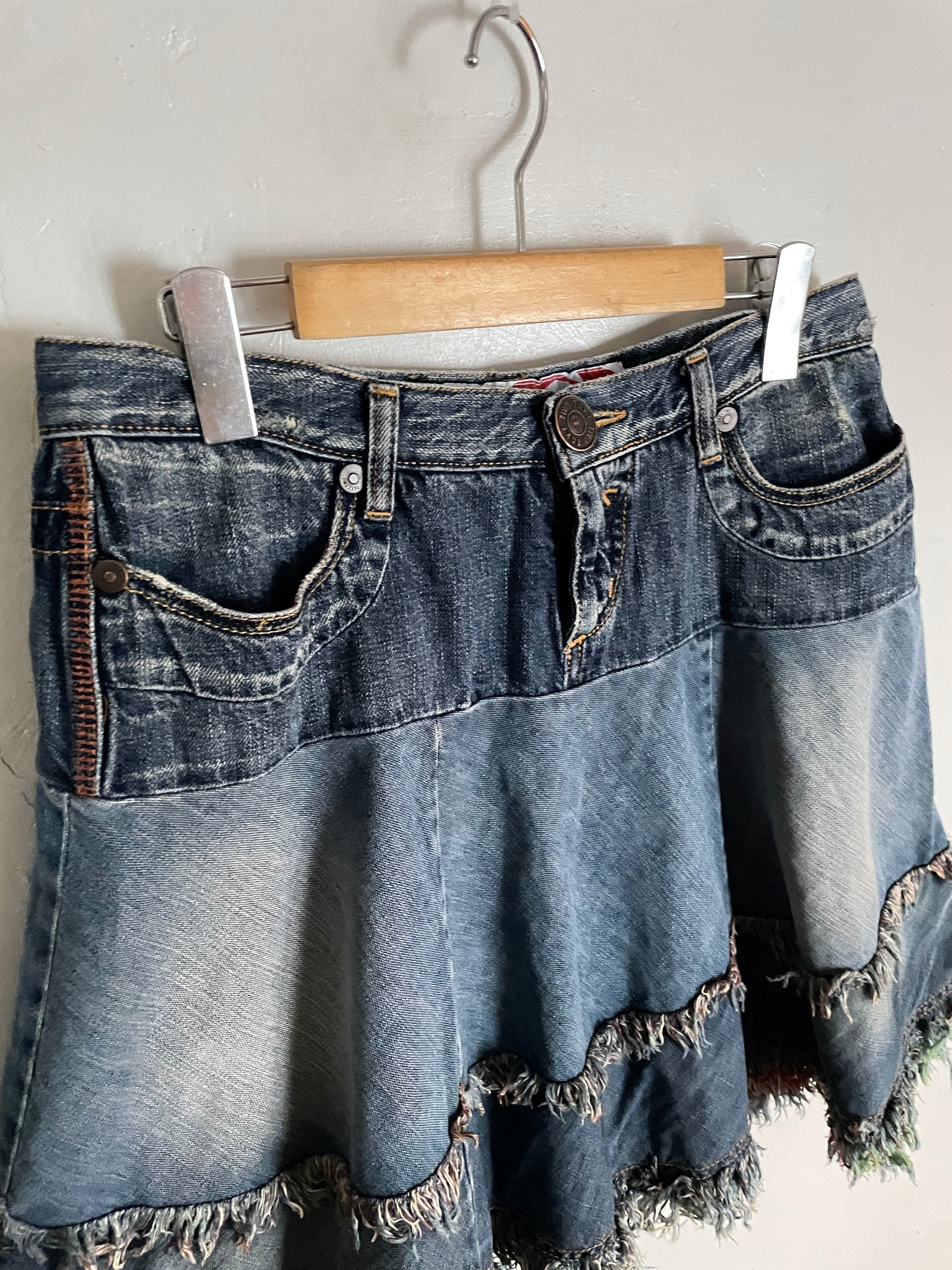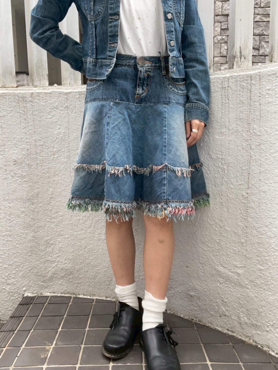 上下で色味の違ったデニム生地がドッキングされた、ティアードスカート。フリンジ加工がされていて、カラフルな解れがなんとも可愛らしいです。裾に向かって大きく広がったシルエットが特徴的です。Y2Kな雰囲気も感じられる、ファッションの主役になってくれそうなスカートになっています。このディテールでイタリア製なのもポイントが高いです。