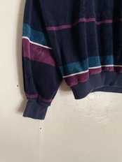 色気のあるネイビーボディに、パープルとエメラルドグリーンのラインデザインが施された、ベロアポロシャツ。上品で肌触り抜群のベロア素材。ラインの太さが違うのもお洒落です。ゆったりとしたサイズ感で、一枚ではもちろん、今の時期にはインナーとしても活躍してくれます。USA製なのもポイントが高いです。