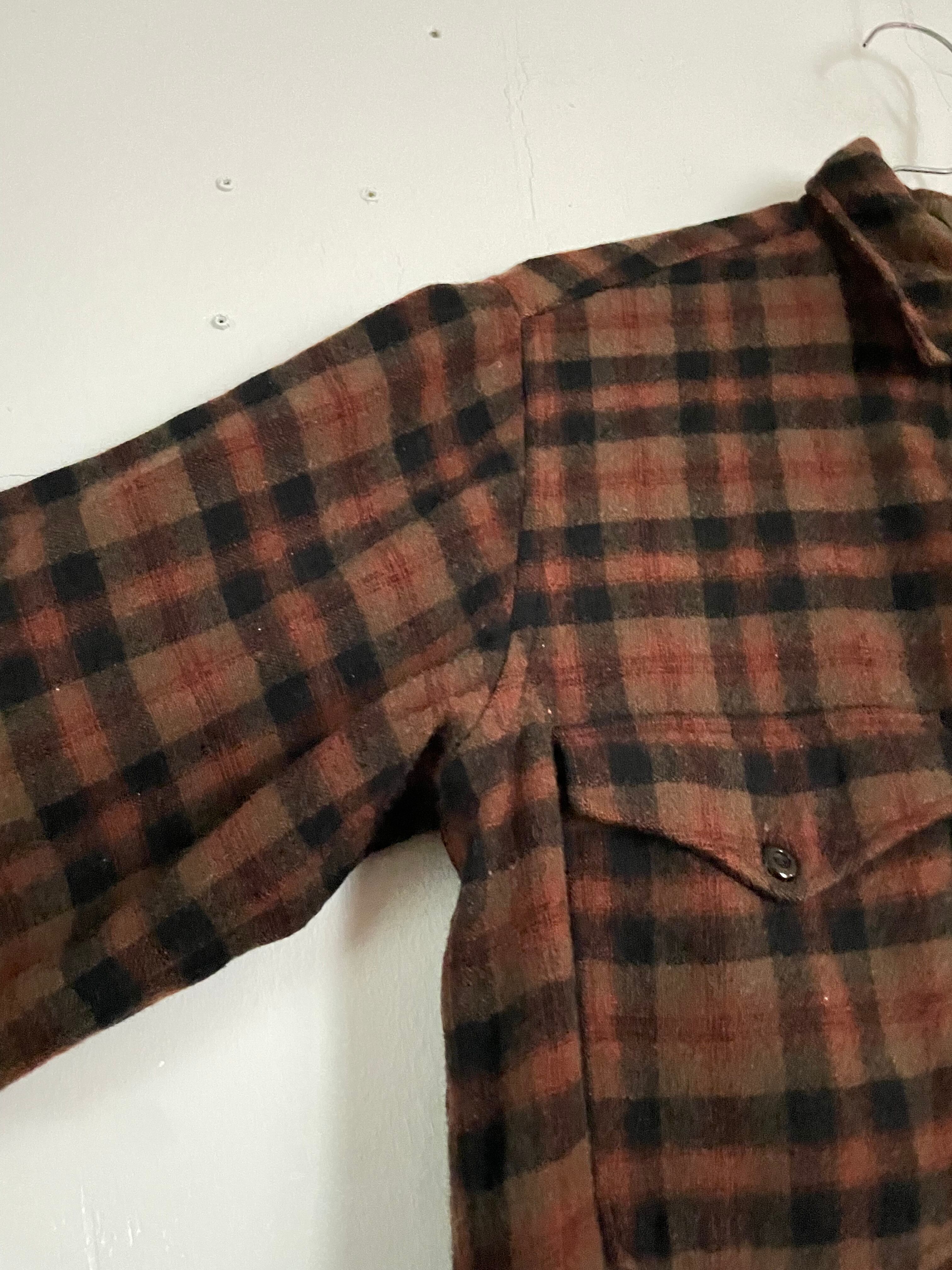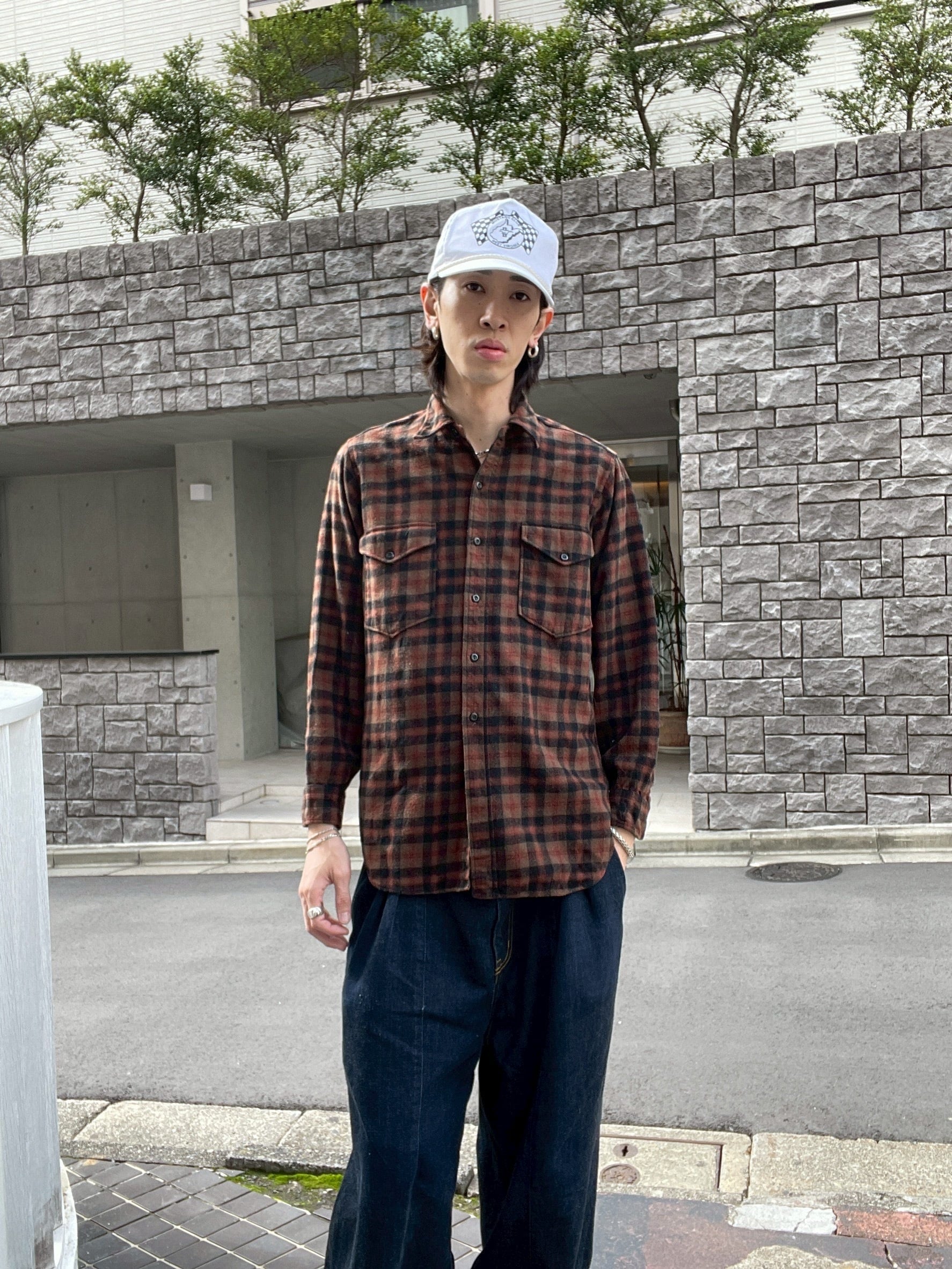 オレンジとブラックの配色抜群のチェック柄デザインが魅力的な、ペンドルトンのウールチェックシャツ。毛足の長い上品なウール素材なので、保温性にも優れています。まさに冬仕様のシャツかと思います。綺麗な縦長シルエットで、今の時期にはインナーの差し色としても活躍してくれそうです。タグを見ると、80年代頃のアイテムだという事がわかります。