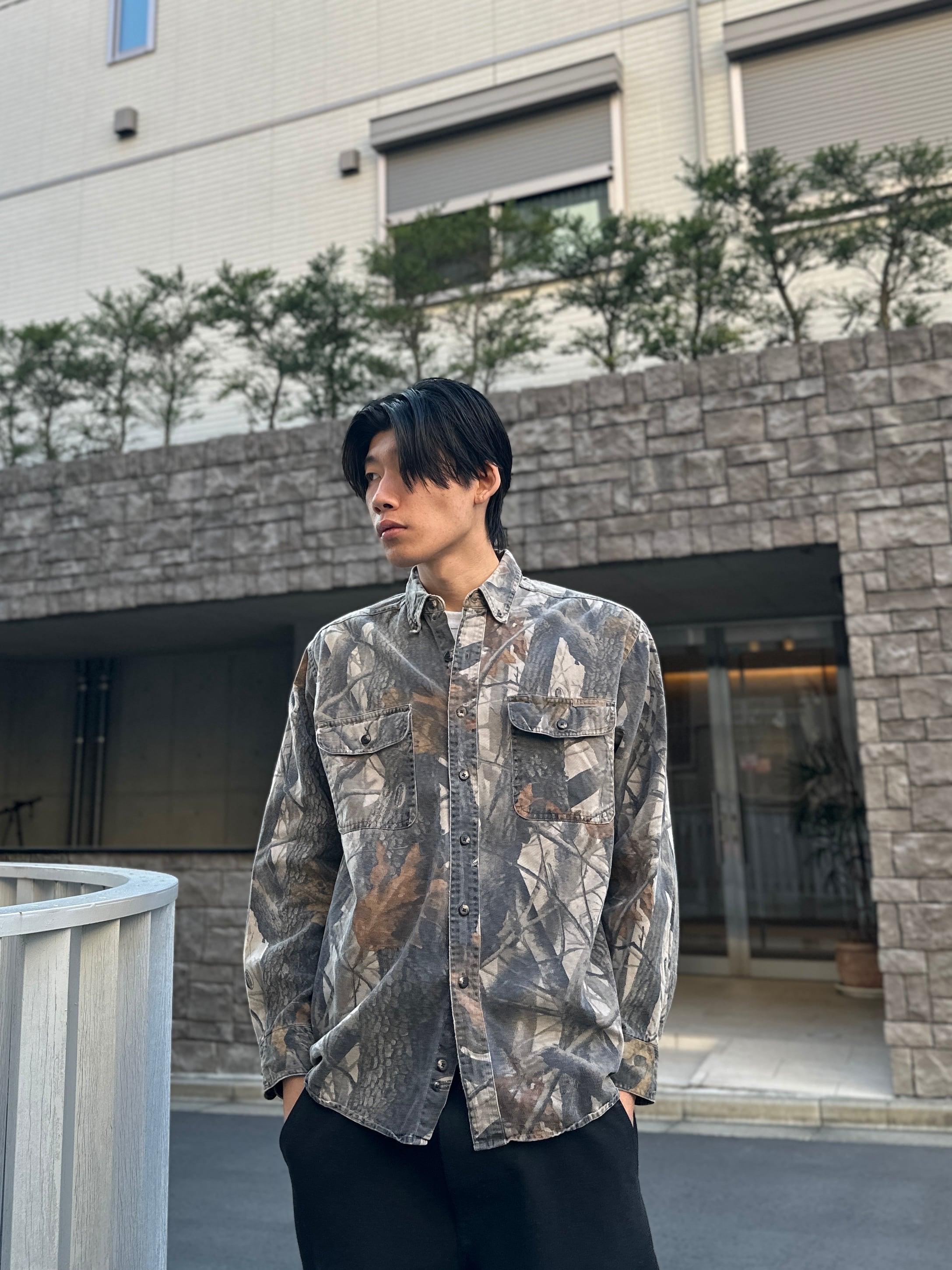 リアルな柄デザインが魅力的な、ラングラーのリアルツリーカモ柄コットンシャツ。暗めなトーンなので、様々なアイテムとの相性が良さそうです。ゆったりとしたサイズ感で、今の時期にはインナーとしても活躍してくれます。
