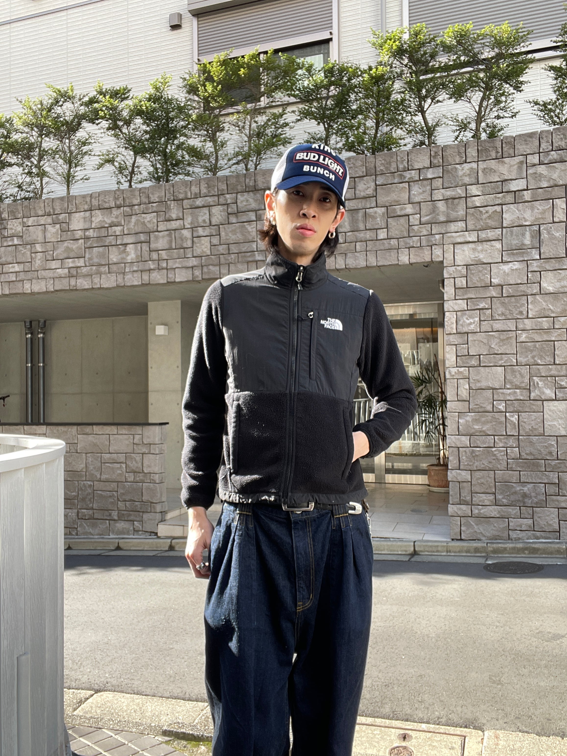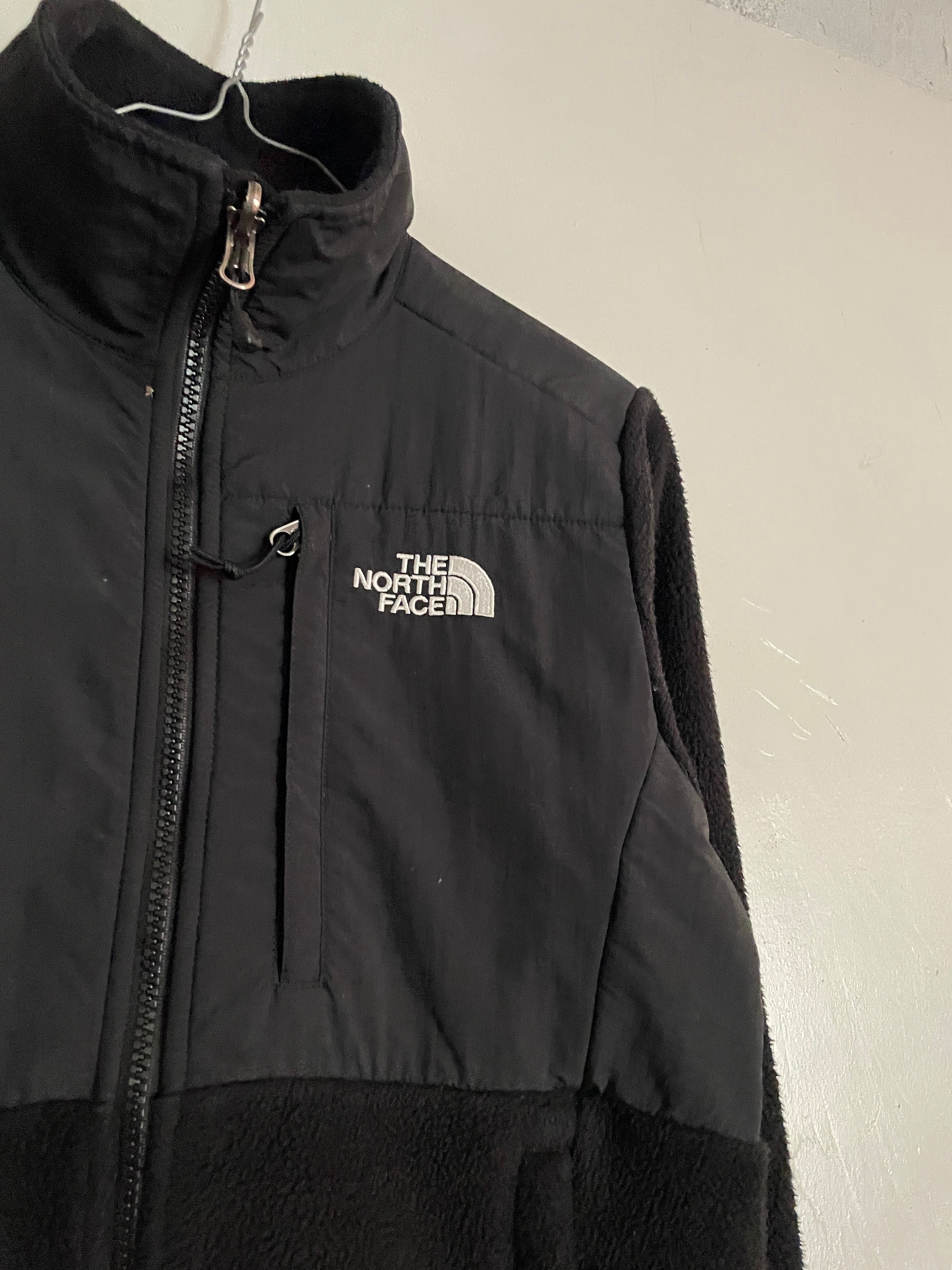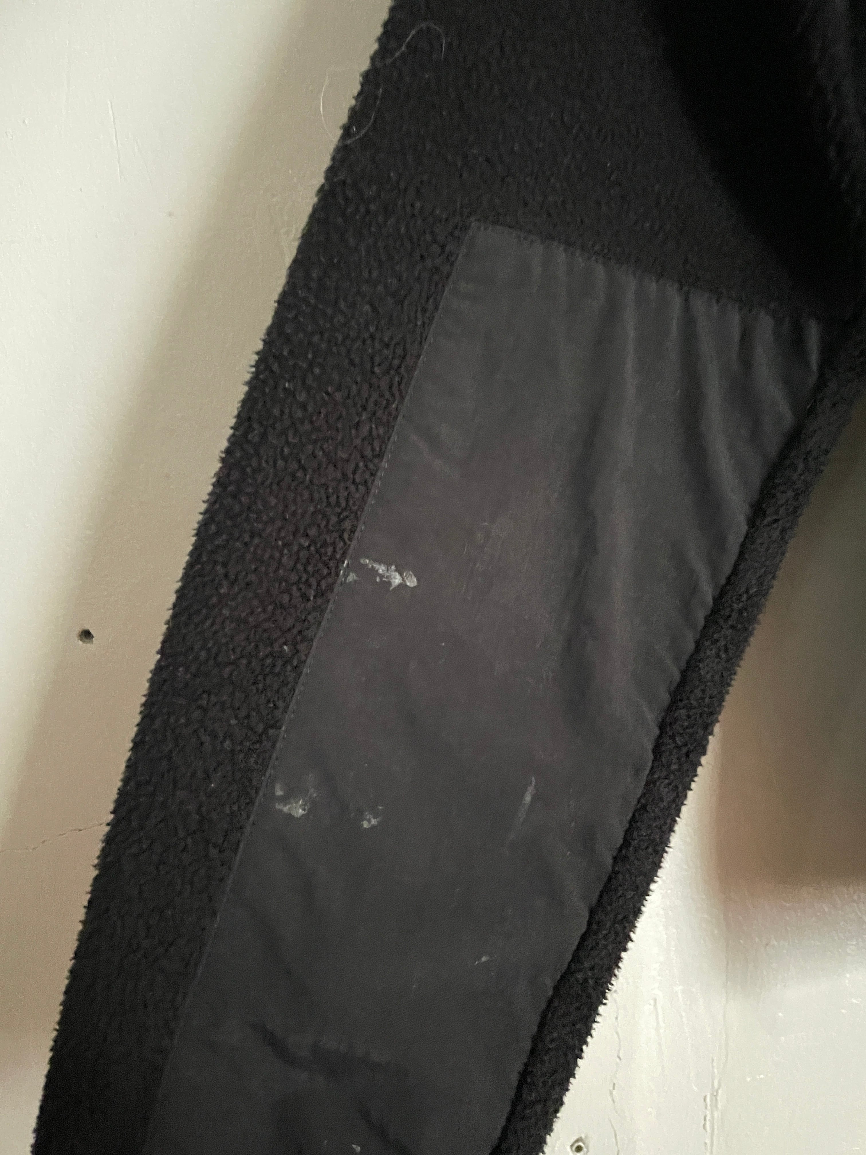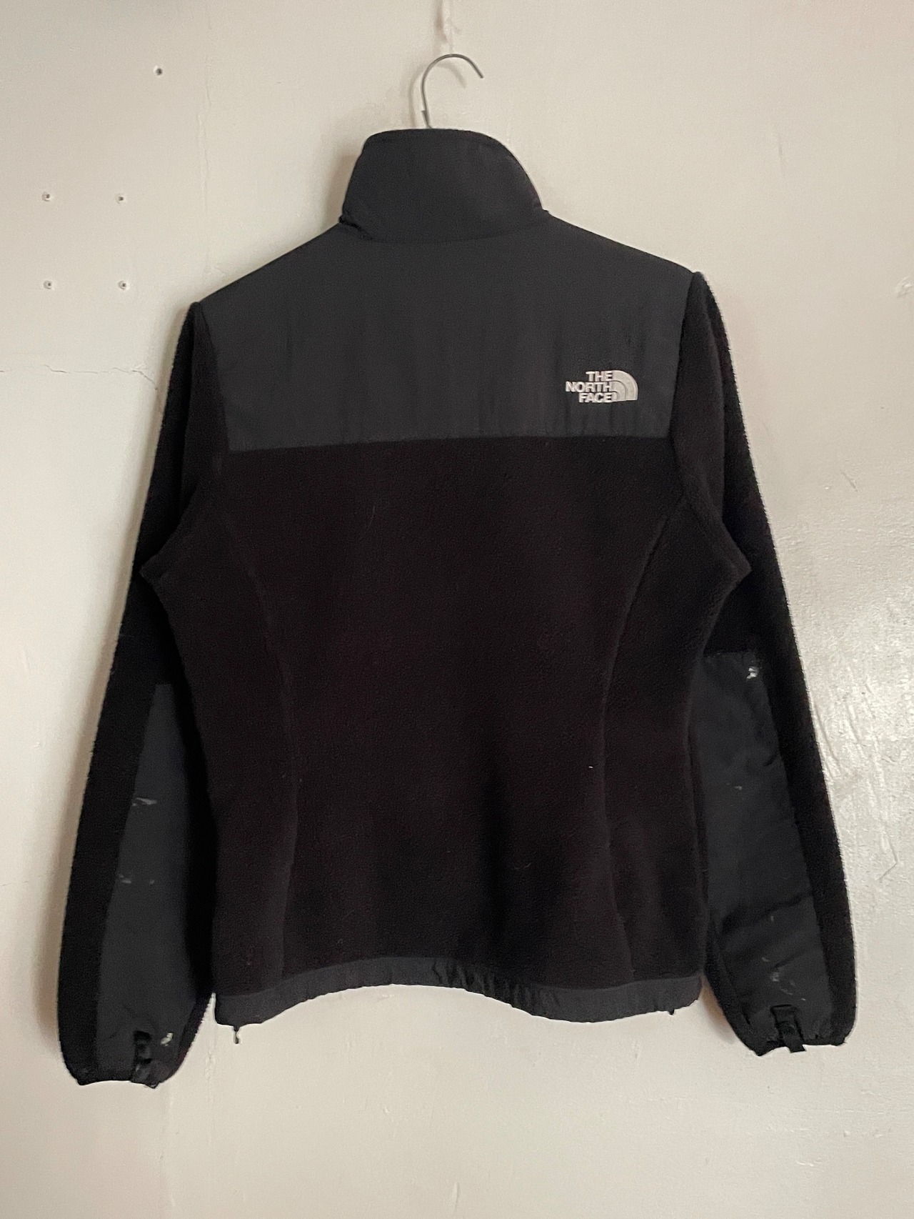 ブラックボディで、フリースとナイロンで切り替えられた、ノースフェイスのデナリジャケット。フワッとしたフリース素材と、水を弾いてくれるナイロン素材が合体した、機能性と保温性を兼ね備えた一着です。フロントとバック部分にはワンポイントでノースフェイスロゴ。大き過ぎず、小さ過ぎないサイズ感なので、男女共におすすめしたいアイテムです。冬には確実に活躍してくれる一着です。両袖部分に若干のペンキ跡のようなものが見られます。