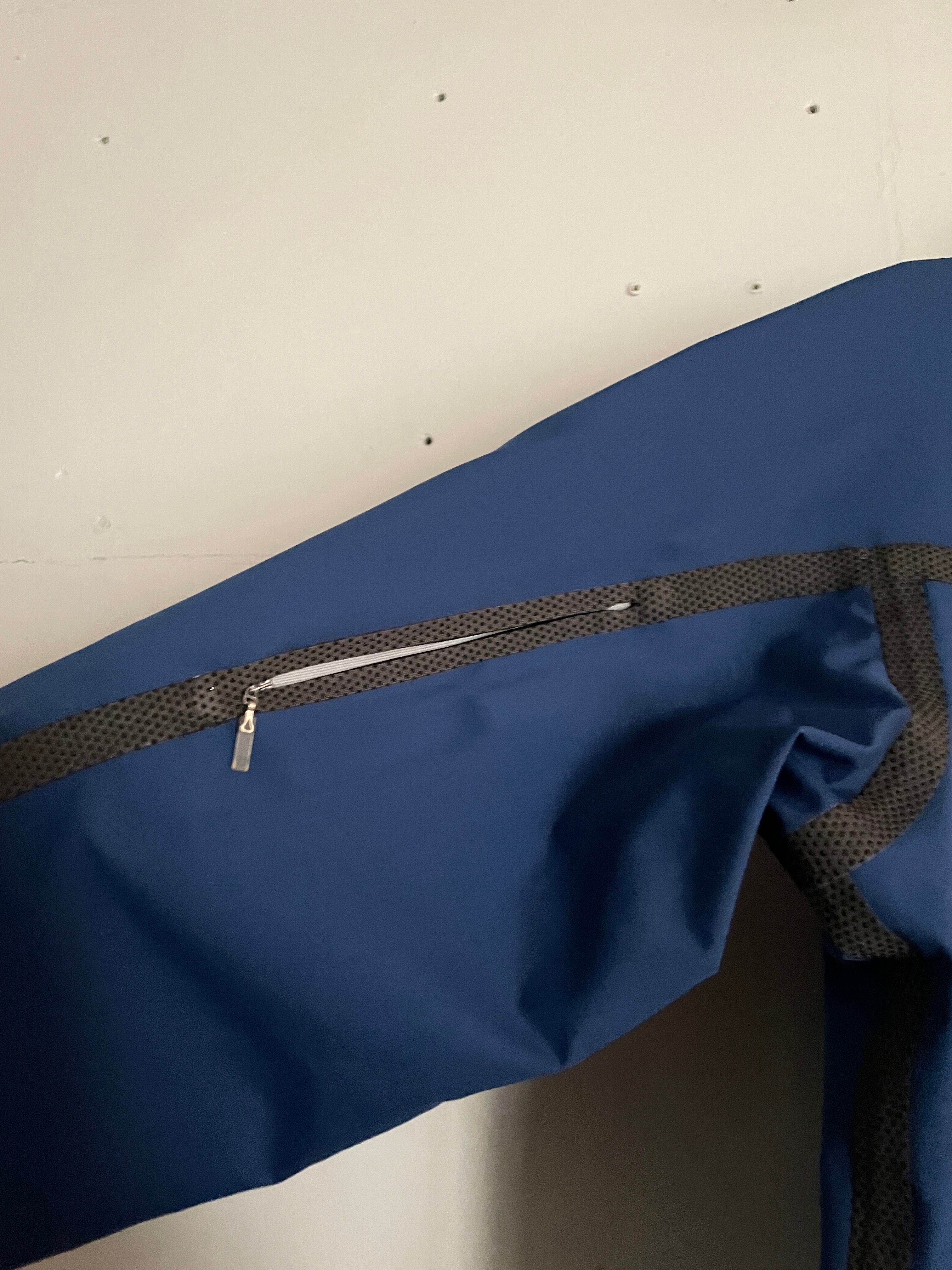 ブルーボディに、ブランドロゴとアルバータ州スポーツチームロゴ刺繍が施された、マウンテンハードウェアのソフトシェルジャケット。鮮やかなブルーに、グレーのパイピングデザインが施されています。ポケットも豊富で、裏地はフワッとしたフリース素材になっています。機能性、保温性に優れた1着です。テックな雰囲気がガッツリと感じられるアイテムです。大き過ぎず、小さ過ぎないサイズ感なので、男女共におすすめしたいです。