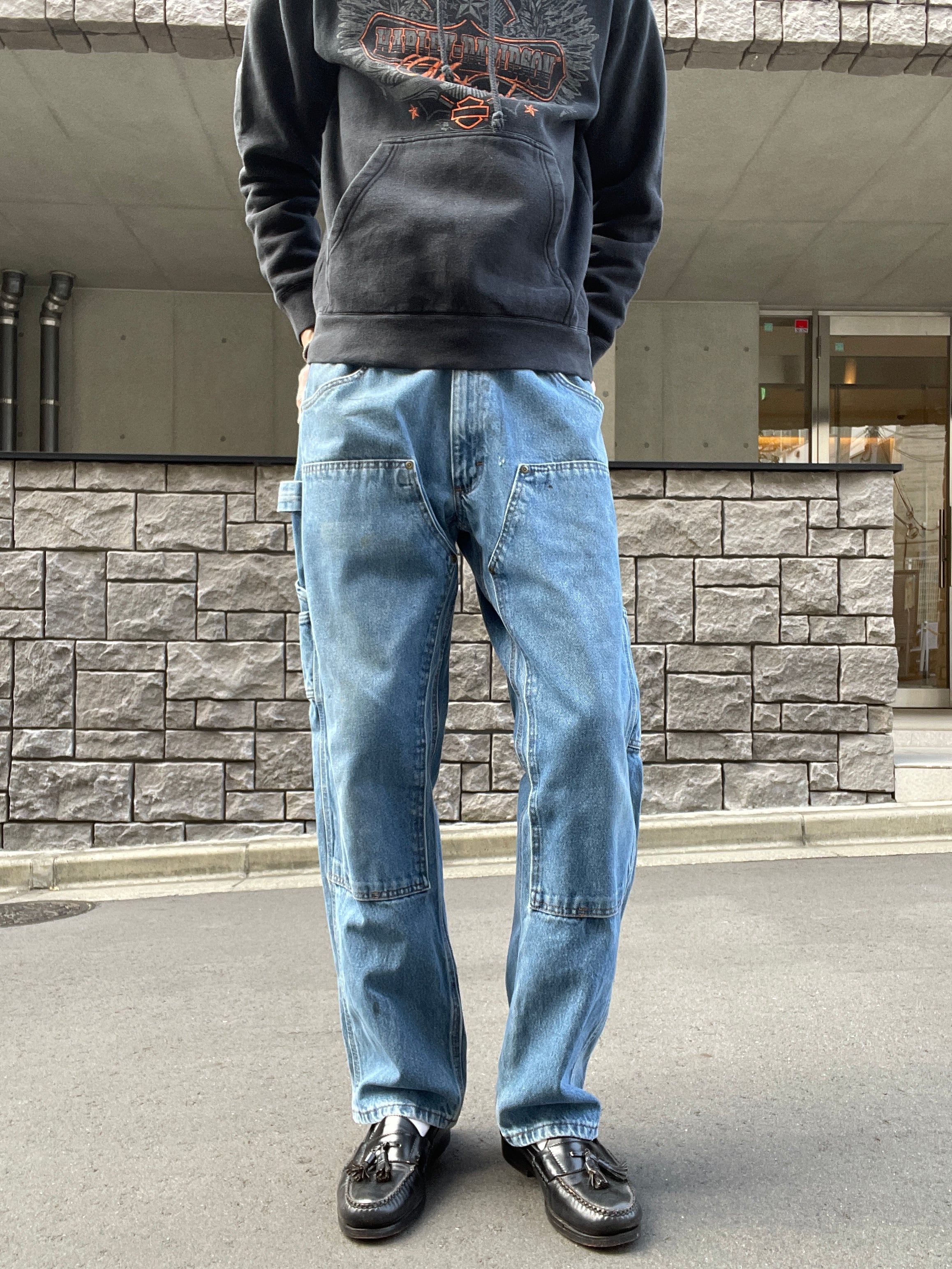 やや褪せた色味で、ガツンとした太さのある、キーのダブルニーペインターデニムパンツ。膝部分が二重になっているダブルニー仕様で、耐久性に優れたボトムス。厚手のしっかりとした丈夫な生地感。ワイドストレートシルエットで雰囲気抜群の一本です。季節問わずガシガシ履けるアイテムです。