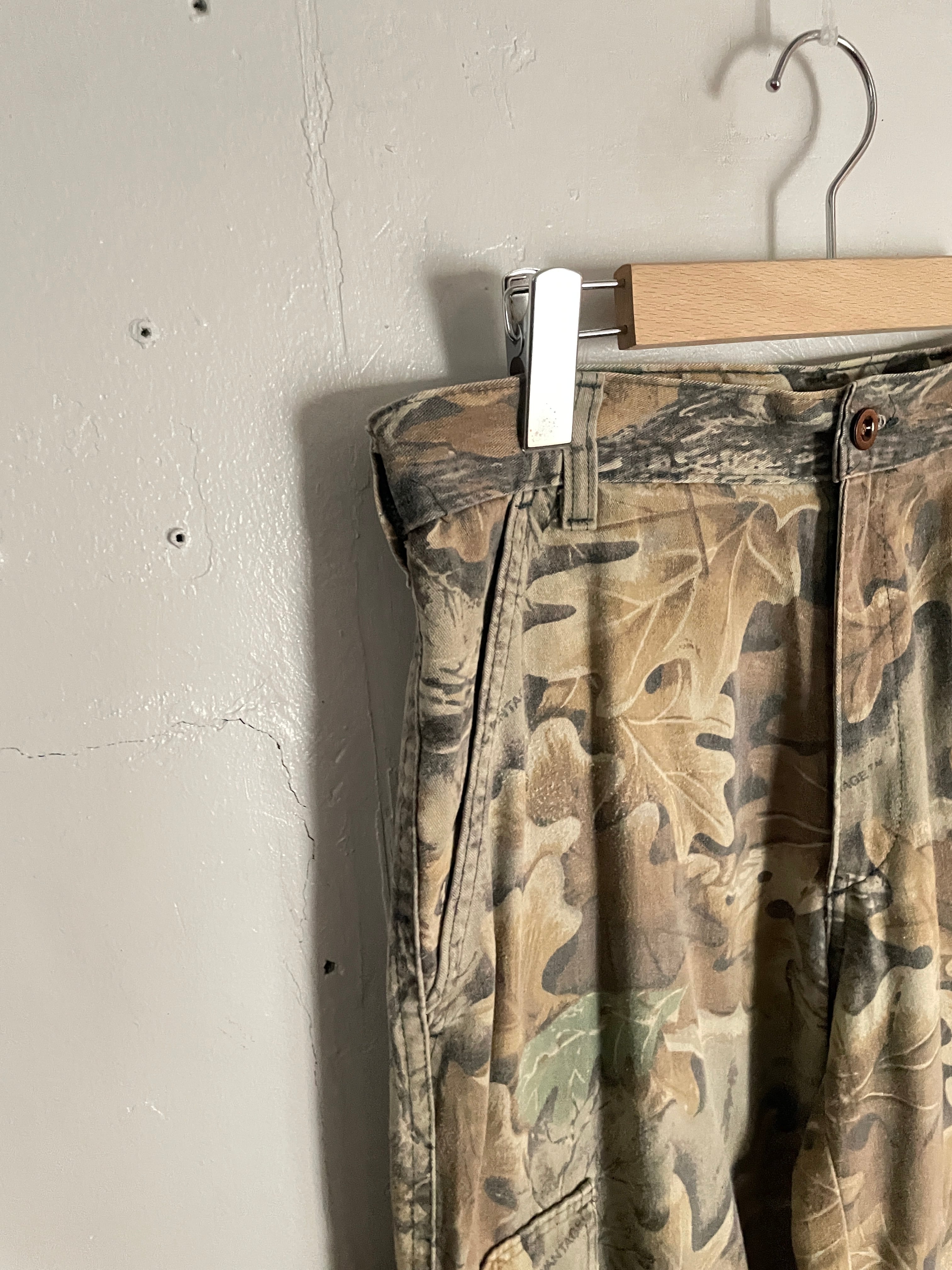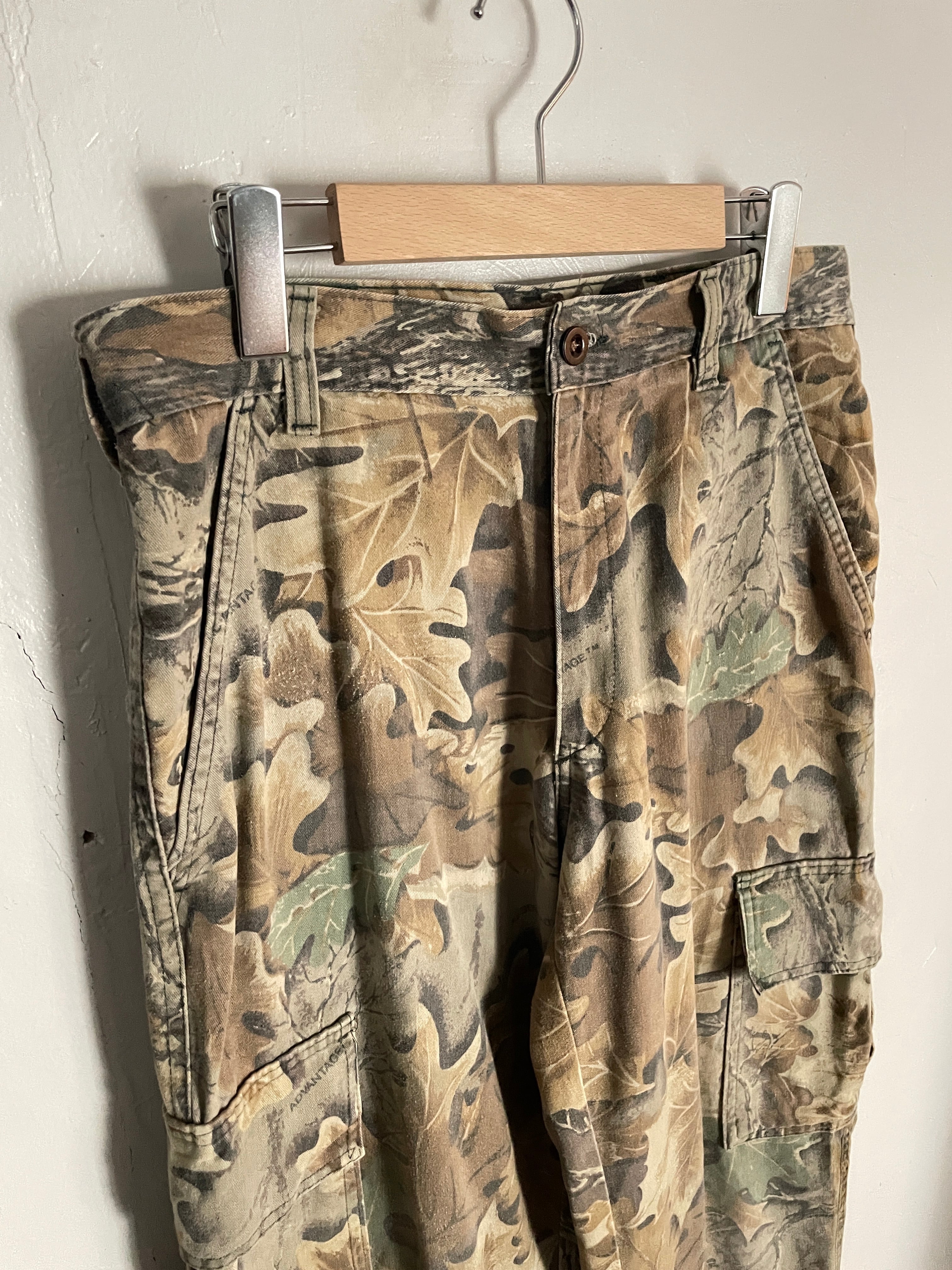 淡いリアルな柄デザインが魅力的な、リアルツリーカモ柄のカーゴパンツ。触り心地の良いフワッっとした軽めな素材感。ガツンとした太さのあるワイドシルエット。ポケットも豊富で機能性にも優れたパンツです。柄物ですが、デザインにまとまりがあるので、様々なファッションに取り入れやすい一本かと思います。