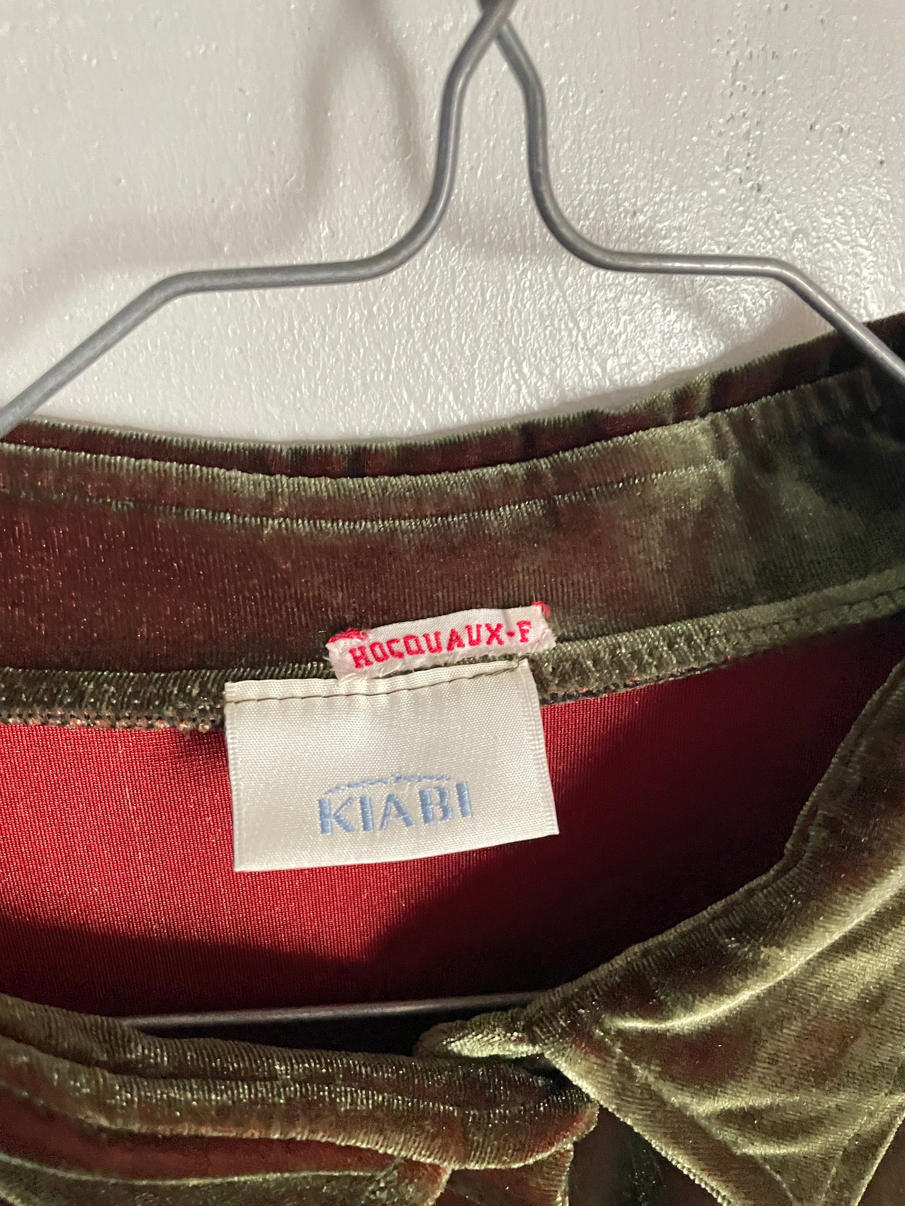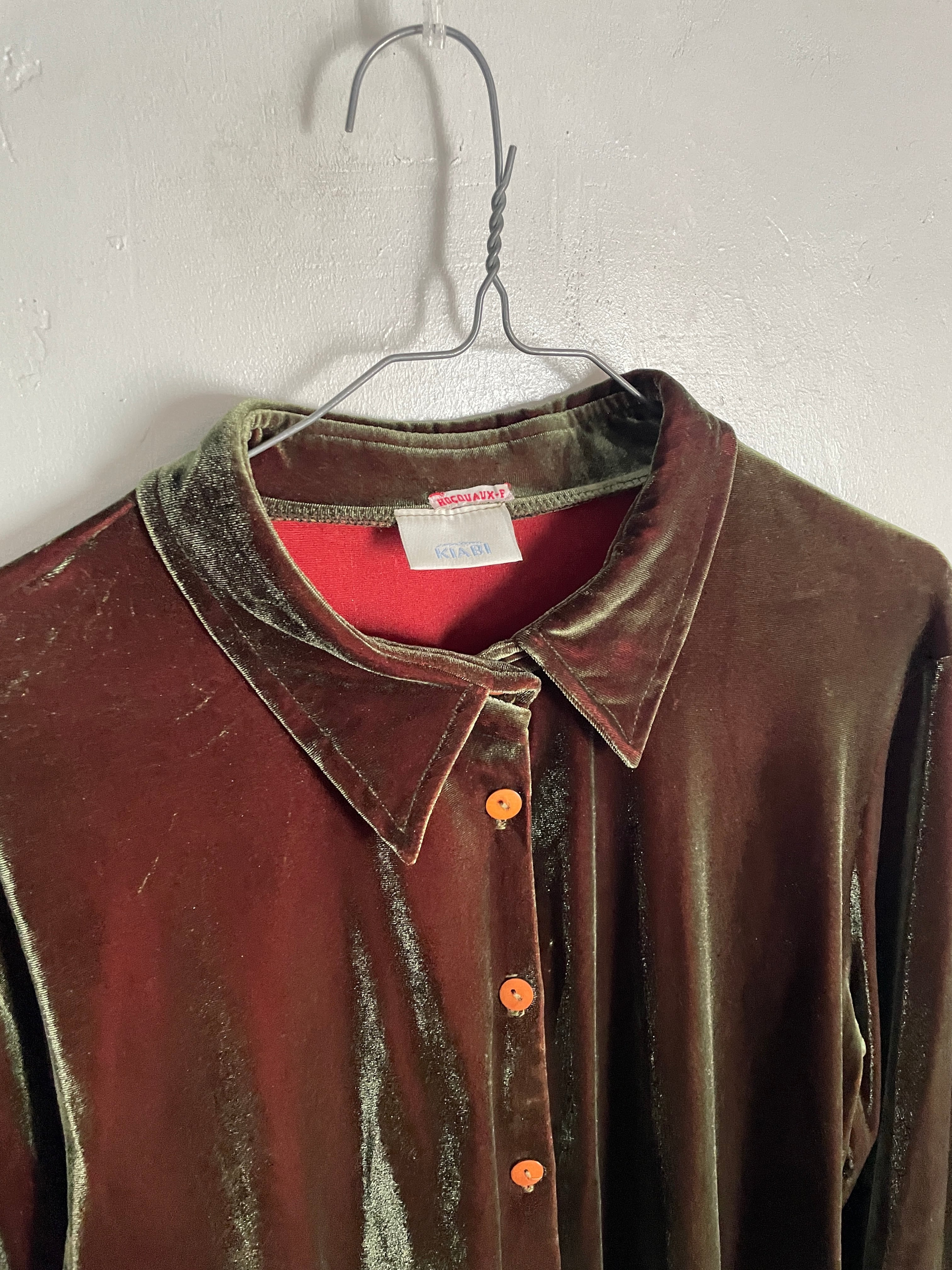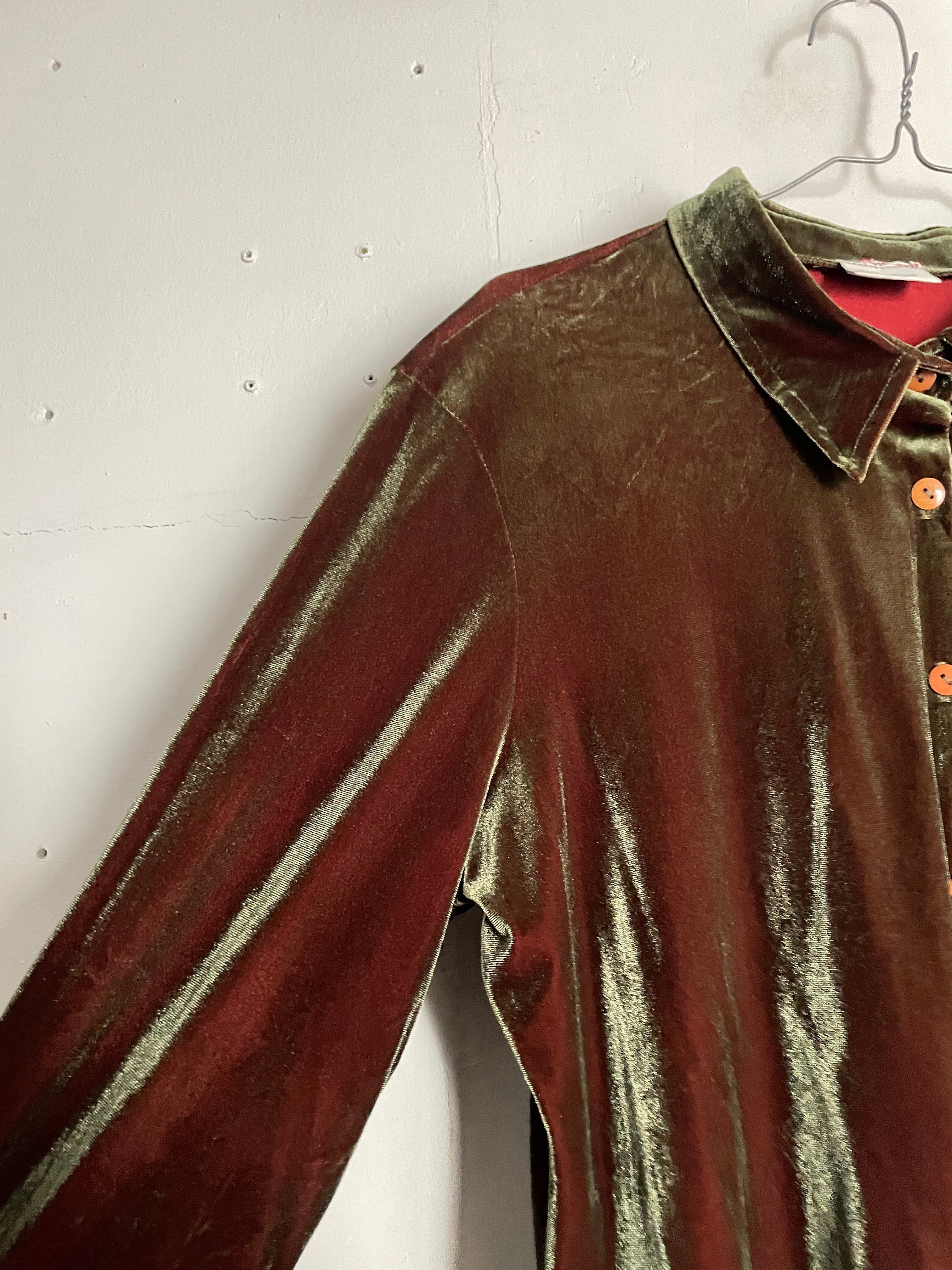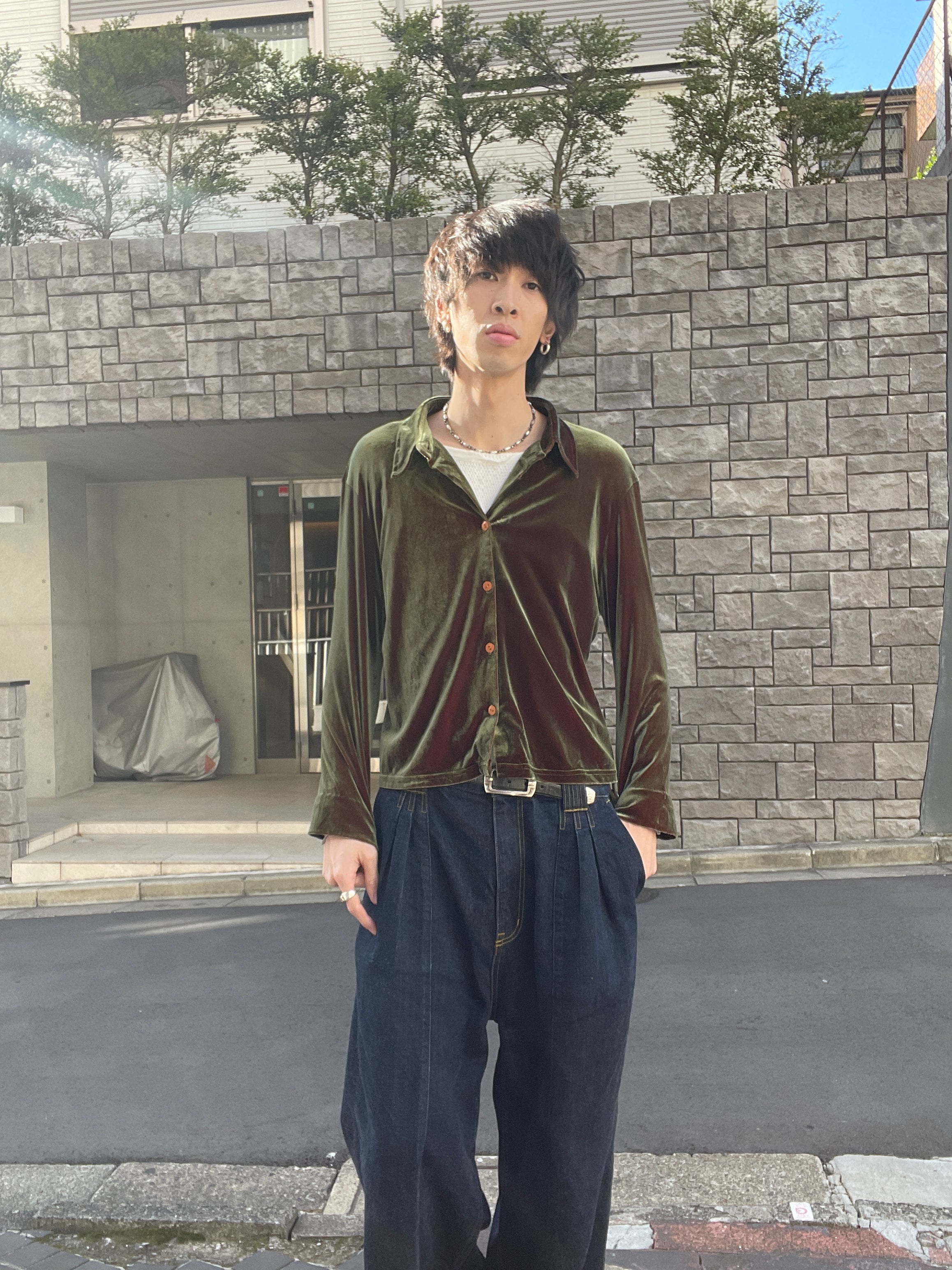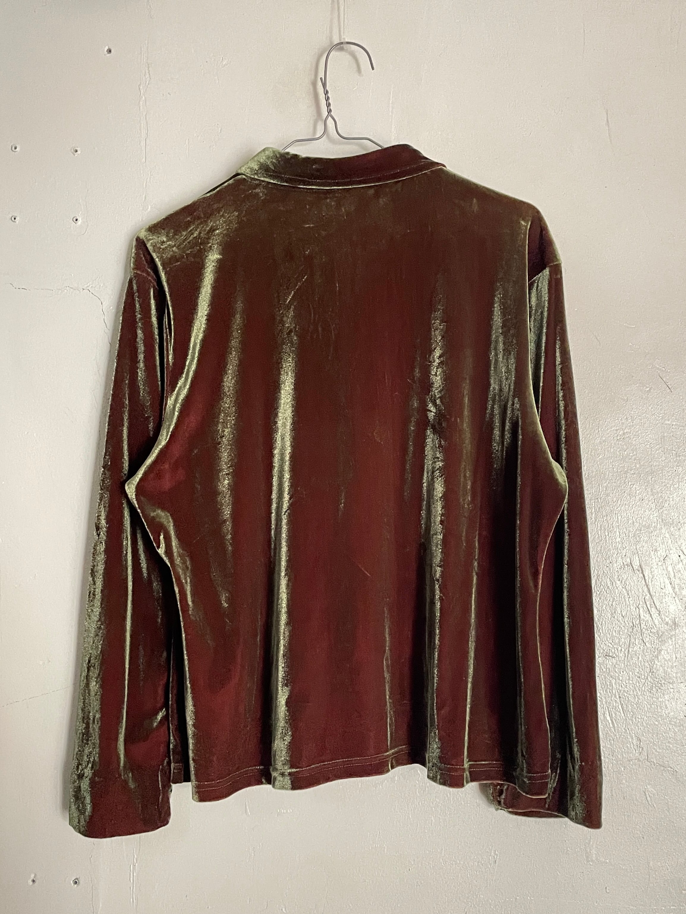 光の当たり方によって色が変化する、玉虫色のベロアシャツ。ミステリアスな雰囲気が漂う色気抜群のシャツ。ストレッチの効いた上品なベロア素材。肌触りも良いです。一枚ではもちろん社役になってくれますが、今の時期にはインナーの差し色としても活躍してくれるアイテムかと思います。フランス製なのも魅力的です。