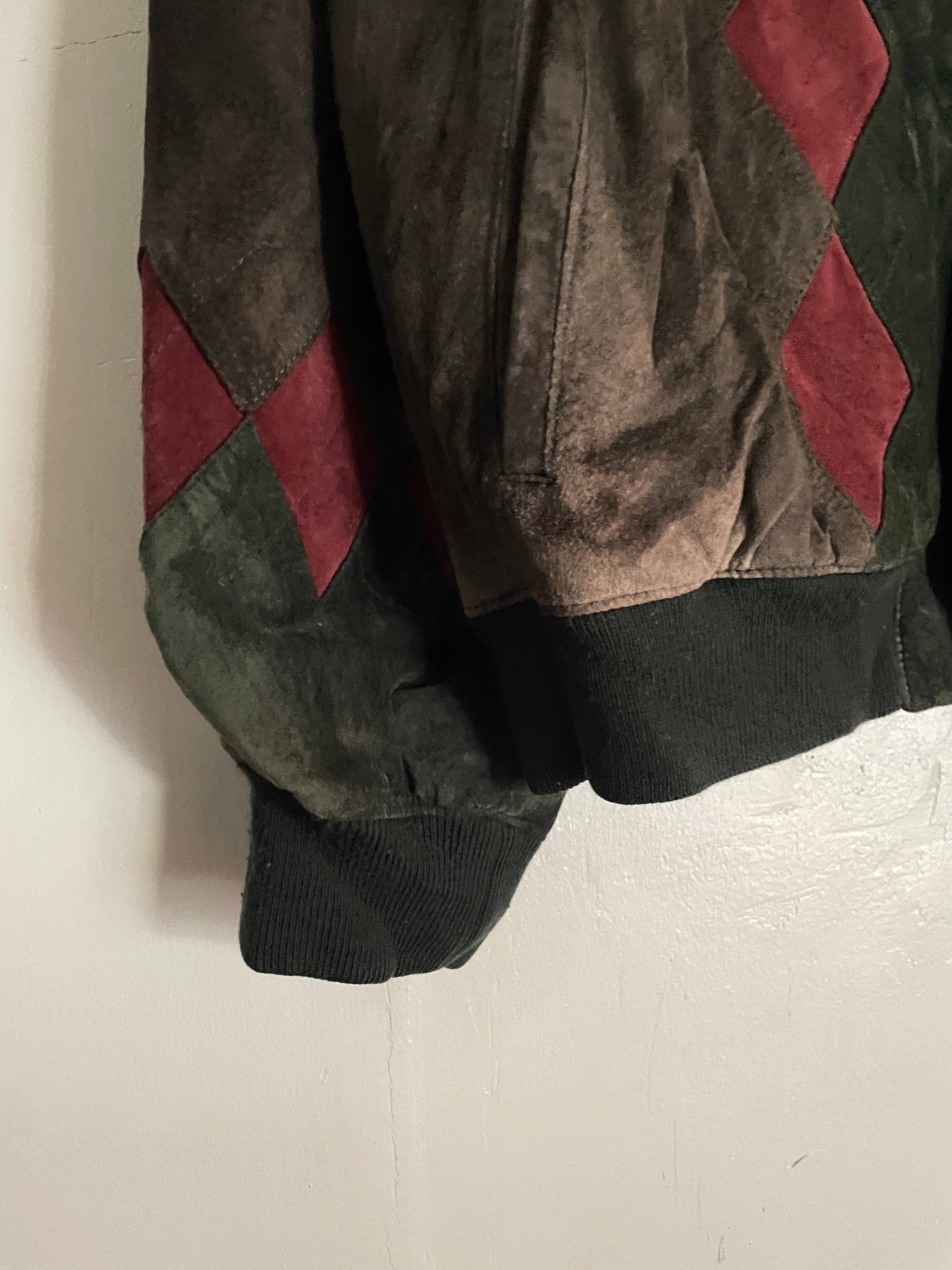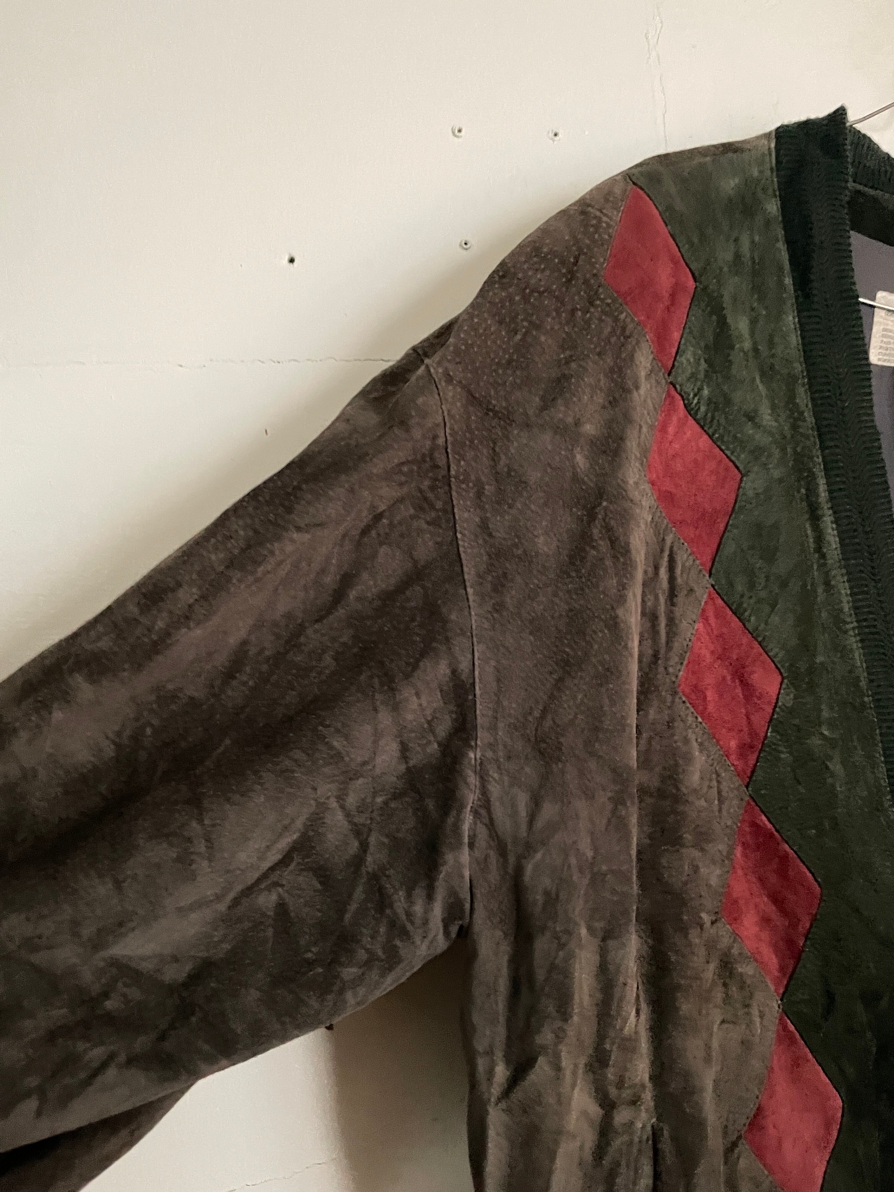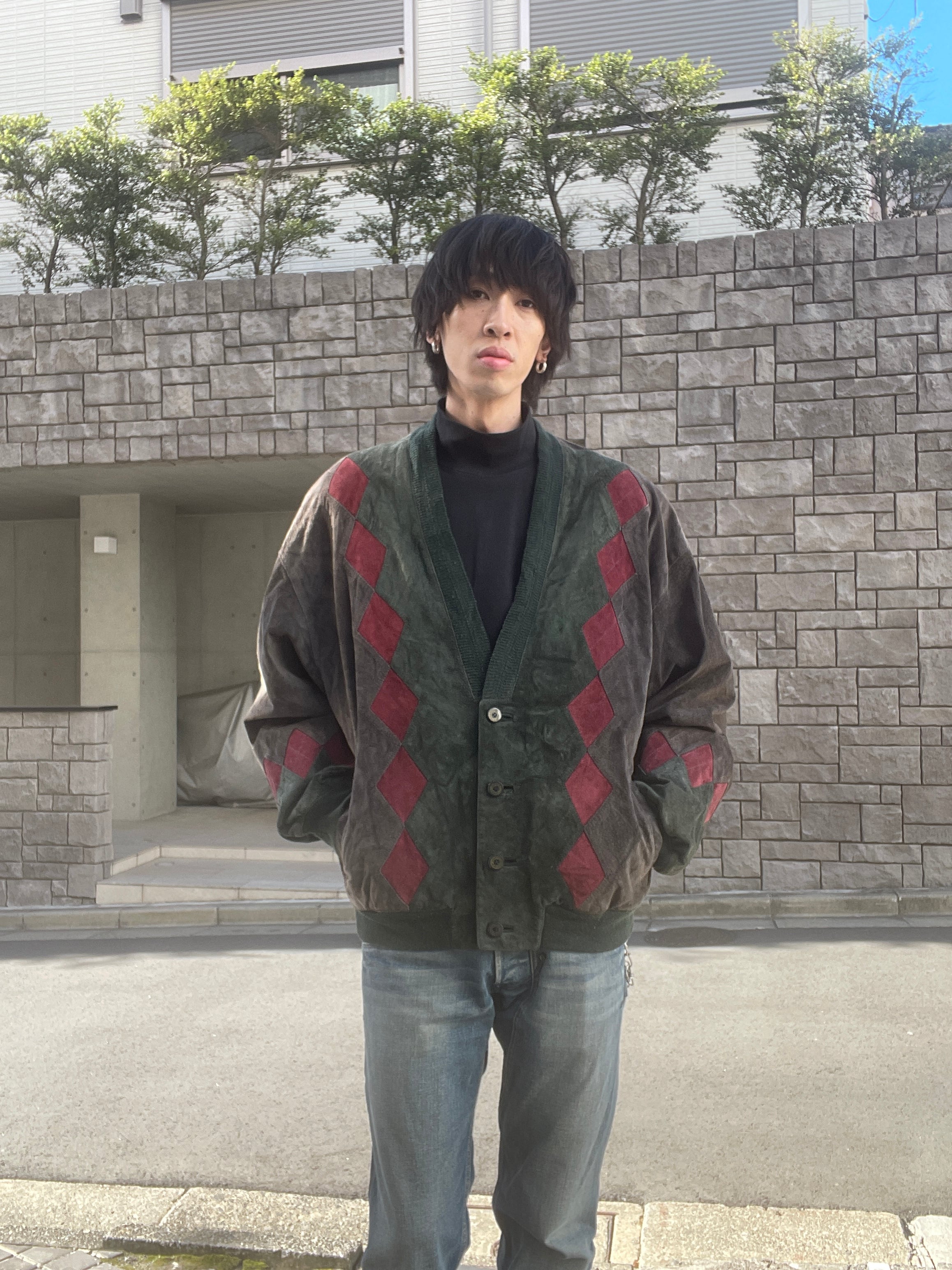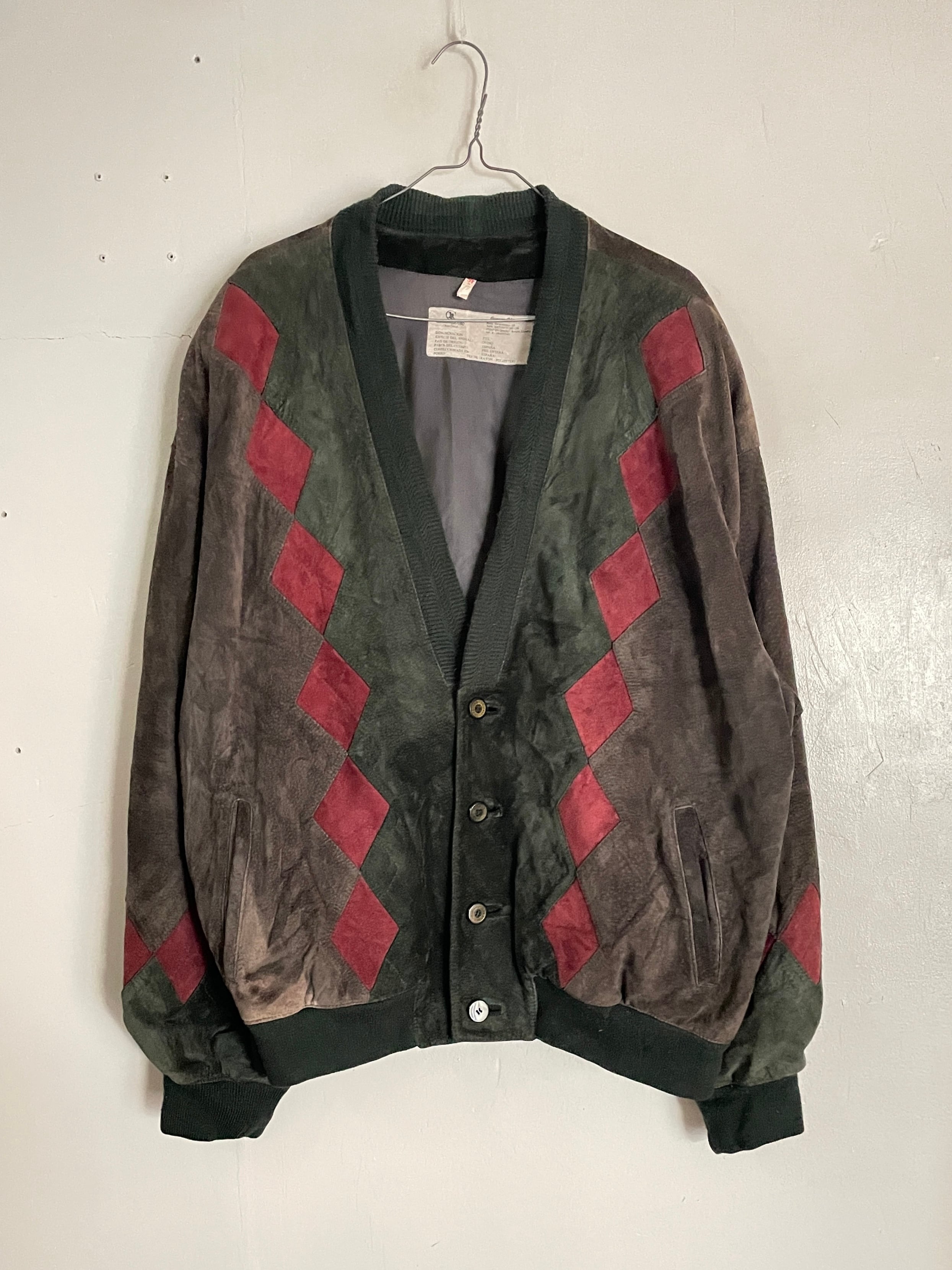 やや褪せたグリーン、レッド、グレーボディから、渋さと色っぽさを感じられる、スエードレザーニットカーディガン。独特な色味で、縦に施されたアーガイル柄もお洒落です。ユニークなディテールで、どこかレトロな雰囲気が感じられます。レザー特有の良い重量感があって、程良い丈感で、たっぷりめな身幅が今っぽいシルエットです。これからの季節一軍入り間違い無しのアイテムかと思います。スペイン製なのもポイントが高いです。