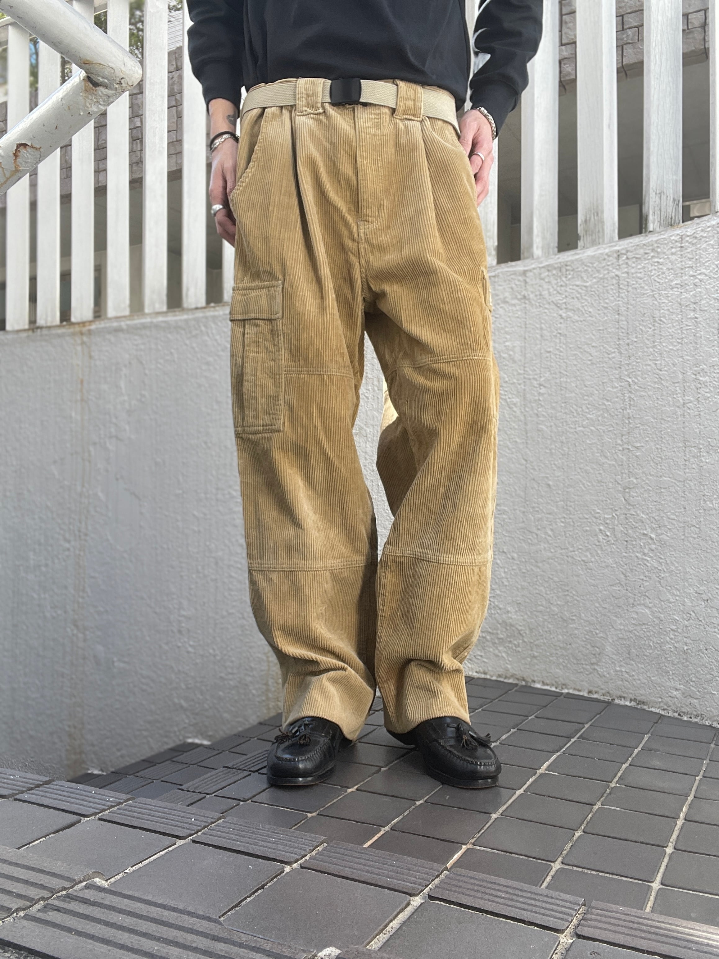 ベージュカラーで、タックの入った綺麗なワイドシルエットが魅力的な。コーデュロイカーゴパンツ。ポケットも豊富で機能性にも優れた一本。ストリートやアメカジなど、様々なファッションの取り入れやすいパンツかと思います。コーデュロイパンツは今の時期一本は持っておきたいアイテムかと思います。