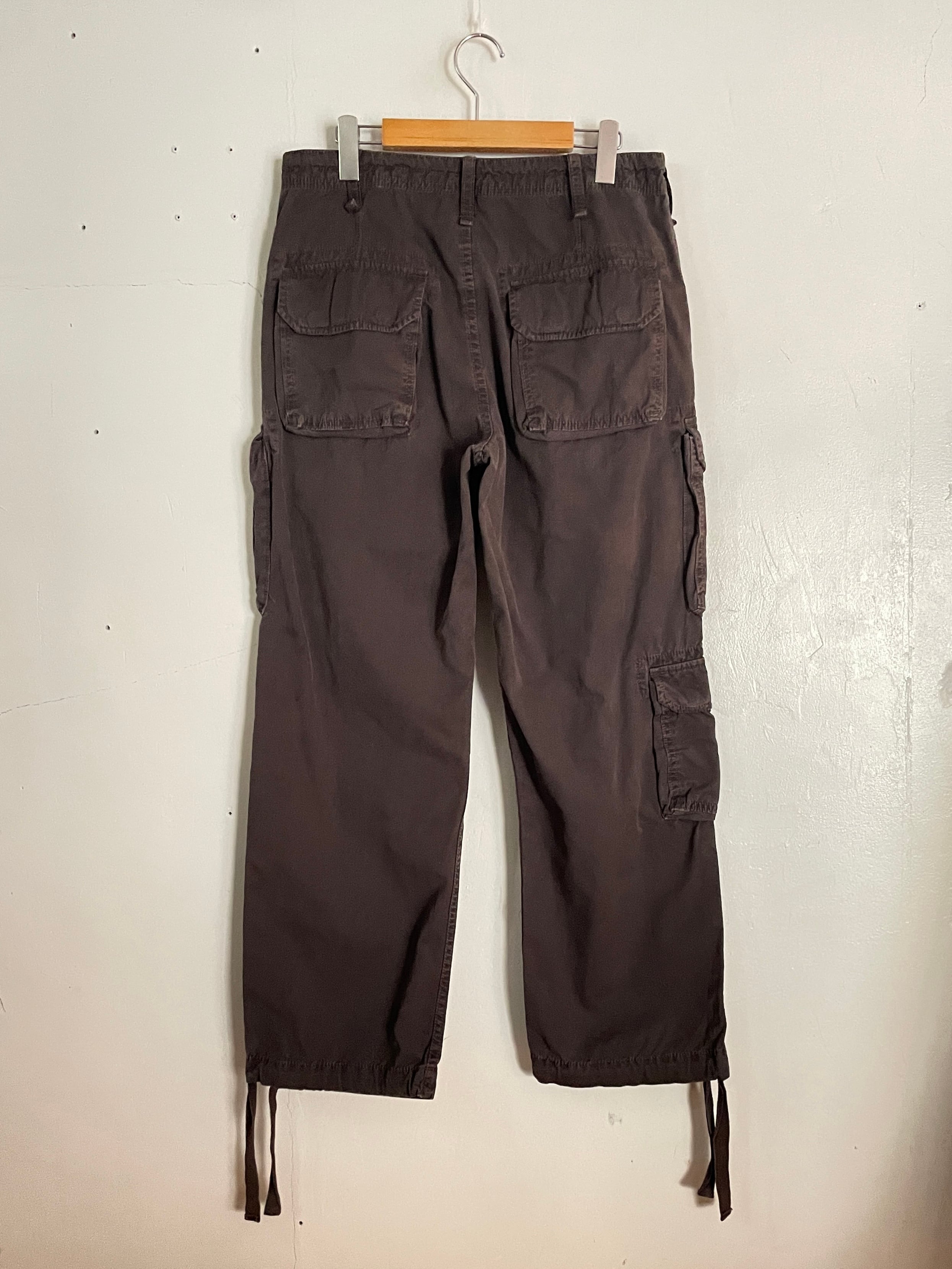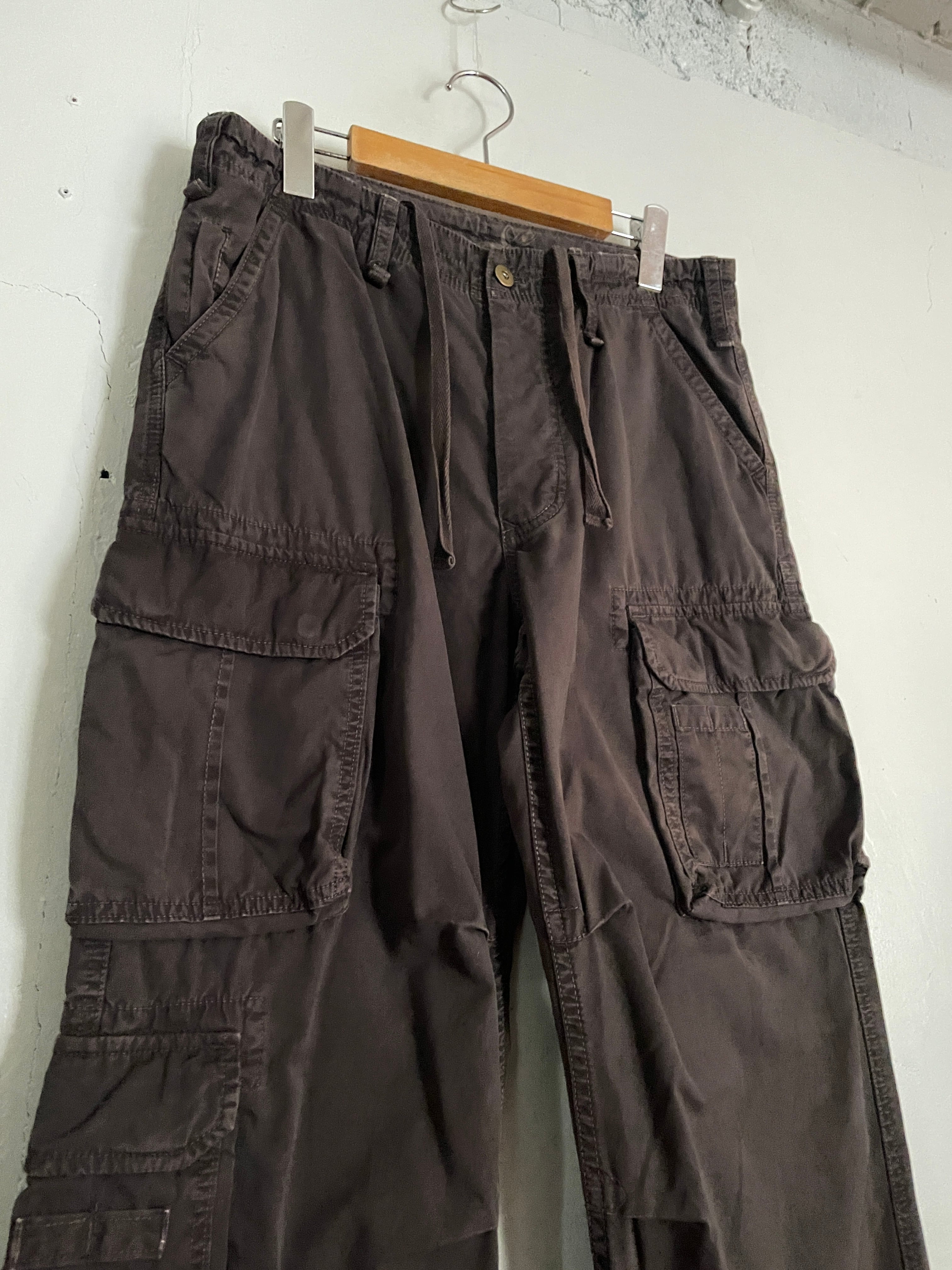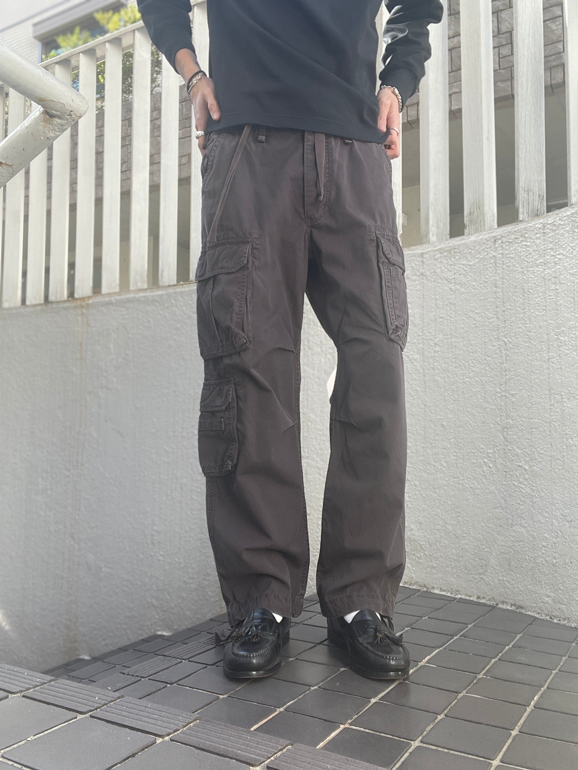 やや褪せたグレーカラーで、ギミックが豊富なカーゴパンツ。テックとY2Kがミックスしたようなディテールです。ポケットが多く、機能性抜群です。ガツンとしたワイドシルエット。ウエスト、裾にはドローコード付き。裾を縛って履いても、また違ったシルエットで履けます。さらっとしたコットン素材なので、楽に履けるのも魅力的です。