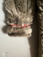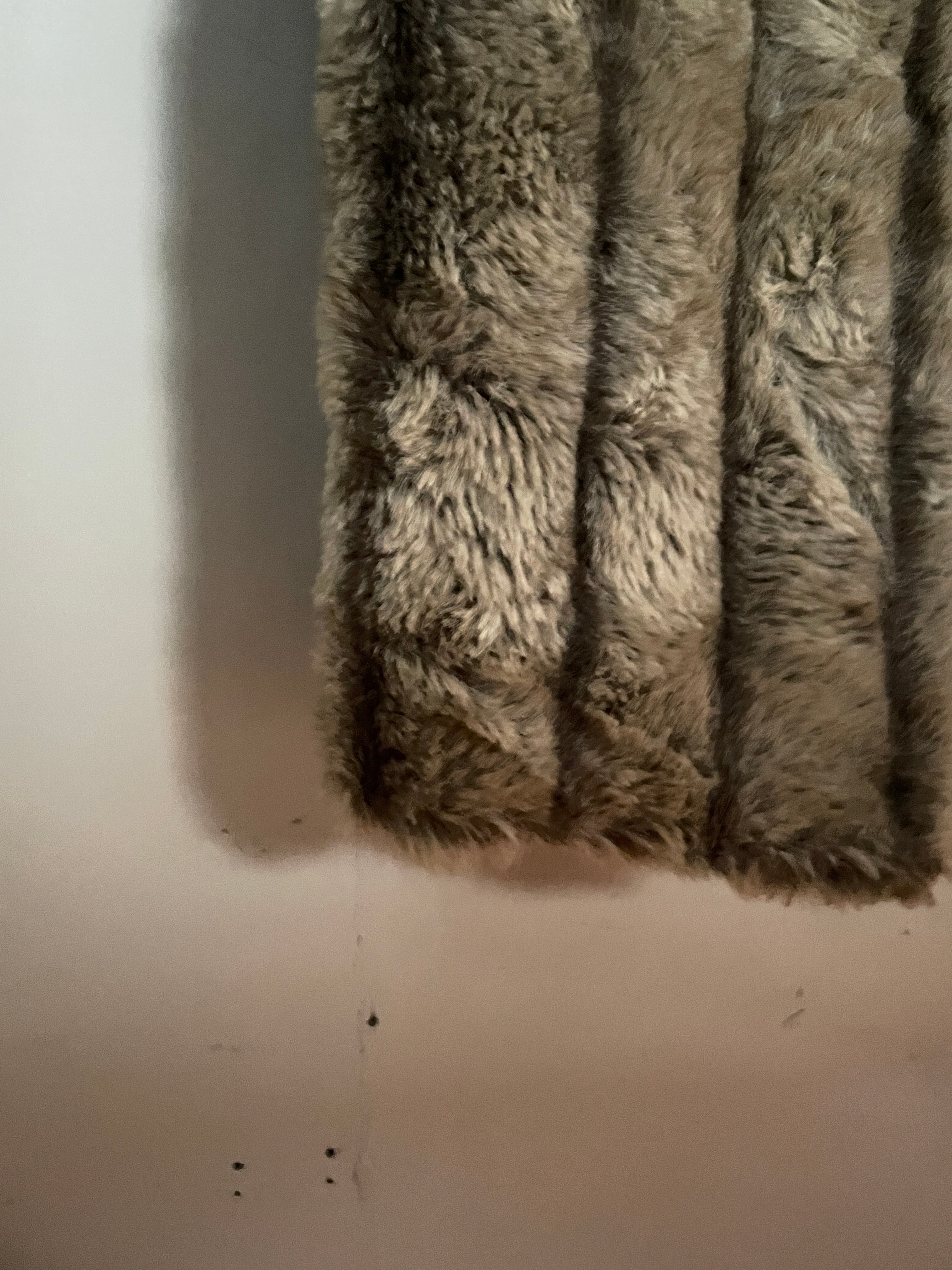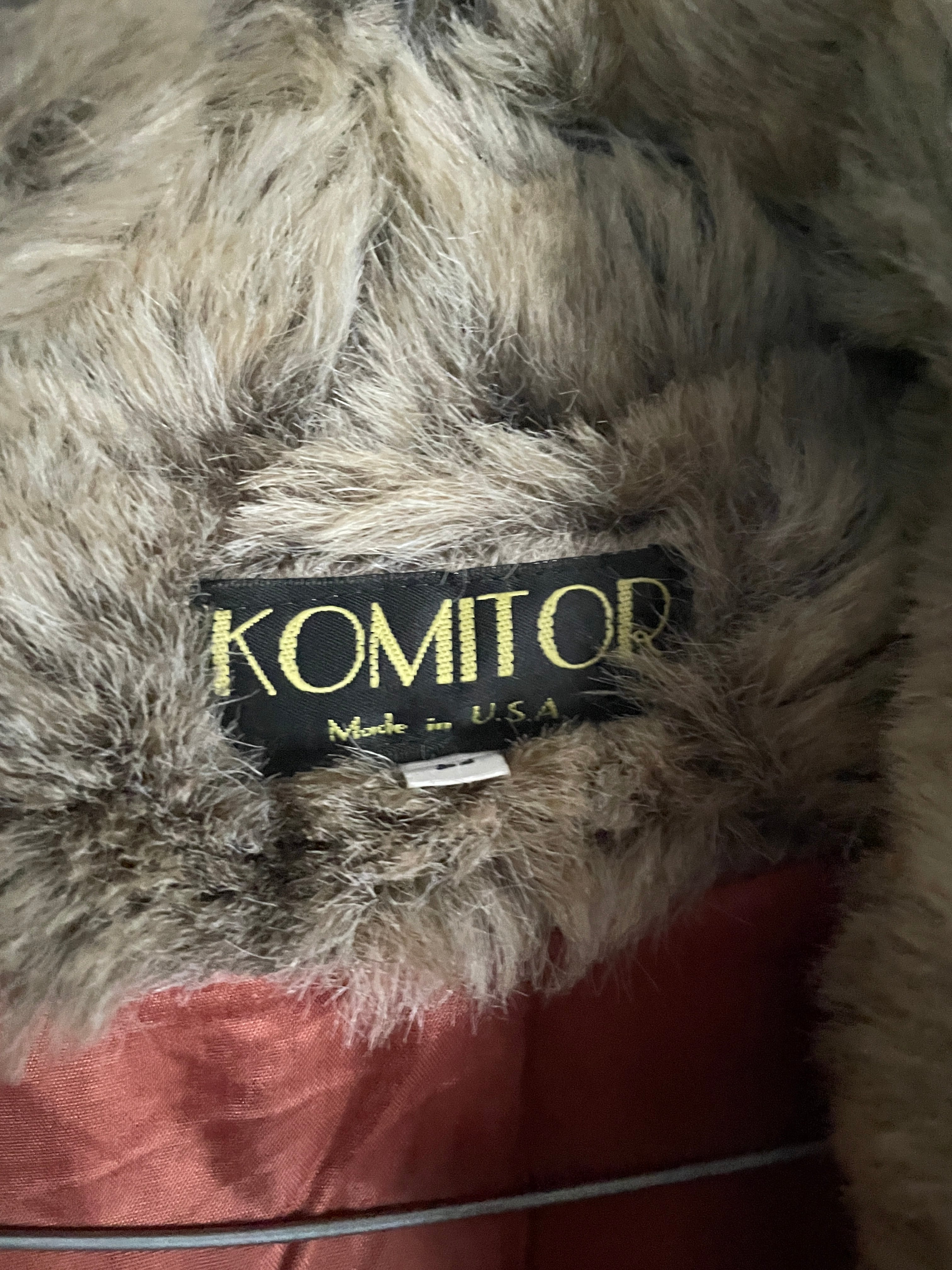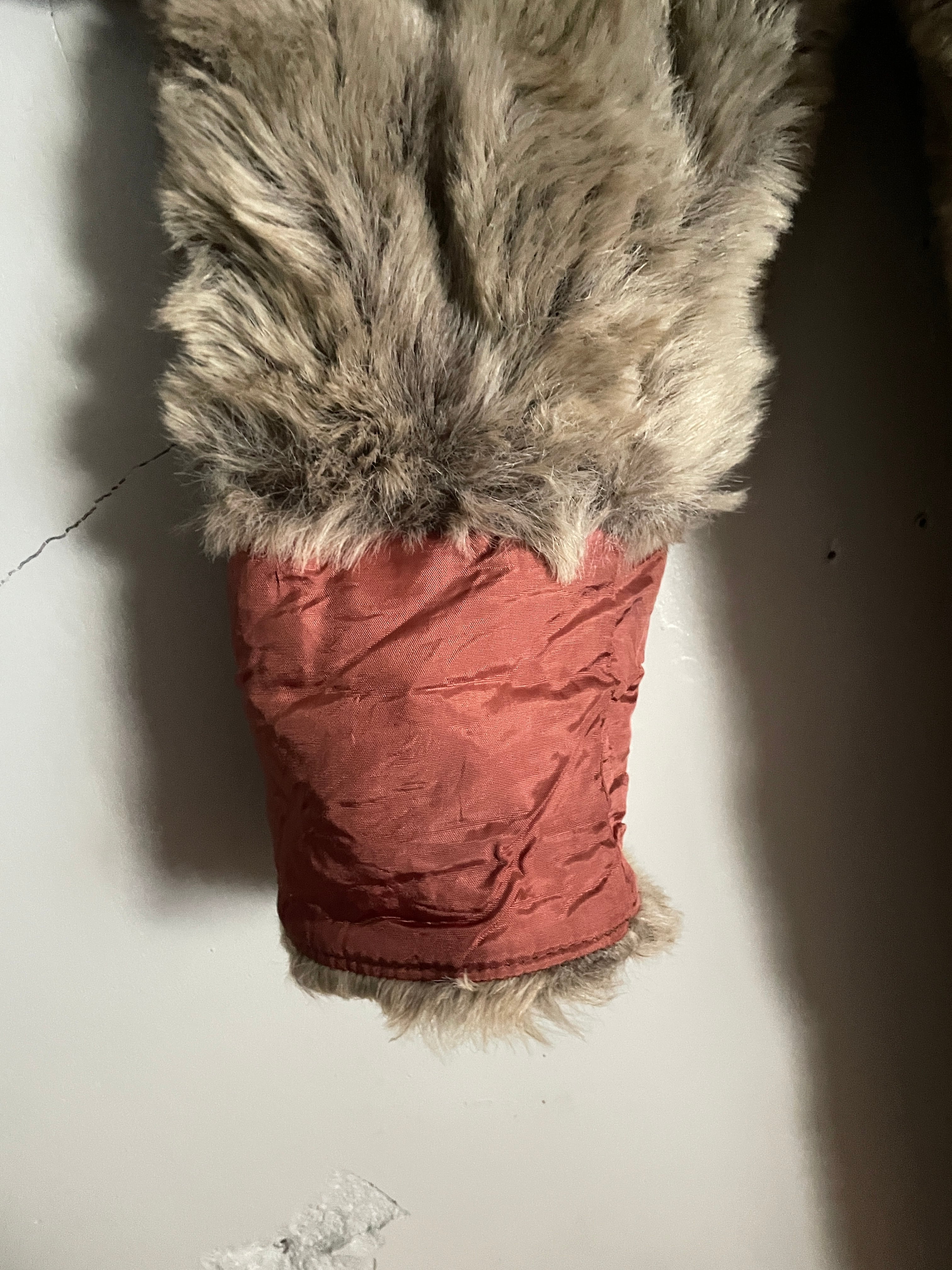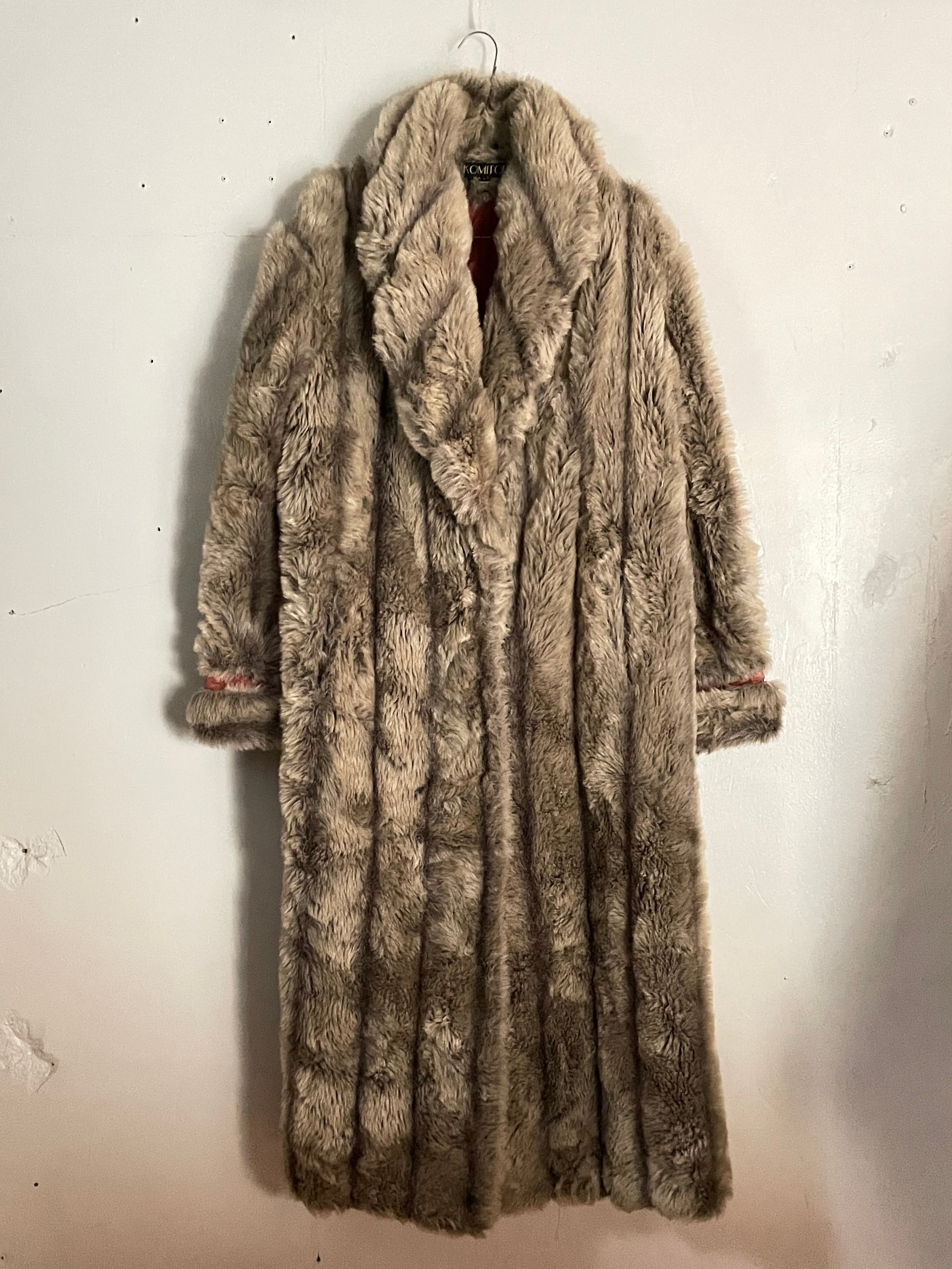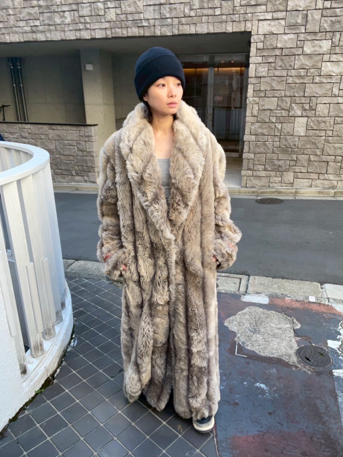 ベージュとブラックが混ざったような色味で、文句無しで雰囲気抜群のファーコート。ボリューム感のある襟と、毛足の長いファー。着丈も長めで、身幅も広め。間違いなくオーラの出る一着です。裏地は光沢のあるオレンジカラーで、サラッとしたアセテート素材。袖部分もポイントでオレンジカラーの切り替えが施されています。保温性にも優れた、冬の主役になるコートです。このディテールでUSA製なのも魅力的です。かなりゆったりとしたサイズ感なので、男性の方にもおすすめしたいです。