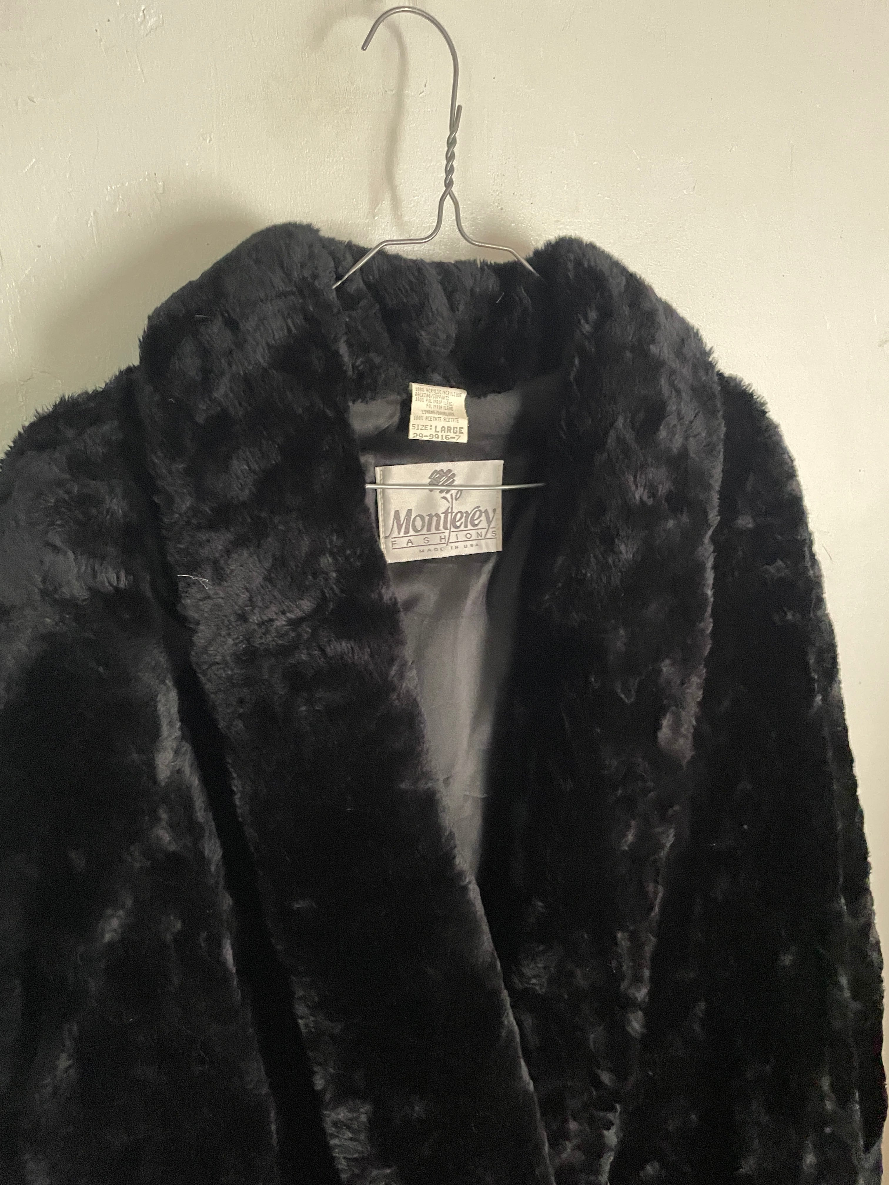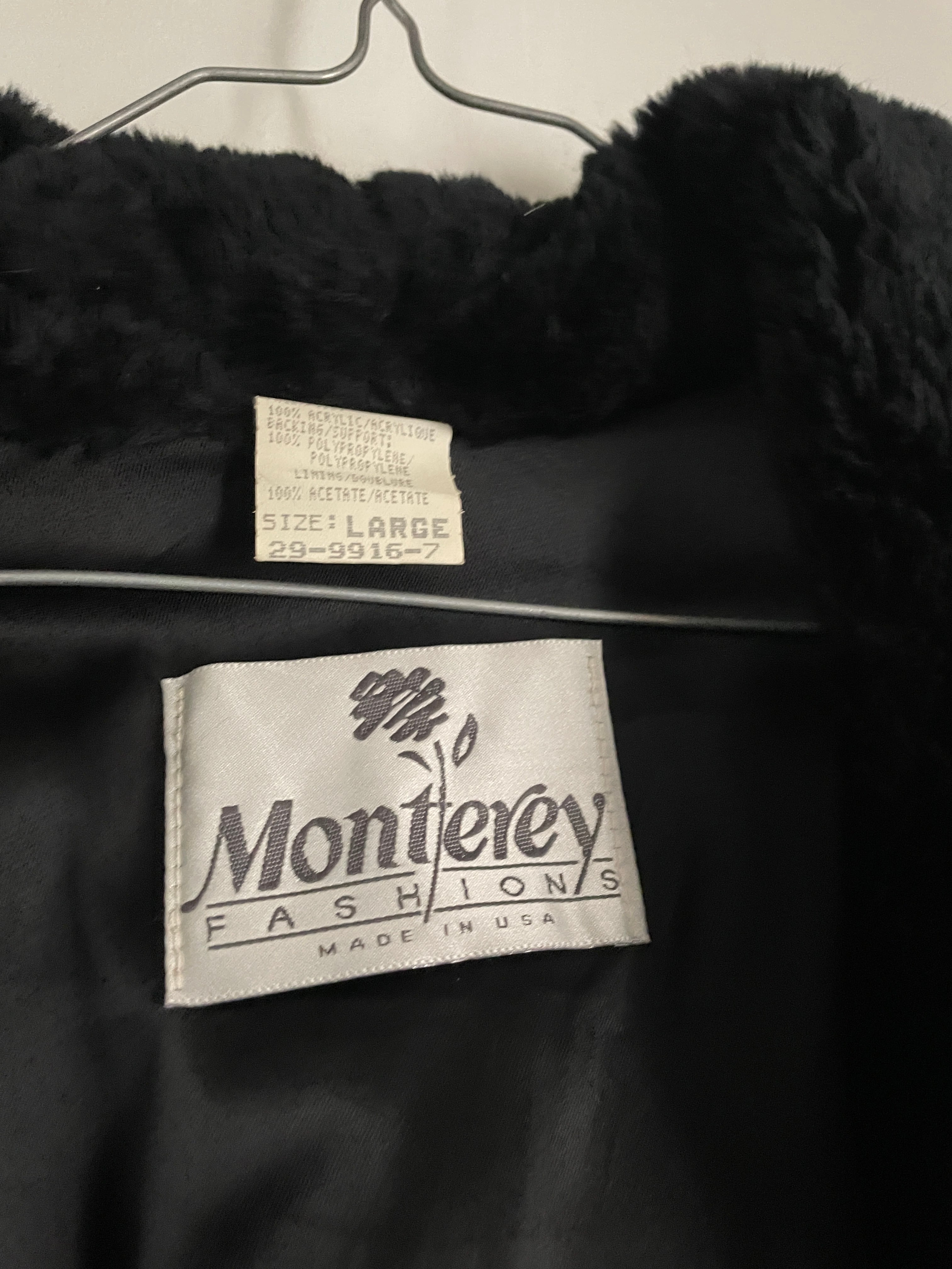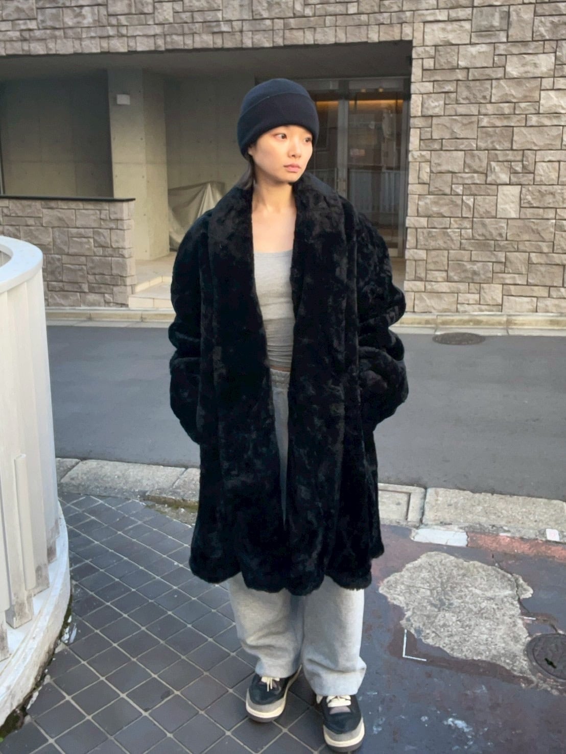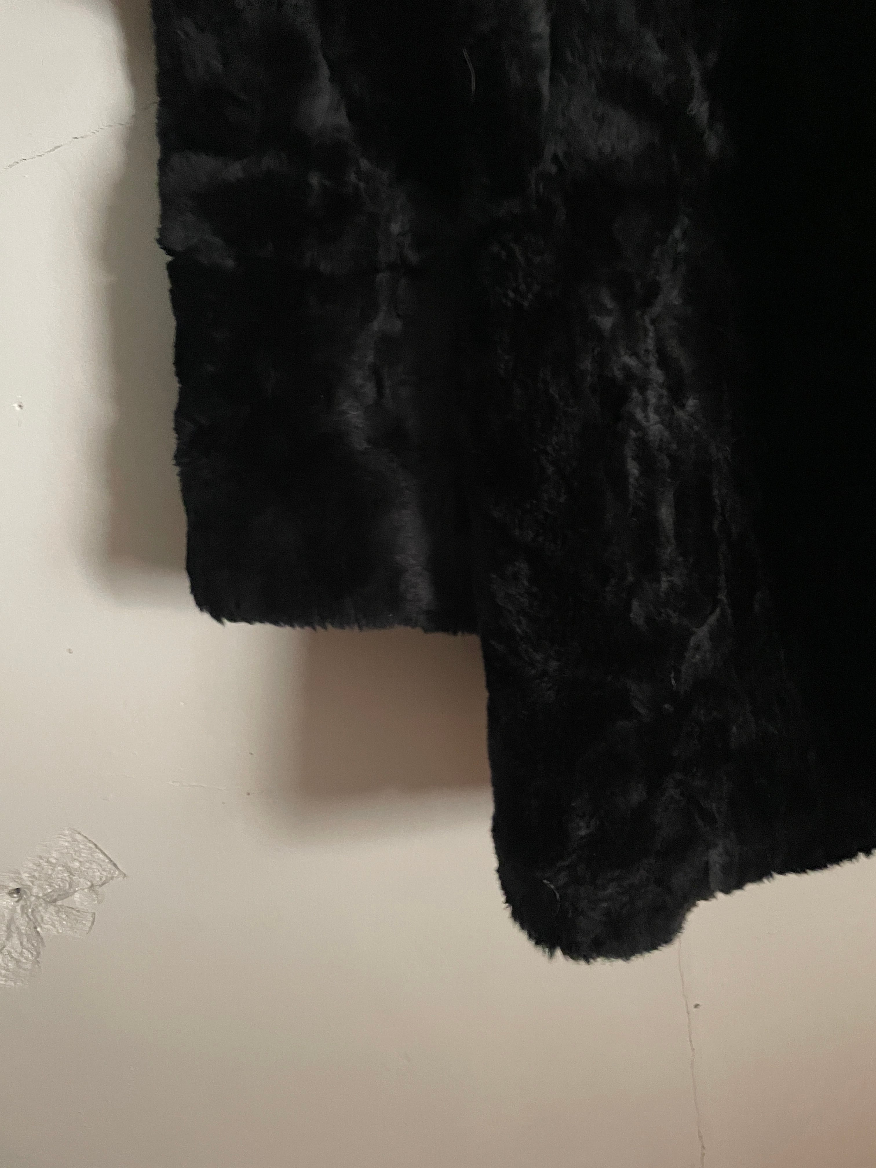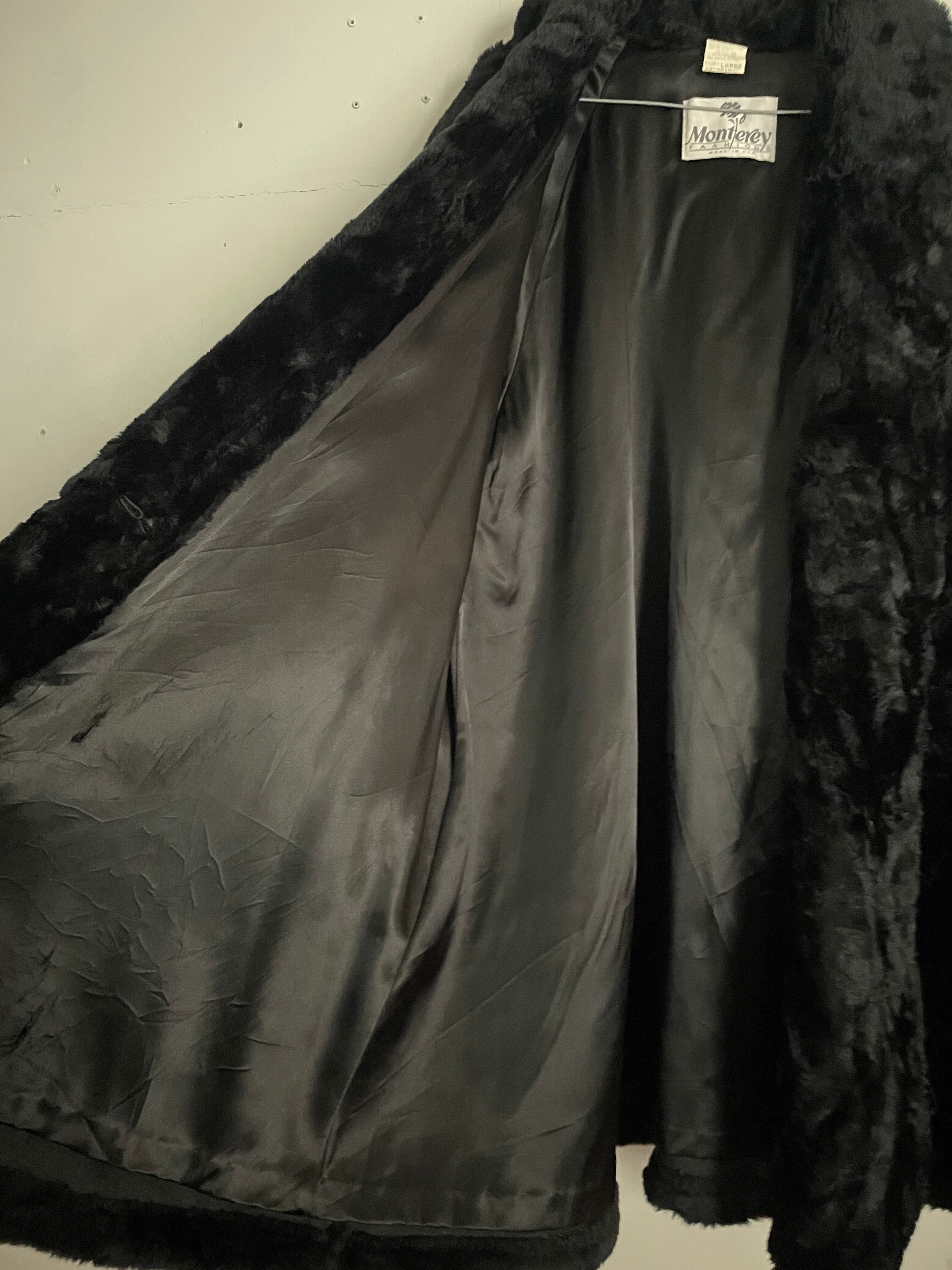 光沢のあるブラックボディで、高級感が感じられる、ファージャケット。触り心地抜群な毛足の長いファーとボリュームのある襟が特徴的です。羽織るだけでオーラの出るジャケットかと思います。丈感も丁度良く、身幅もたっぷりとあるので、インナーにもしっかり着込めて、男女共におすすめしたいアウターです。このディテールで、USA製なのもポイントが高いです。