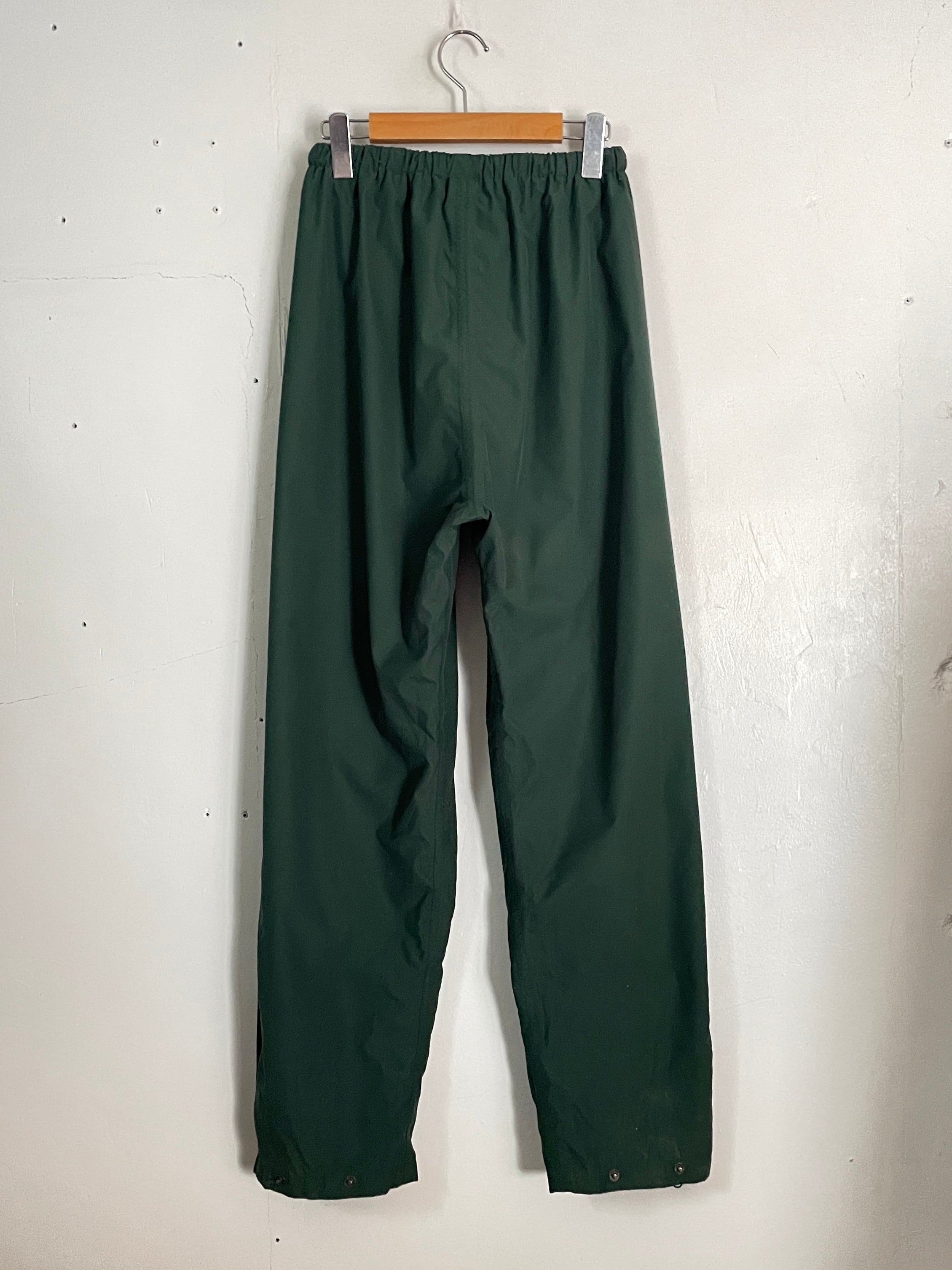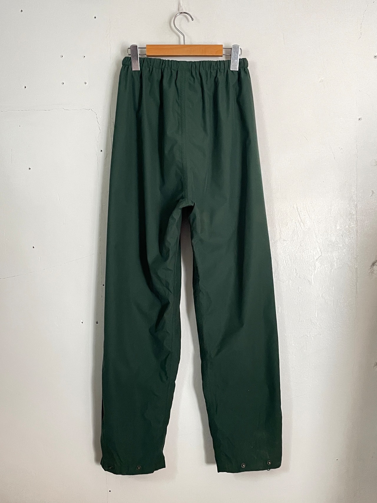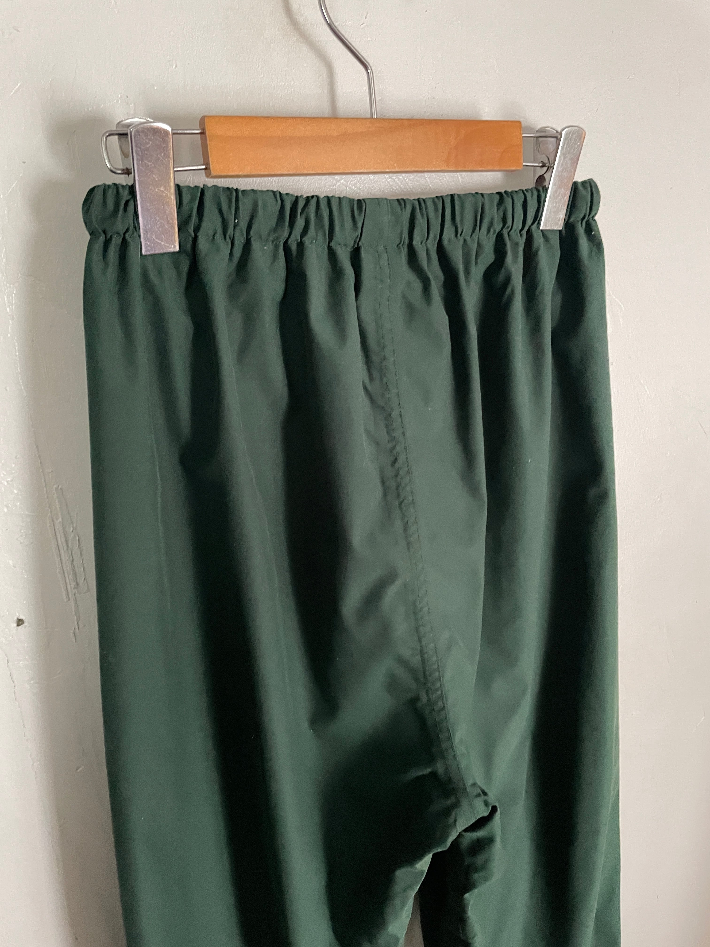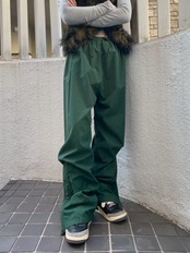 グリーンカラーで、裾部分に深めなスナップボタンの付いた、ポリエステルパンツ。ウエストにはドローコード付き。スナップボタンでシルエットを変えて履くことも可能です。裏地はサラッとしたナイロン素材。楽に履けて、機能性に優れた一本です。男女共におすすめしたい一本です。