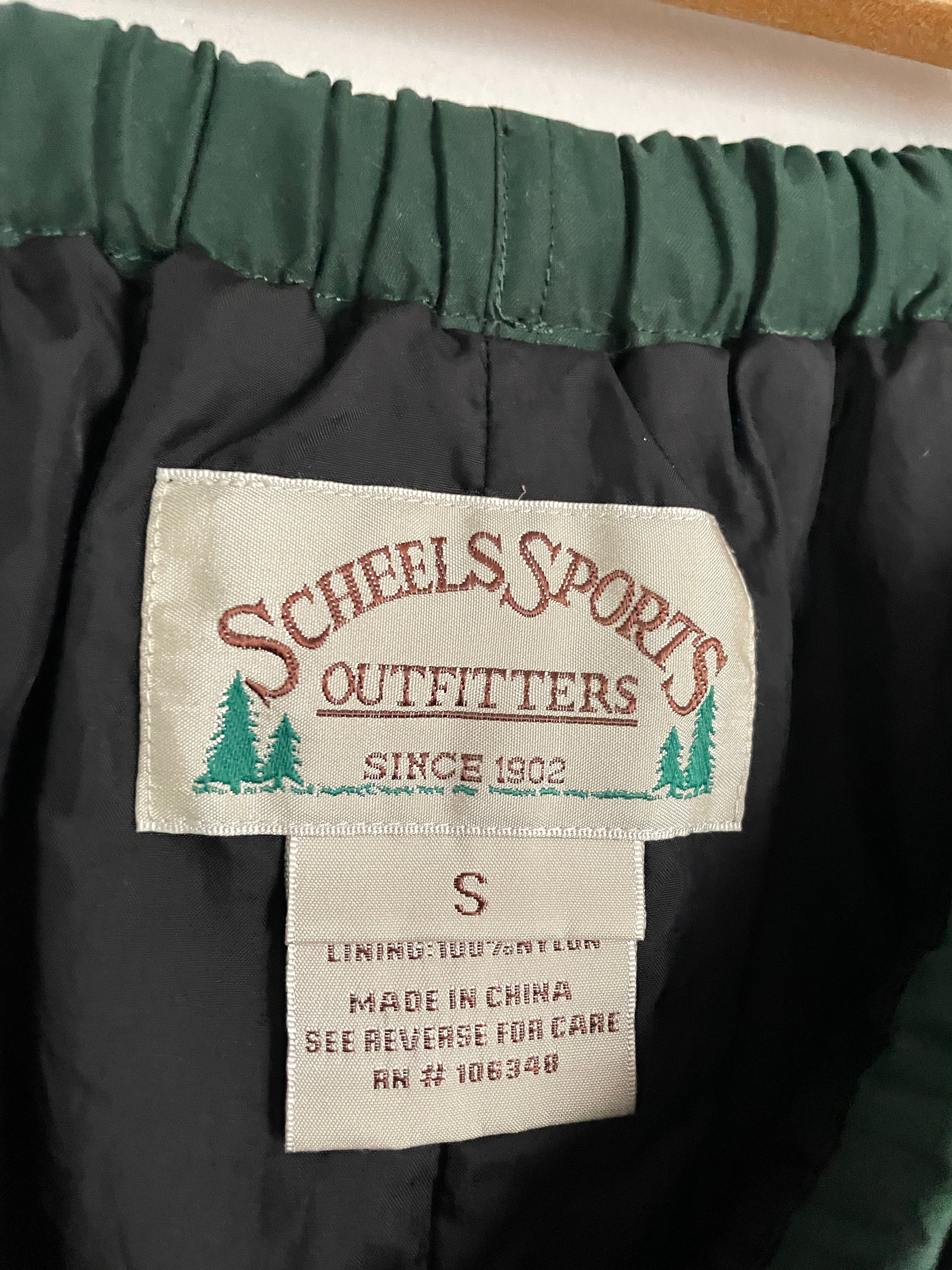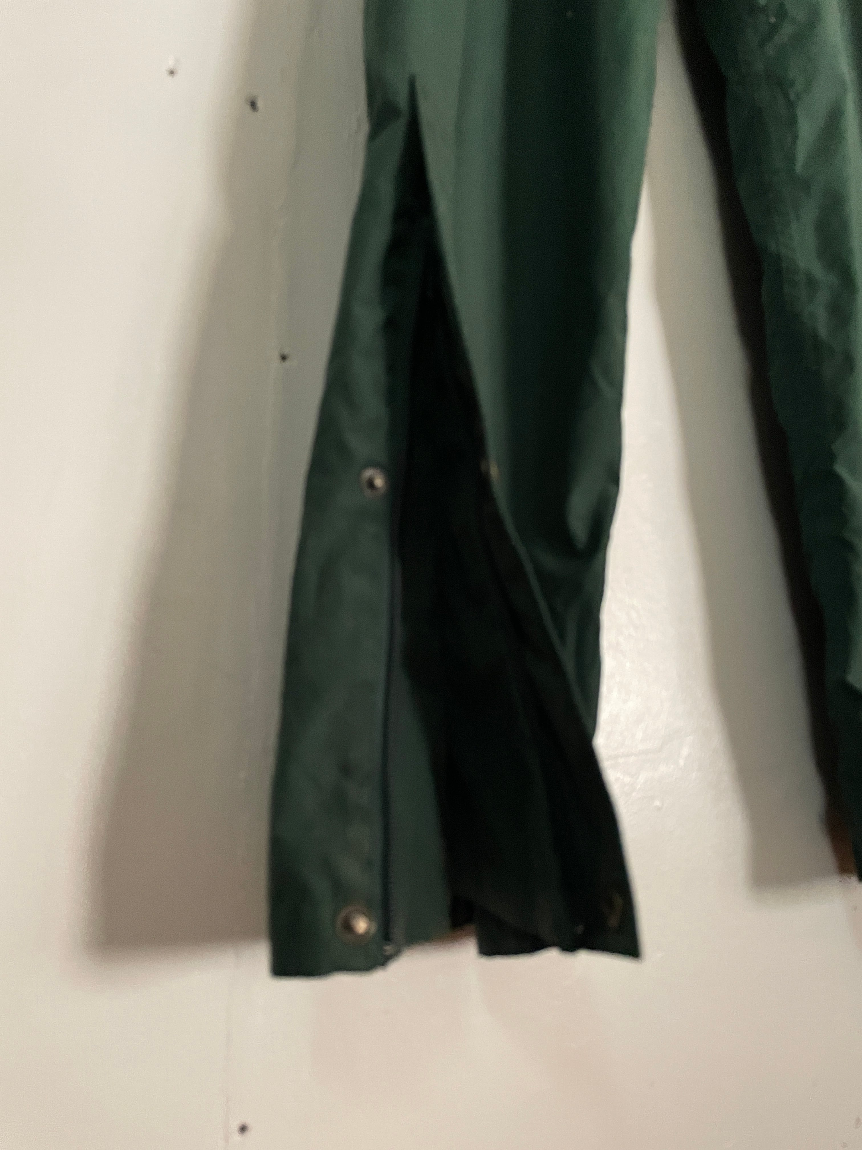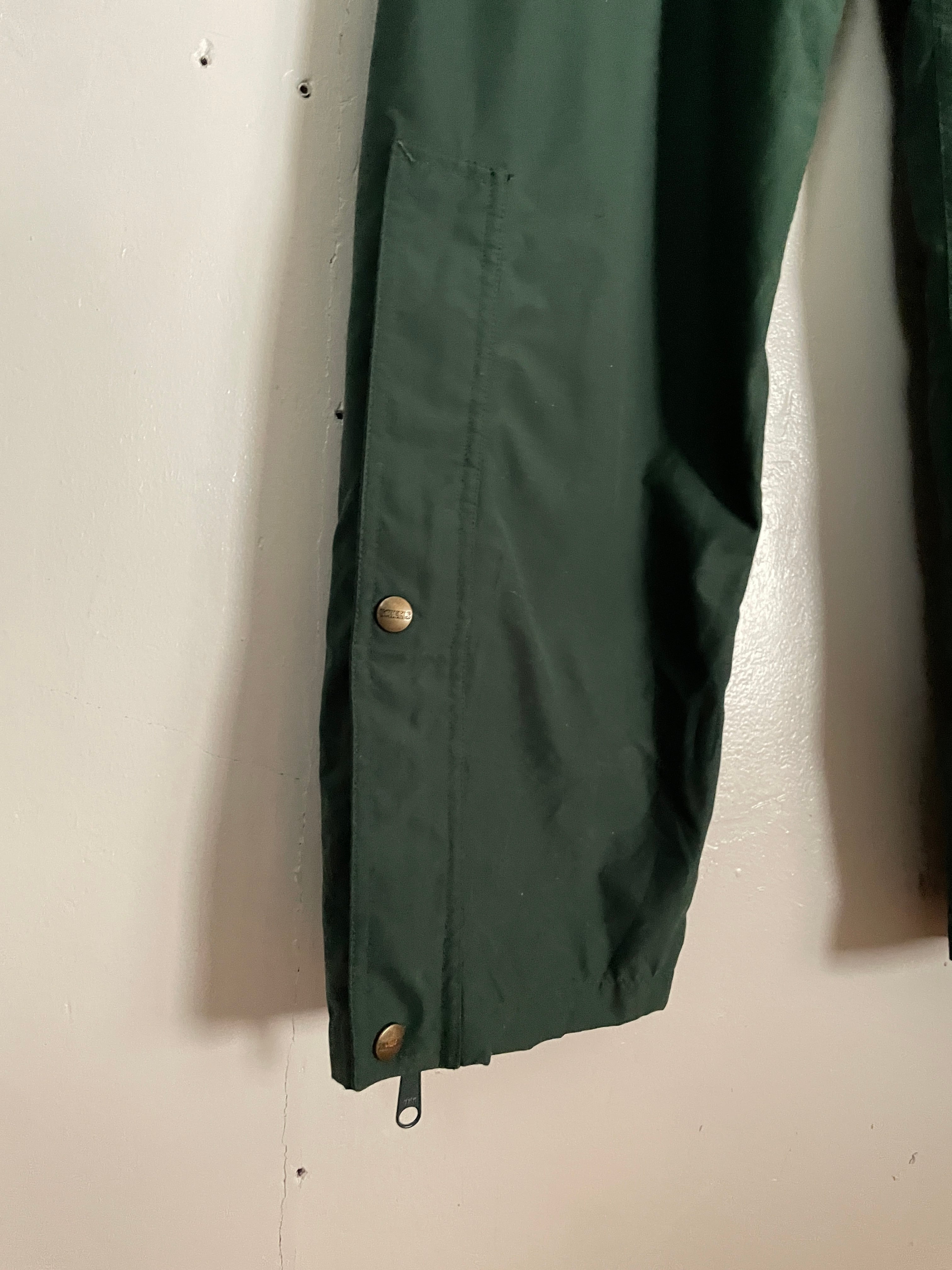 グリーンカラーで、裾部分に深めなスナップボタンの付いた、ポリエステルパンツ。ウエストにはドローコード付き。スナップボタンでシルエットを変えて履くことも可能です。裏地はサラッとしたナイロン素材。楽に履けて、機能性に優れた一本です。男女共におすすめしたい一本です。