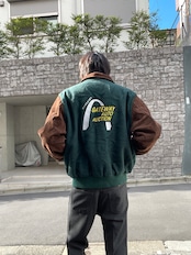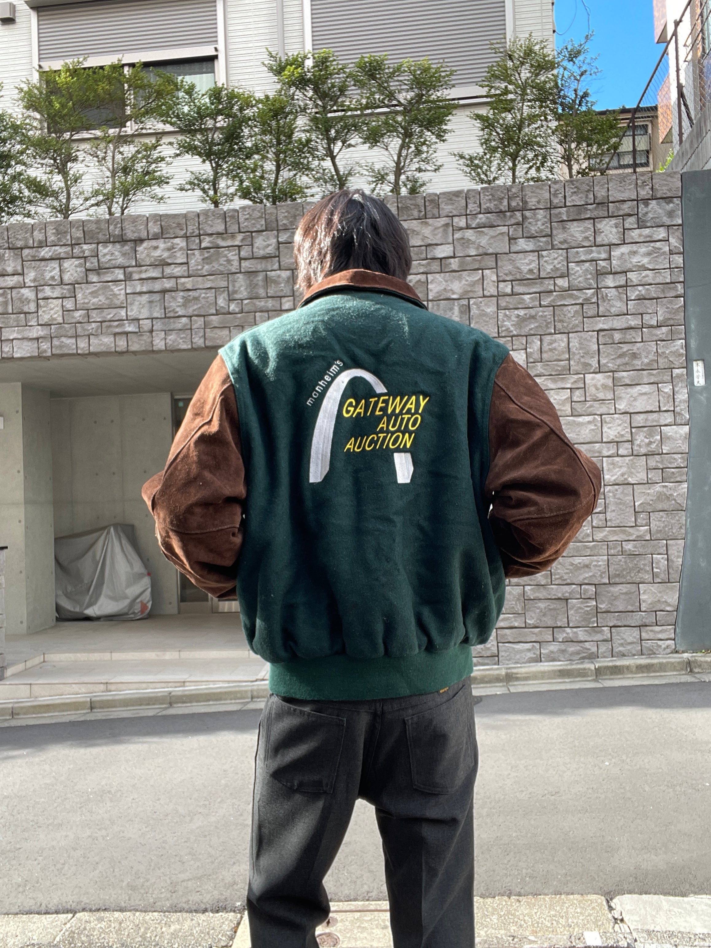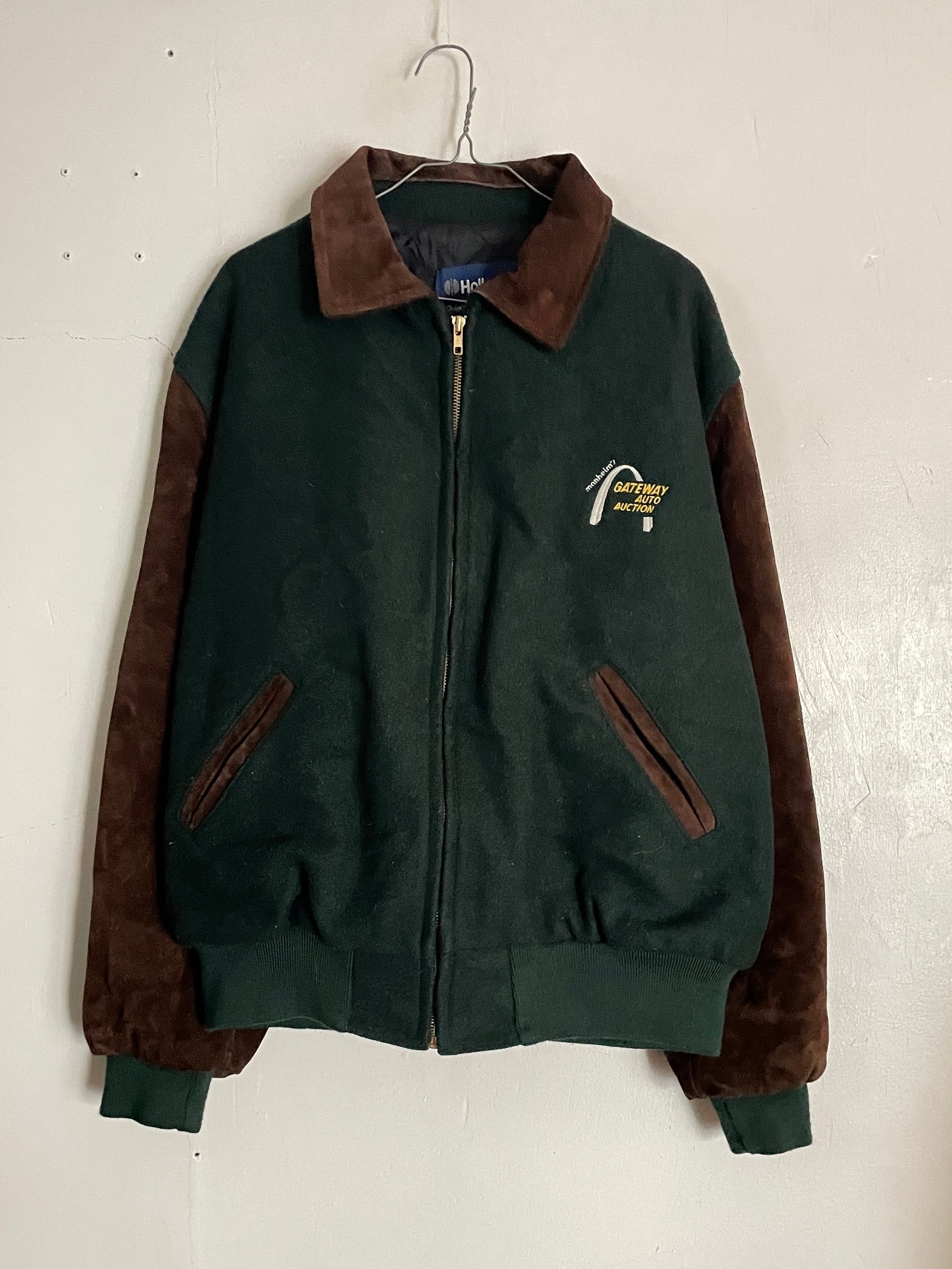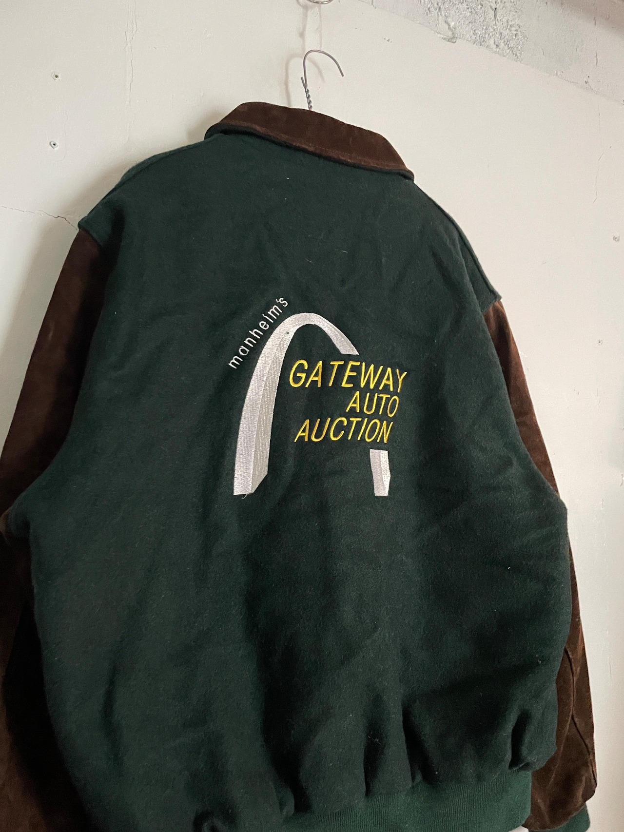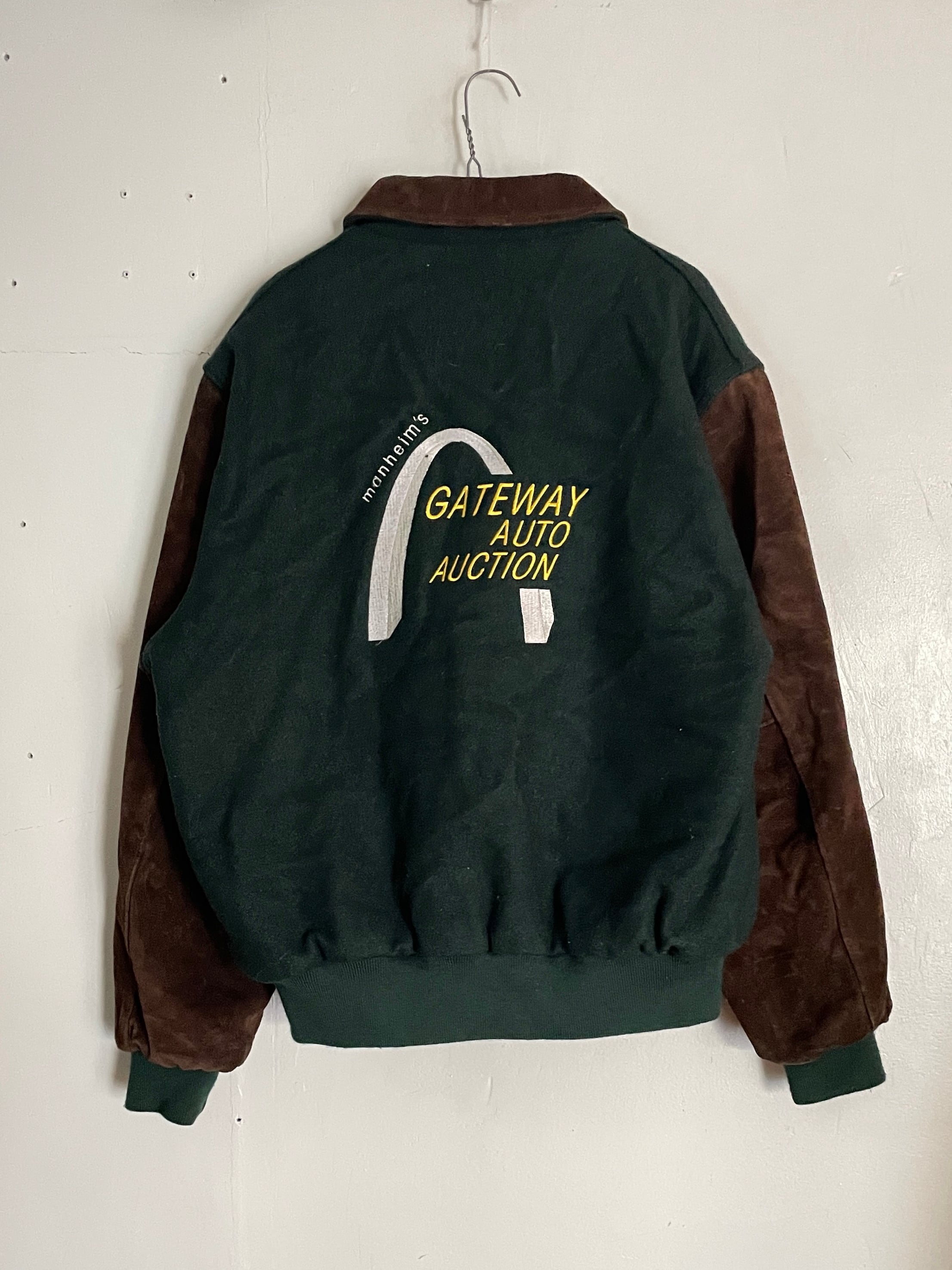 淡いグリーンとブラウンカラーで、襟、袖部分がスエードレザーで切り替えられた、スタジアムジャケット。フロントにはワンポイント、バックにはデカ刺繍が施されています。マンハイム社の”ゲートウェイ・オート・オークション”の企業刺繍になります。レザー特有の上品さもありつつ、全体からは渋さも感じられる一着です。このディテールでUSA製なのもポイントが高いです。ゆったりと着られるサイズ感で、今の時期には間違いなく主役になってくれるアイテムです。