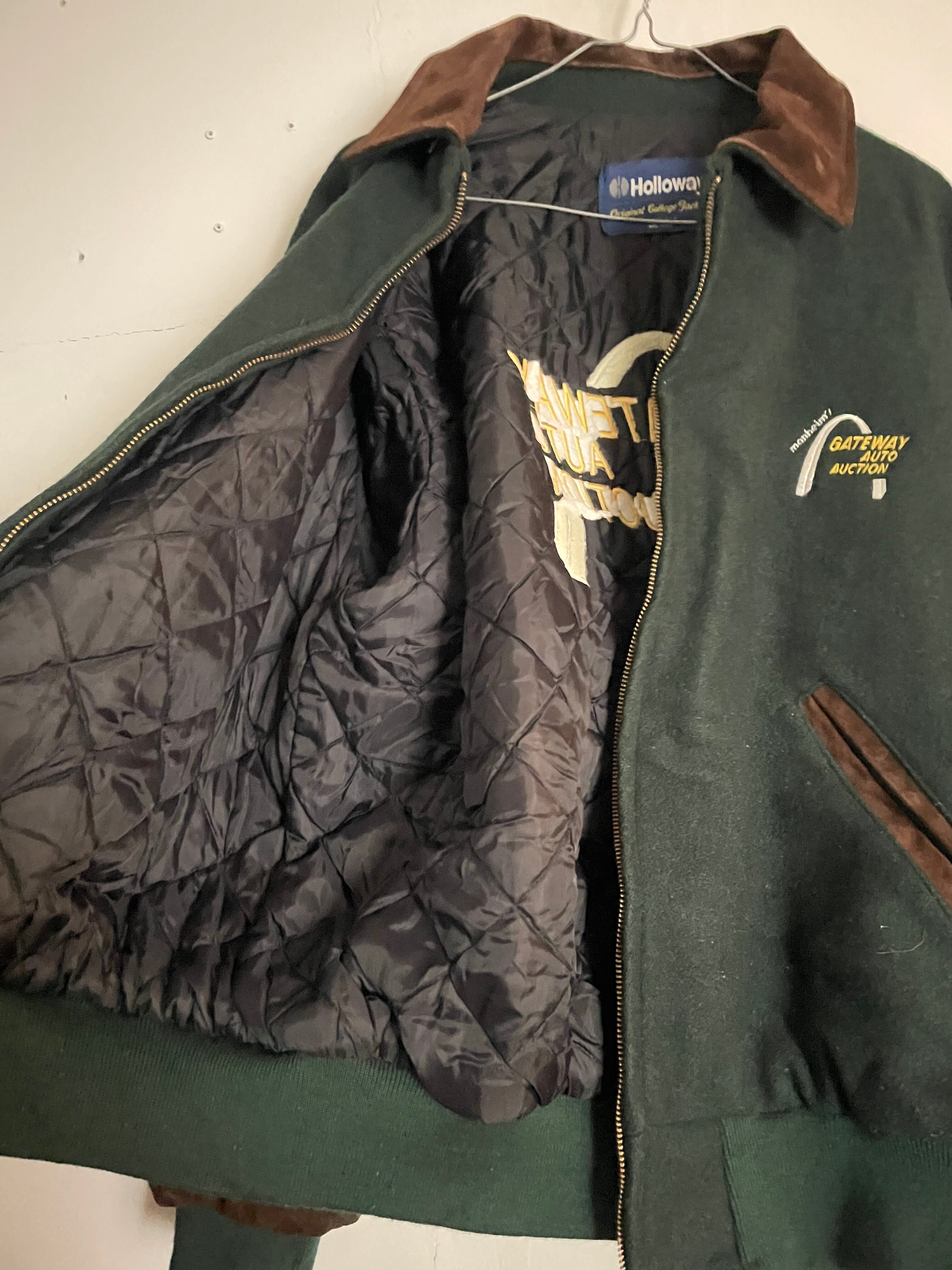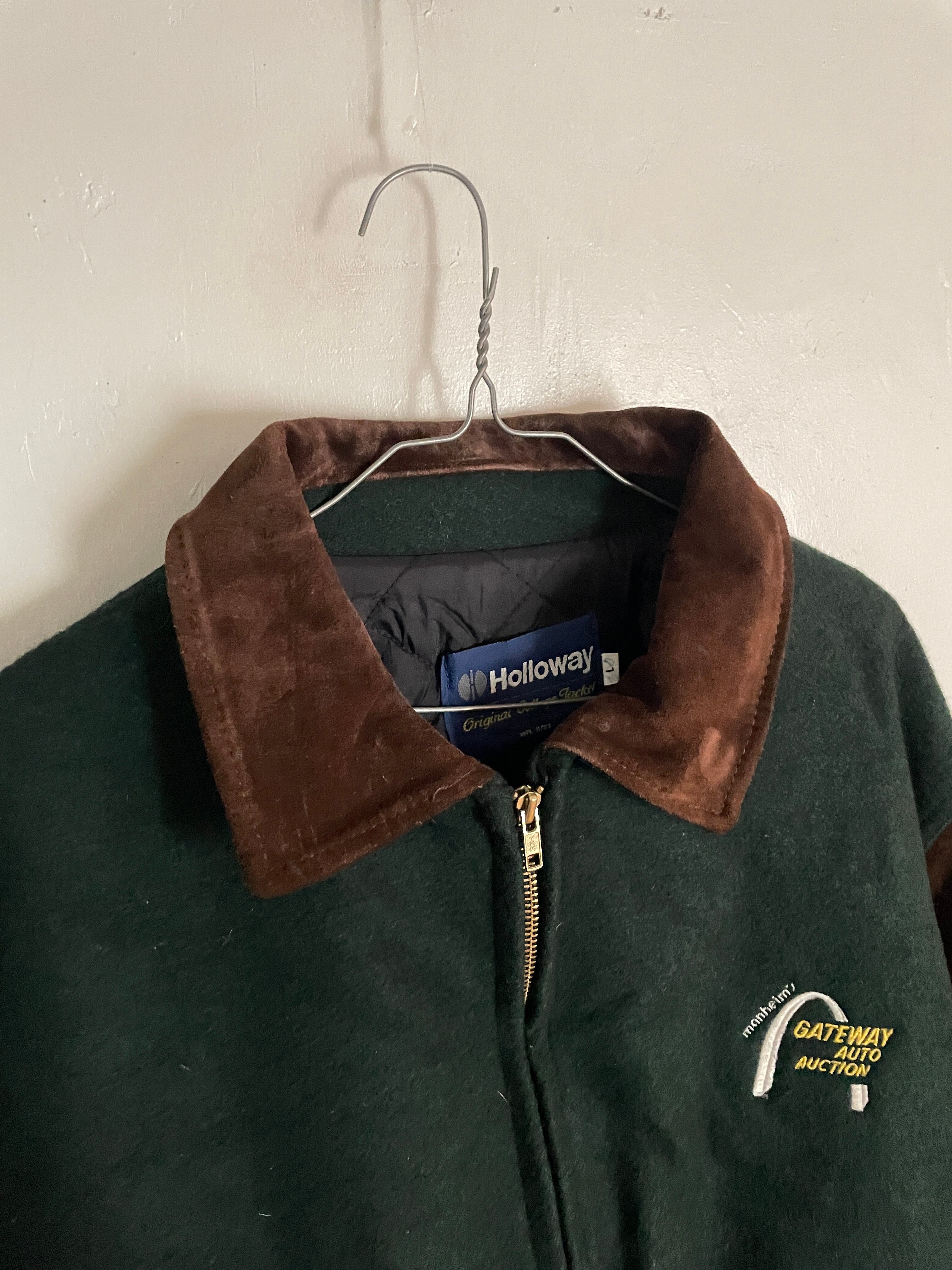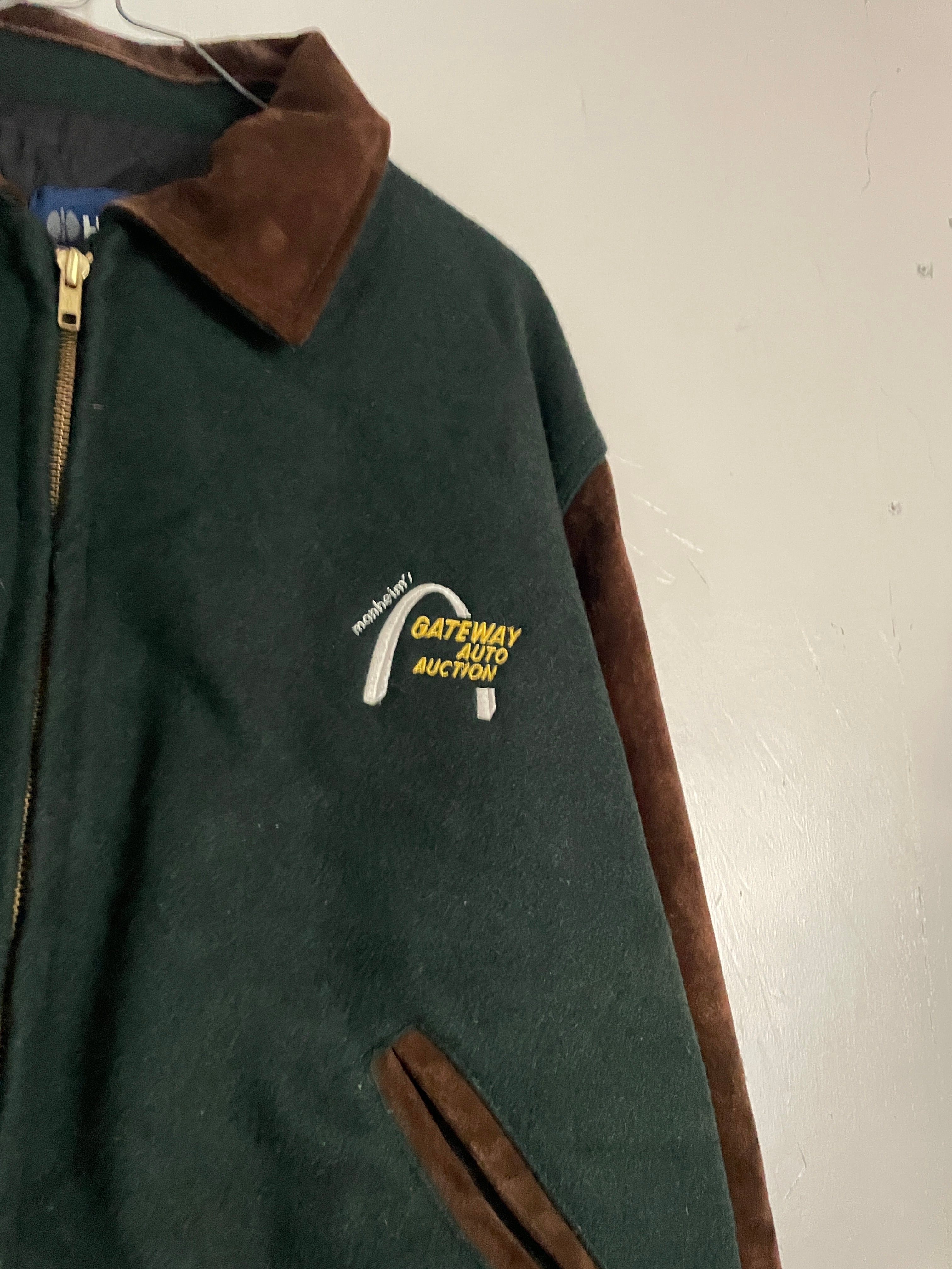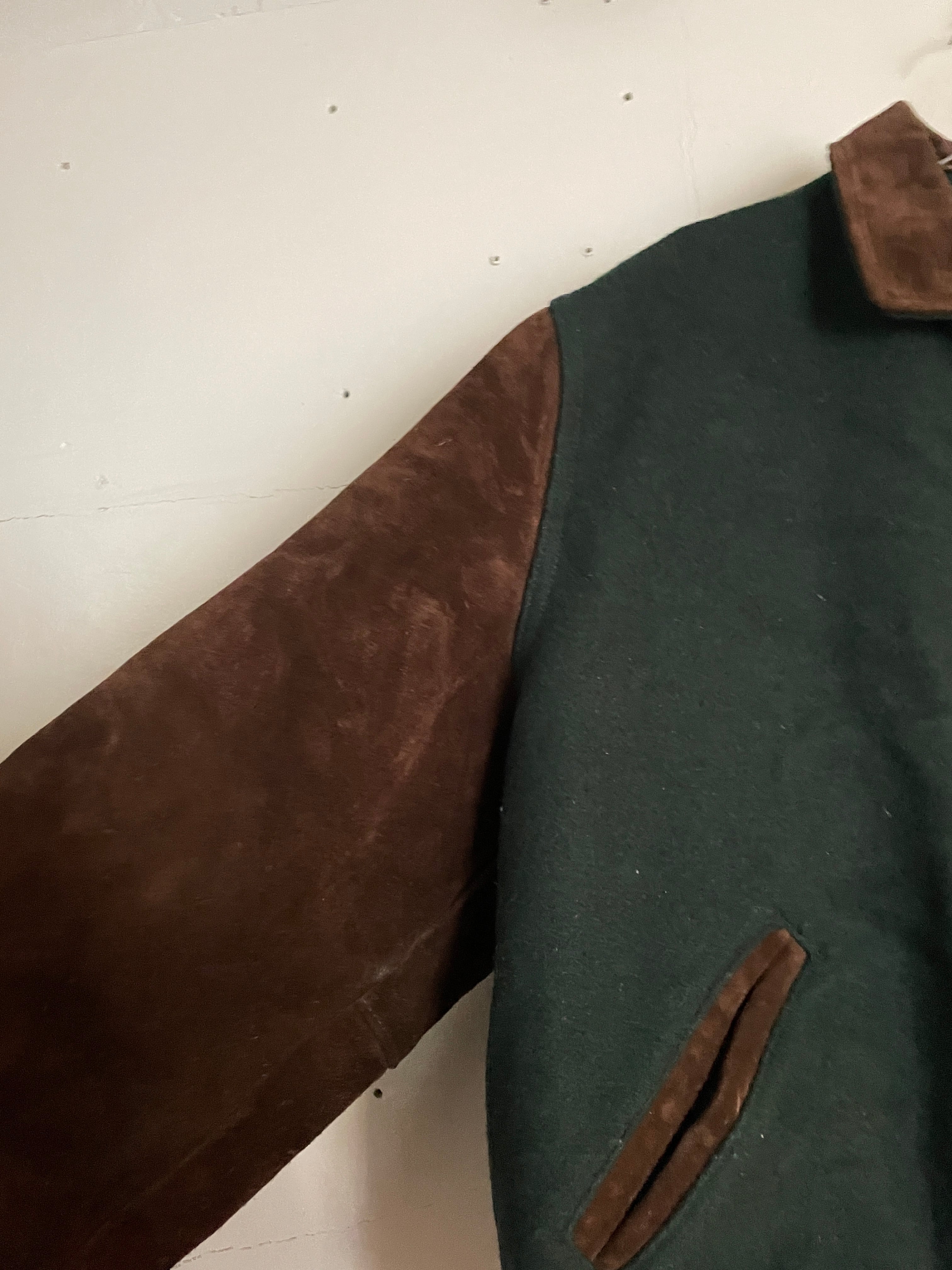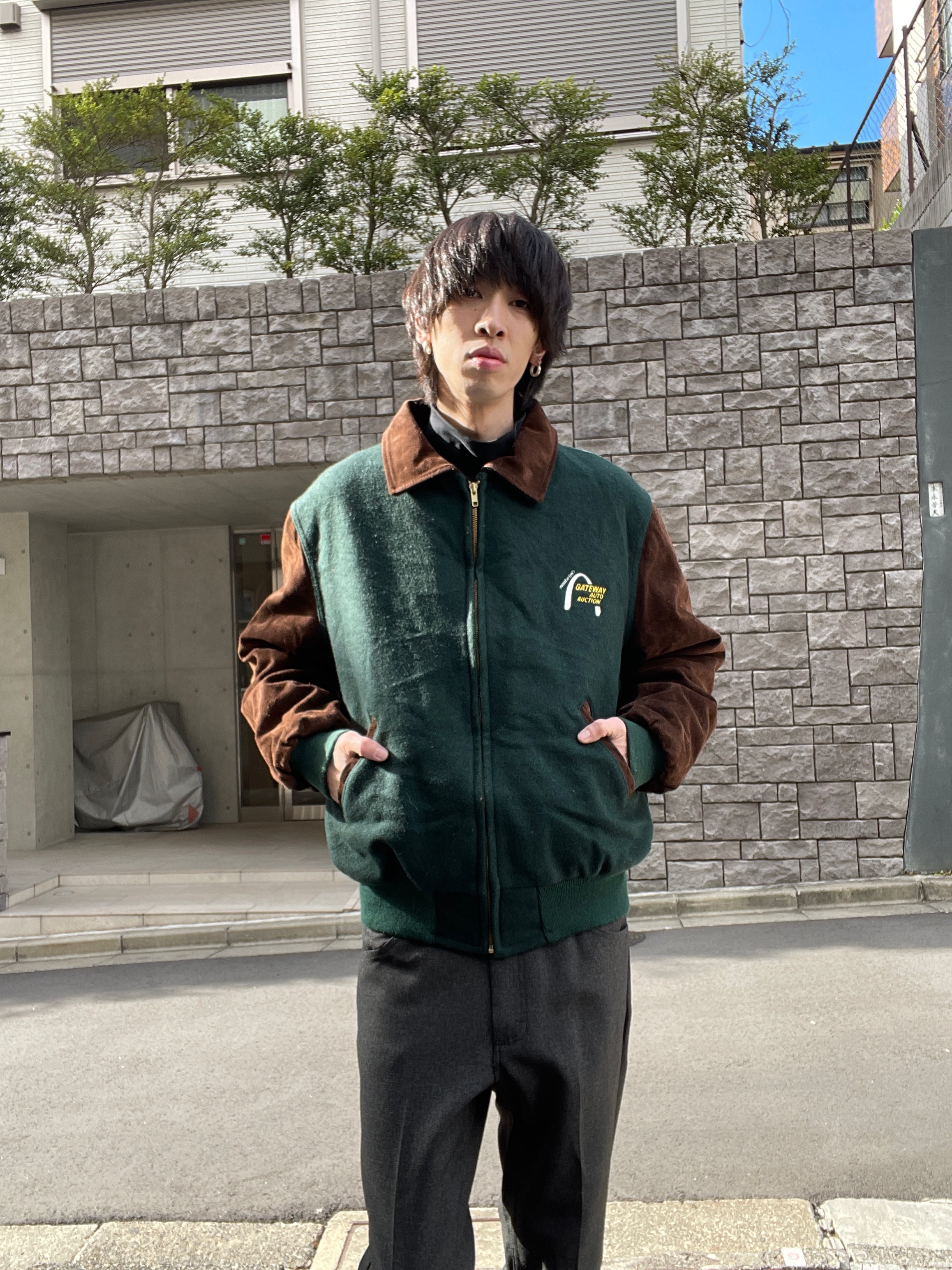 淡いグリーンとブラウンカラーで、襟、袖部分がスエードレザーで切り替えられた、スタジアムジャケット。フロントにはワンポイント、バックにはデカ刺繍が施されています。マンハイム社の”ゲートウェイ・オート・オークション”の企業刺繍になります。レザー特有の上品さもありつつ、全体からは渋さも感じられる一着です。このディテールでUSA製なのもポイントが高いです。ゆったりと着られるサイズ感で、今の時期には間違いなく主役になってくれるアイテムです。