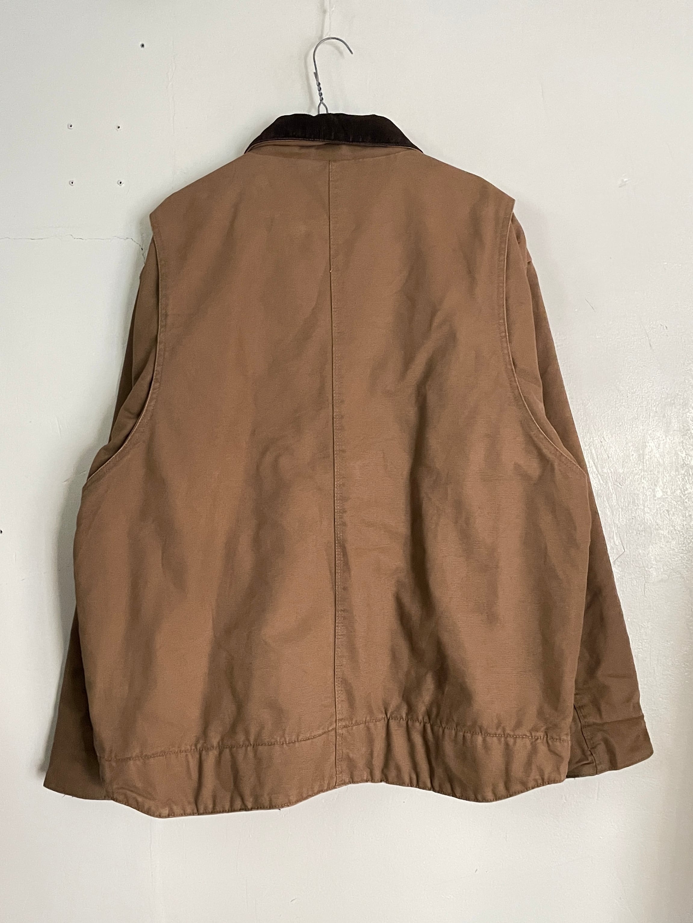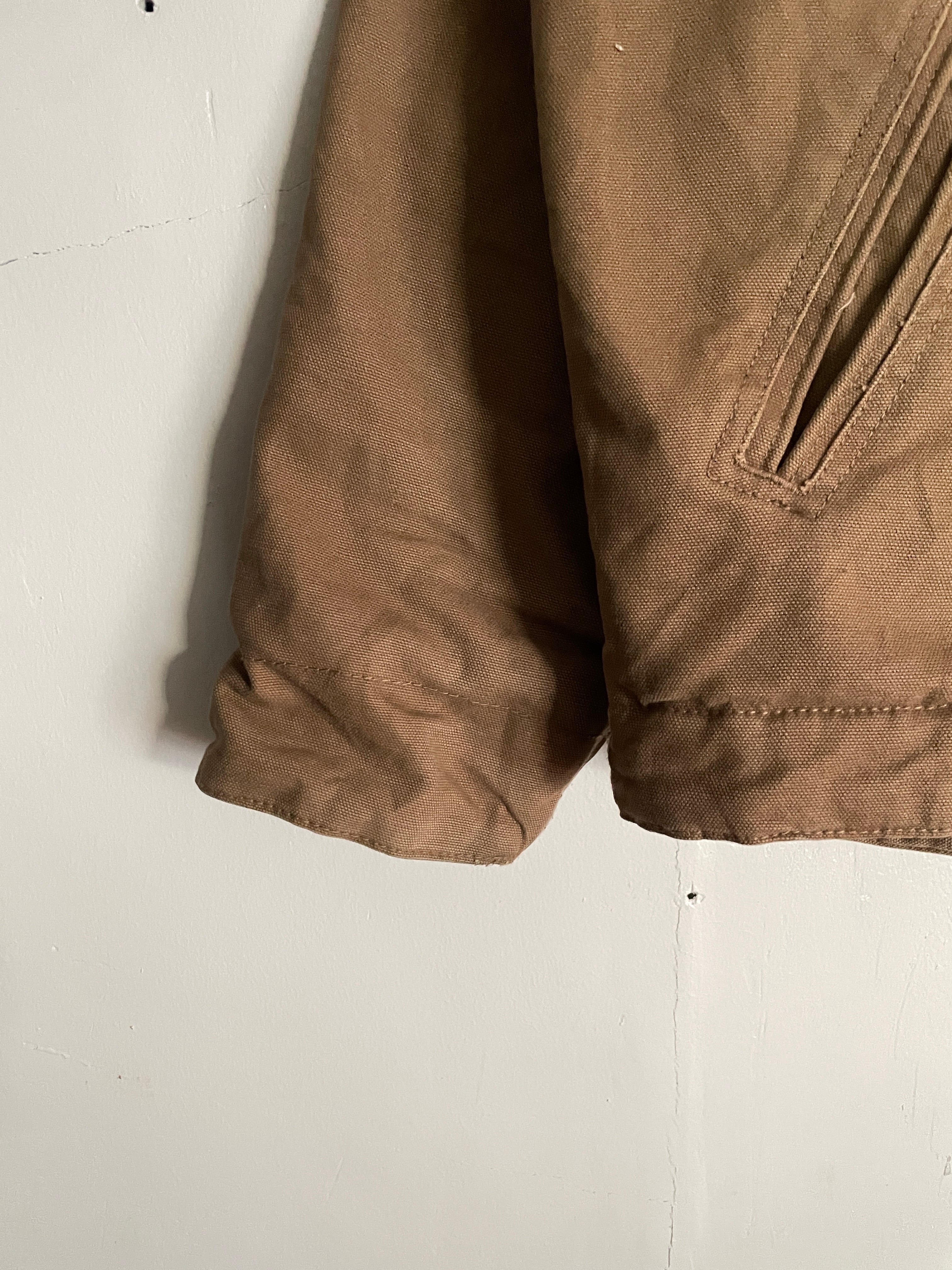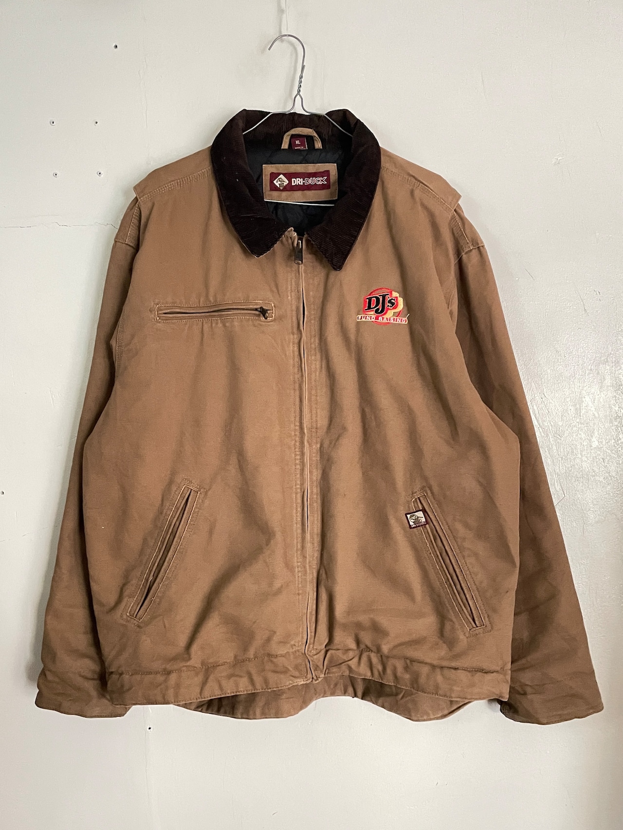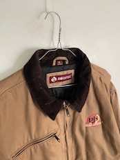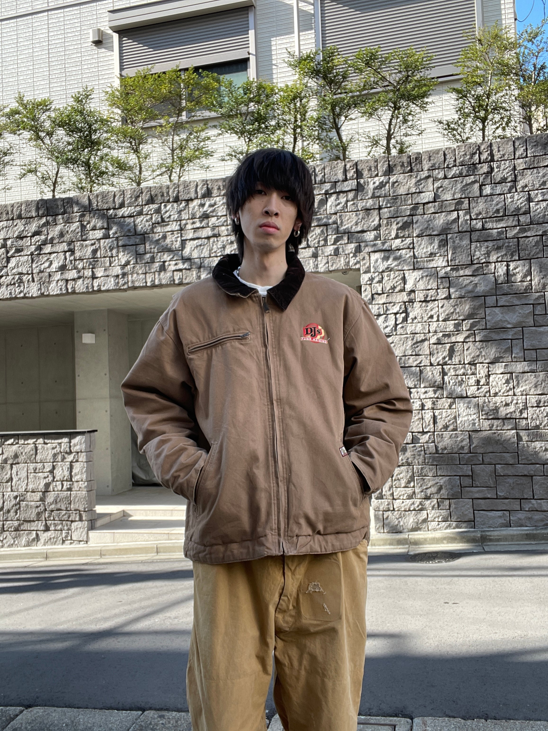ブラウンボディに、ワンポイントで企業刺繍が施された、ダックジャケット。タフで丈夫なコットン素材。風を通しにくく、今の時期にはもってこいのアウターかと思います。ポケットも豊富で機能性も抜群。裏地はサラッとしたキルティング素材。ゆったりとしたサイズ感なので、インナーにもしっかりと着込めます。