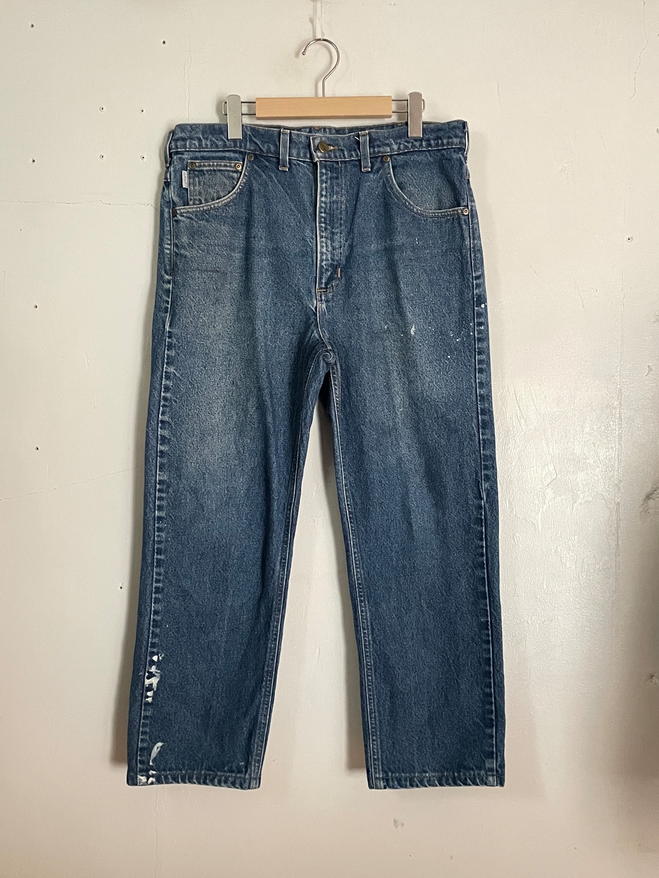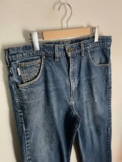 やや褪せた色味で、程良くペイントが施された、カーハートのデニムパンツ。太過ぎず、細過ぎないシルエット。まさにクラシックなデニムパンツです。やり過ぎていないペイントがさりげなくてグッドです。様々なファッションに取り入れやすいデニムかと思います。