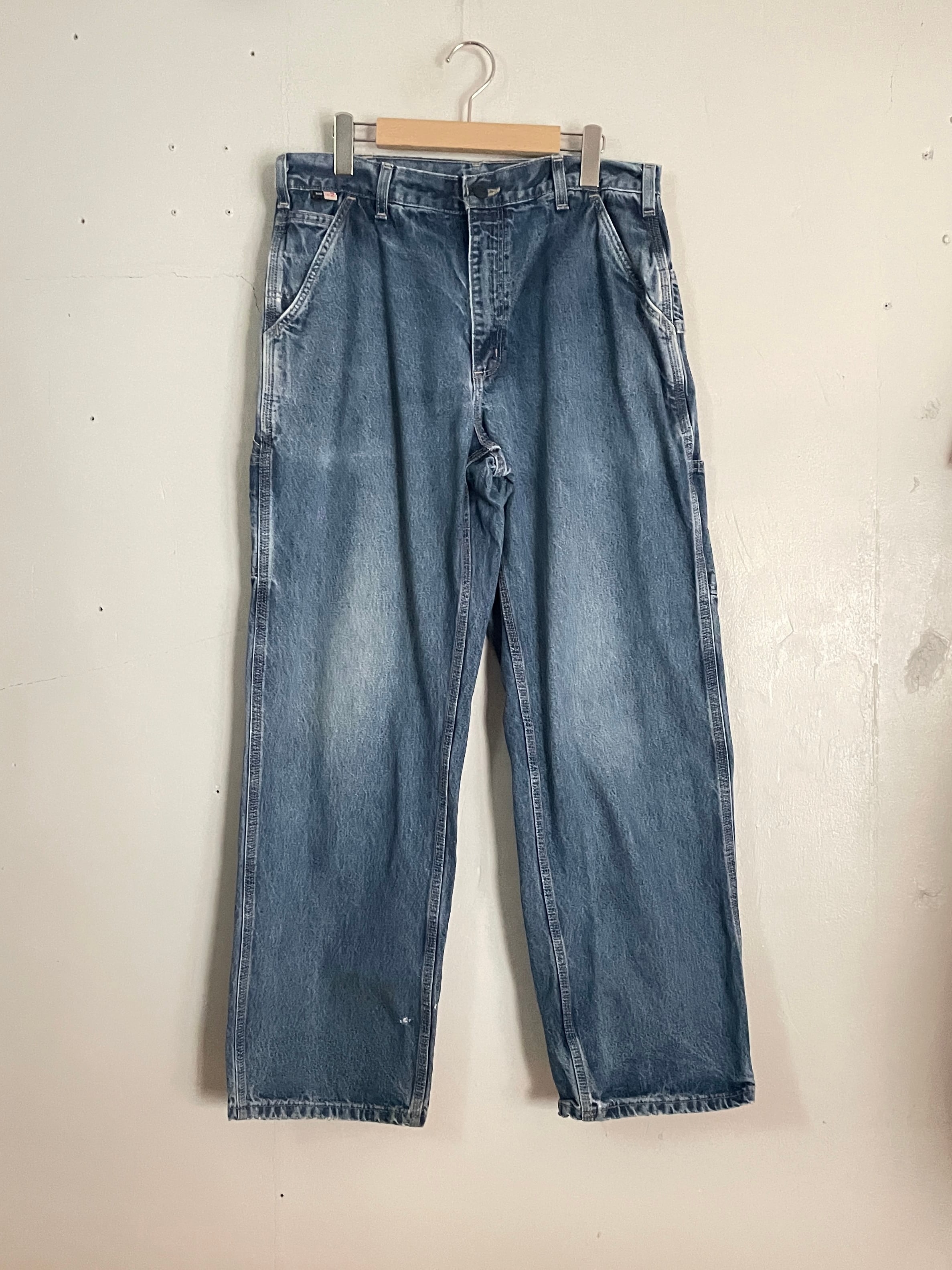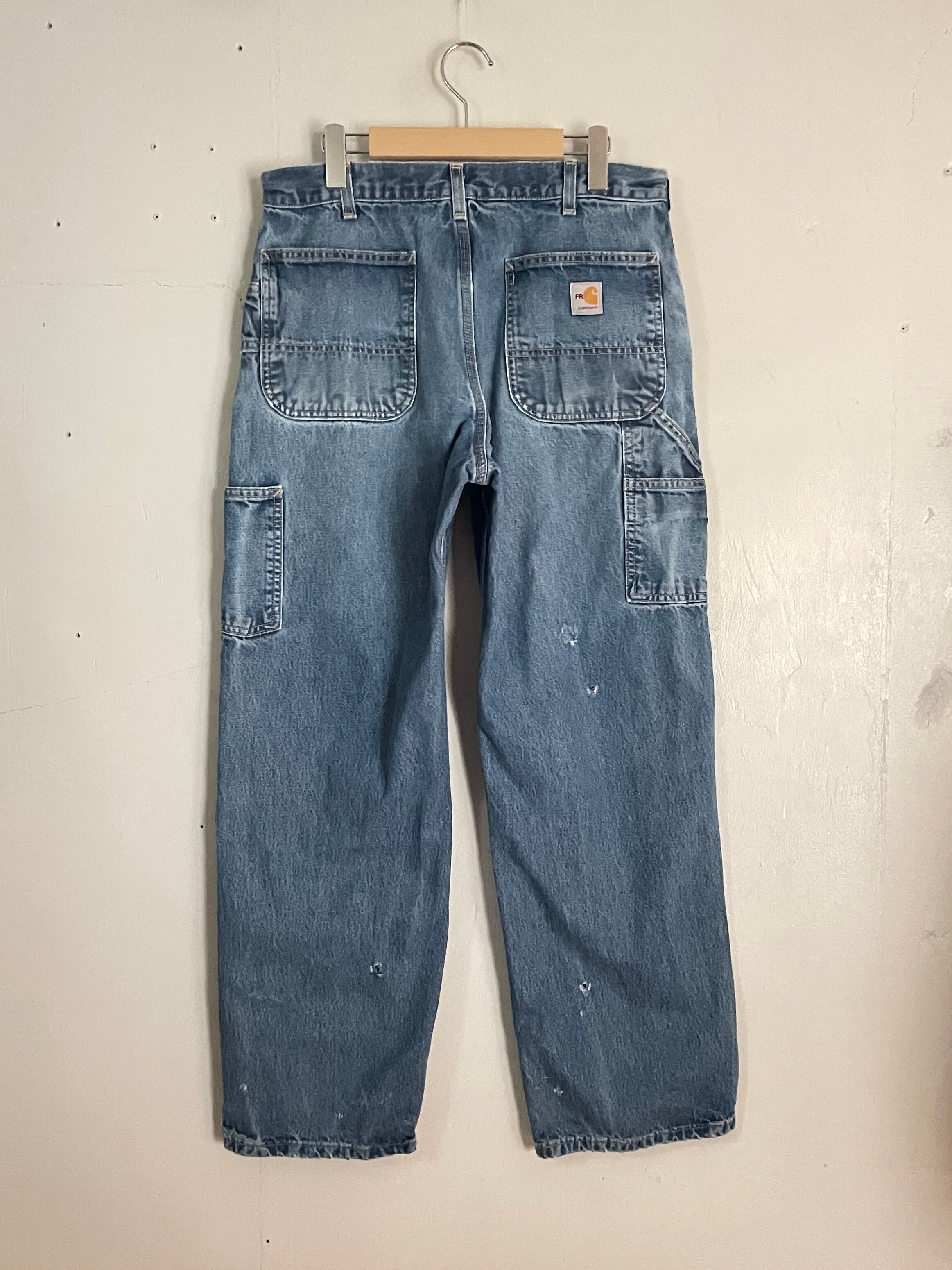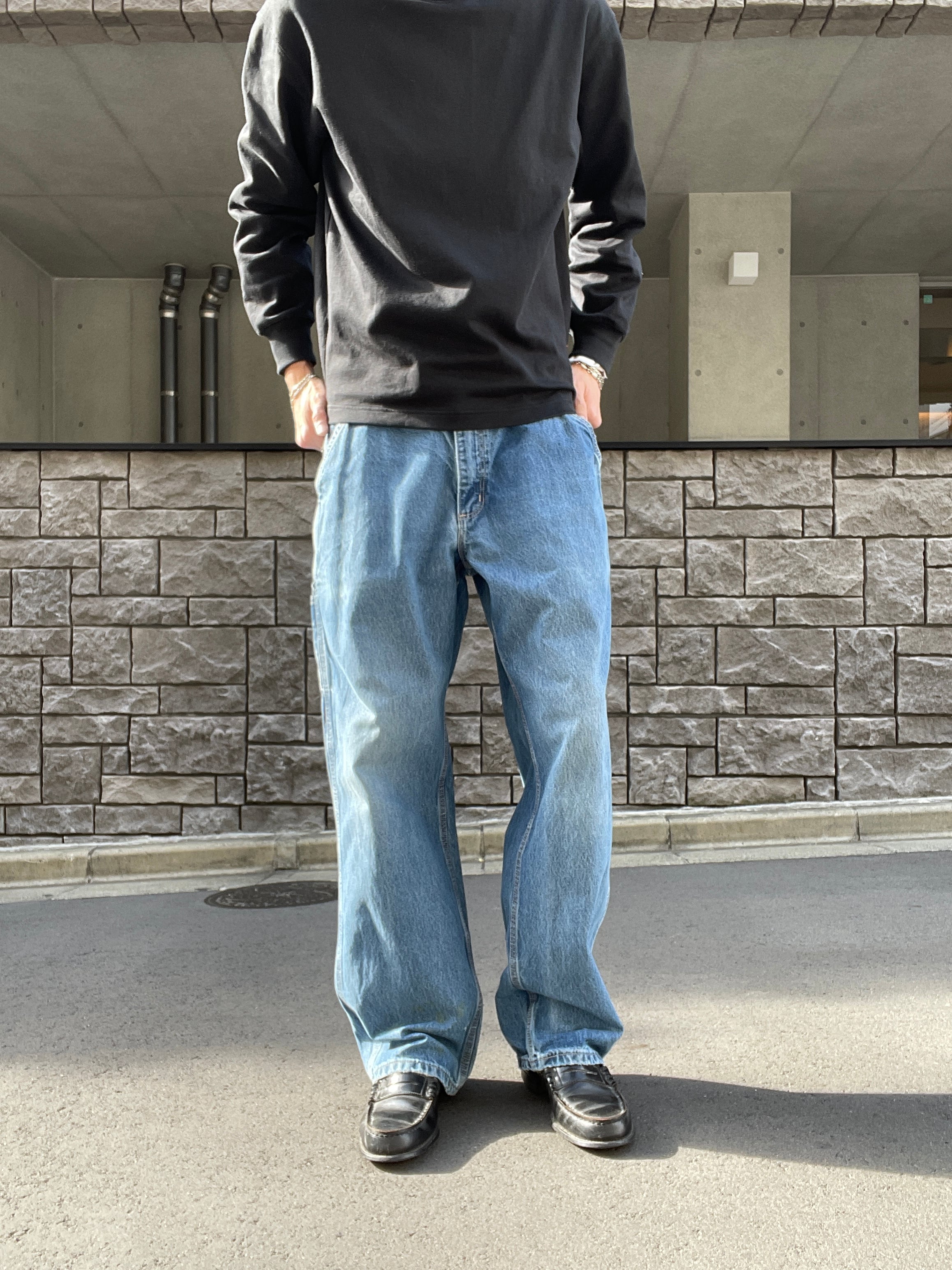 やや褪せた良い色味で、やり過ぎていないダメージがグッドなカーハートペインターデニムパンツ。ガツンとした太さのあるワイドシルエット。丈も長めでルーズめに履けそうです。ポケットも豊富で機能性にも優れています。様々なアイテムとの相性が良く、季節問わずガシガシ履けるボトムスです。