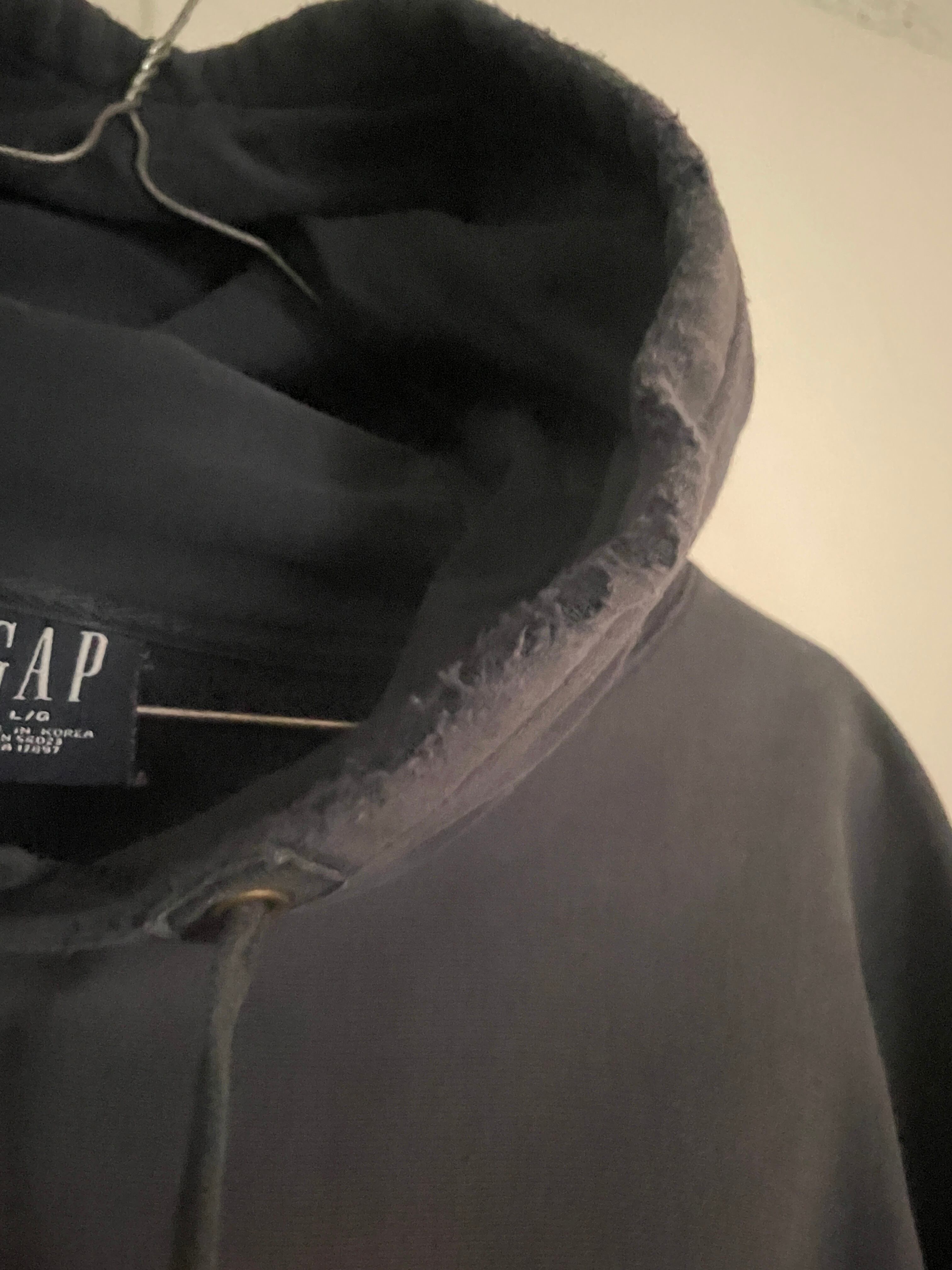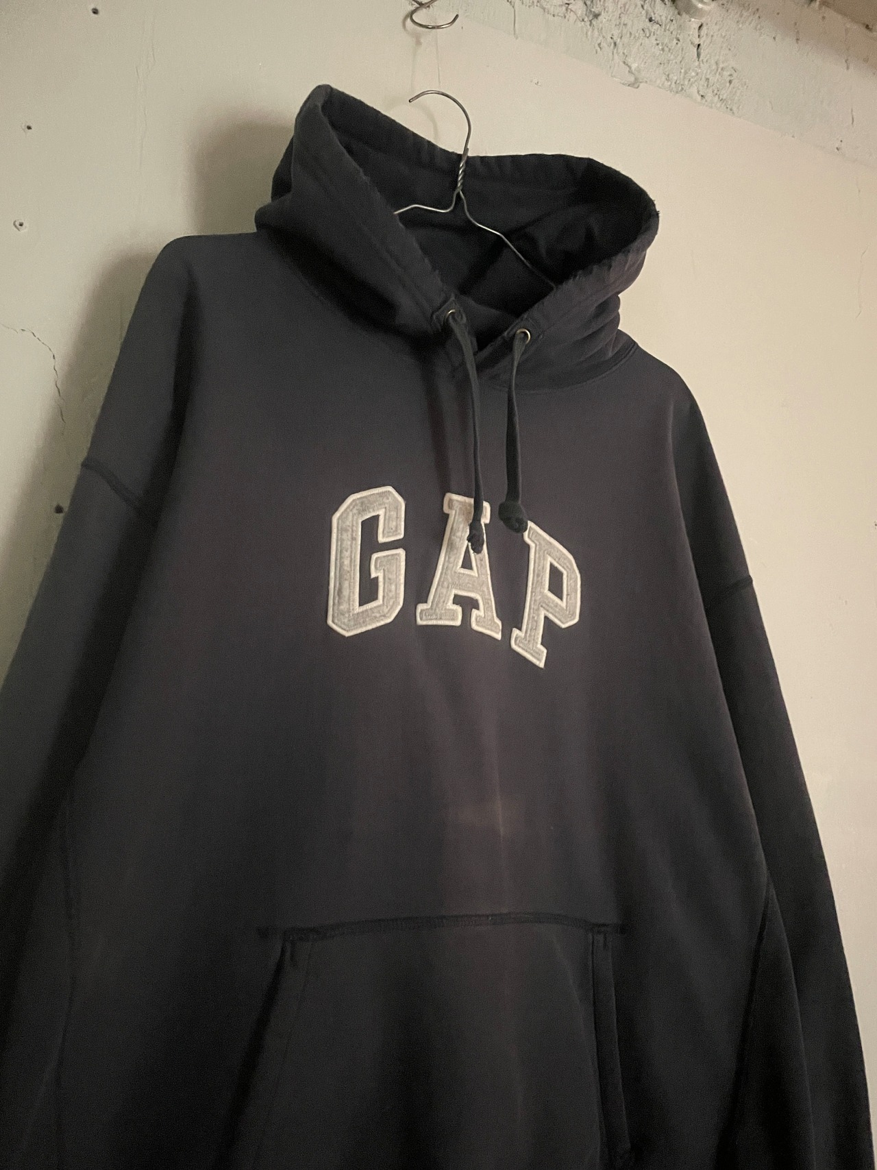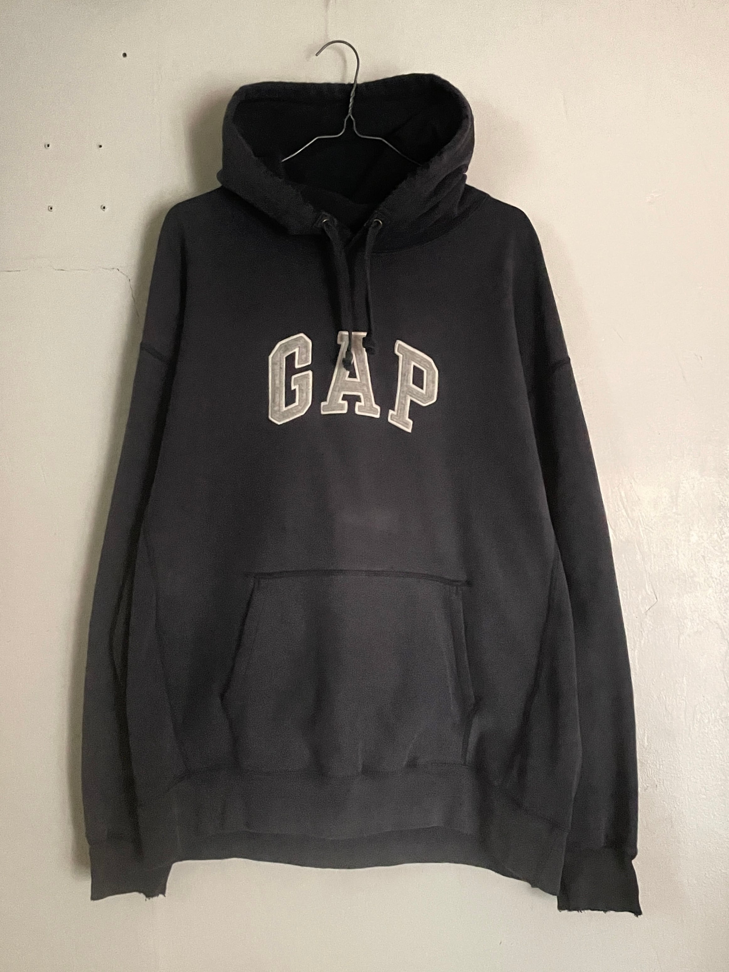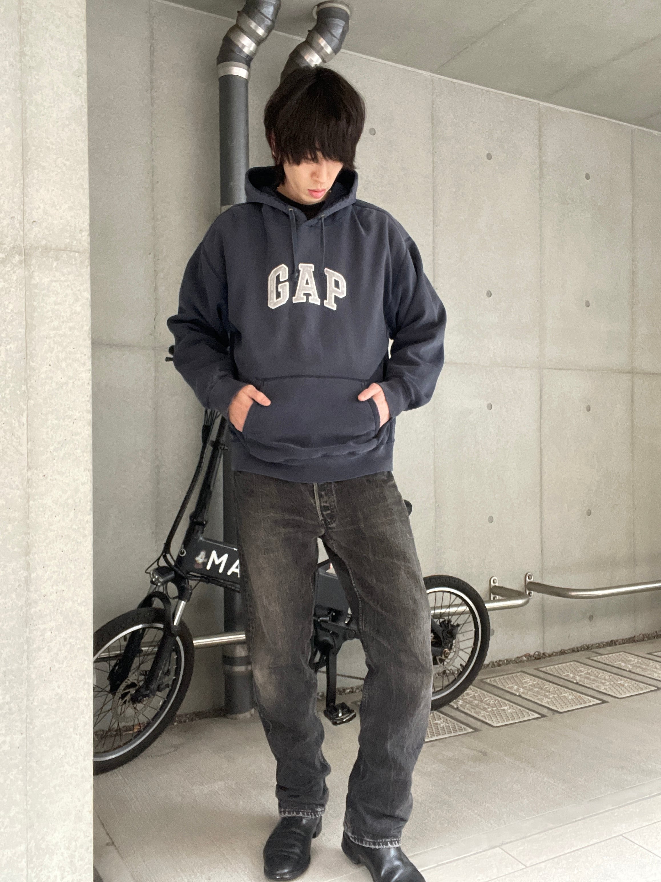 フェードしたネイビーボディで、程良くダメージが加えられた、ギャップのパーカー。真ん中にはギャップのロゴ刺繍。脇下はリバース仕様になっていて、肉厚なコットンポリ素材。今の時期にはぴったりなパーカーです。ゆったりとしたサイズ感なので、緩くラフに着られそうです。冬のインナーにもおすすめしたい1着です。