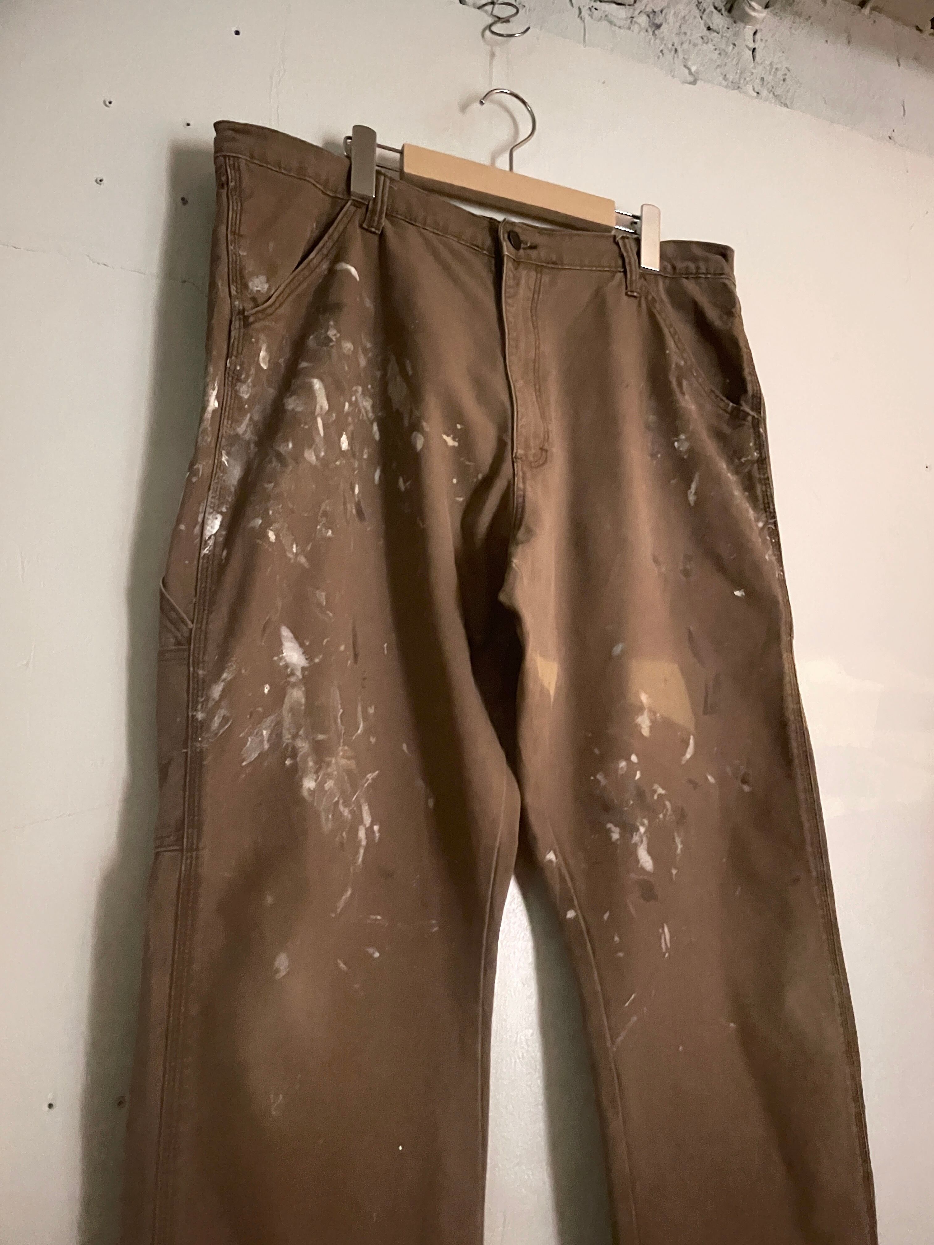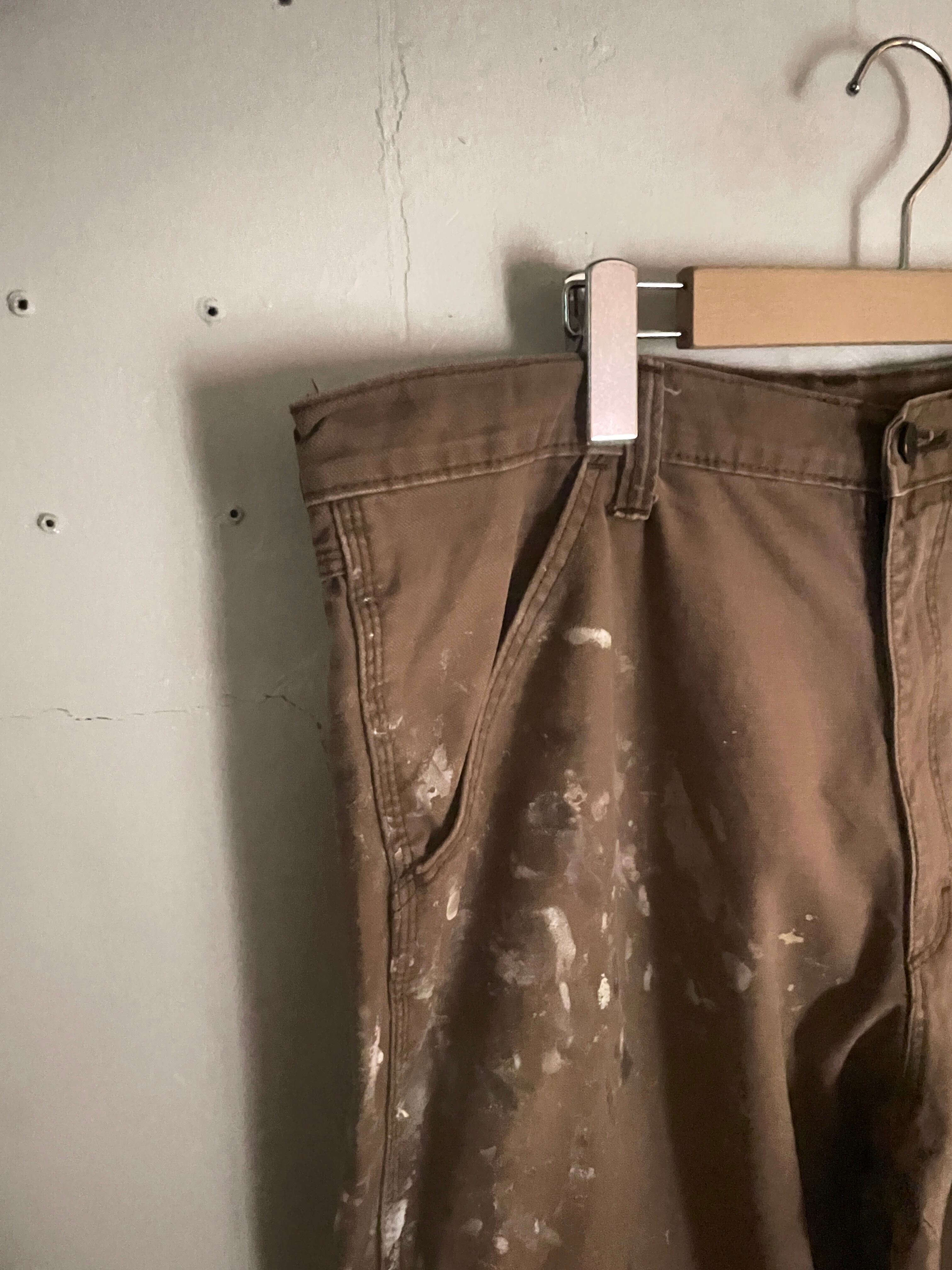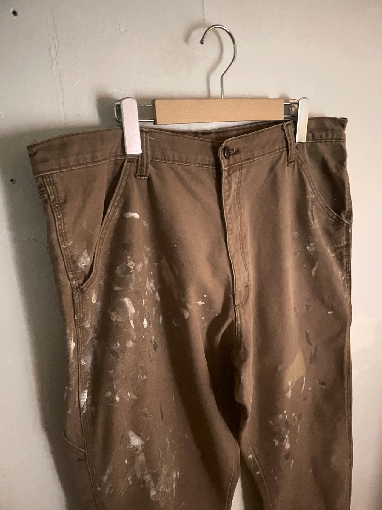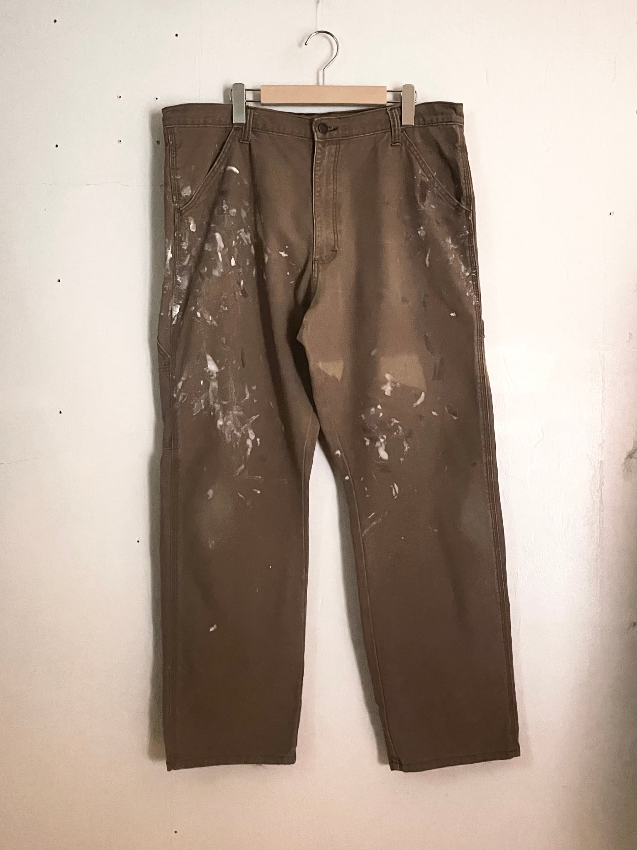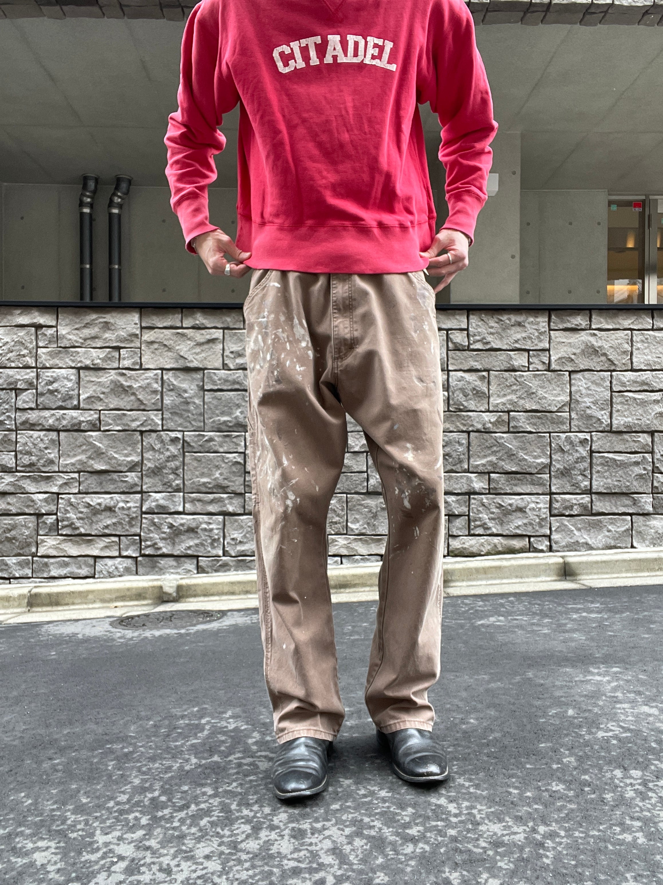ブラウンカラーにペイントが施された、ラスラーのペインターパンツ。ホワイト、ブラウン、グレーなどのペイントがあえて雑に散りばめられています。それが堪らなくかっこいいです。ペイントがある事によって、ガラッと雰囲気が変わりますよね。ガツンとした太さのあるワイドシルエット。季節問わずガシガシ履ける一本です。