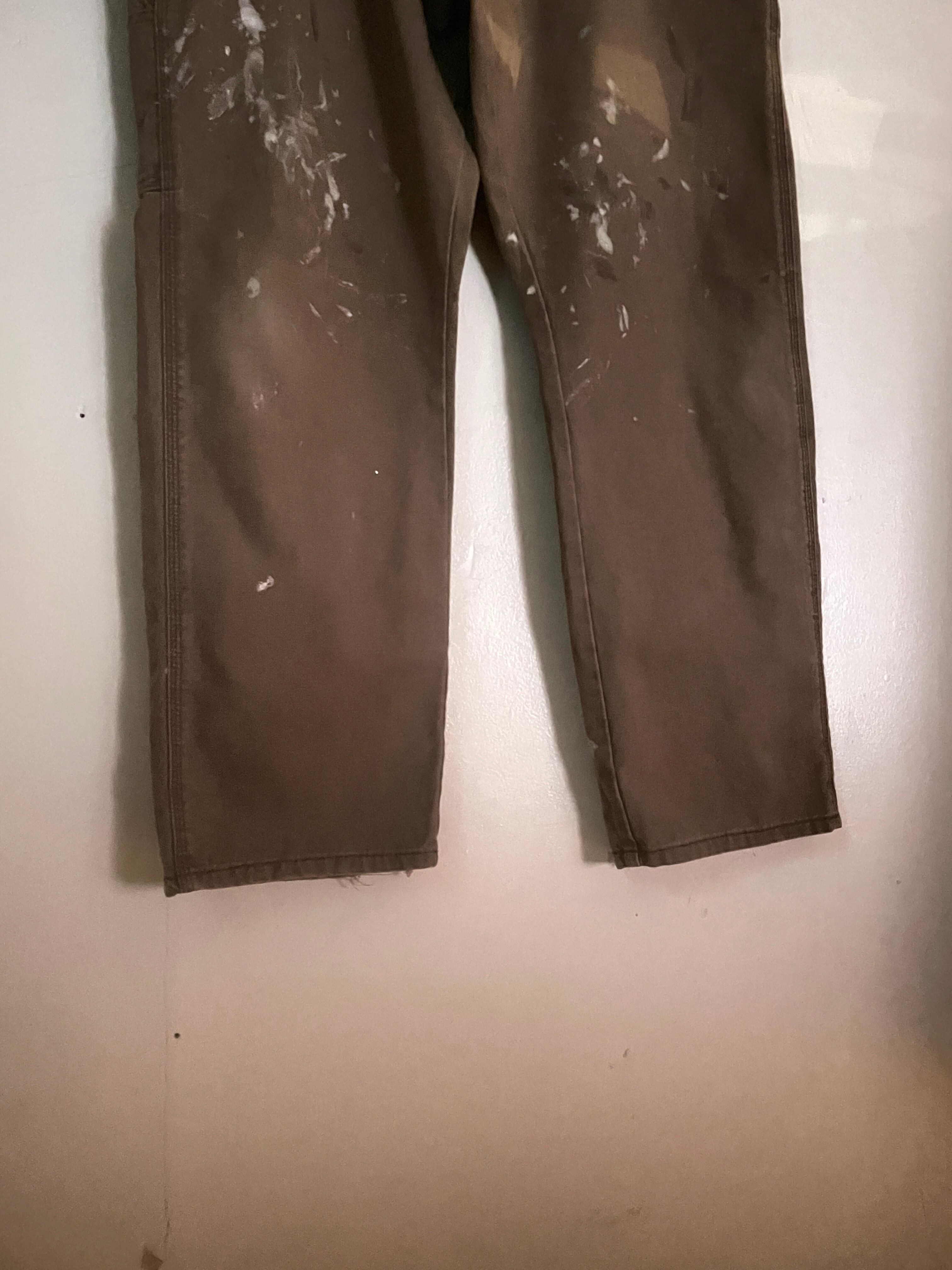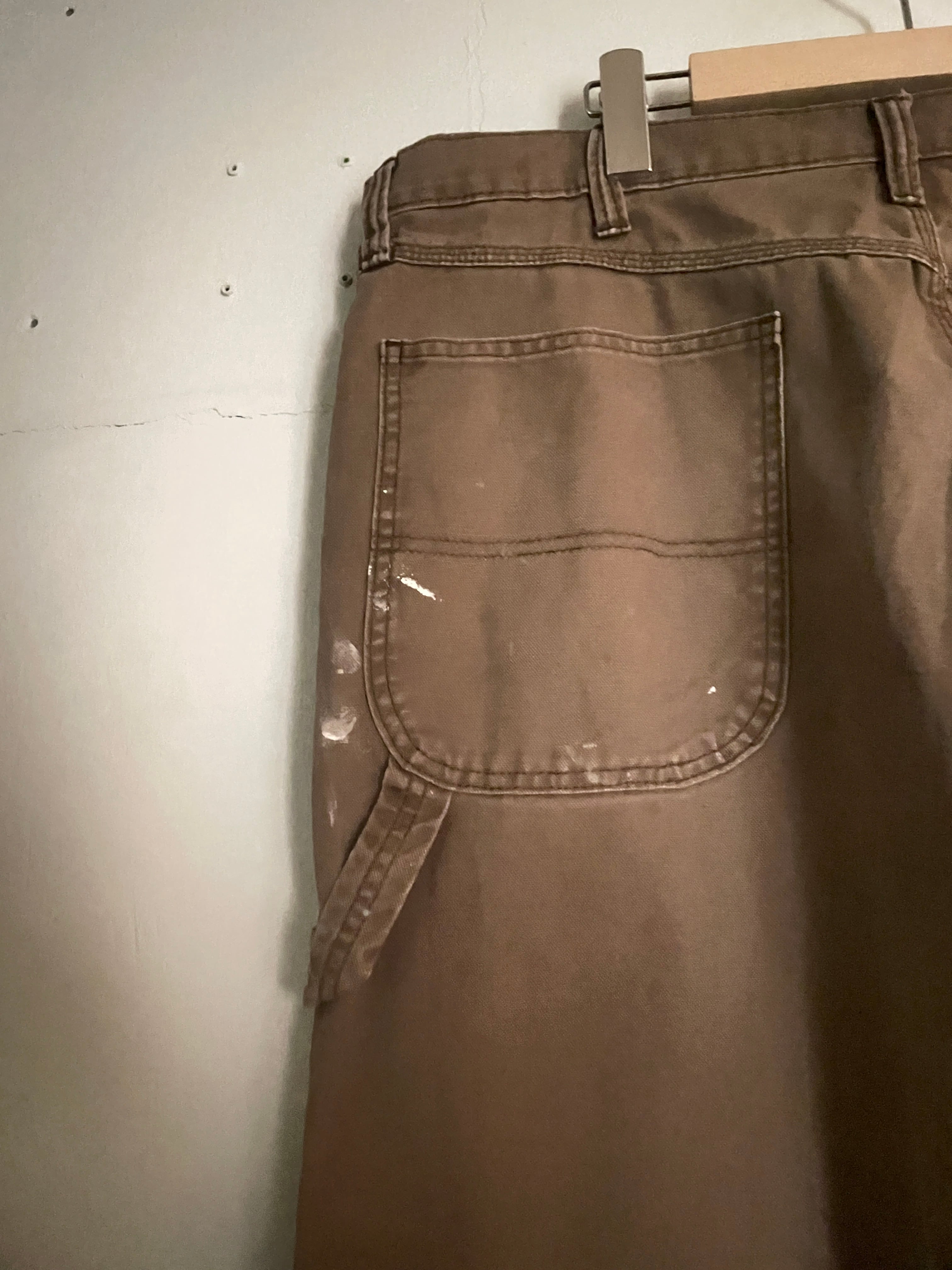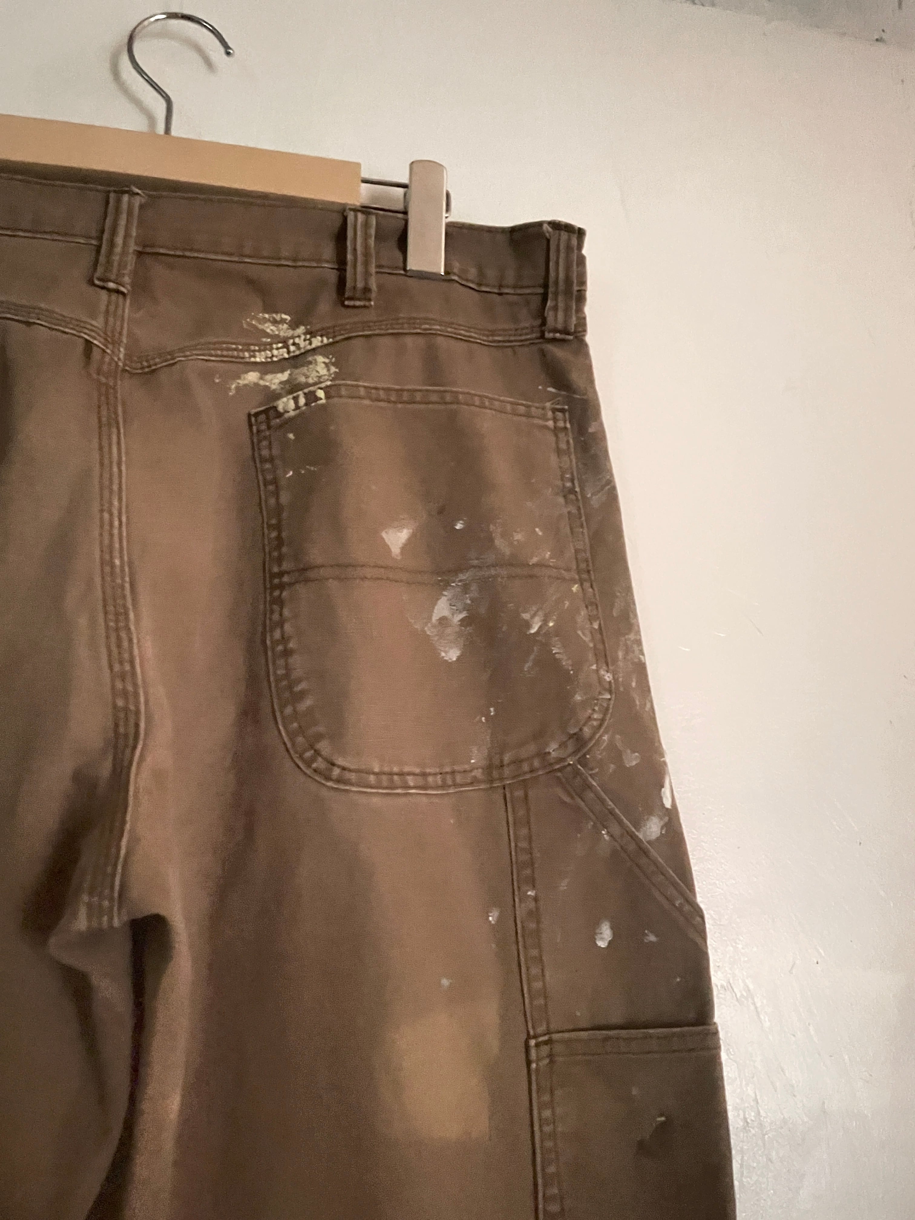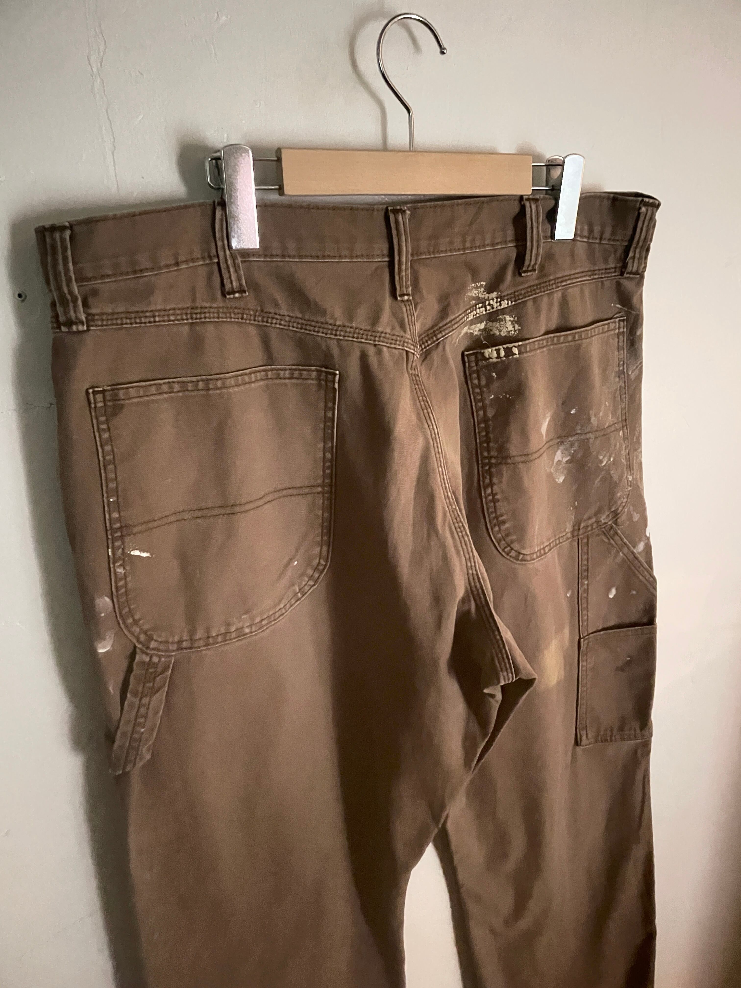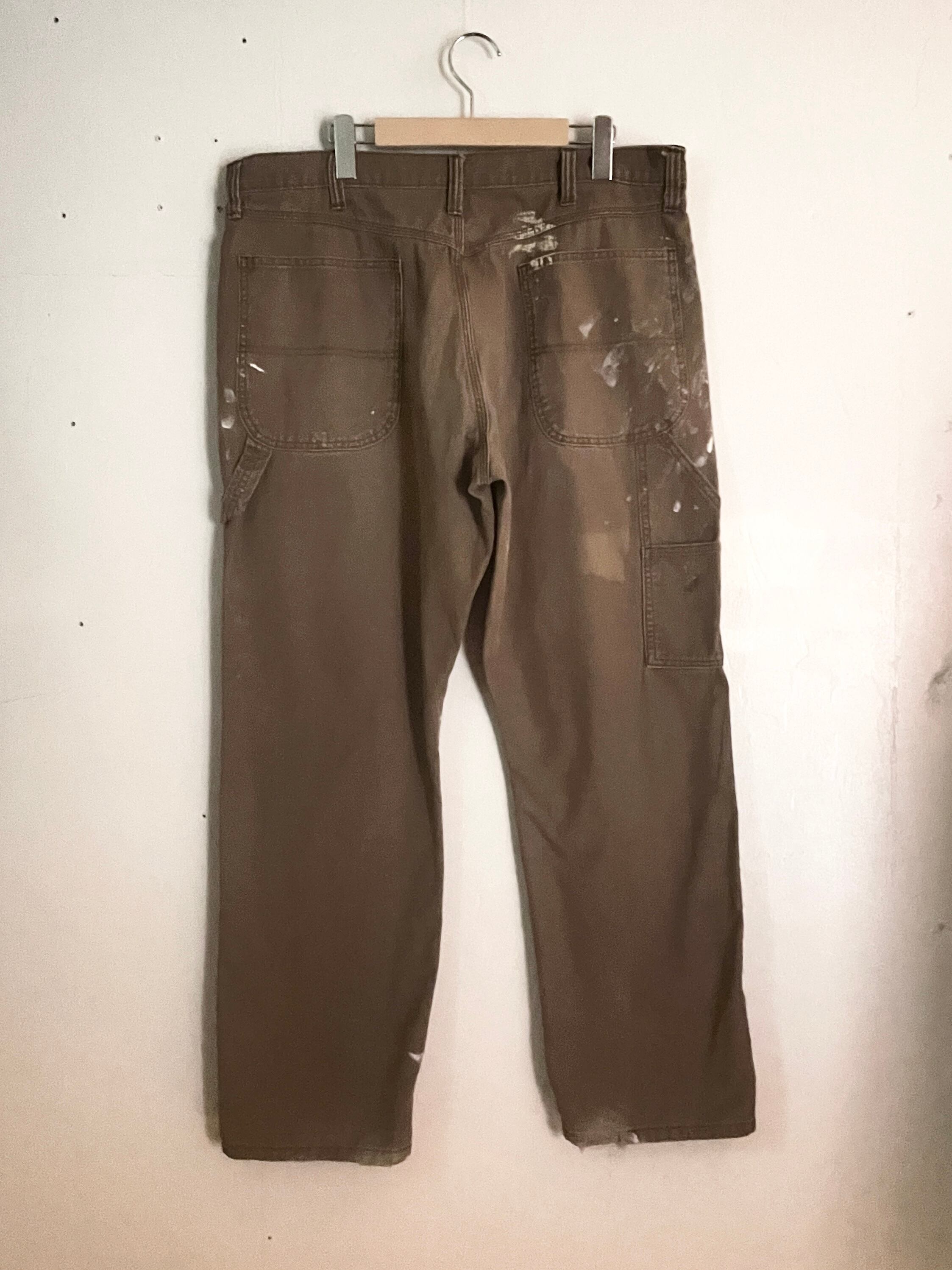 ブラウンカラーにペイントが施された、ラスラーのペインターパンツ。ホワイト、ブラウン、グレーなどのペイントがあえて雑に散りばめられています。それが堪らなくかっこいいです。ペイントがある事によって、ガラッと雰囲気が変わりますよね。ガツンとした太さのあるワイドシルエット。季節問わずガシガシ履ける一本です。