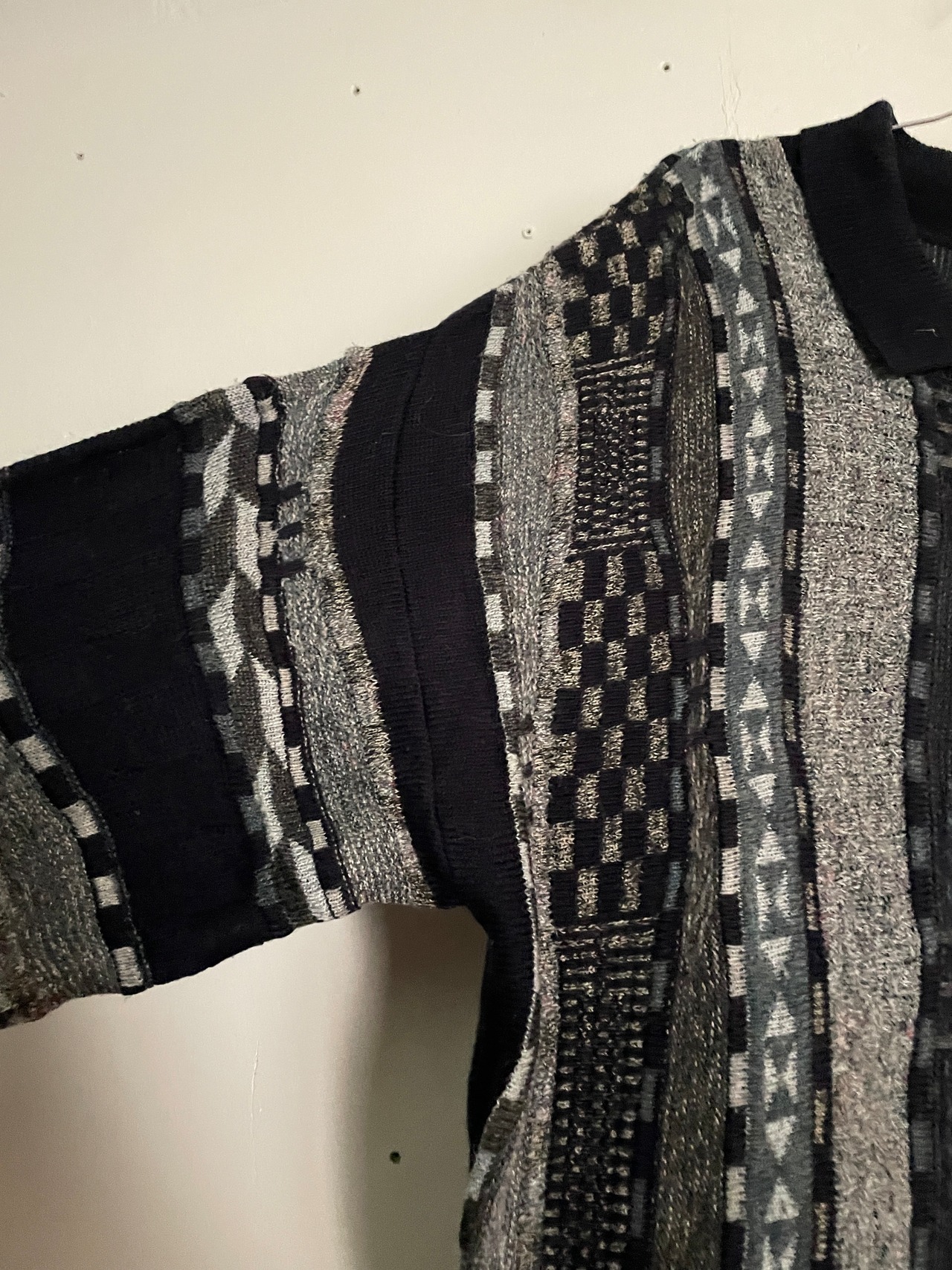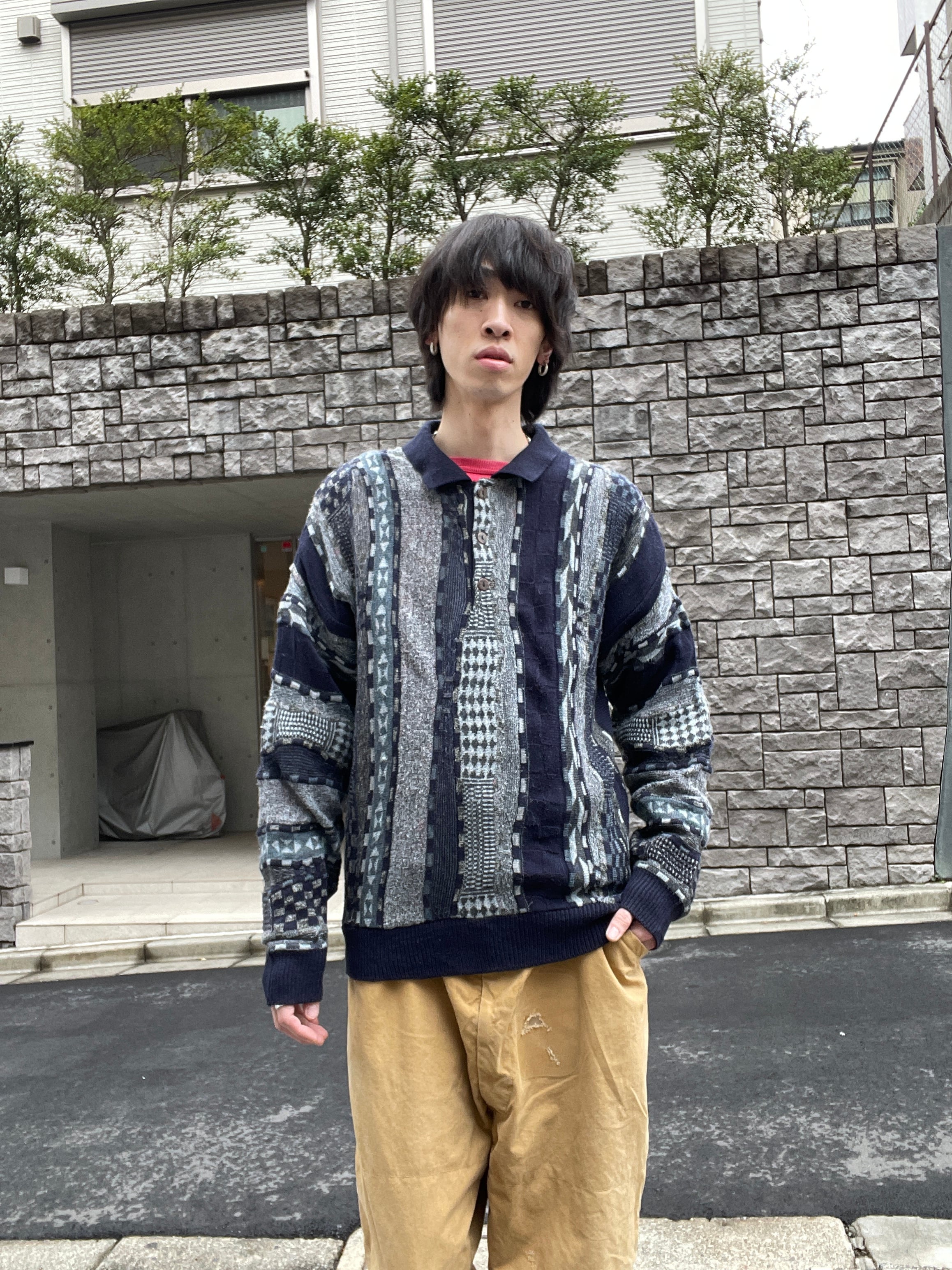 それぞれ違った柄やゲージが組み合わせられたデザインが魅力的な、3Dニットポロ。細かながらや編み方からこだわりが感じられます。肩が落ちるようなゆったりとしたサイズ感。触り心地の良いアクリルとコットン素材。一枚ではもちろんですが、今の時期にはインナーとしても活躍してくれます。