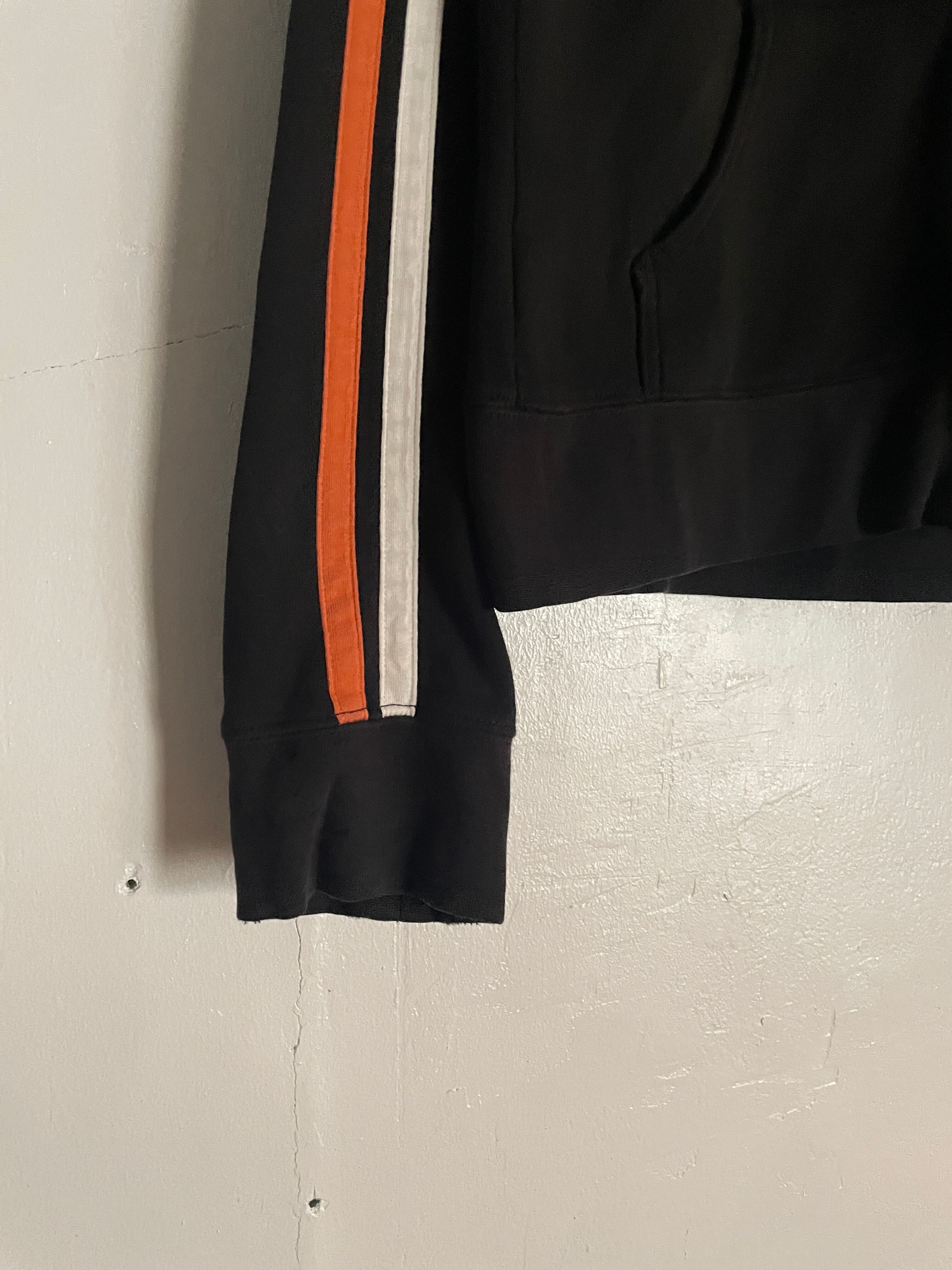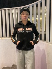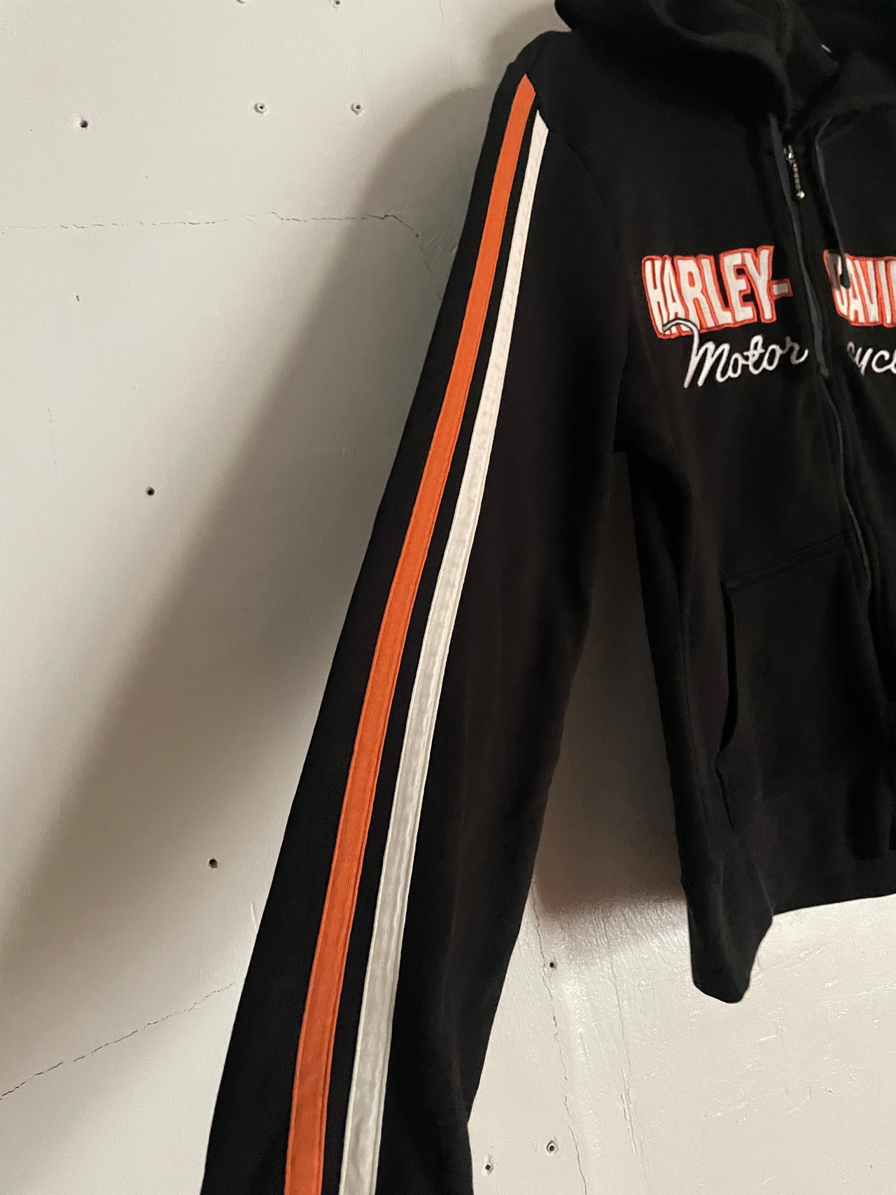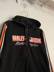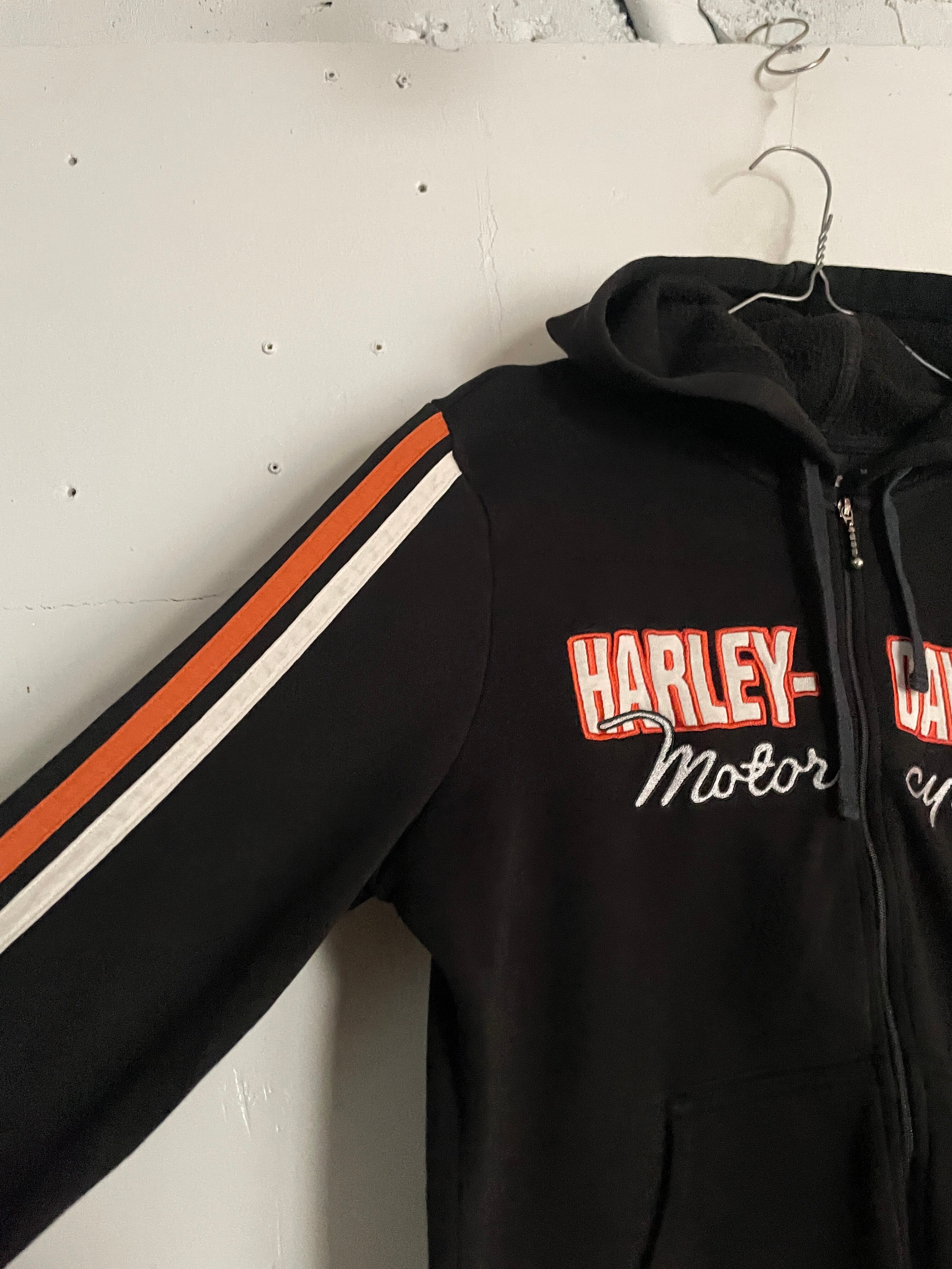 ブラックボディに、キラッとしたブランド刺繍が施された、ハーレーダビッドソンのジップパーカー。ハーレーらしいカラーリングがお洒落です。袖のラインデザインもグッド。タイトめなシルエットで、Y2Kな雰囲気も感じられます。今の時期にはインナーとしても活躍してくれそうです。