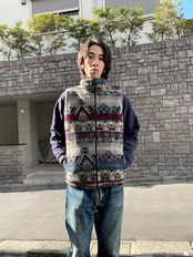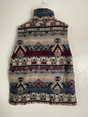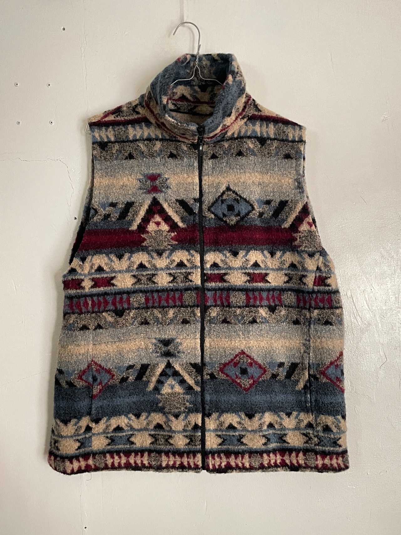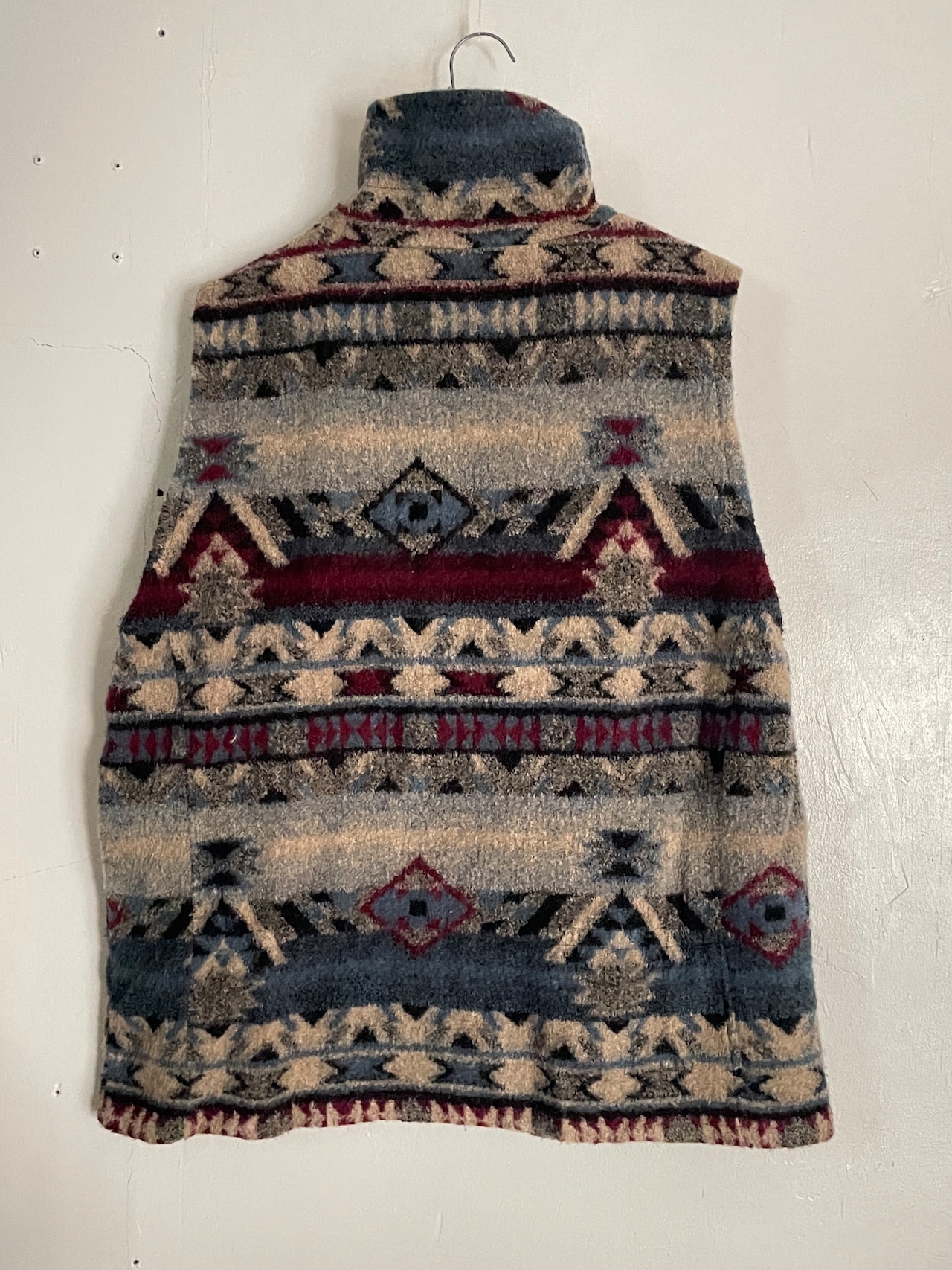 配色の良い民族調のアズテック柄デザインがお洒落なフリースベスト。ブランドはベアーリッジアウトフィッターズ。独特な模様とミステリアスな配色が魅力的です。フワッとした毛足長めのフリース素材で、保温性に優れています。今の時期アウターの上からやインナーなどの差し色としてかなり活躍しそうです。USA製なのもポイントが高いです。