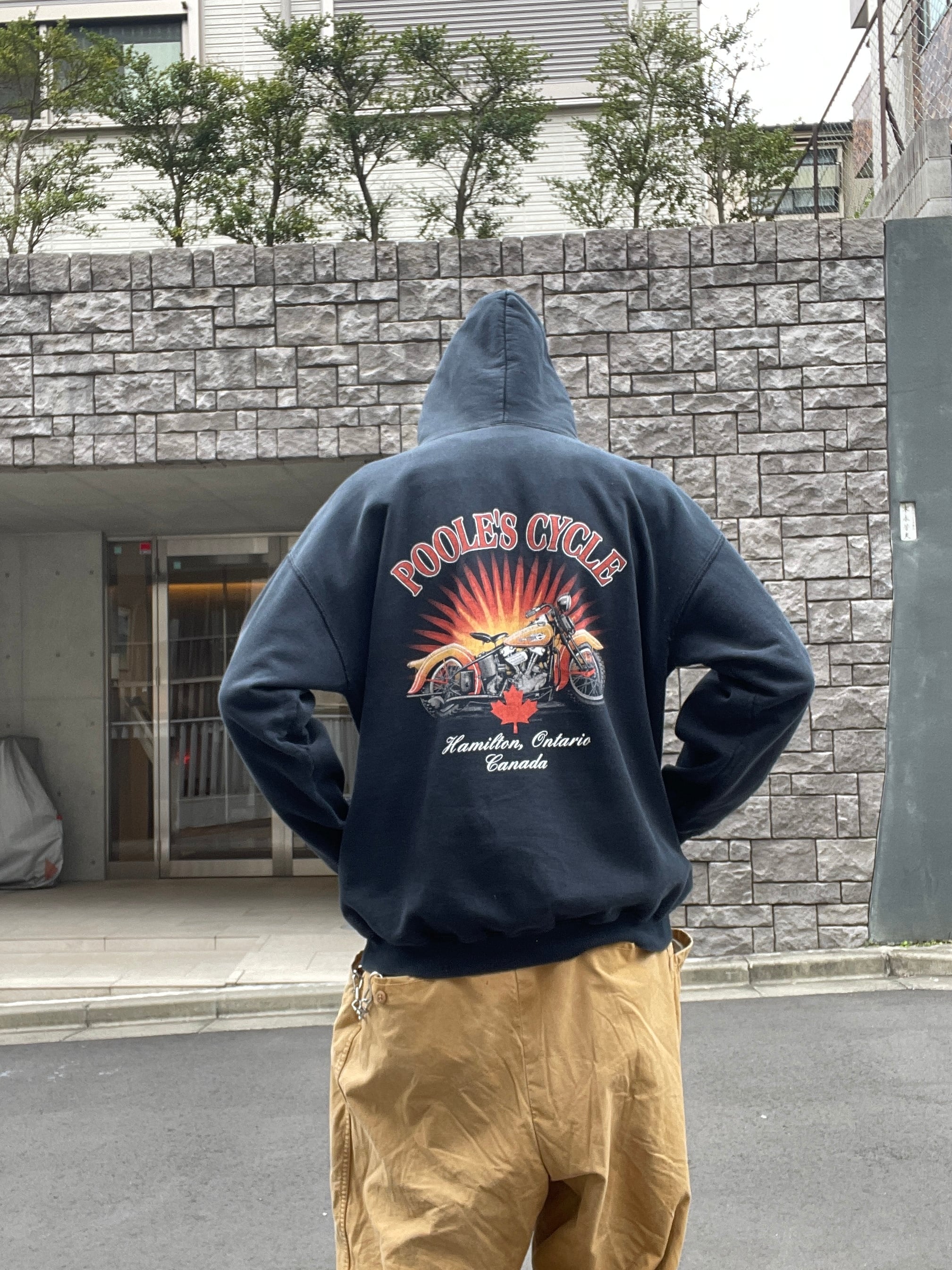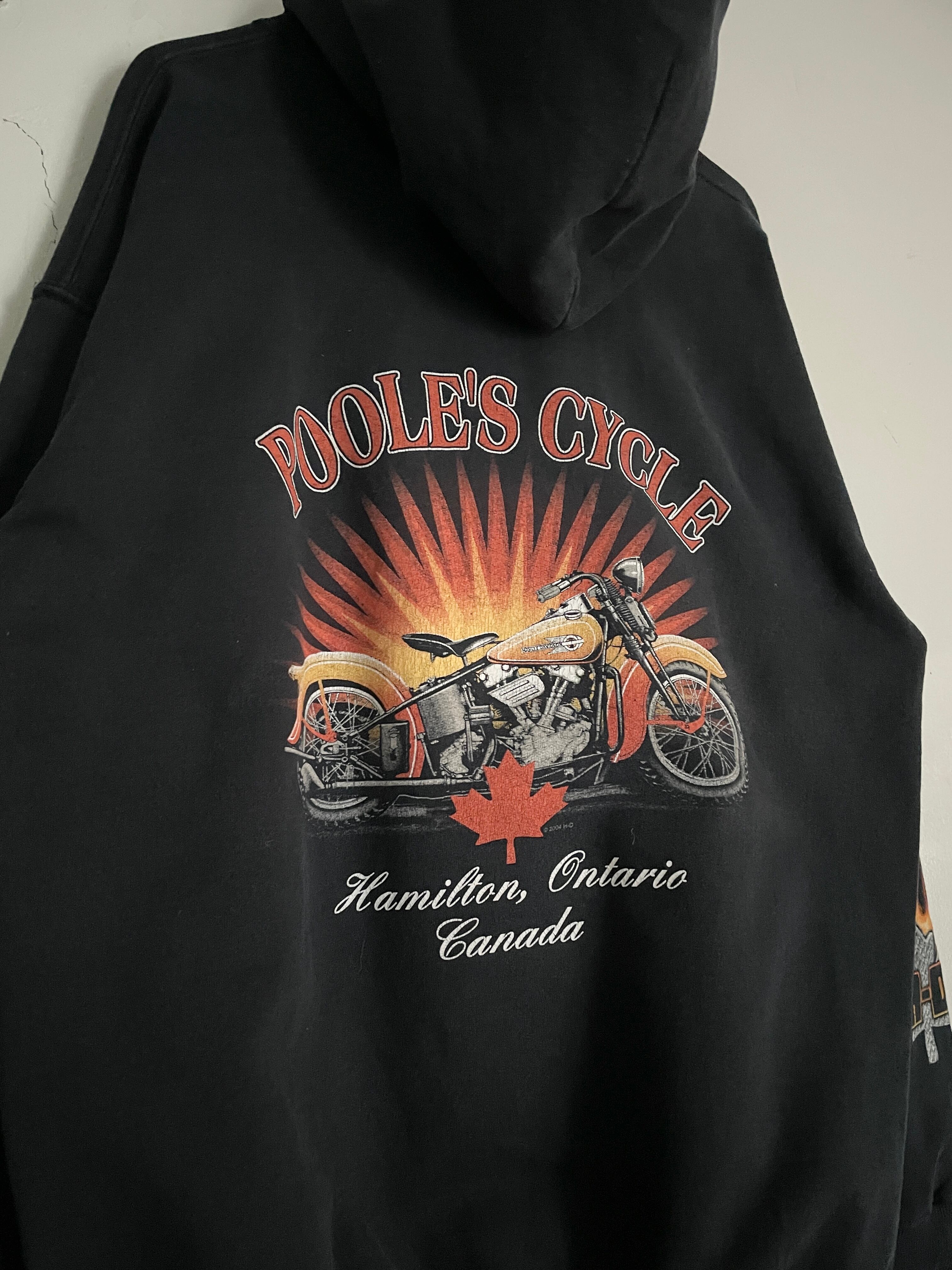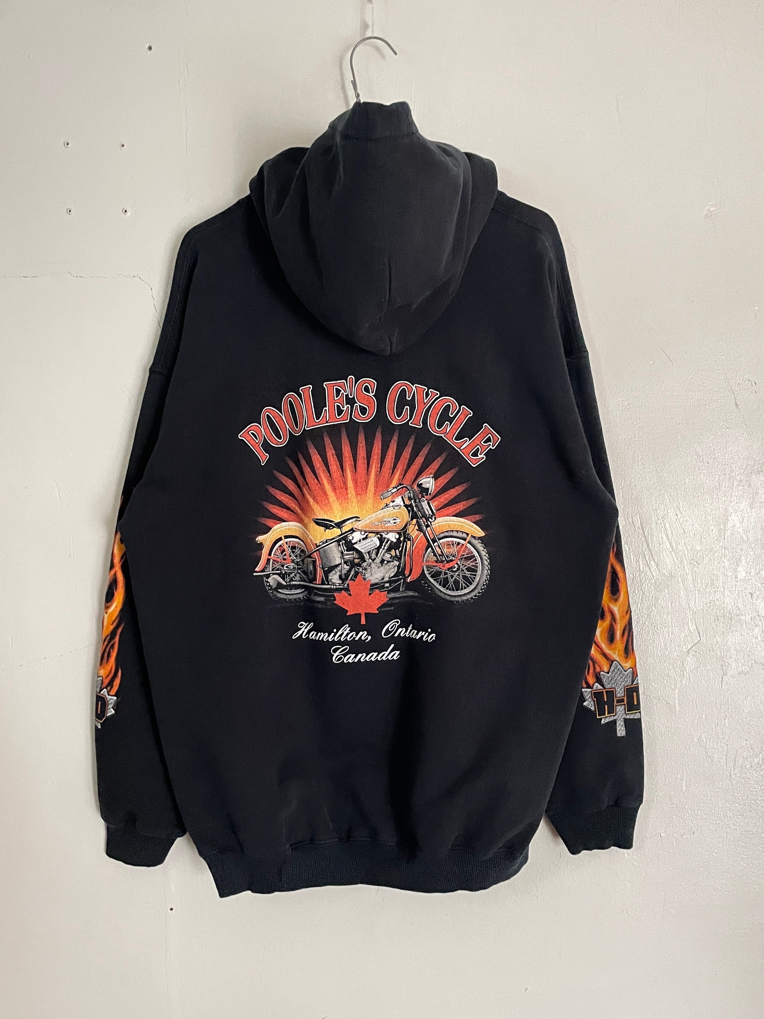 ブラックボディで、フロント、袖、バックにプリントが施された、ハーレーダビッドソンのパーカー。フロント、袖部分にはファイアーハーレープリント。バックにはカナダのハミルトンにある”POOLE'S CYCLE"のグラフィックプリントが施されています。インパクト大のデザインになっています。04年のコピーライト入り。タフなコットンポリ素材なので、保温性にも優れています。ゆったりとしたサイズ感で、ラフに着られるのも魅力的です。ハーレーアイテムは年々高騰しているので、探していた方は是非。