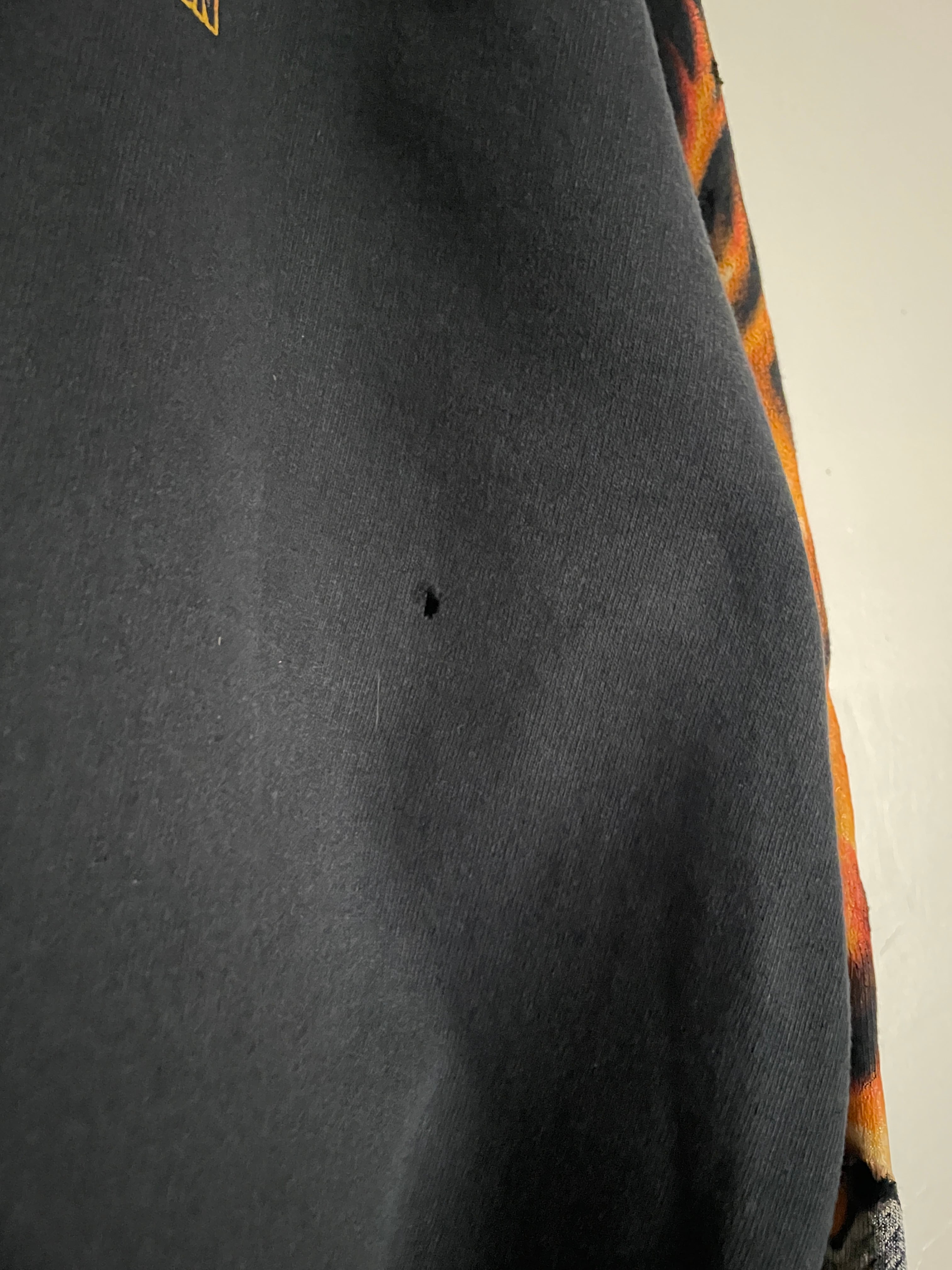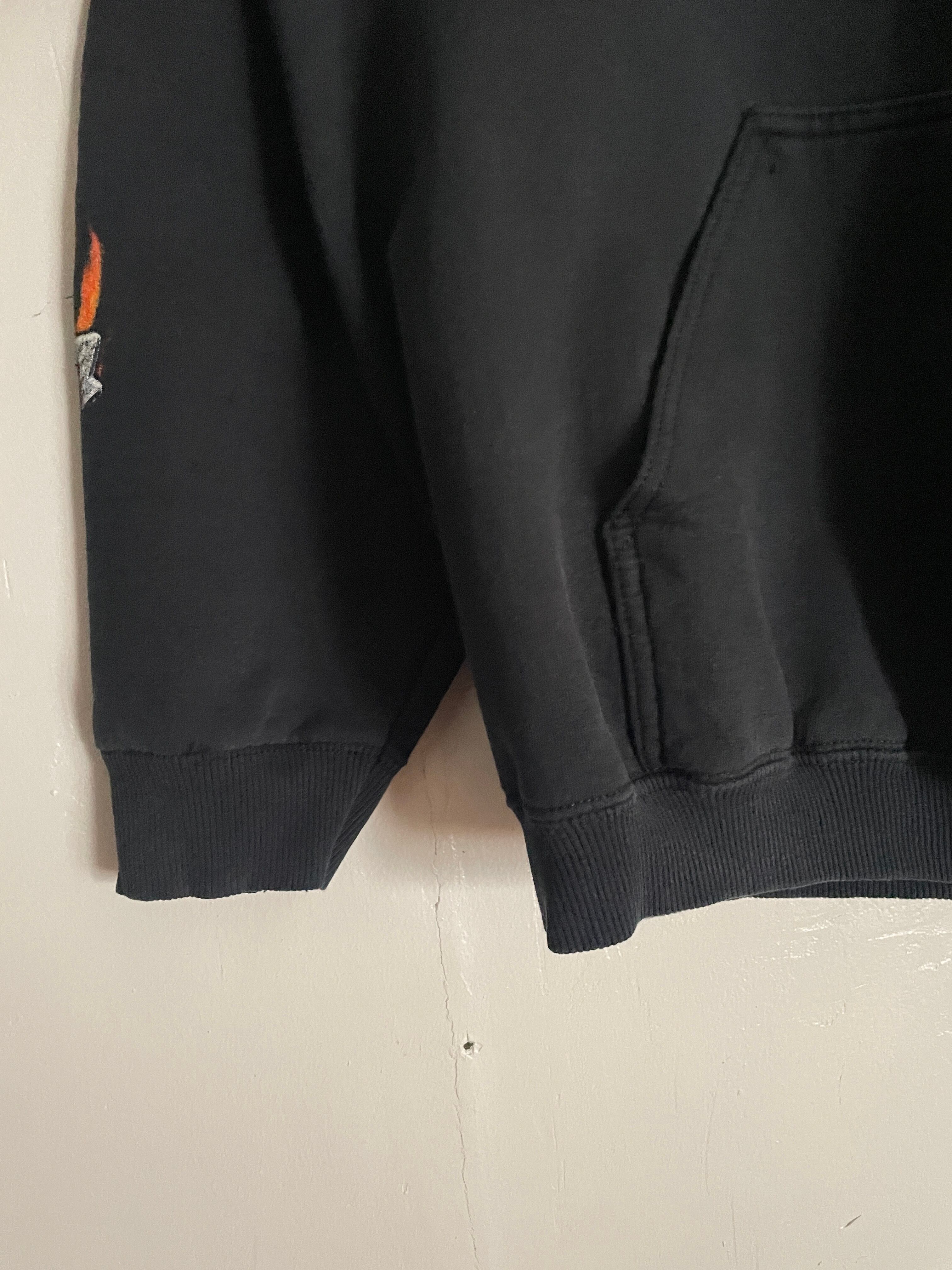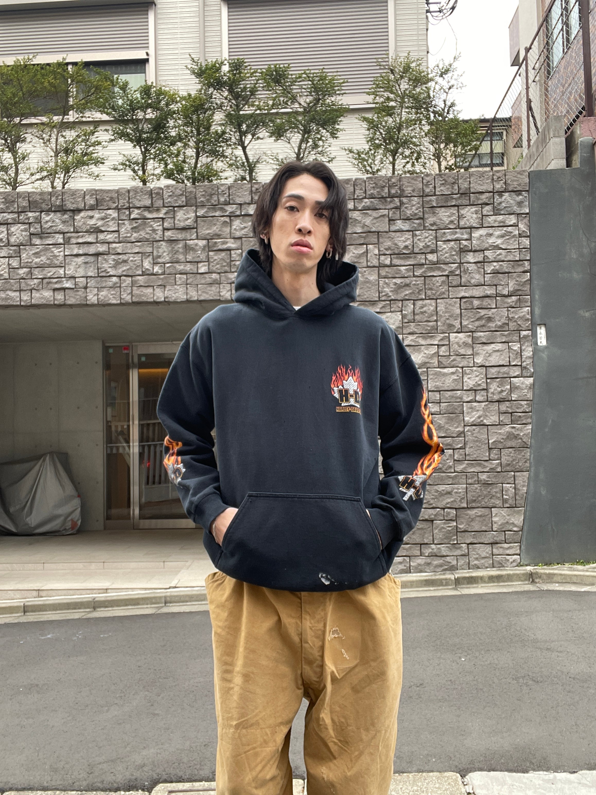 ブラックボディで、フロント、袖、バックにプリントが施された、ハーレーダビッドソンのパーカー。フロント、袖部分にはファイアーハーレープリント。バックにはカナダのハミルトンにある”POOLE'S CYCLE"のグラフィックプリントが施されています。インパクト大のデザインになっています。04年のコピーライト入り。タフなコットンポリ素材なので、保温性にも優れています。ゆったりとしたサイズ感で、ラフに着られるのも魅力的です。ハーレーアイテムは年々高騰しているので、探していた方は是非。
