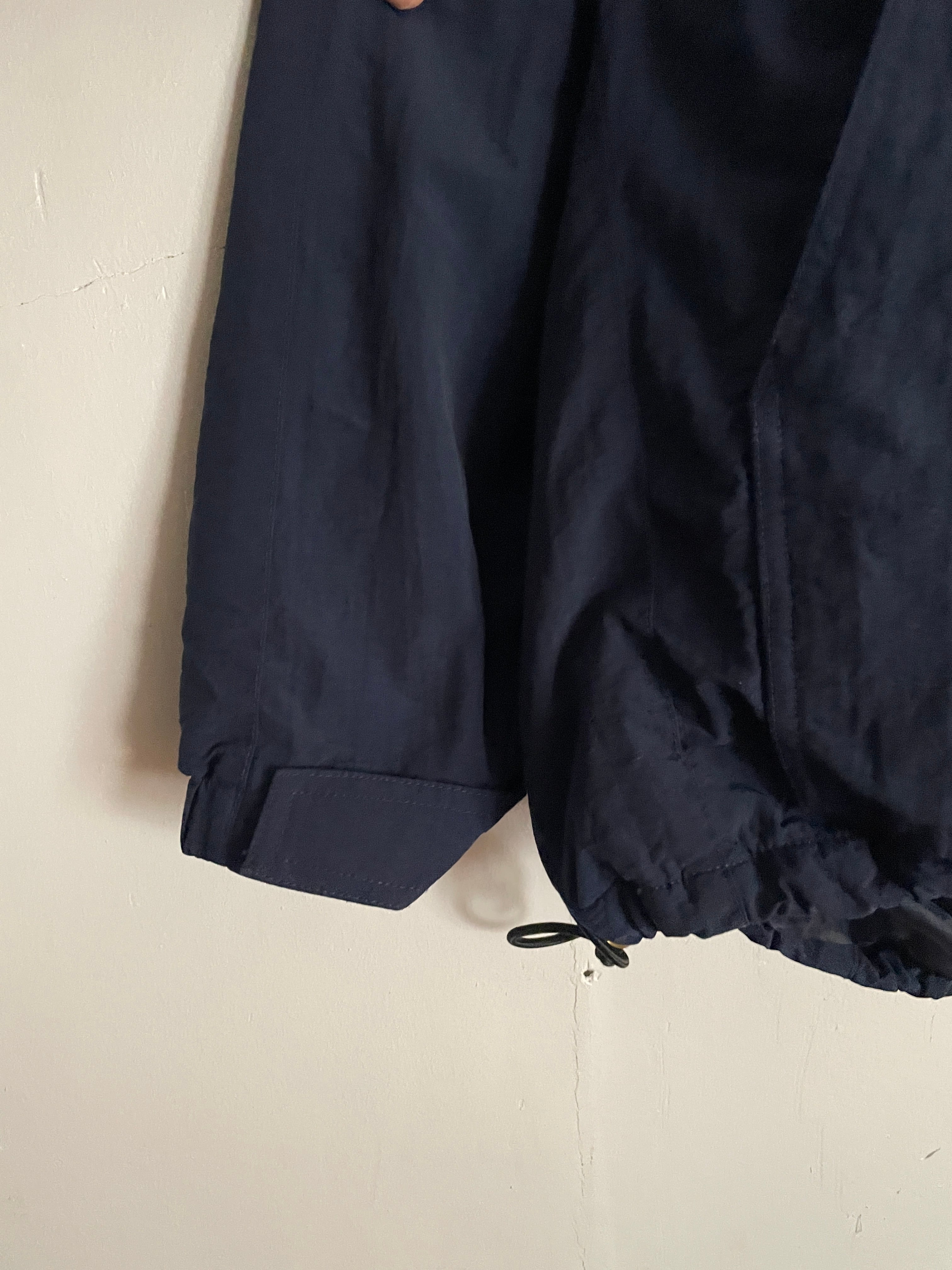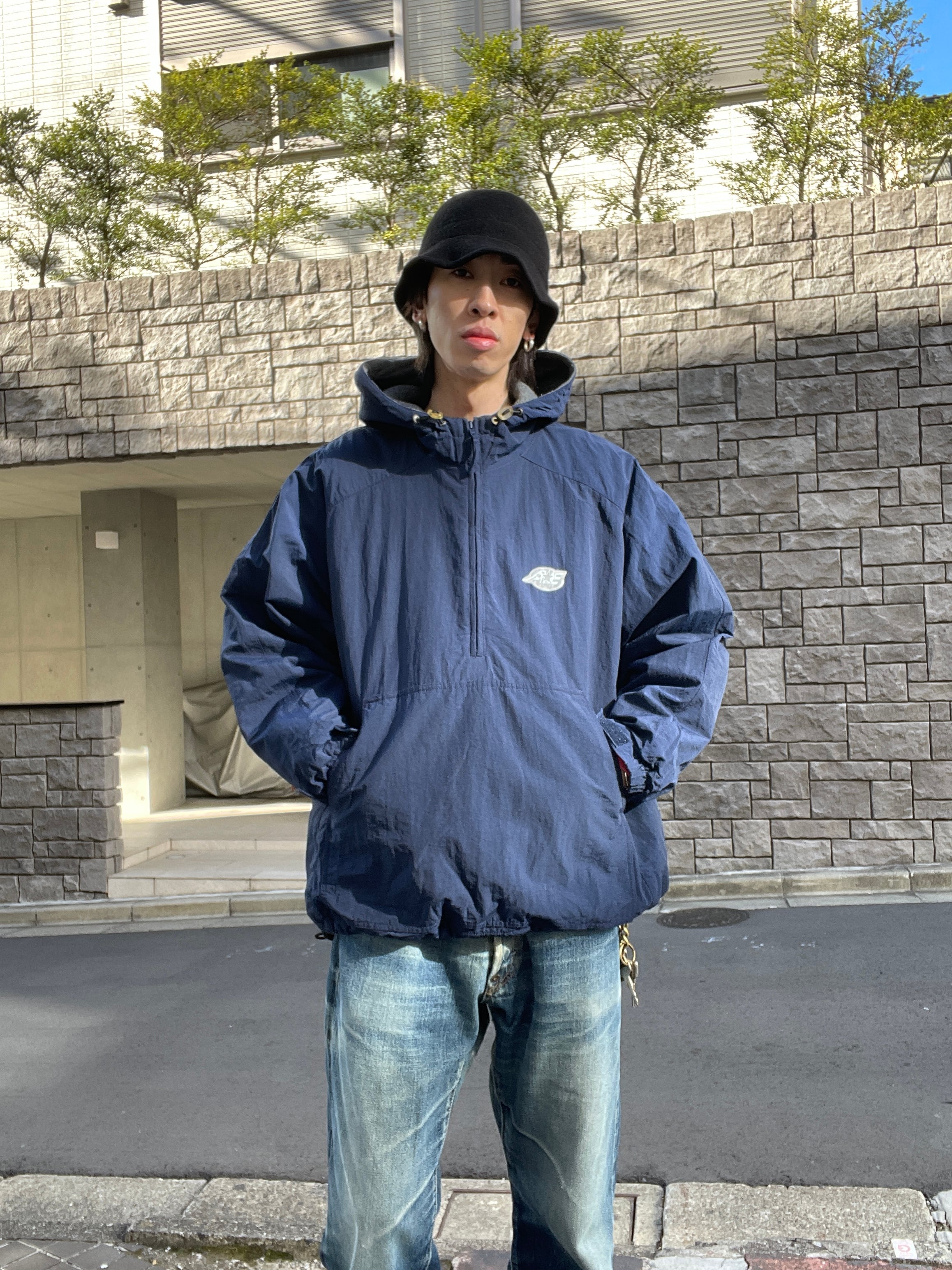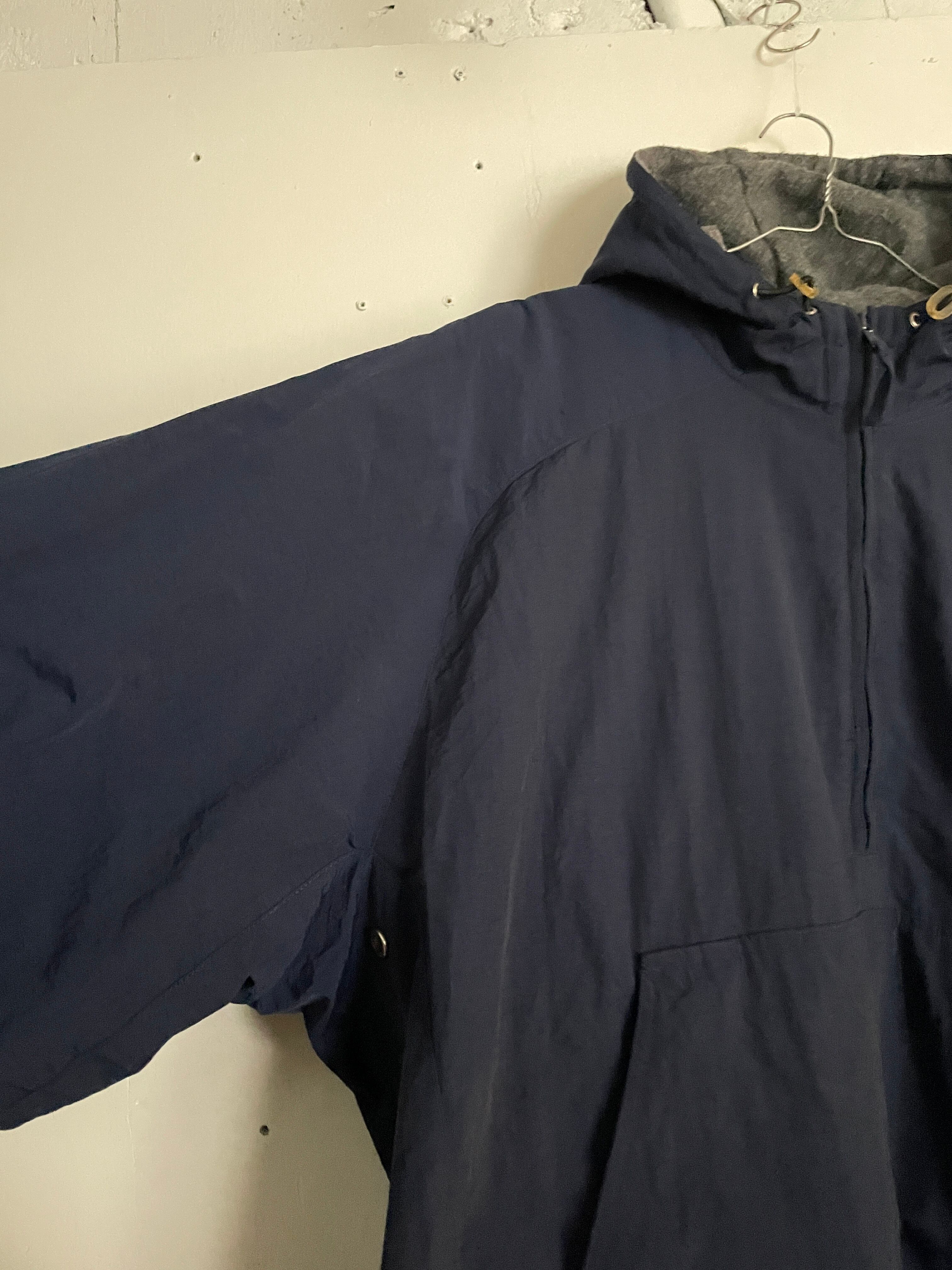 ネイビーボディで、裏地がフワッとしたフリース素材の、ナイロンプルオーバージャケット。ジップ付きのデカポケットが魅力的です。裾にはドローコード付きで、気分で丈感を変えれるのもグッド。機能性、保温性に優れた、まさに冬ジャケットです。ゆったりとしたサイズ感なので、インナーにもしっかり着込めそうです。