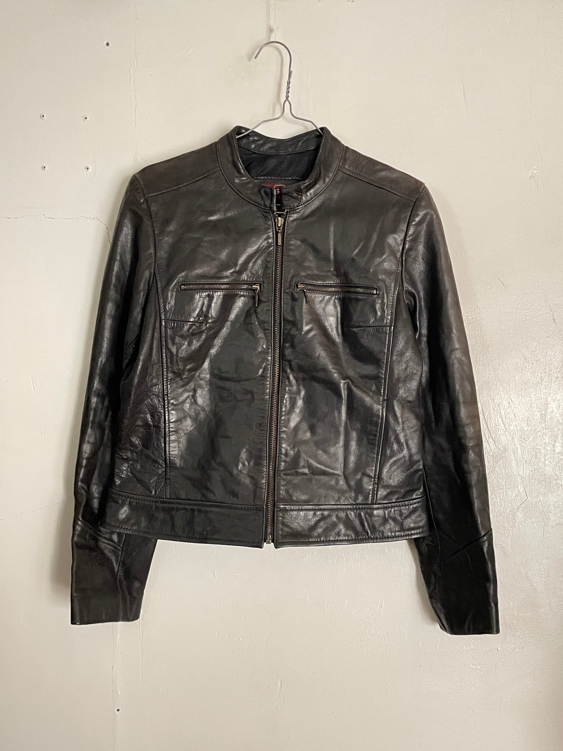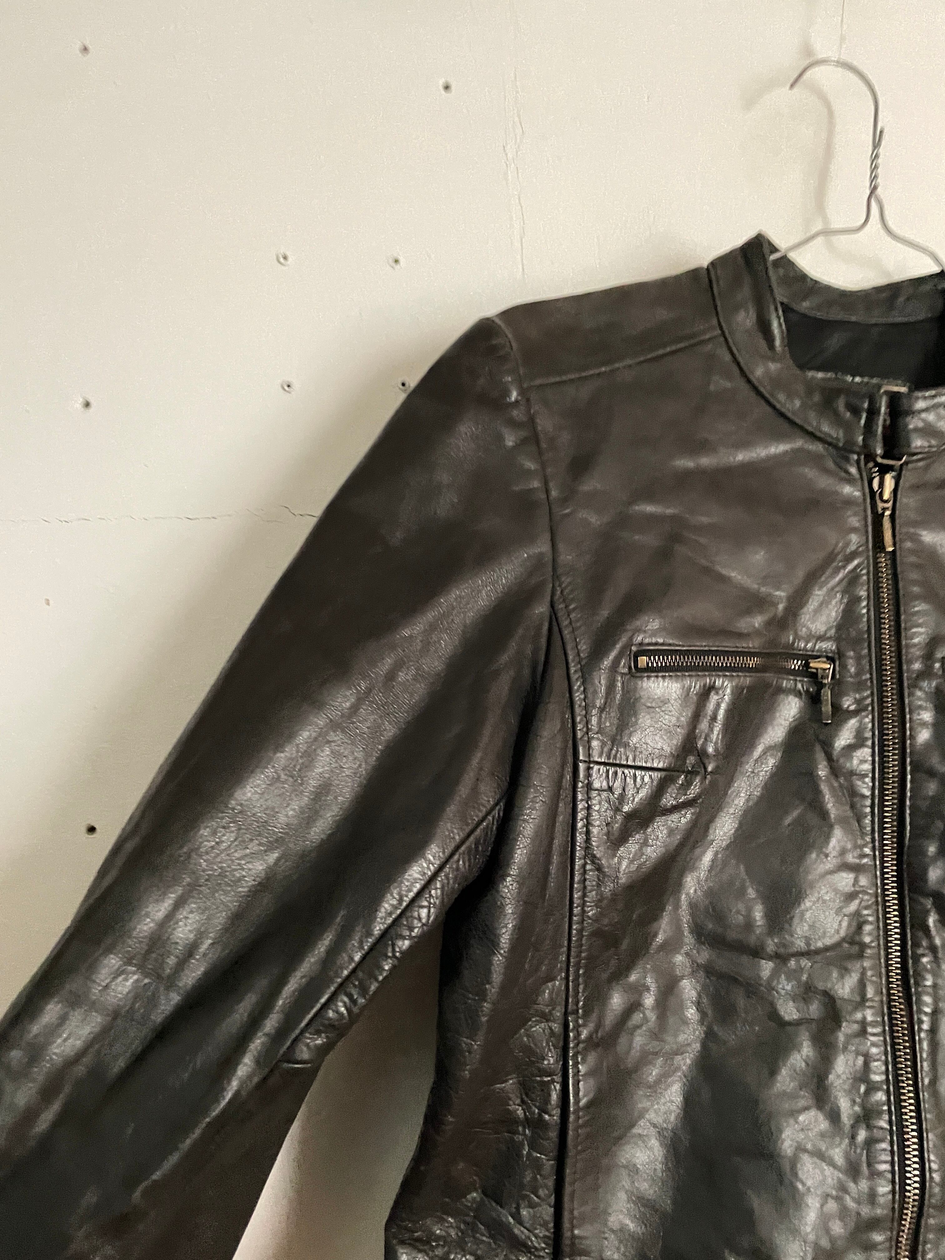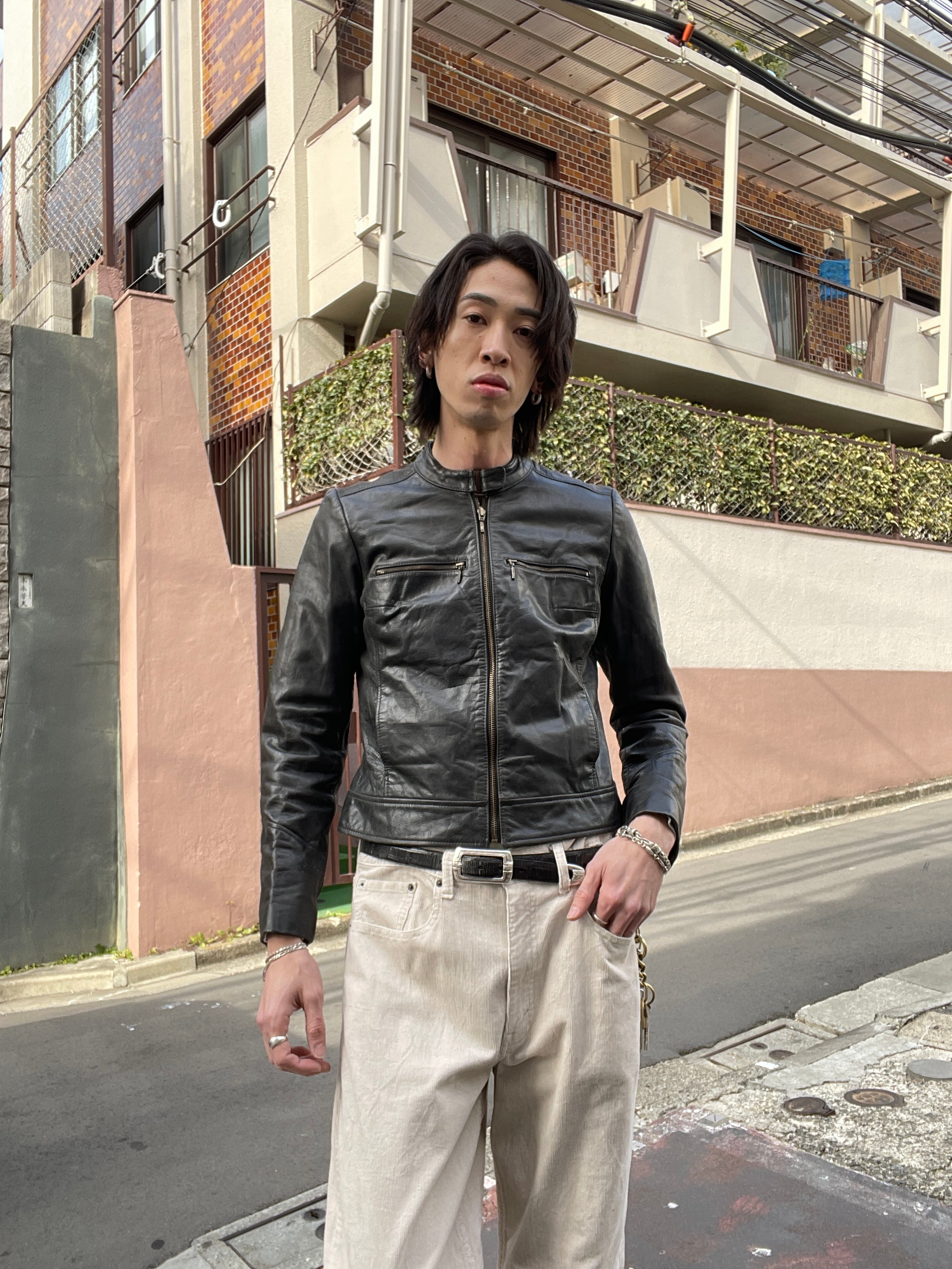 やや光沢のあるブラックボディで、ポケットのデザイン、ネック部分のベルトのデザインなどが特徴的な、レッドスキンズのライダースレザージャケット。シングルタイプのかっこいいディテール。どこかY2Kな雰囲気が感じられます。タイトめなシルエットで、体のラインを綺麗に出してくれます。女性の方にはもちろんですが、男性の方もジャストめで着たらお洒落に着られるかと思います。