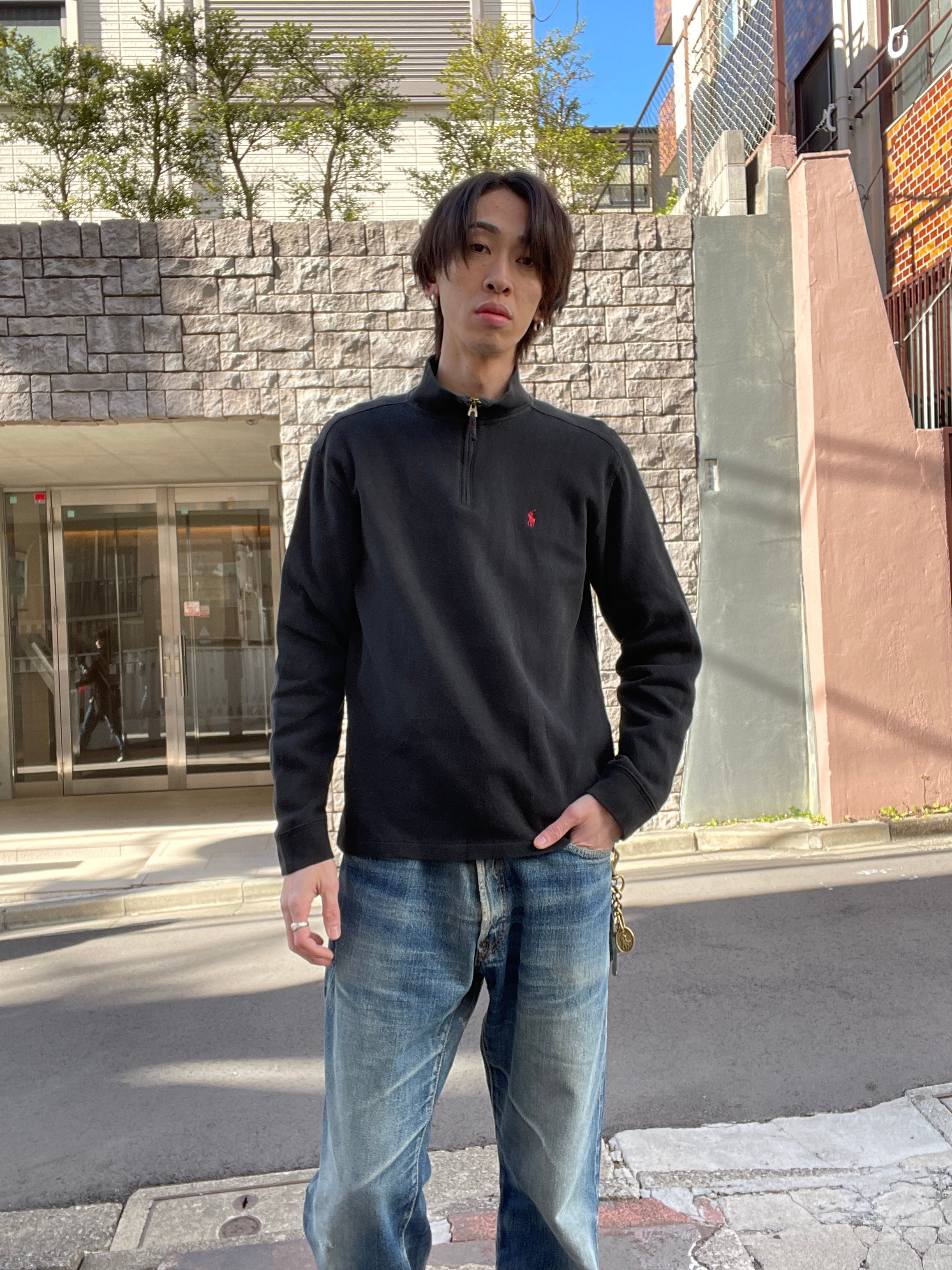ブラックにレッドのワンポイントロゴがシンプルなデザインの、ラルフローレンハーフジップニット。ゆったりめなサイズ感で、ラフに着られるサイズ感です。素材は伸縮性のあるコットンニットのため着心地は良し。一枚ではもちろんの事、インナーとしても活躍してくれる一着かと思います。