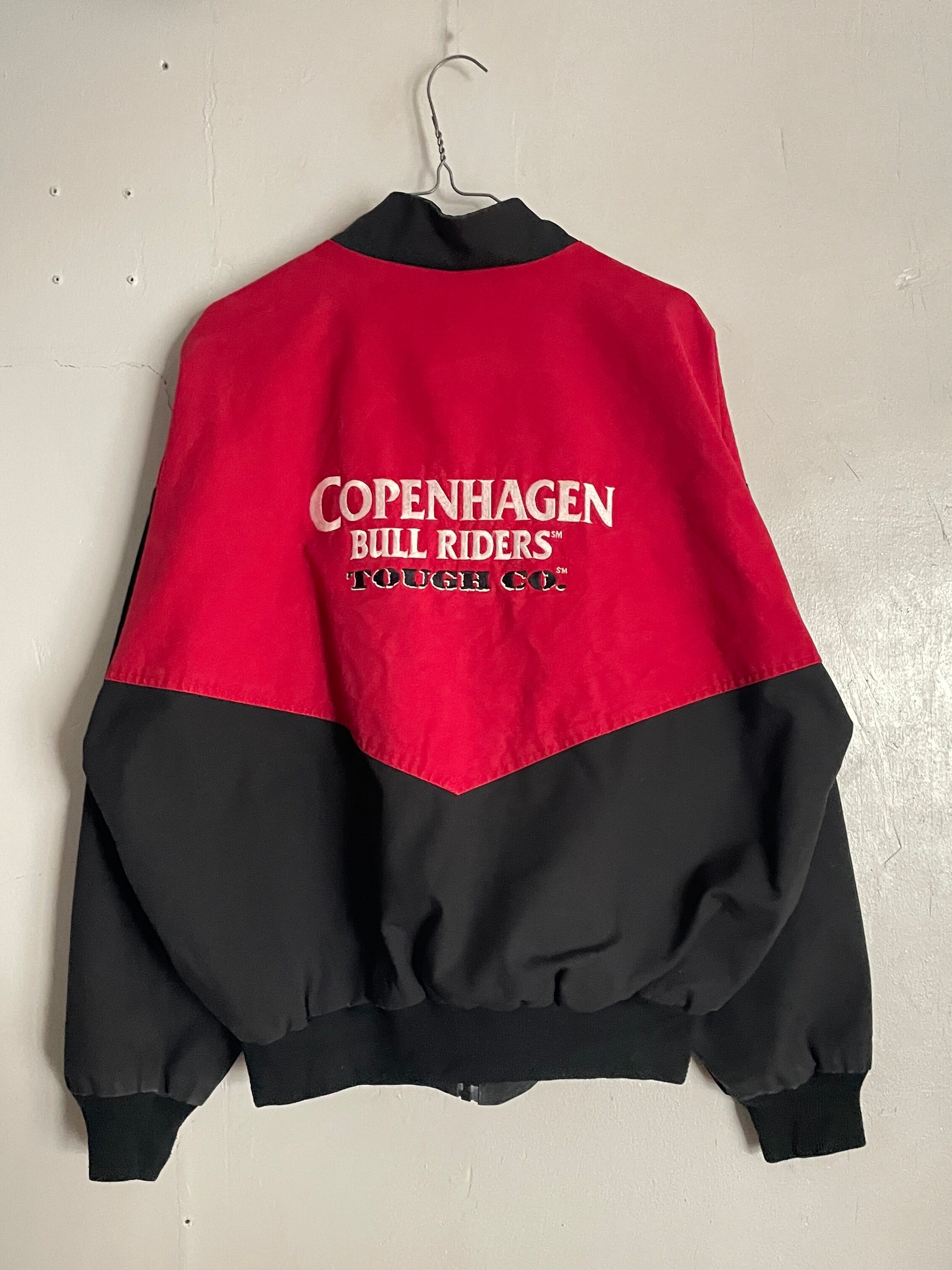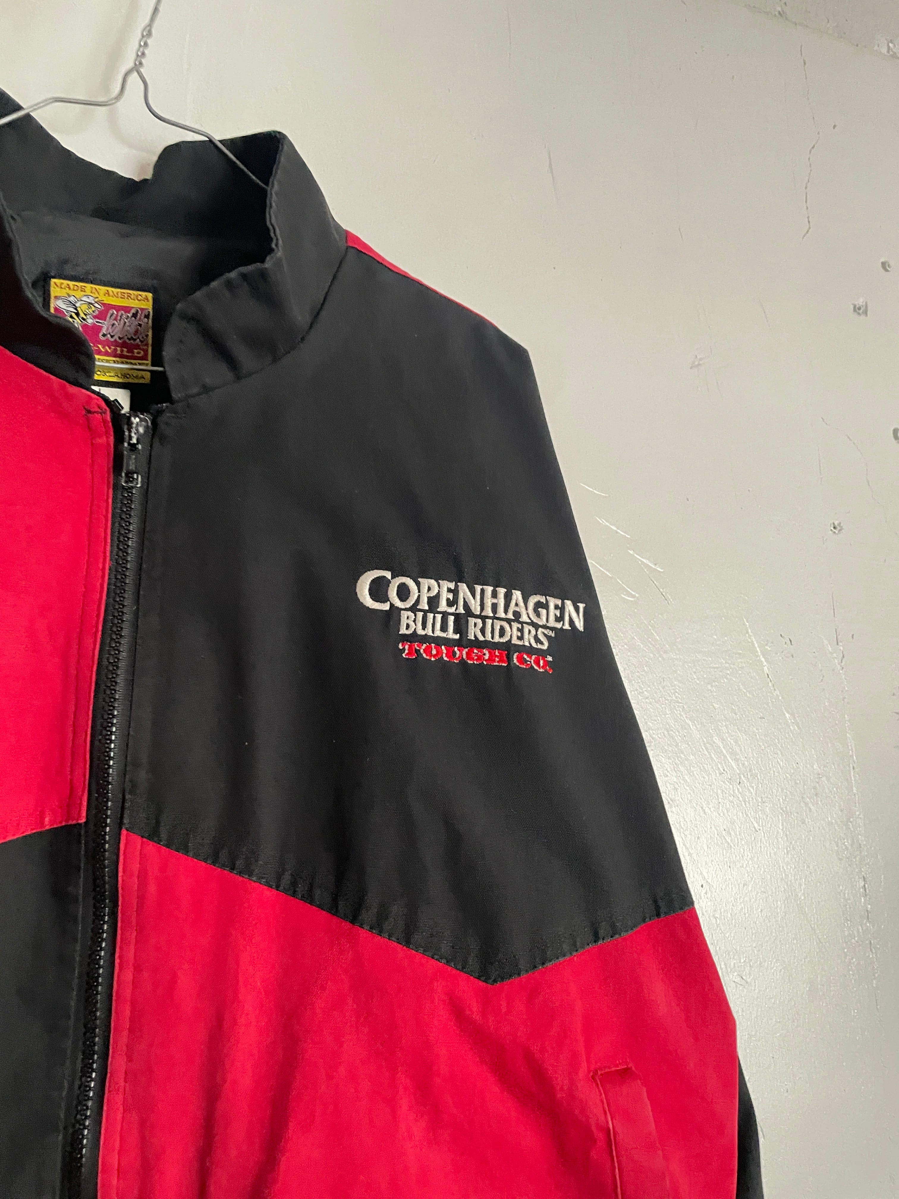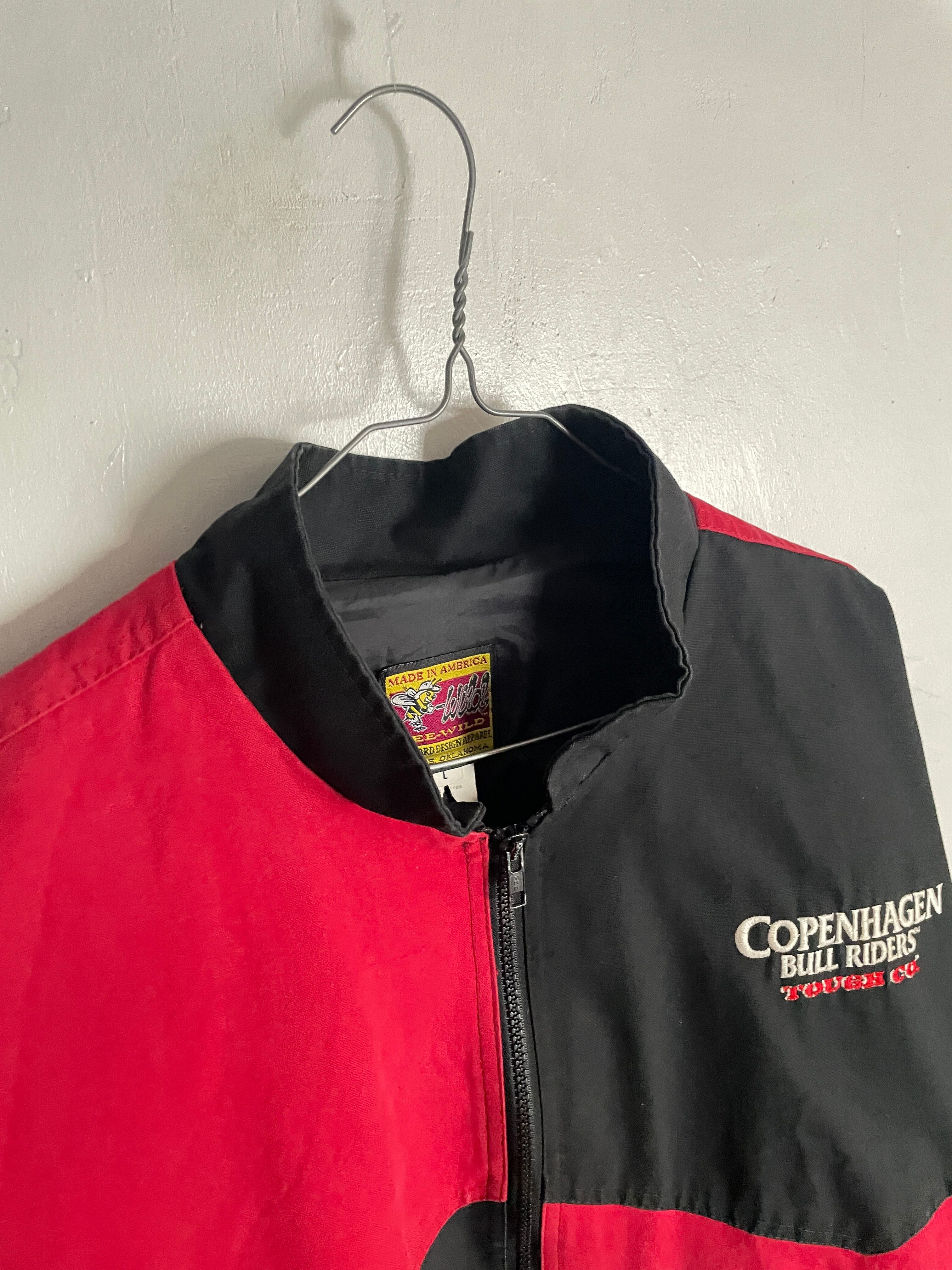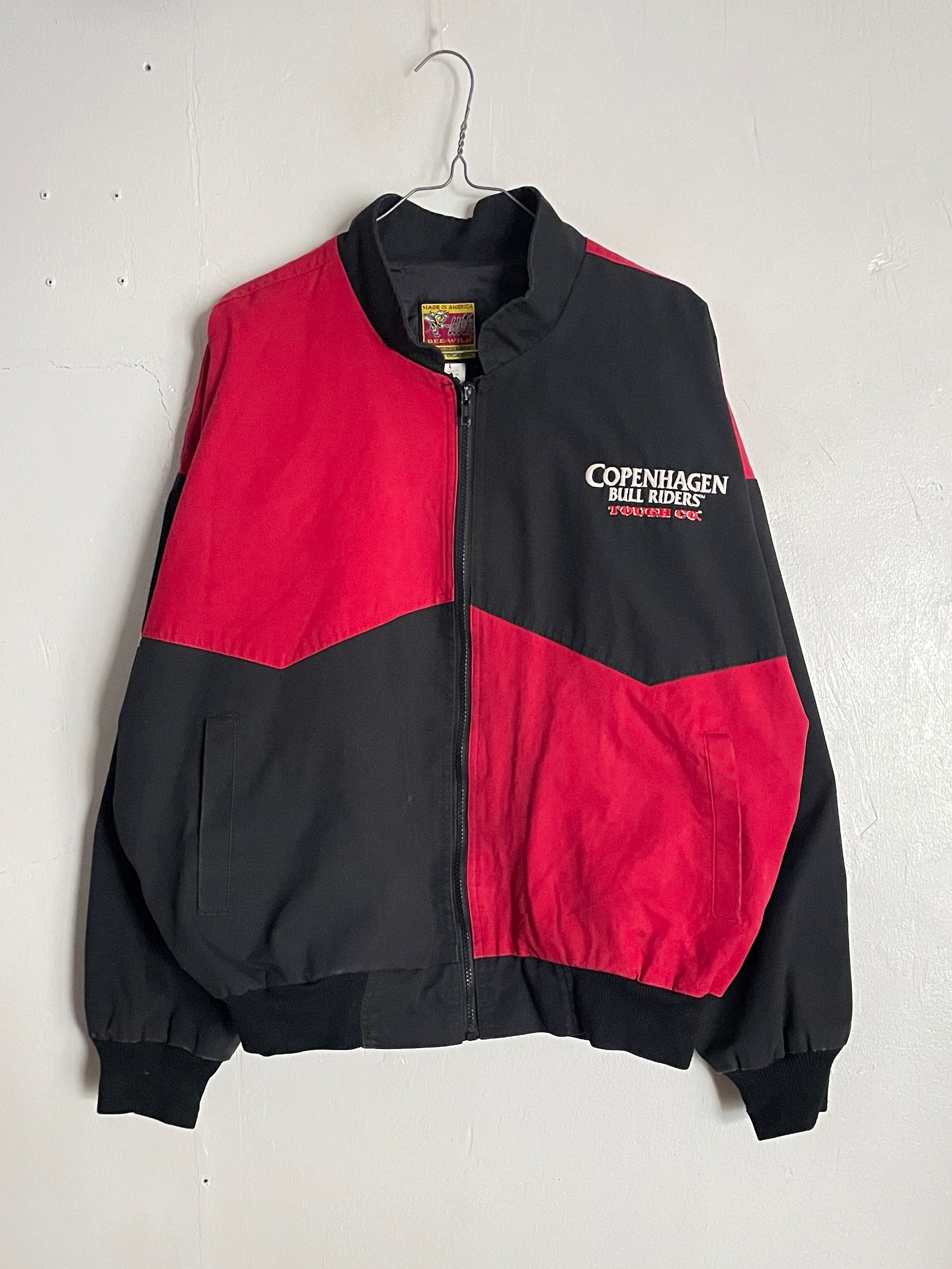 ブラック、レッドの2トーンカラーで、”Copenhagen Bull Riders"の刺繍が施されたジップジャケット。左右で逆のデザインが面白いです。バックはフロントとは逆にデカ刺繍。前後でバランスの取れたデザインが魅力的です。しっかりとしたタフなコットン素材。肩が落ちるような緩いシルエットになっています。今の時期には、インナーに着込んで、主役になってくれる1着です。USA製なのもポイントが高いです。