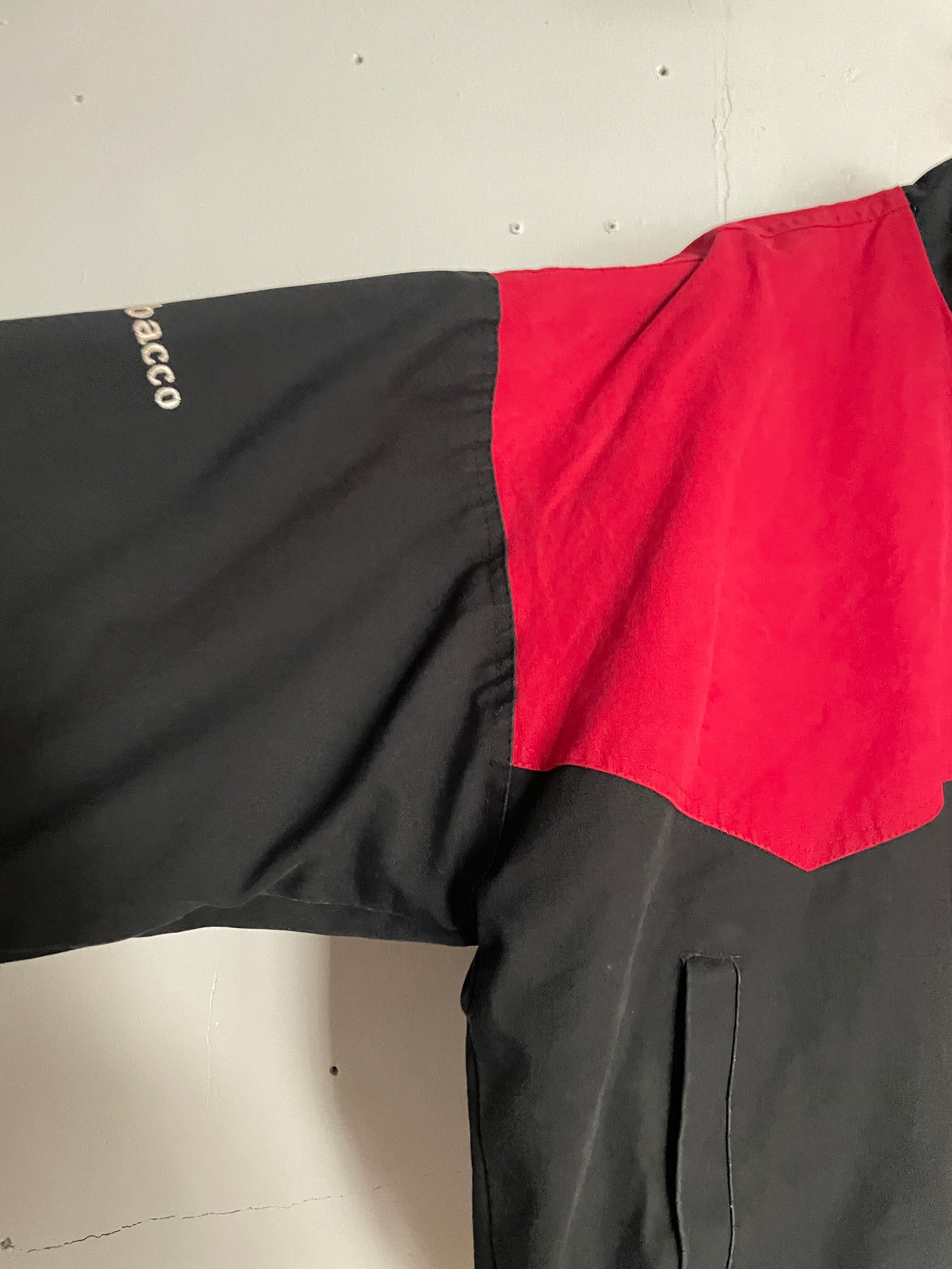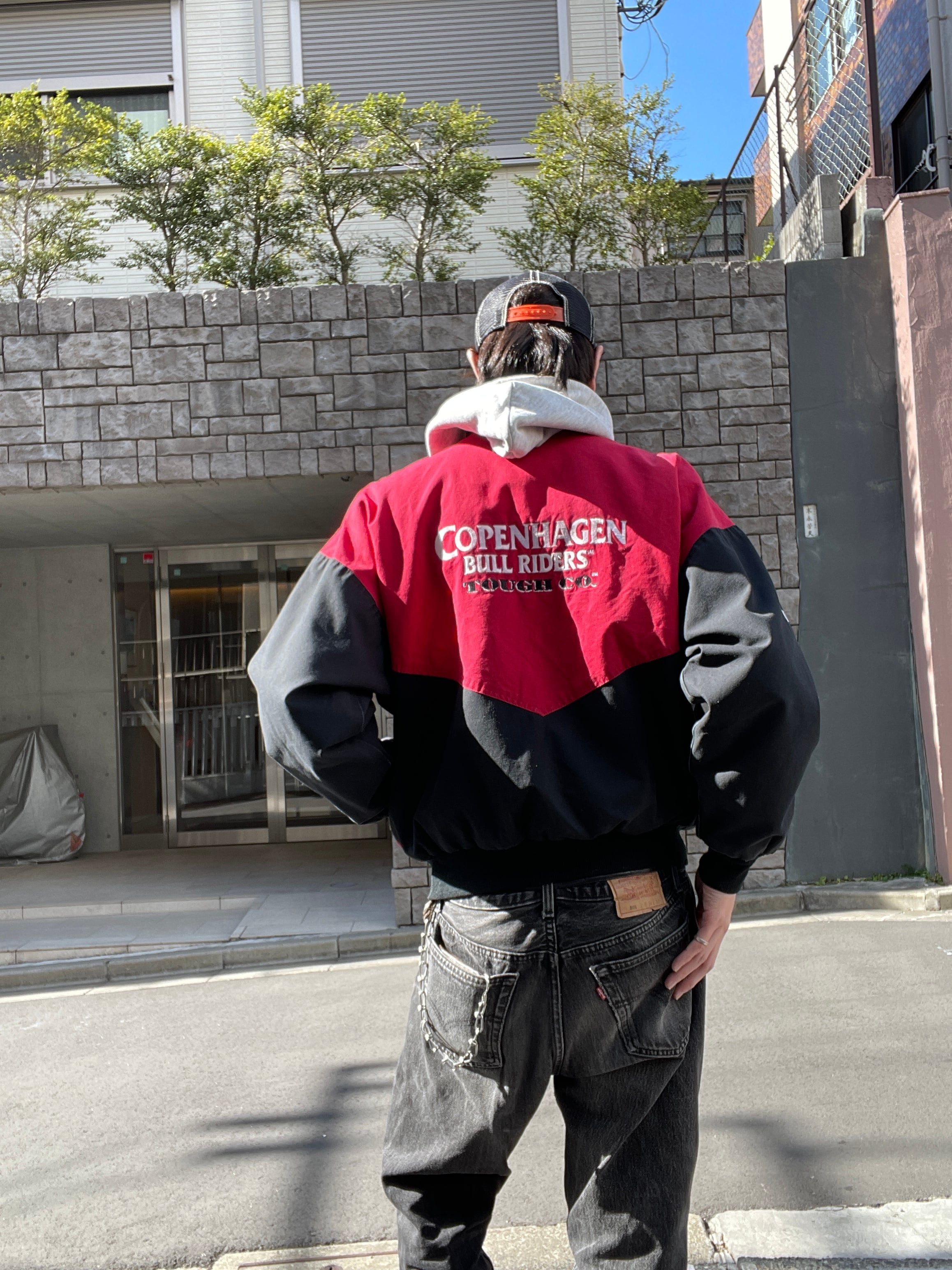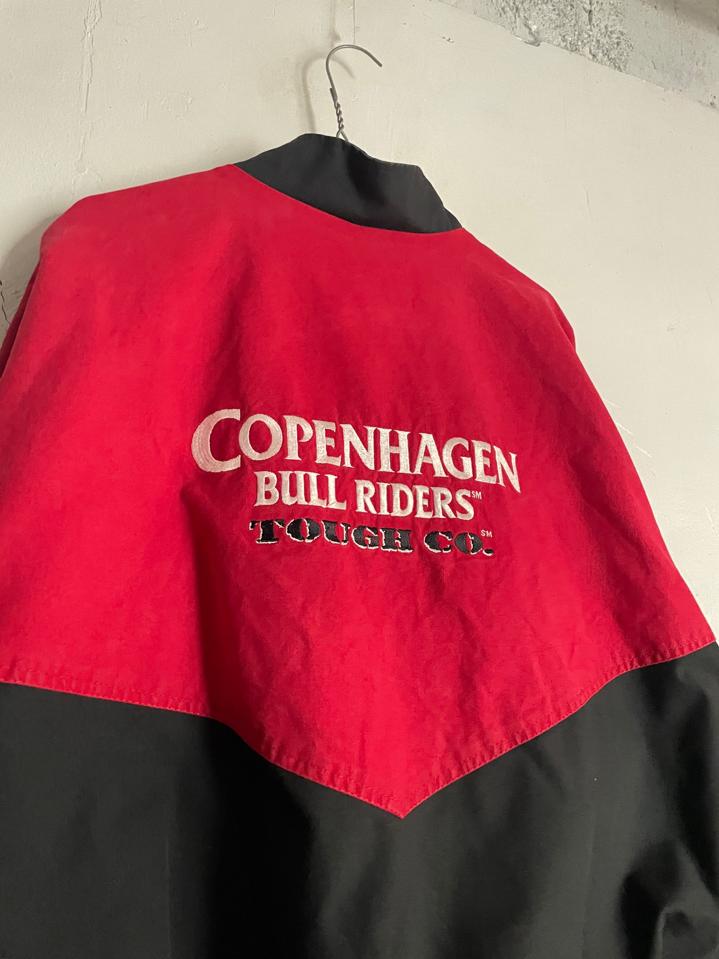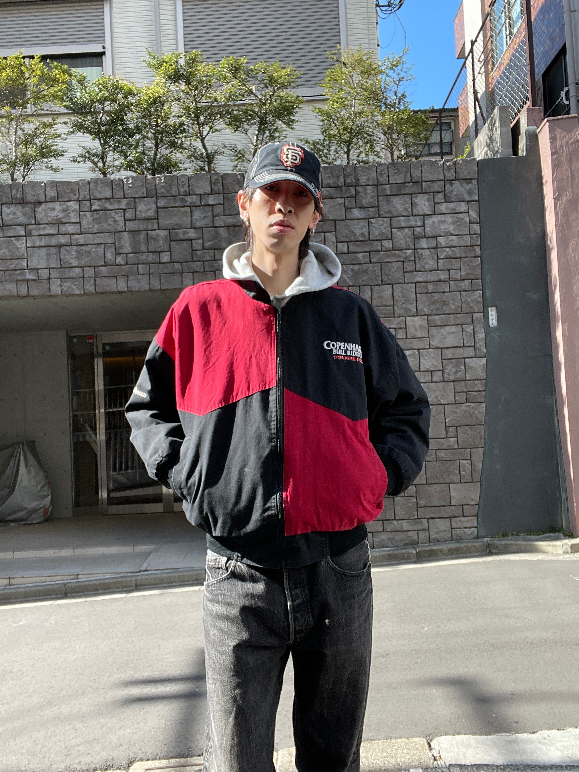 ブラック、レッドの2トーンカラーで、”Copenhagen Bull Riders"の刺繍が施されたジップジャケット。左右で逆のデザインが面白いです。バックはフロントとは逆にデカ刺繍。前後でバランスの取れたデザインが魅力的です。しっかりとしたタフなコットン素材。肩が落ちるような緩いシルエットになっています。今の時期には、インナーに着込んで、主役になってくれる1着です。USA製なのもポイントが高いです。