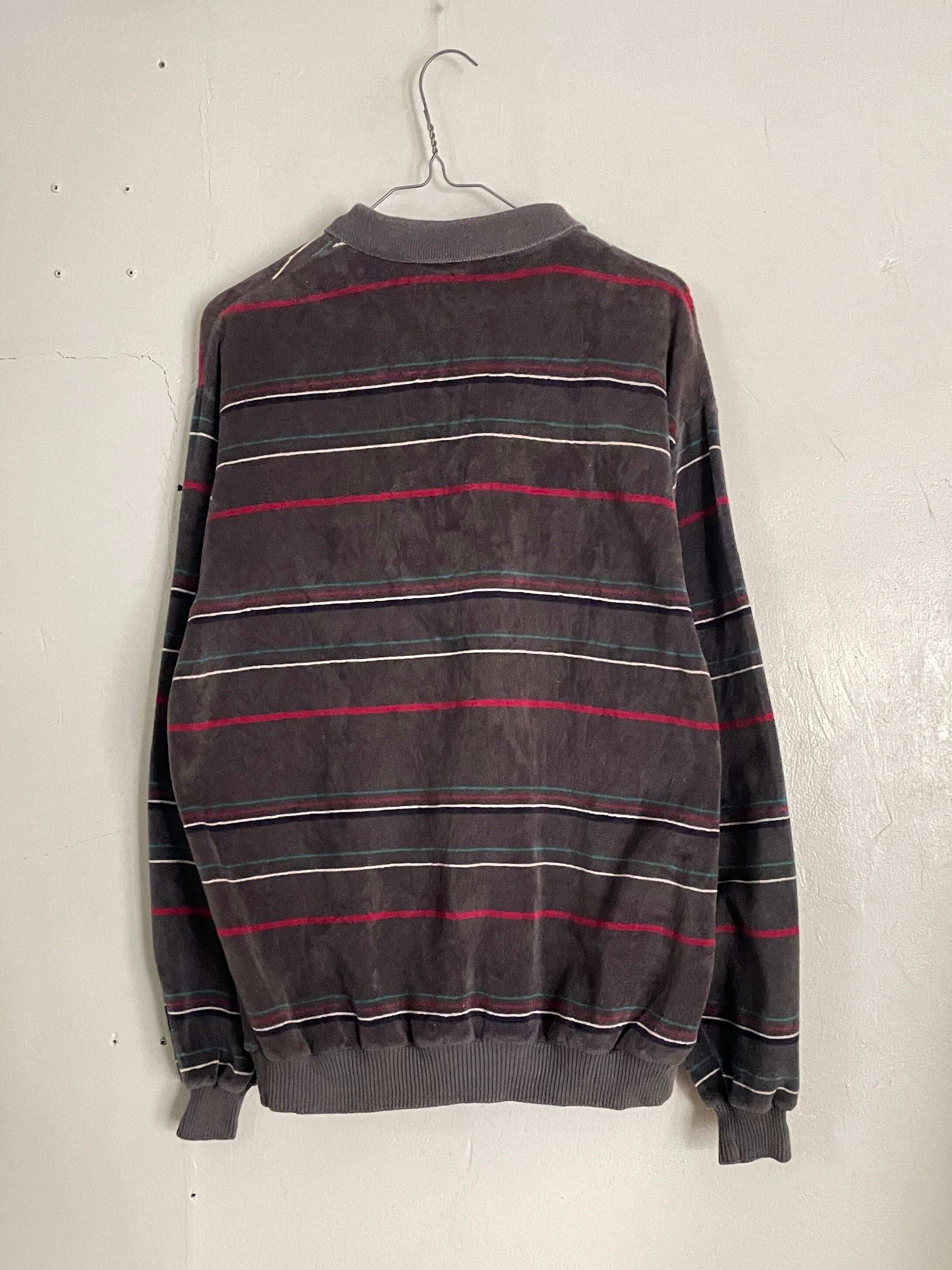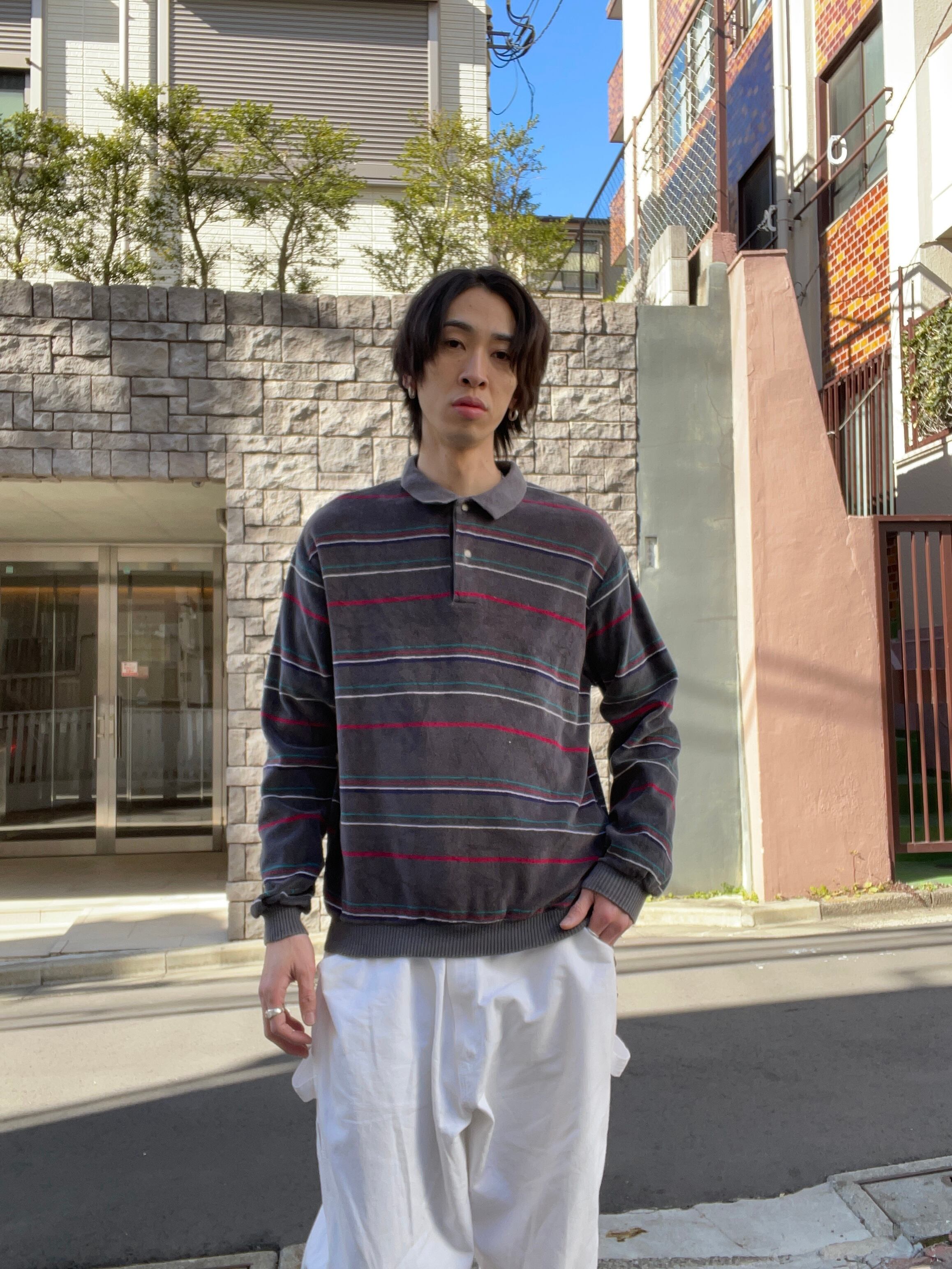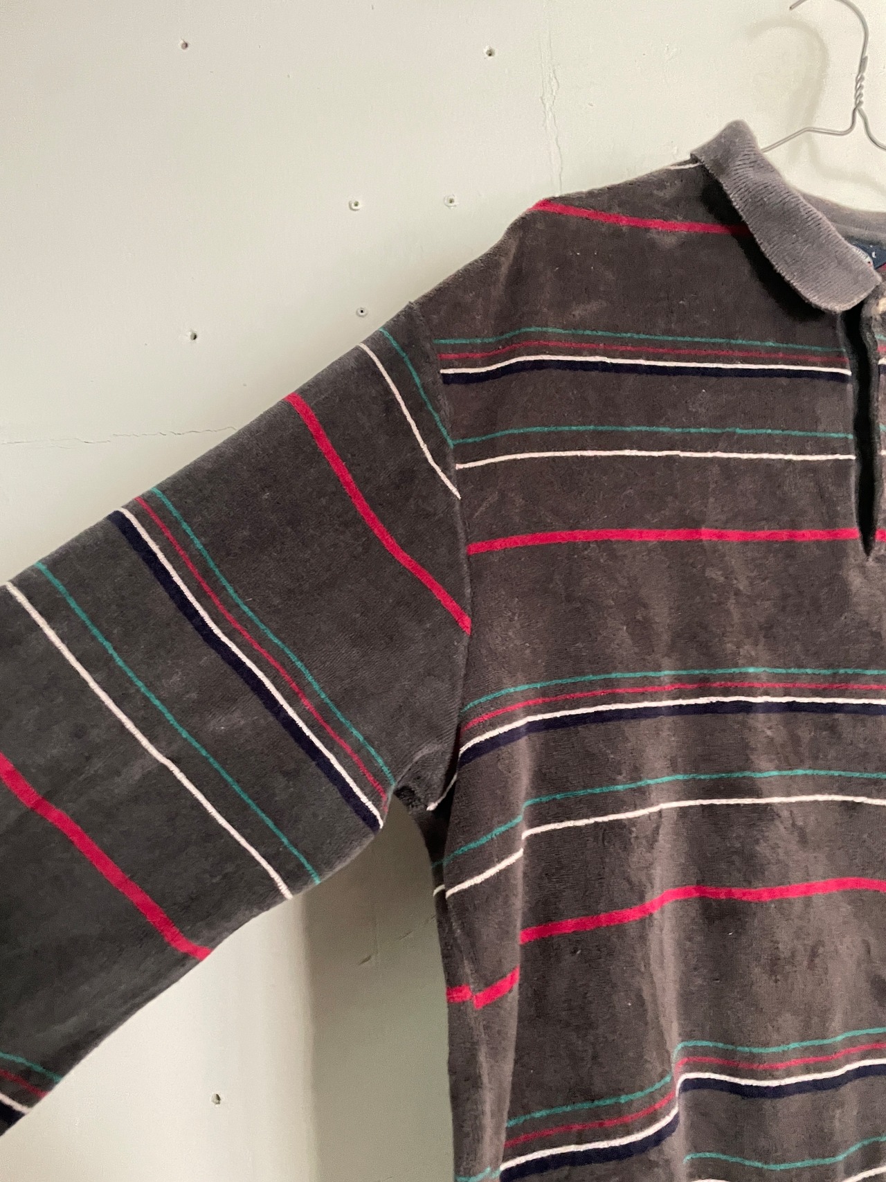 グレーボディに、カラフルなボーダーデザインが施された、ベロアポロシャツ。落ち着いたボディに、鮮やかなマルチカラーが良い差し色になってくれています。伸縮性が良く着心地も抜群です。一枚ではもちろんですが、インナーとしても活躍してくれます。使い方によっては春夏秋冬使える一着です。USA製なのもポイントが高いです。両面の裾上にダメージが見られます。