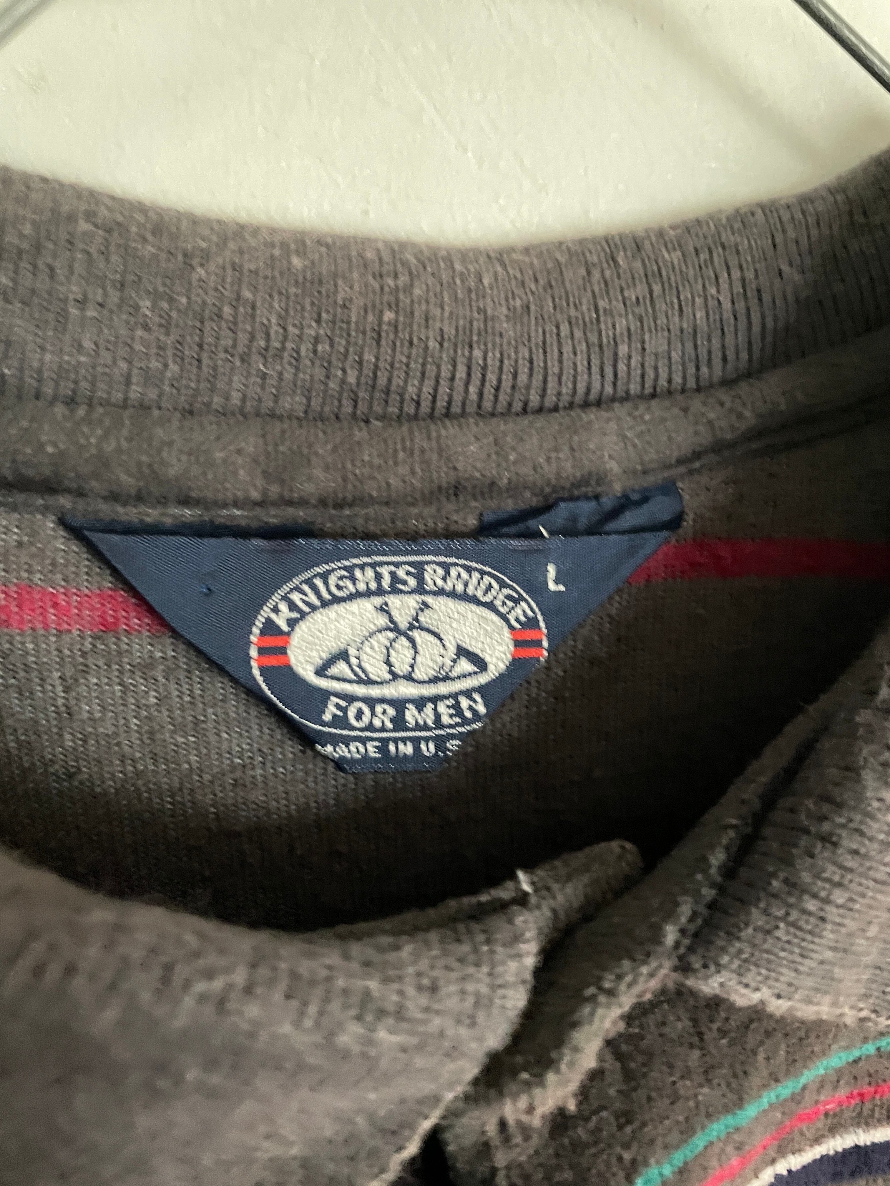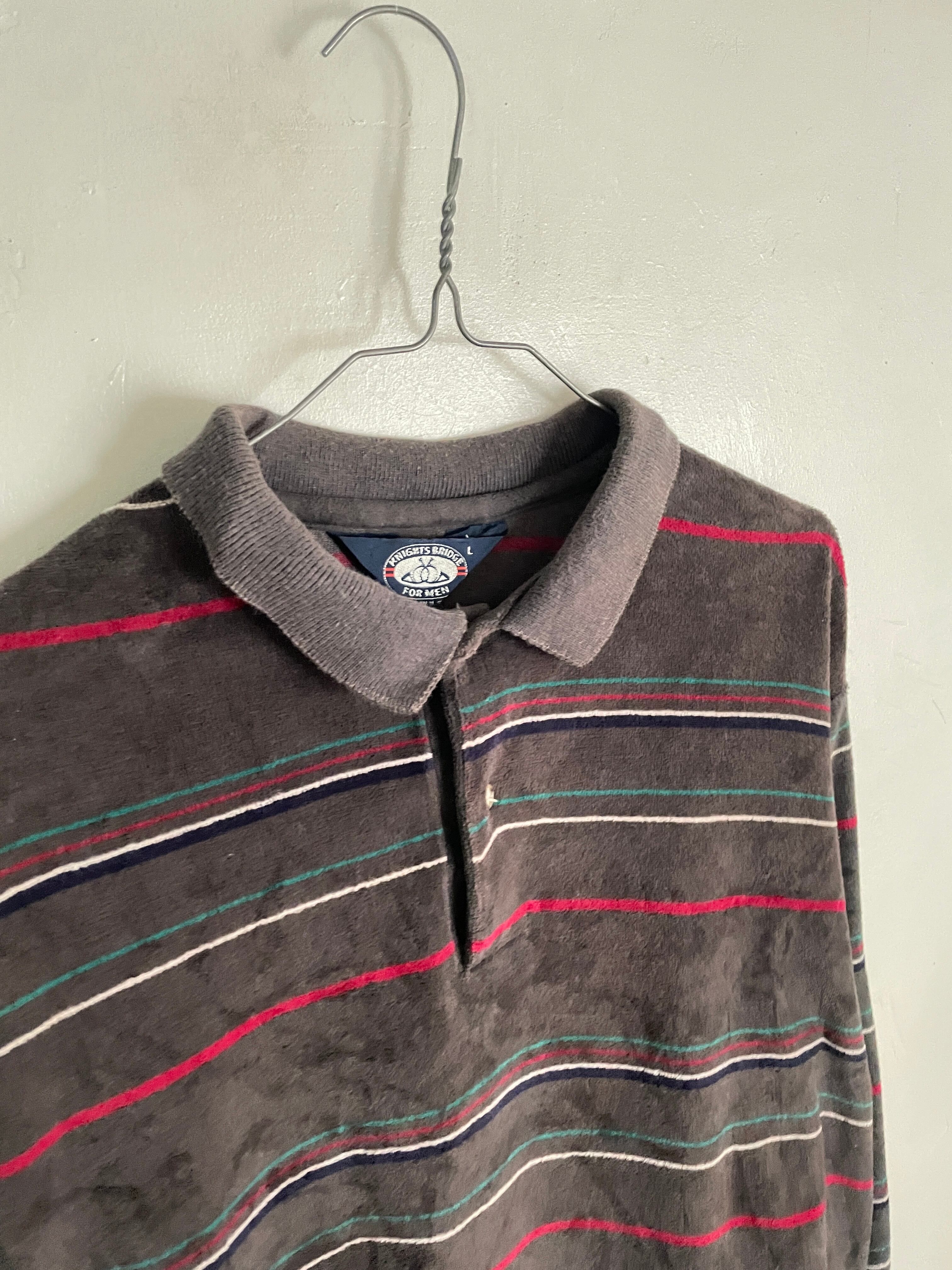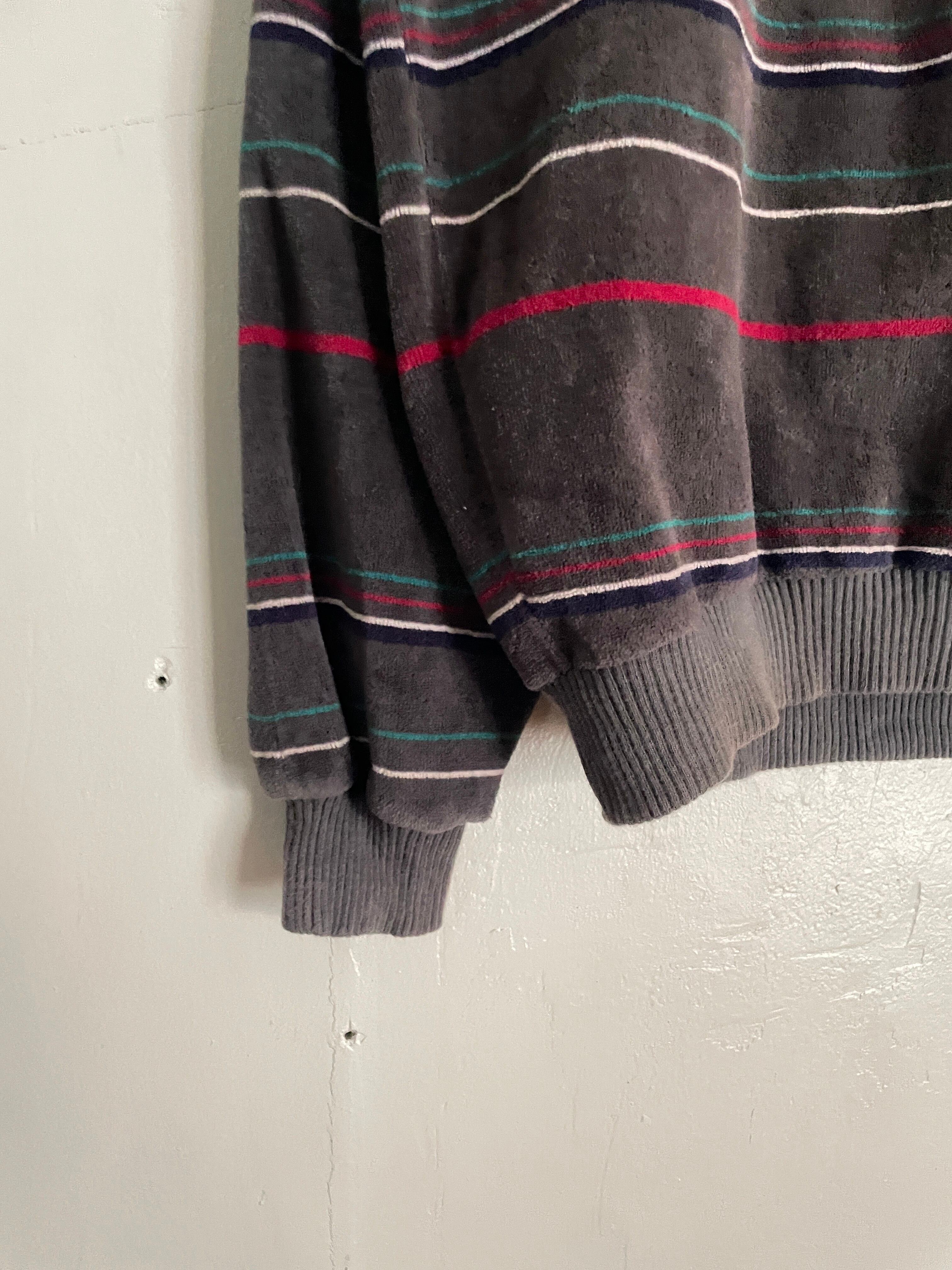 グレーボディに、カラフルなボーダーデザインが施された、ベロアポロシャツ。落ち着いたボディに、鮮やかなマルチカラーが良い差し色になってくれています。伸縮性が良く着心地も抜群です。一枚ではもちろんですが、インナーとしても活躍してくれます。使い方によっては春夏秋冬使える一着です。USA製なのもポイントが高いです。両面の裾上にダメージが見られます。