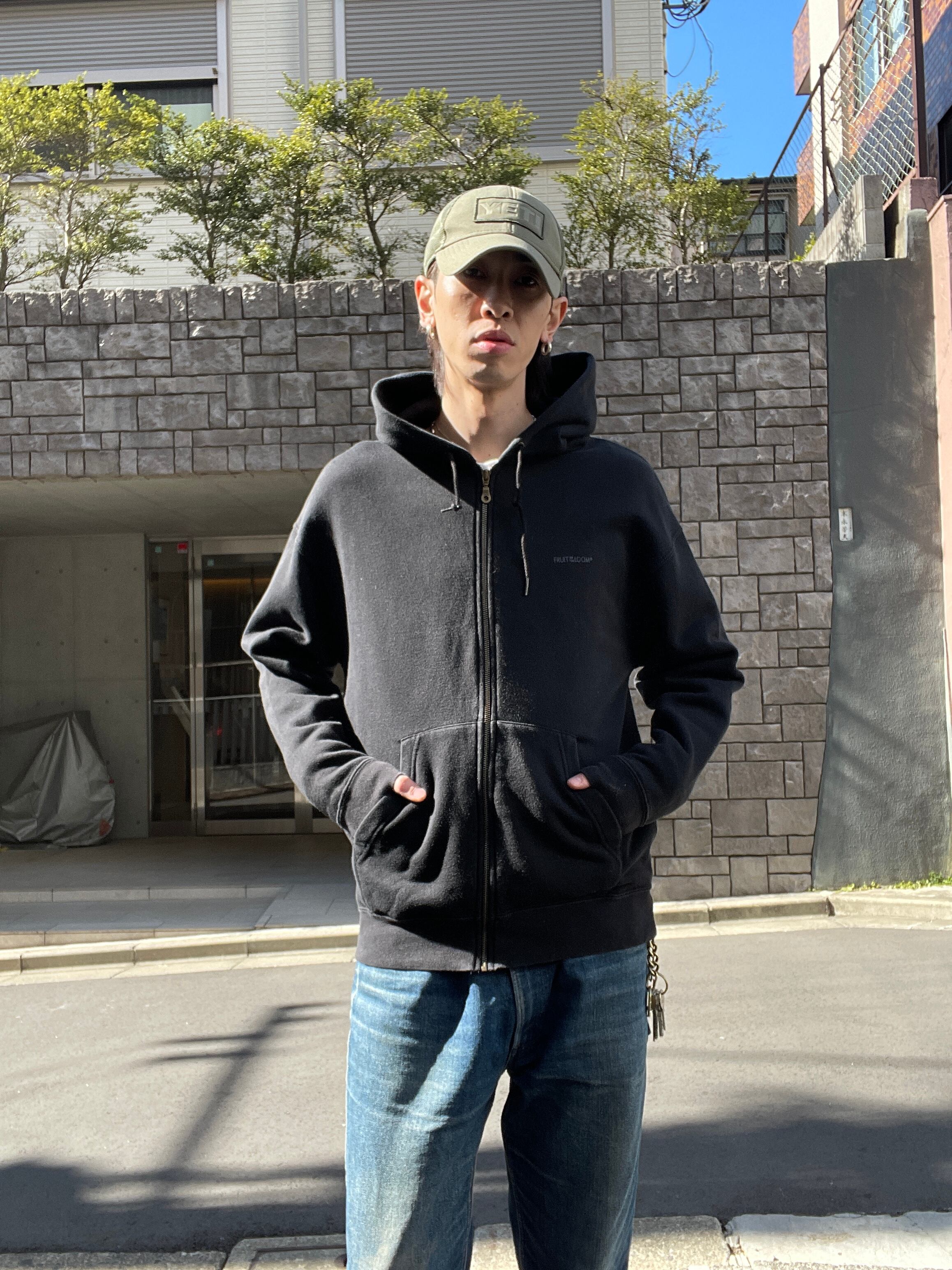 ブラックボディに、ワンポイントでブランドネームプリントが施された、フルーツオブザルームのジップパーカー。シンプルで使い勝手の良い一着。コットンポリの柔らかい質感。ゆったりとしたサイズ感で、ラフに着られるのも魅力的です。インナーとしても活躍してくれる万能アイテムです。