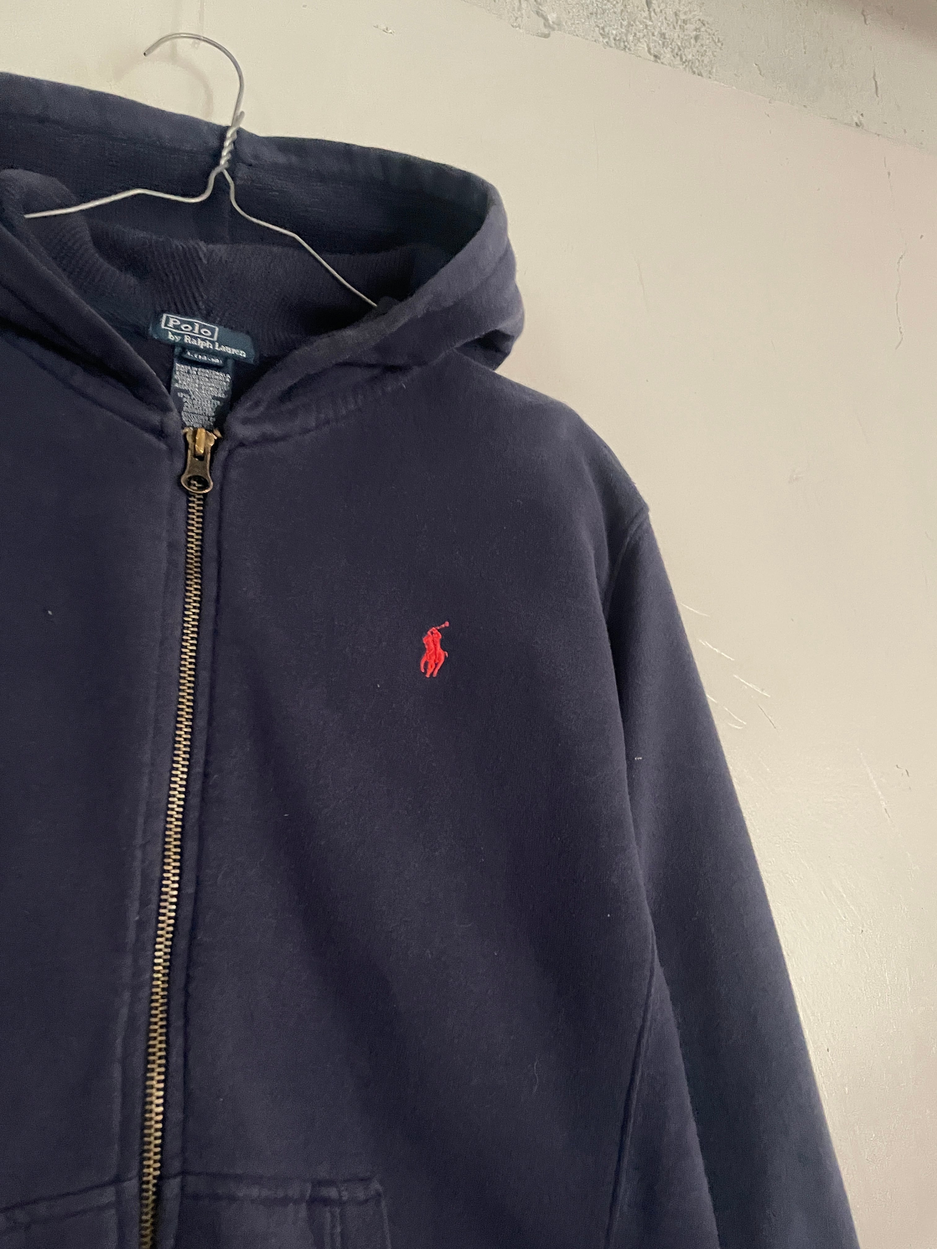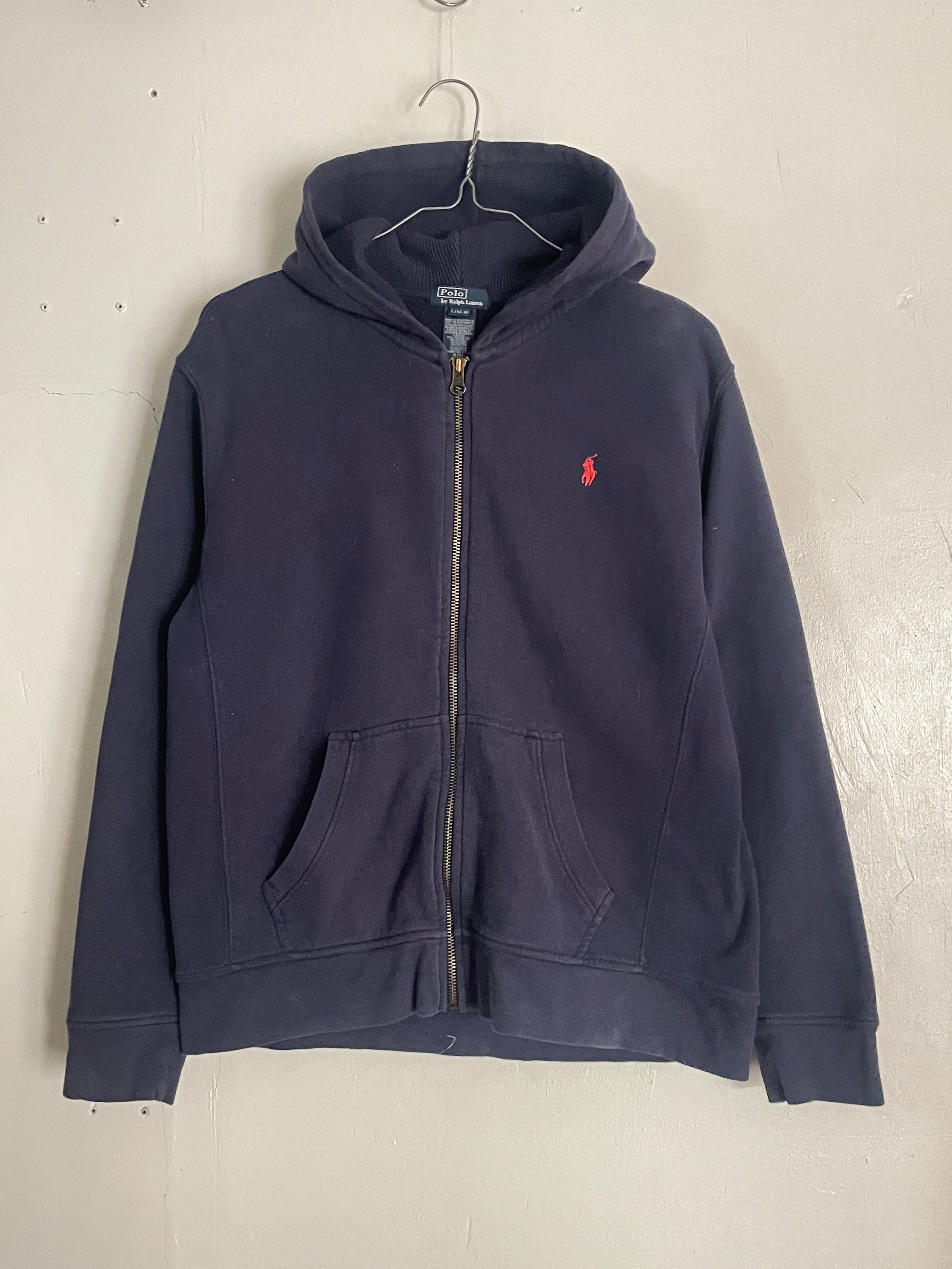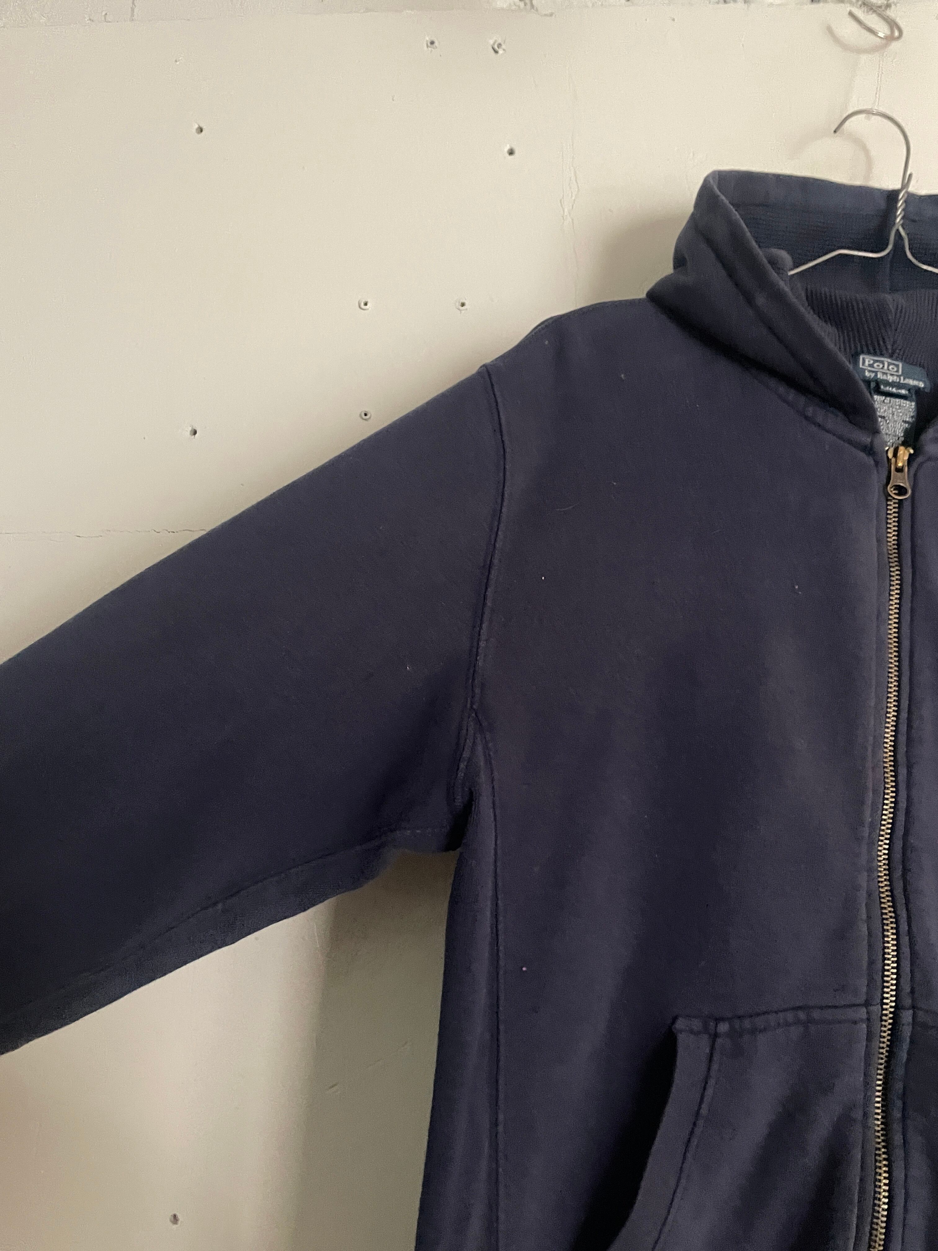 やや褪せたネイビーボディに、ワンポイントでポニーロゴの入った、ラルフローレンのジップパーカー。肉厚なコットンポリ素材で、保温性に優れた一着。フード裏はサーマル地で、脇下はリバース仕様になっています。タイトめなサイズ感なので、今の時期にはインナーとして使っても良さそうです。