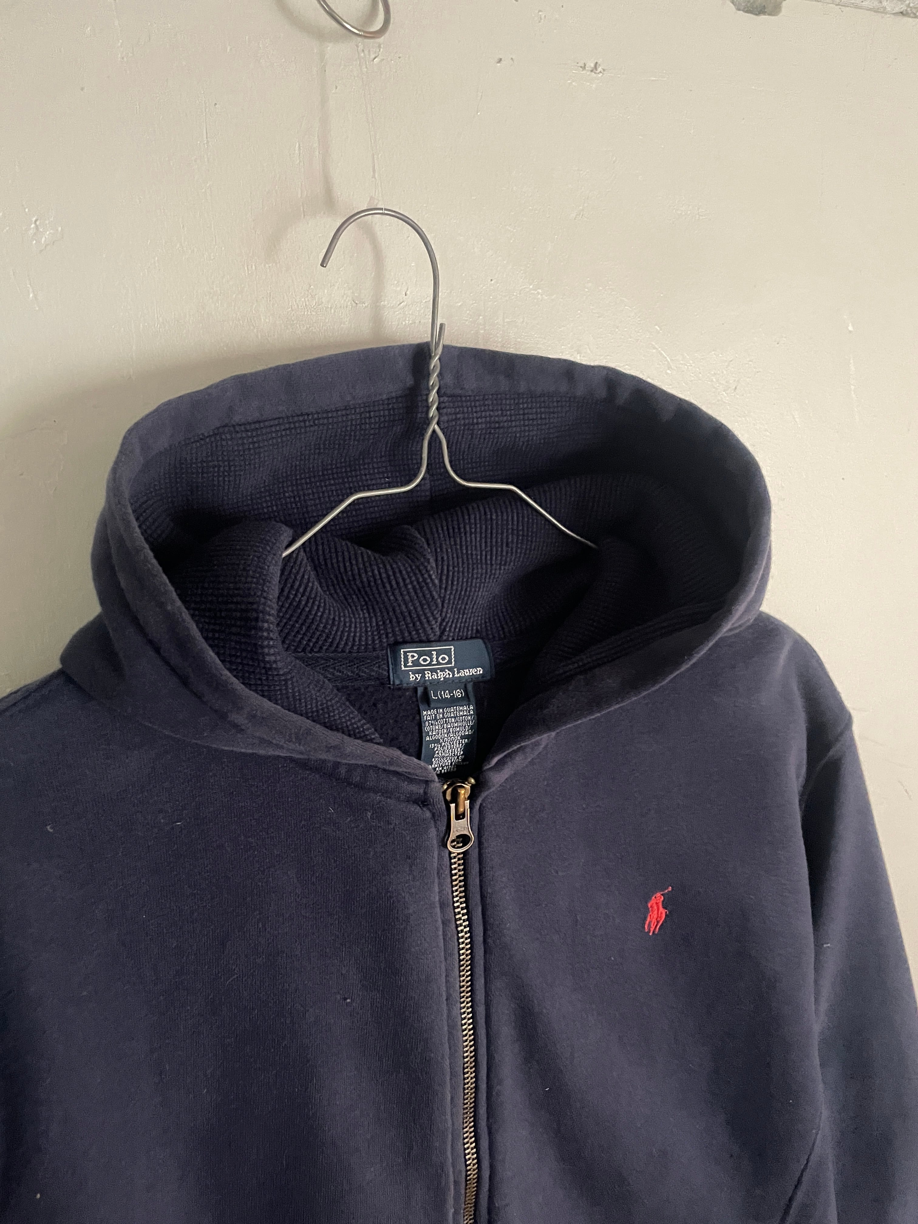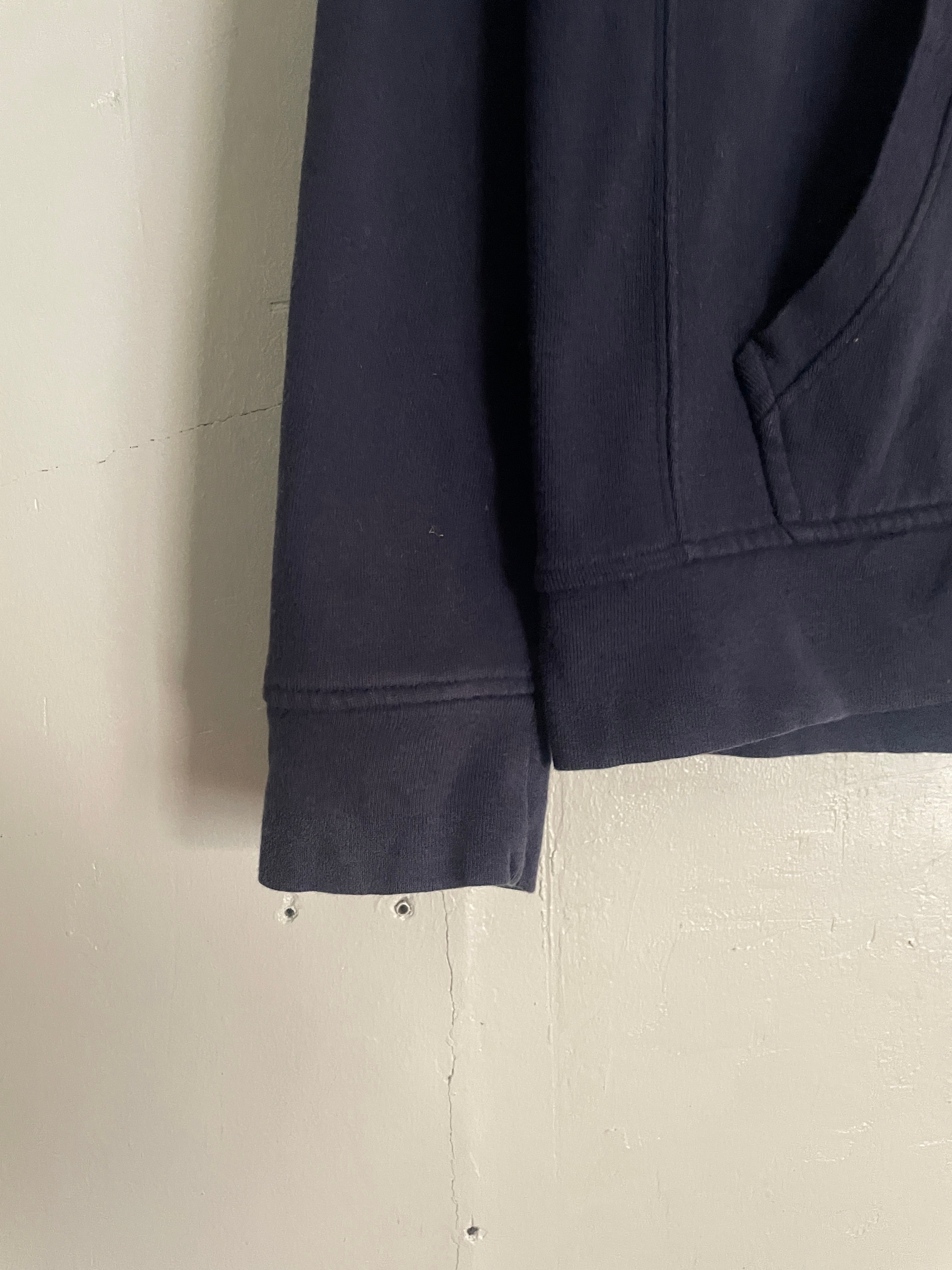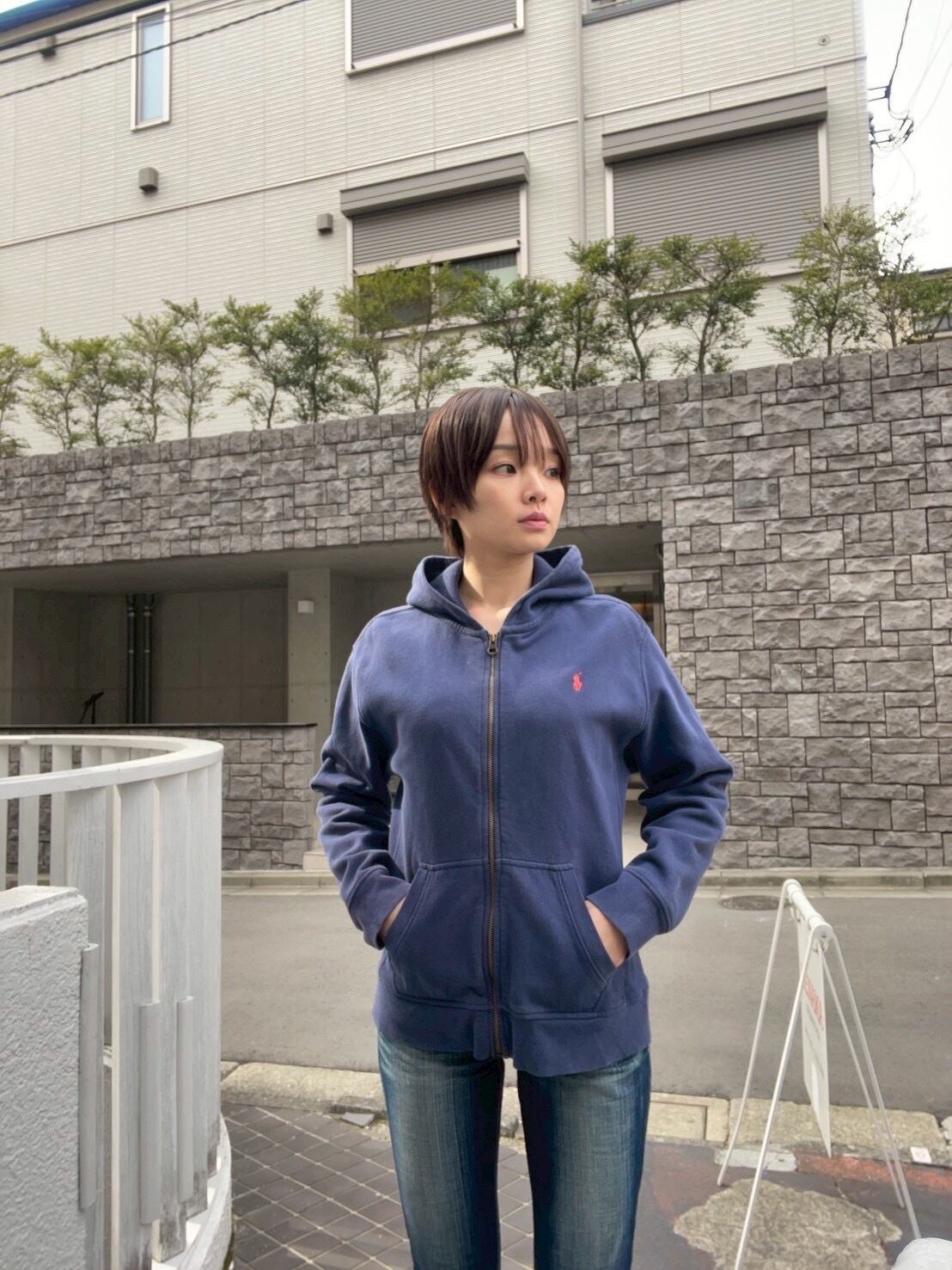 やや褪せたネイビーボディに、ワンポイントでポニーロゴの入った、ラルフローレンのジップパーカー。肉厚なコットンポリ素材で、保温性に優れた一着。フード裏はサーマル地で、脇下はリバース仕様になっています。タイトめなサイズ感なので、今の時期にはインナーとして使っても良さそうです。