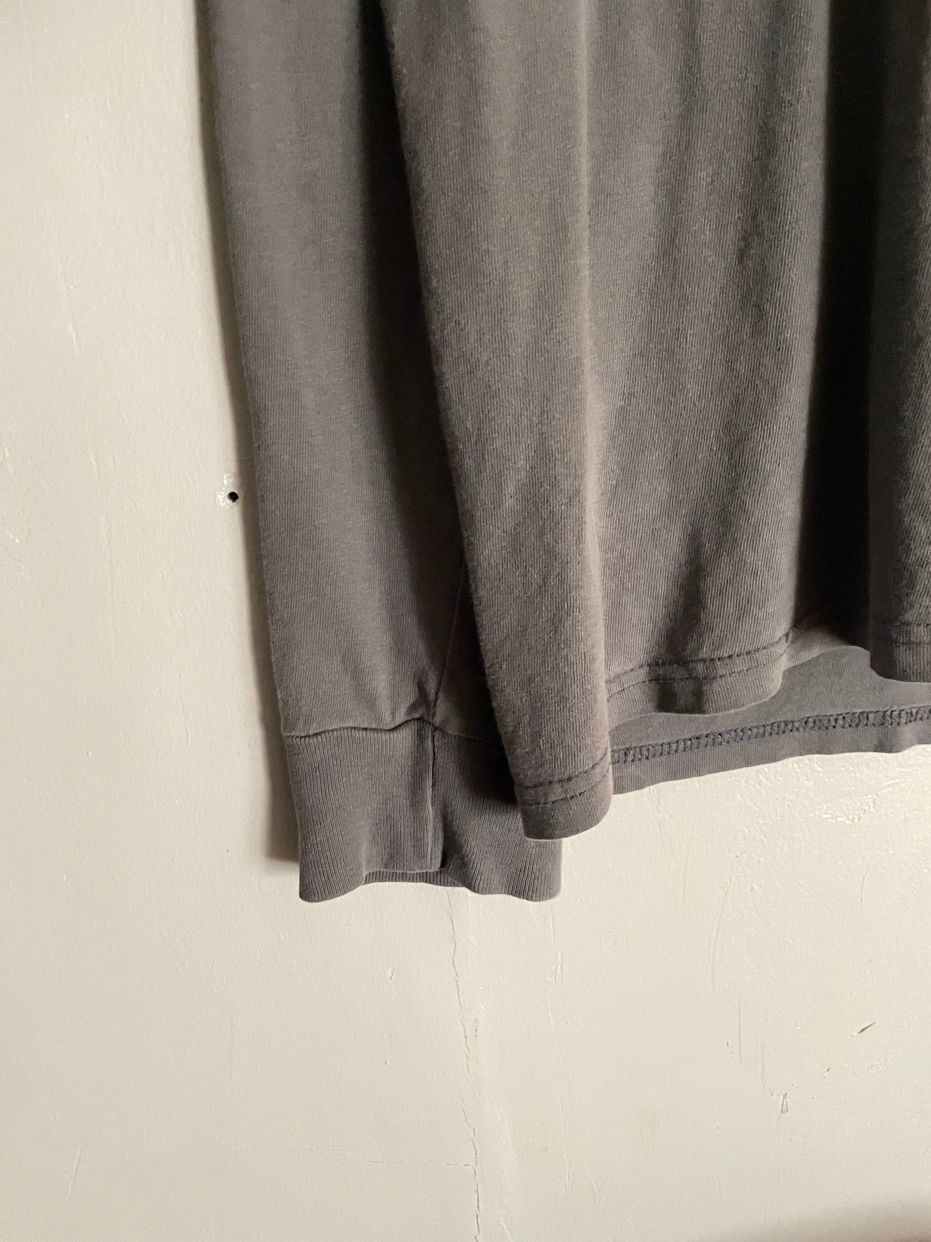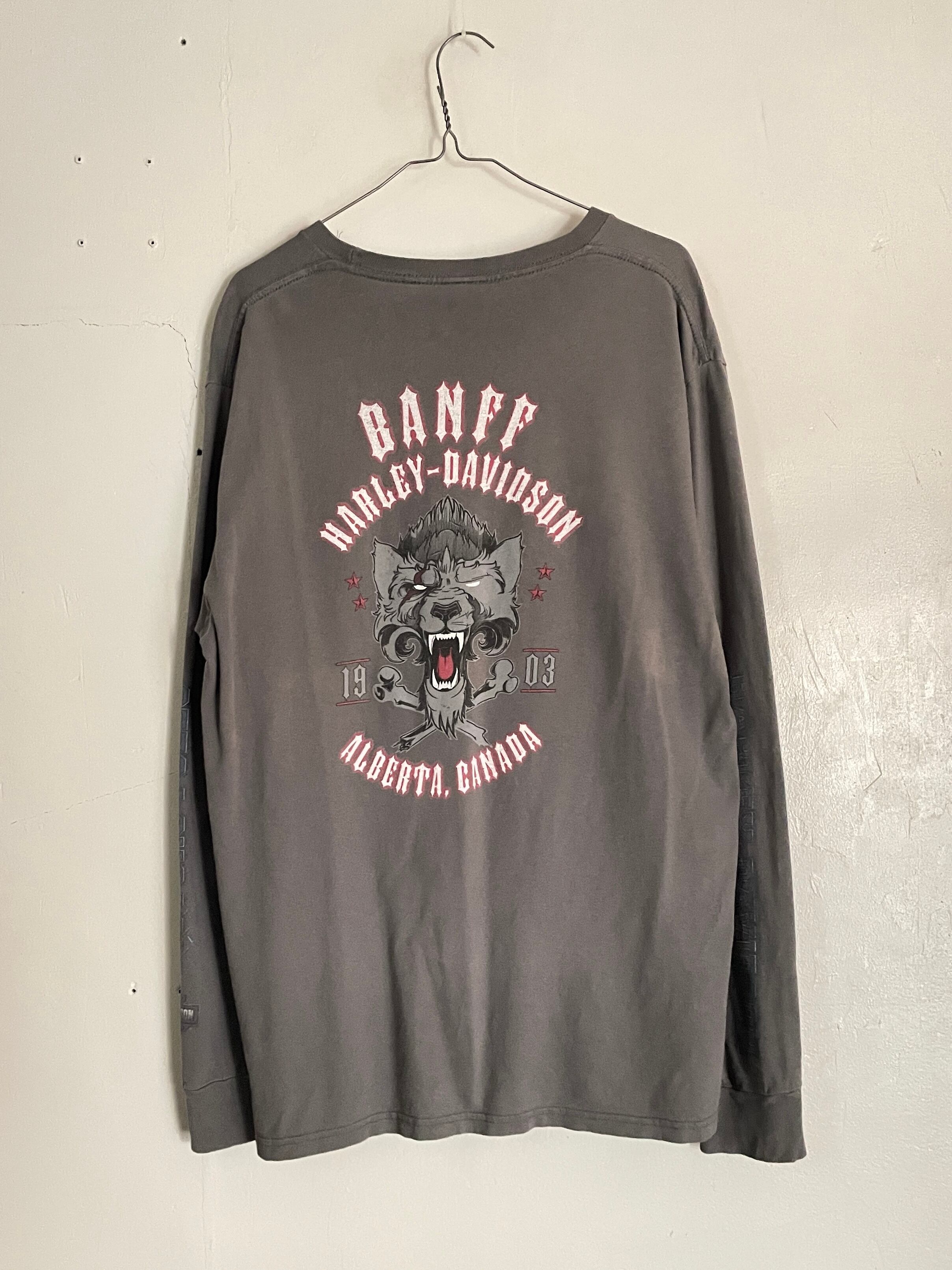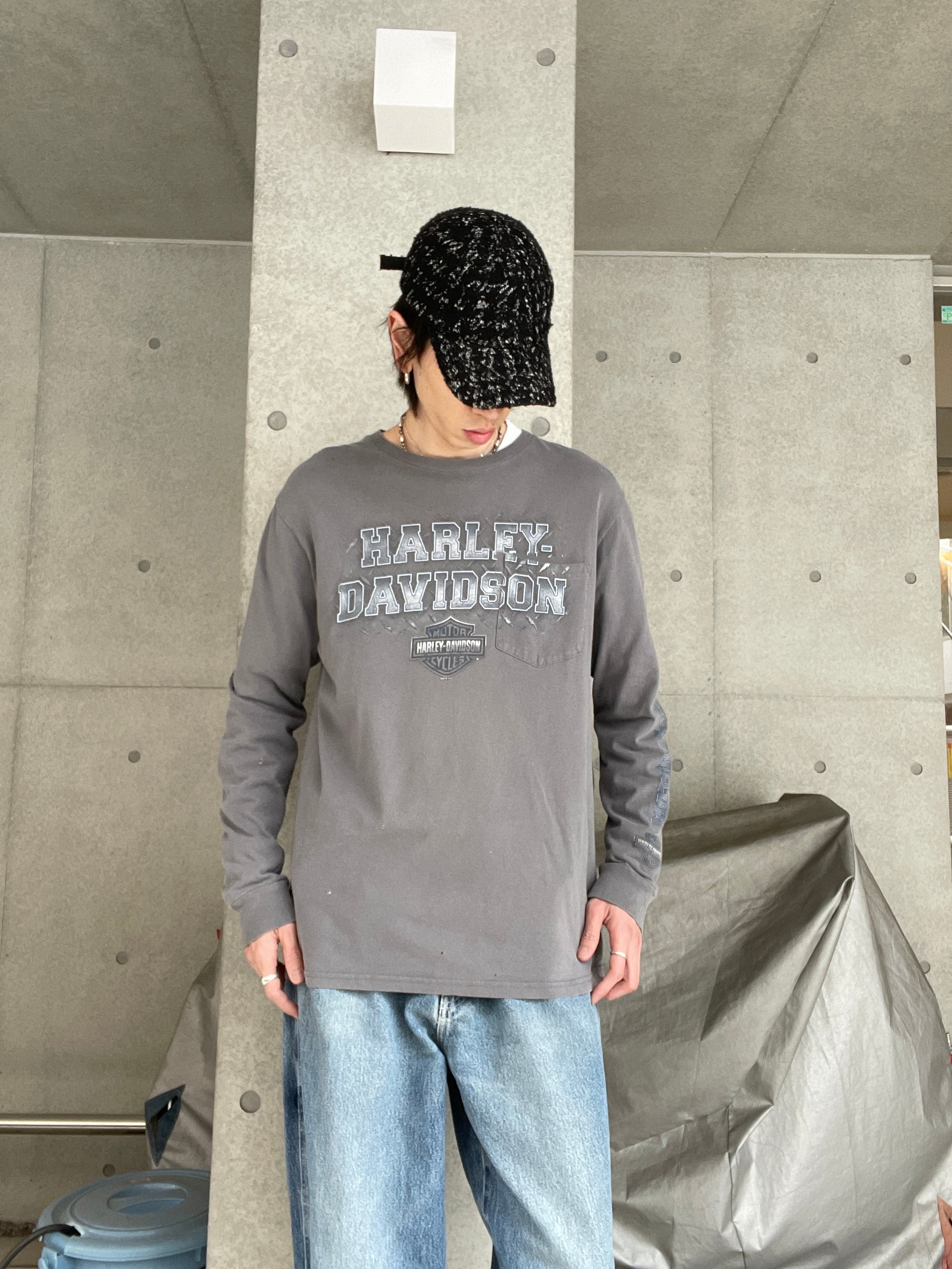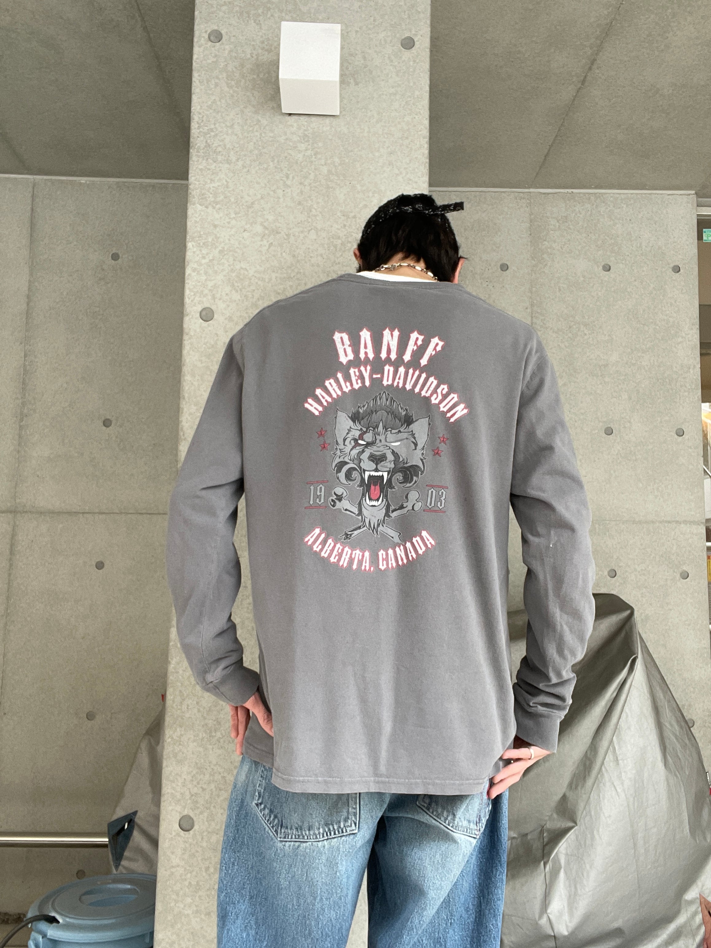 やや褪せたグレーボディに、両面プリントが施された、ハーレーダビッドソンのロンT。前はガラスが割れたようなデザインと、ハーレーネームプリント。ポケット付きなのも嬉しいです。バックにはインパクトのある、狼のグラフィックプリント。左袖にもプリントが施されています。どこから見てもかっこいい一着。ゆったりとしたサイズ感なので、ラフに着られるのも魅力的です。