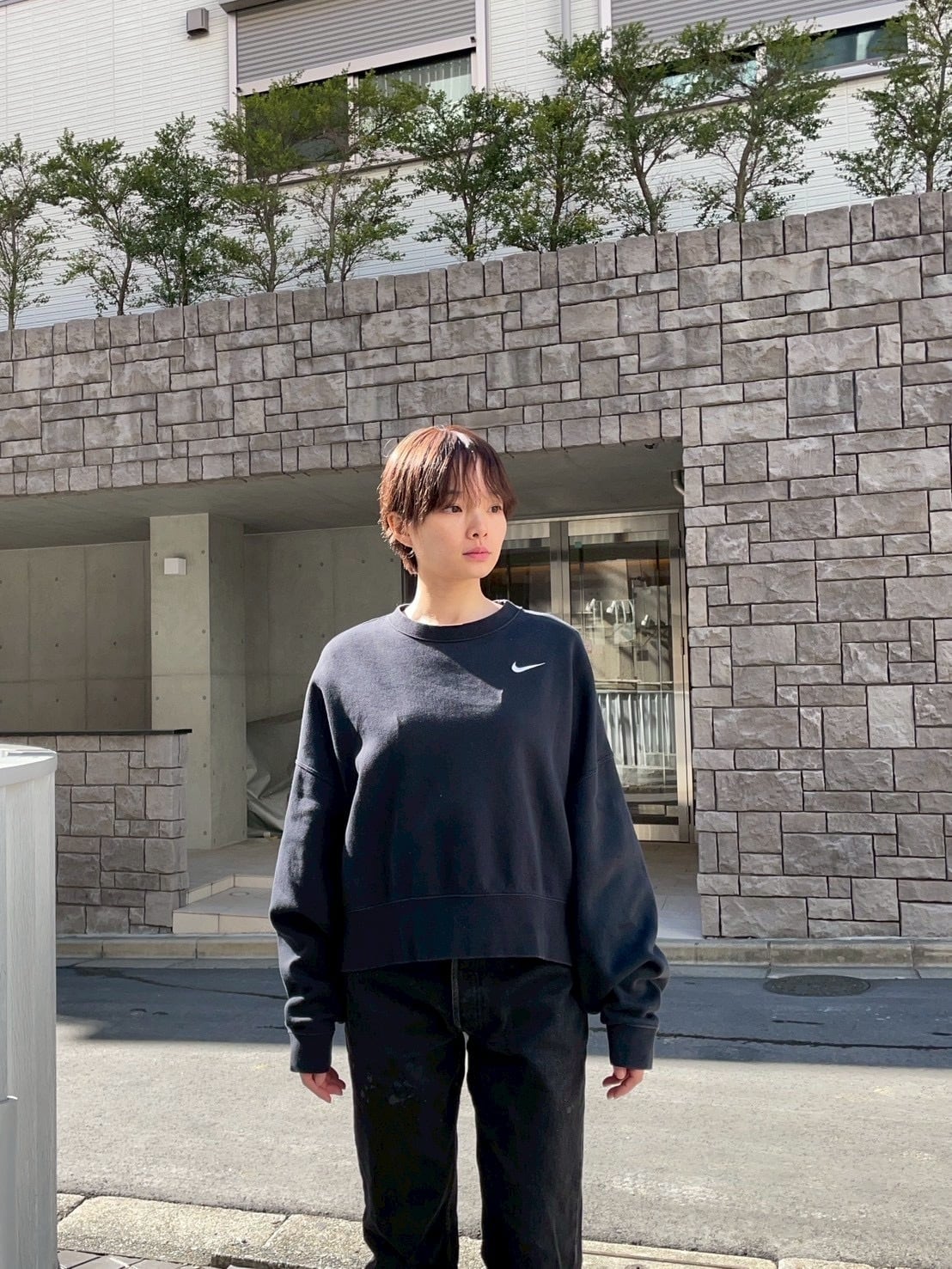 やや褪せたブラックボディに、スウォッシュロゴ刺繍が施された、ナイキのクロップド丈スウェット。短丈めでありながら、身幅はかなり広めな今っぽいシルエット。デザイン自体はかなりシンプルなので、使いやすいアイテムかと思います。男女共におすすめしたい一着です。