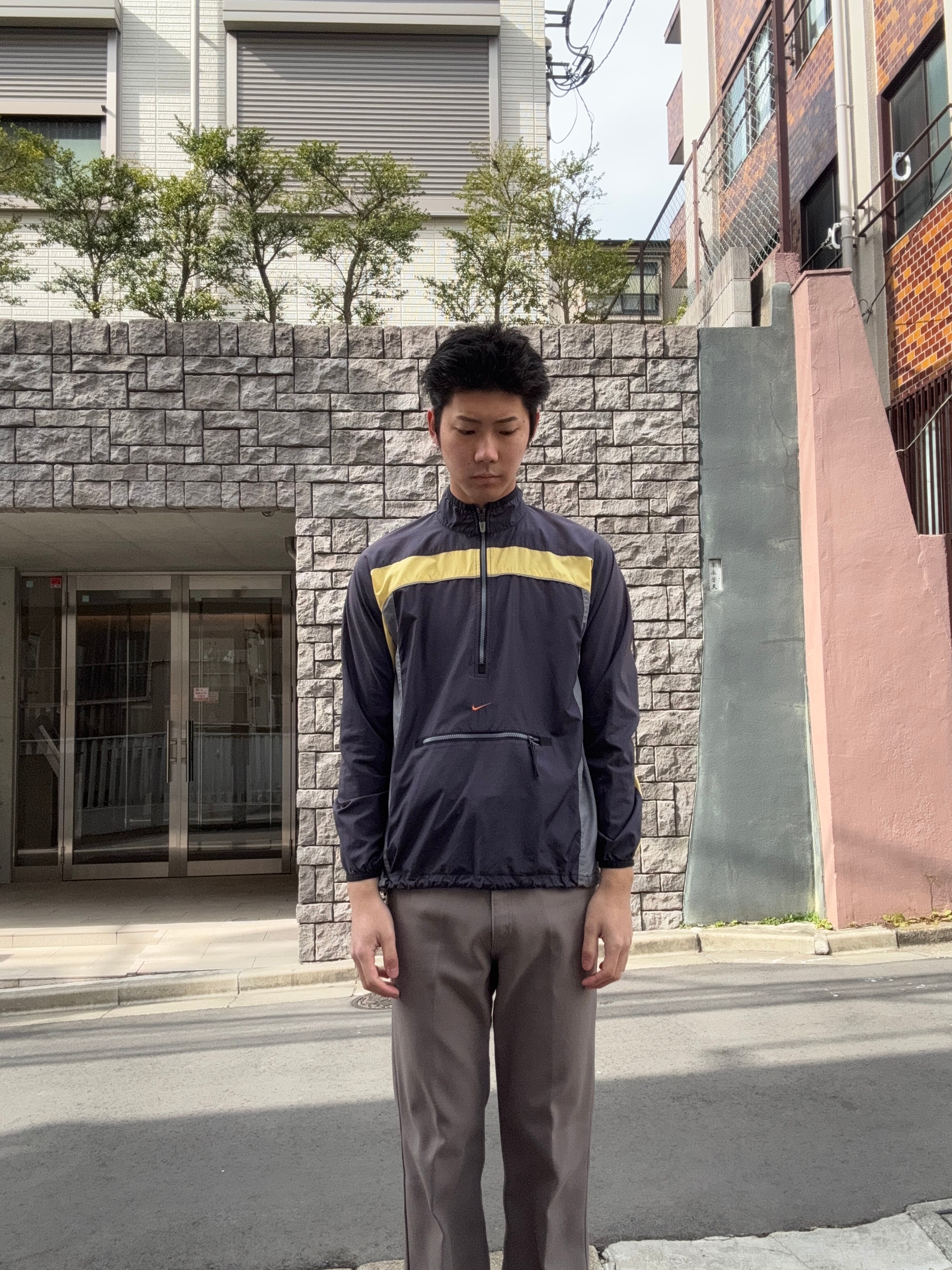 グレーボディをベースに、鮮やかなイエローの切り替えデザインが施された、ナイキのアノラックトップス。着脱しやすいハーフジップタイプで、フロント中央には、ジップ付きの大きなカンガルーポケット。機能性に優れた一着です。軽いポリ素材で、通気性にも優れていて、ラフに着られるのも魅力的です。まさに春に活躍するアイテムかと思います。